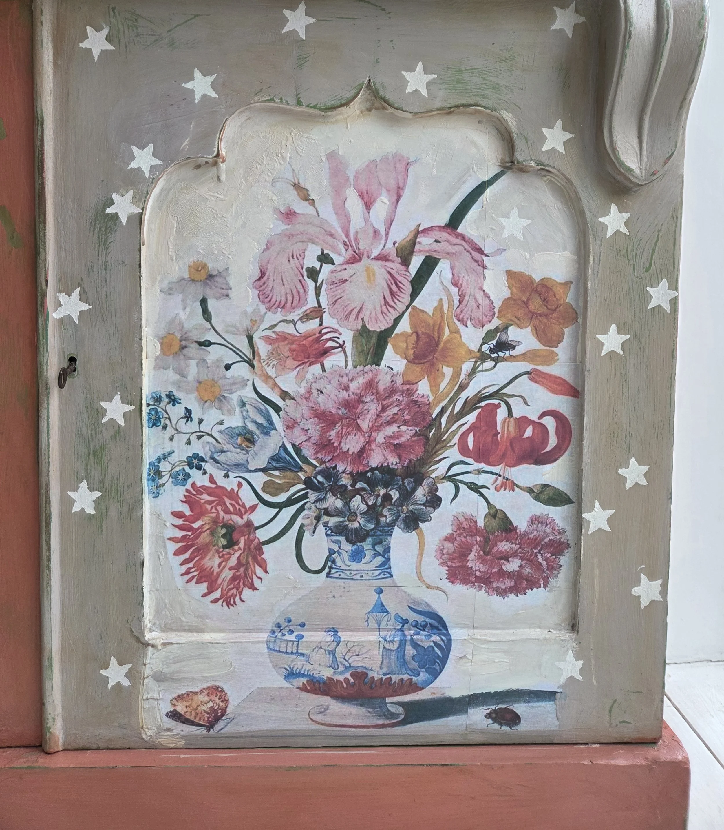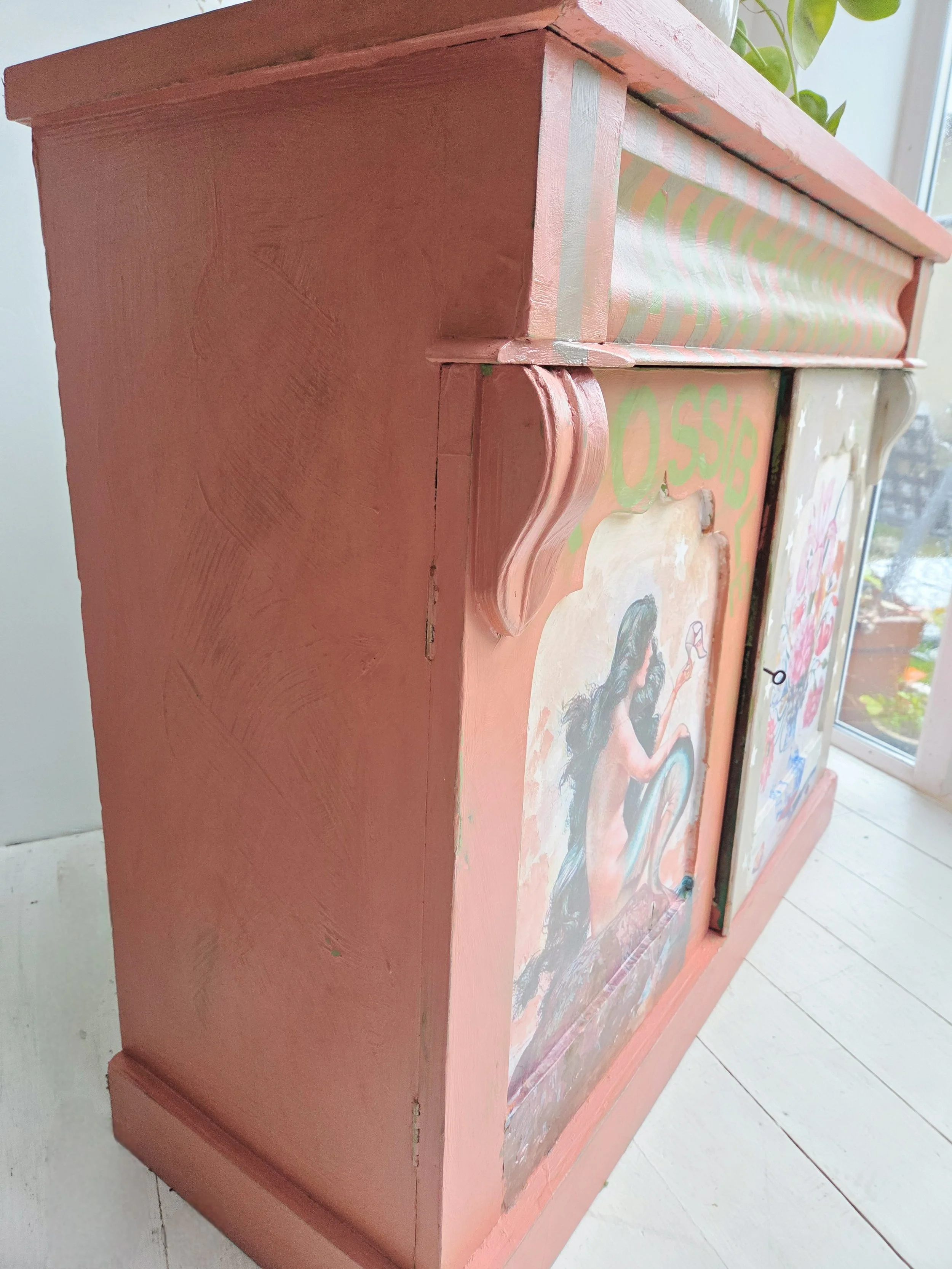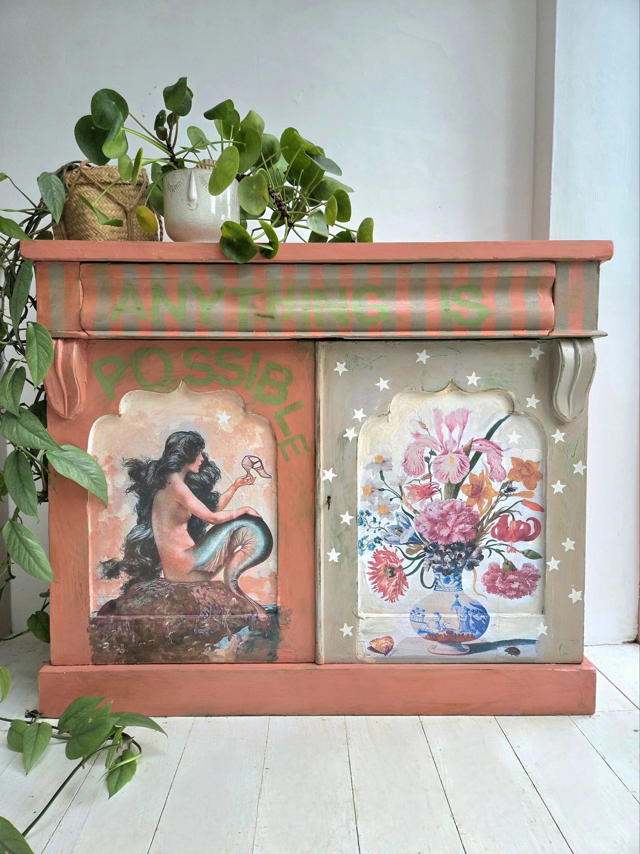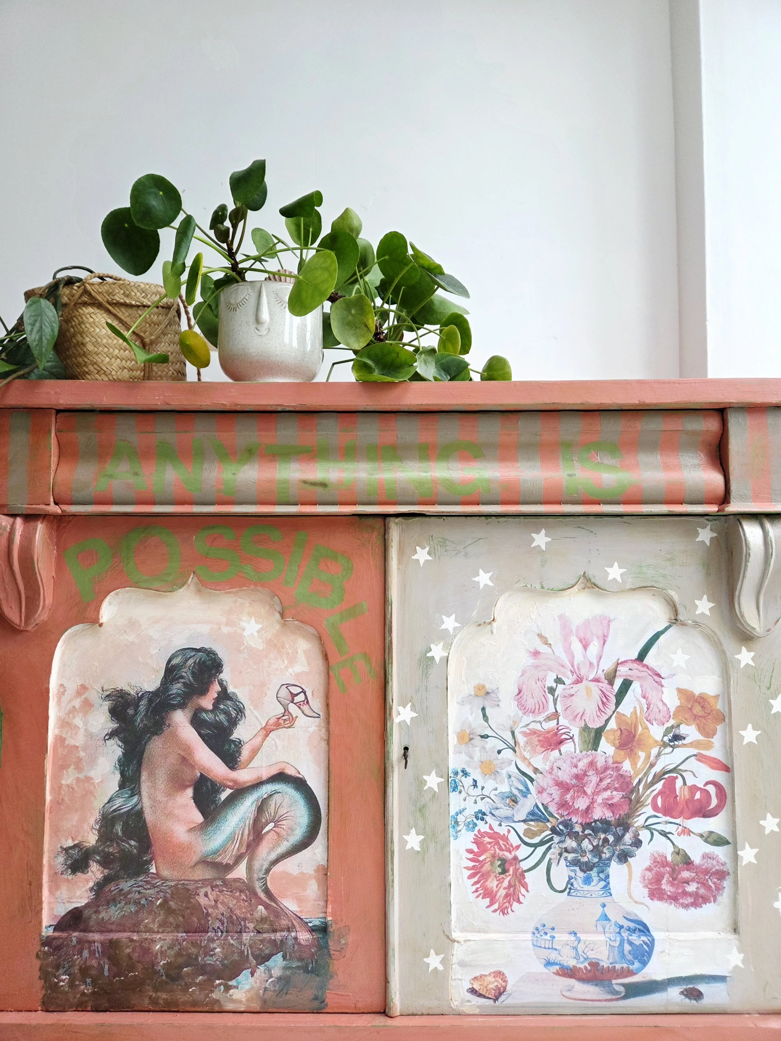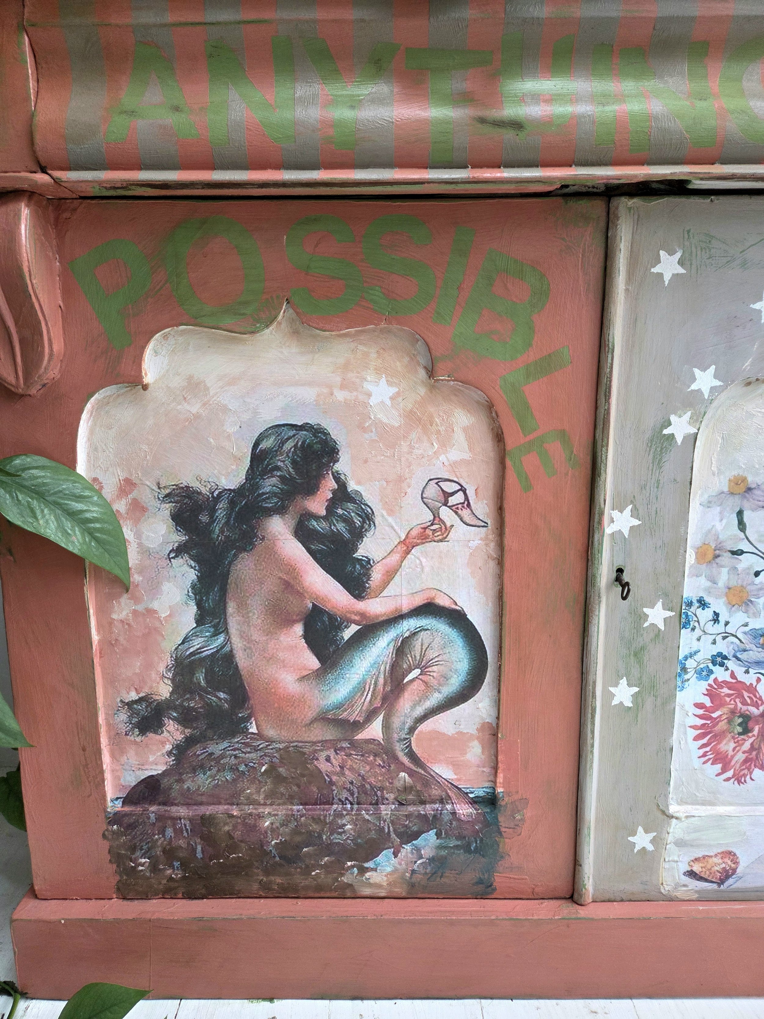 The decoupage has been made by myself and has been printed in fade-resistant ink designed to last up to 100 years before any fading occurs. Then painted over the top to blend all of the components together. The text reads, in the green of the undercoat ‘anything is possible’. The right hand door has been finished with stencilled stars.