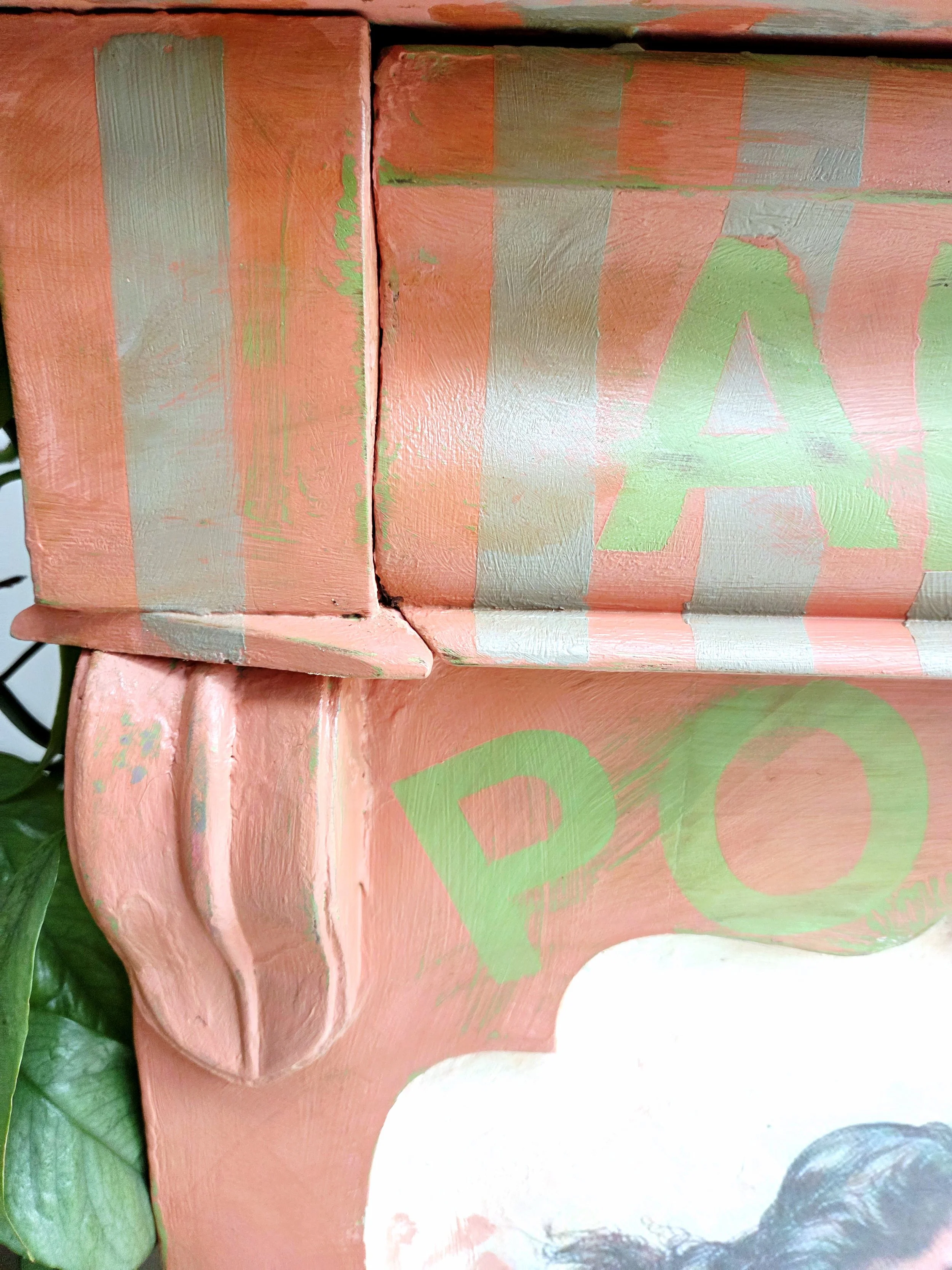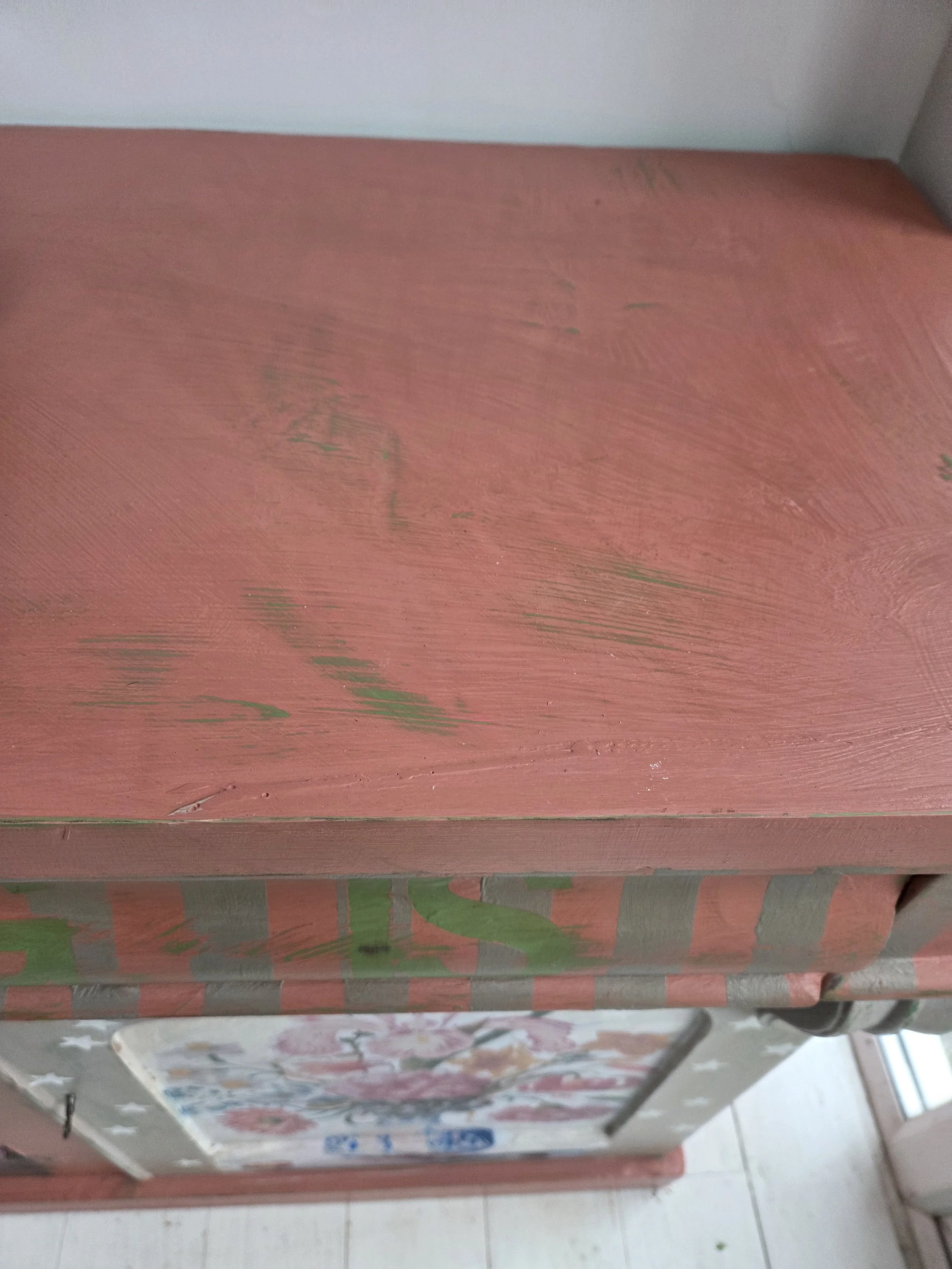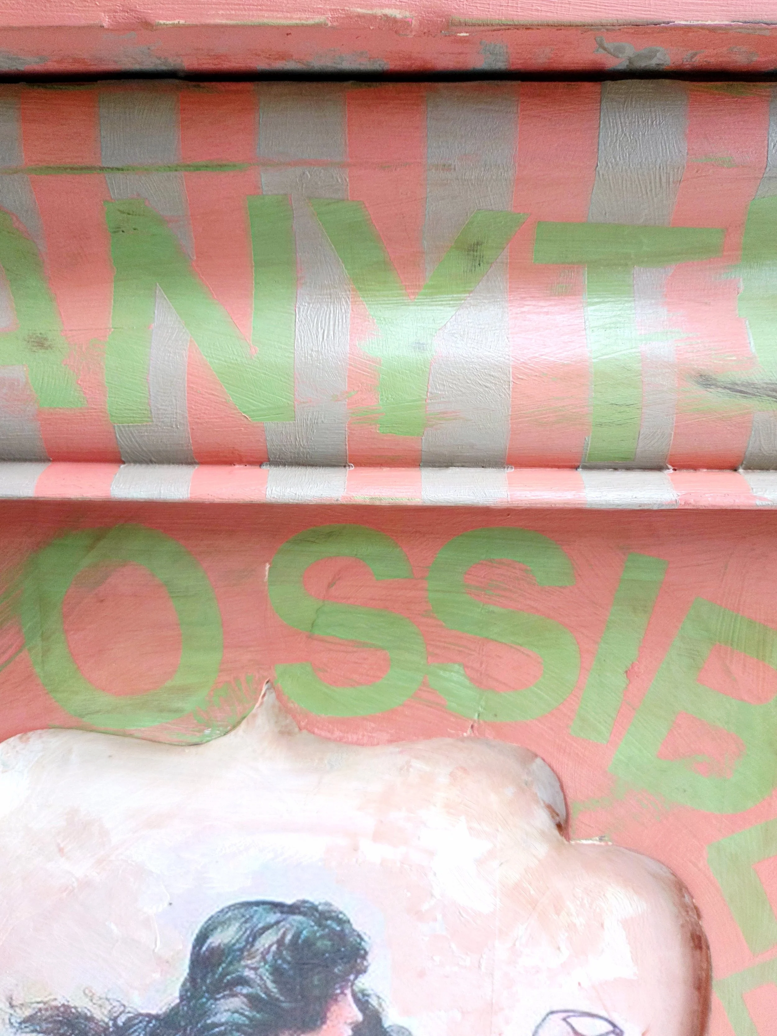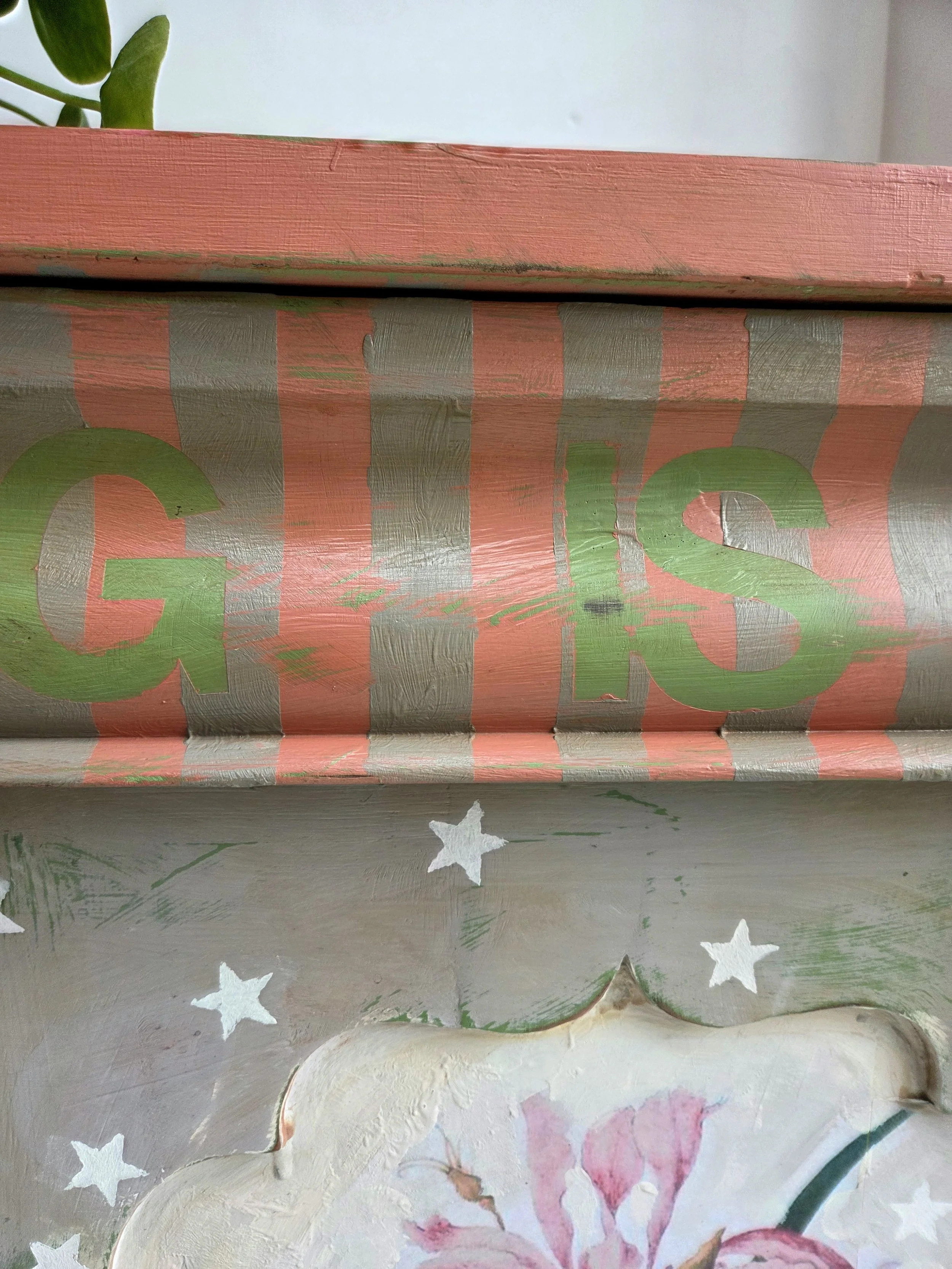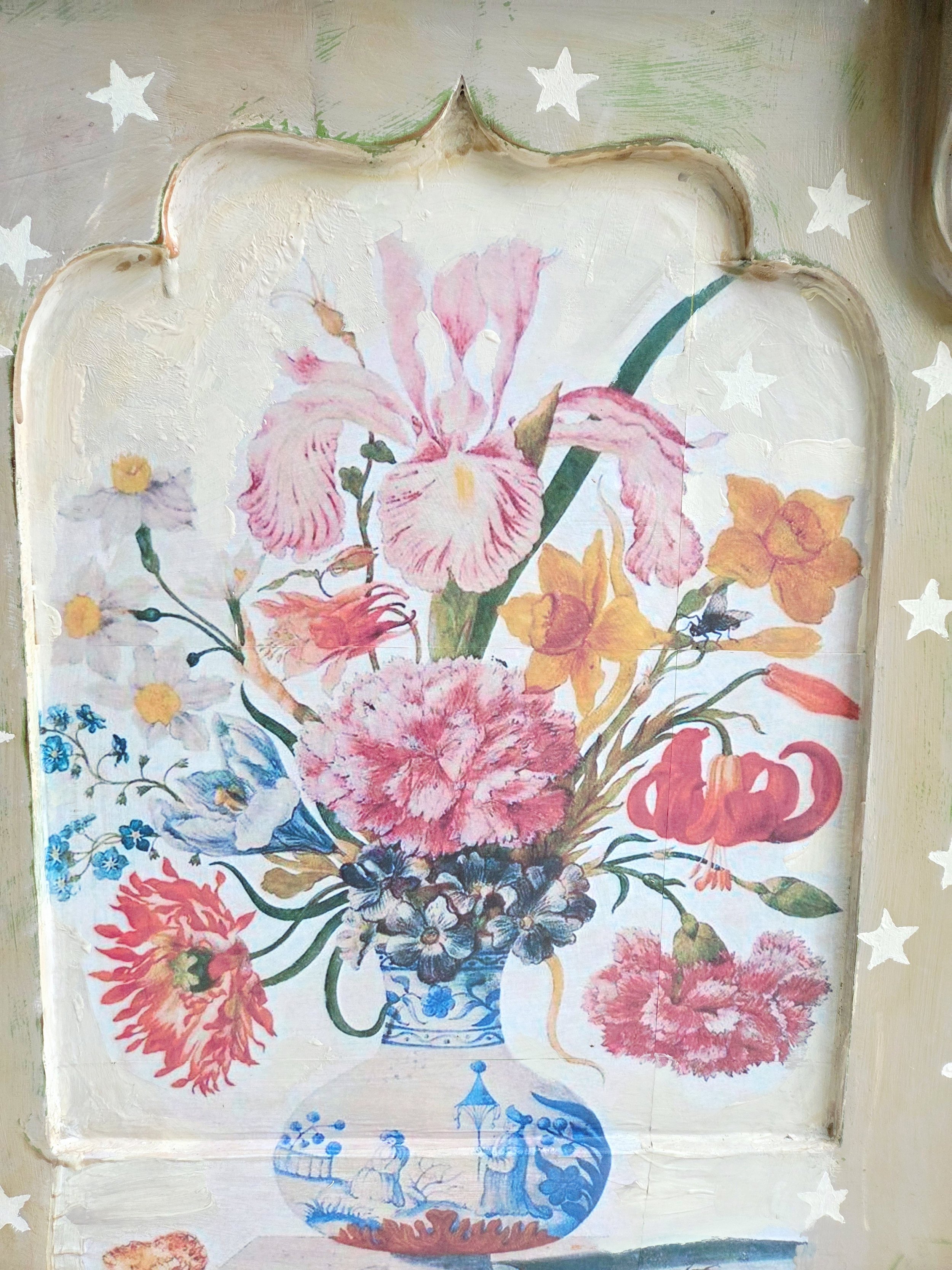 The decoupage has been made by myself and has been printed in fade-resistant ink designed to last up to 100 years before any fading occurs. Then painted over the top to blend all of the components together. The text reads, in the green of the undercoat ‘anything is possible’. The right hand door has been finished with stencilled stars.