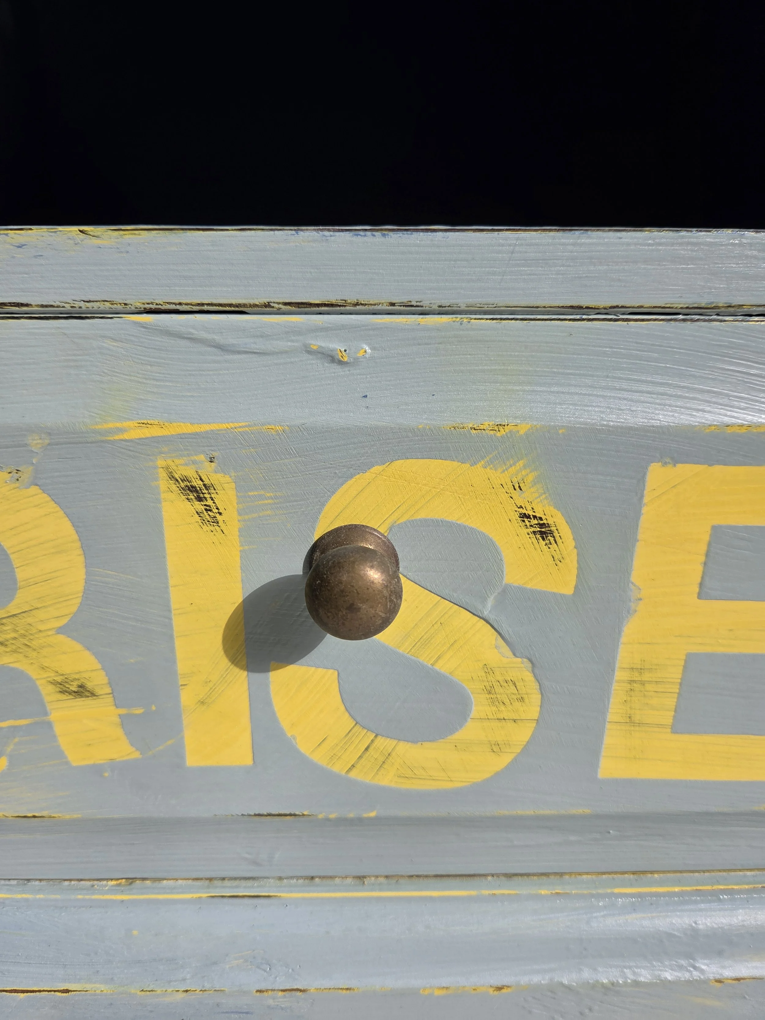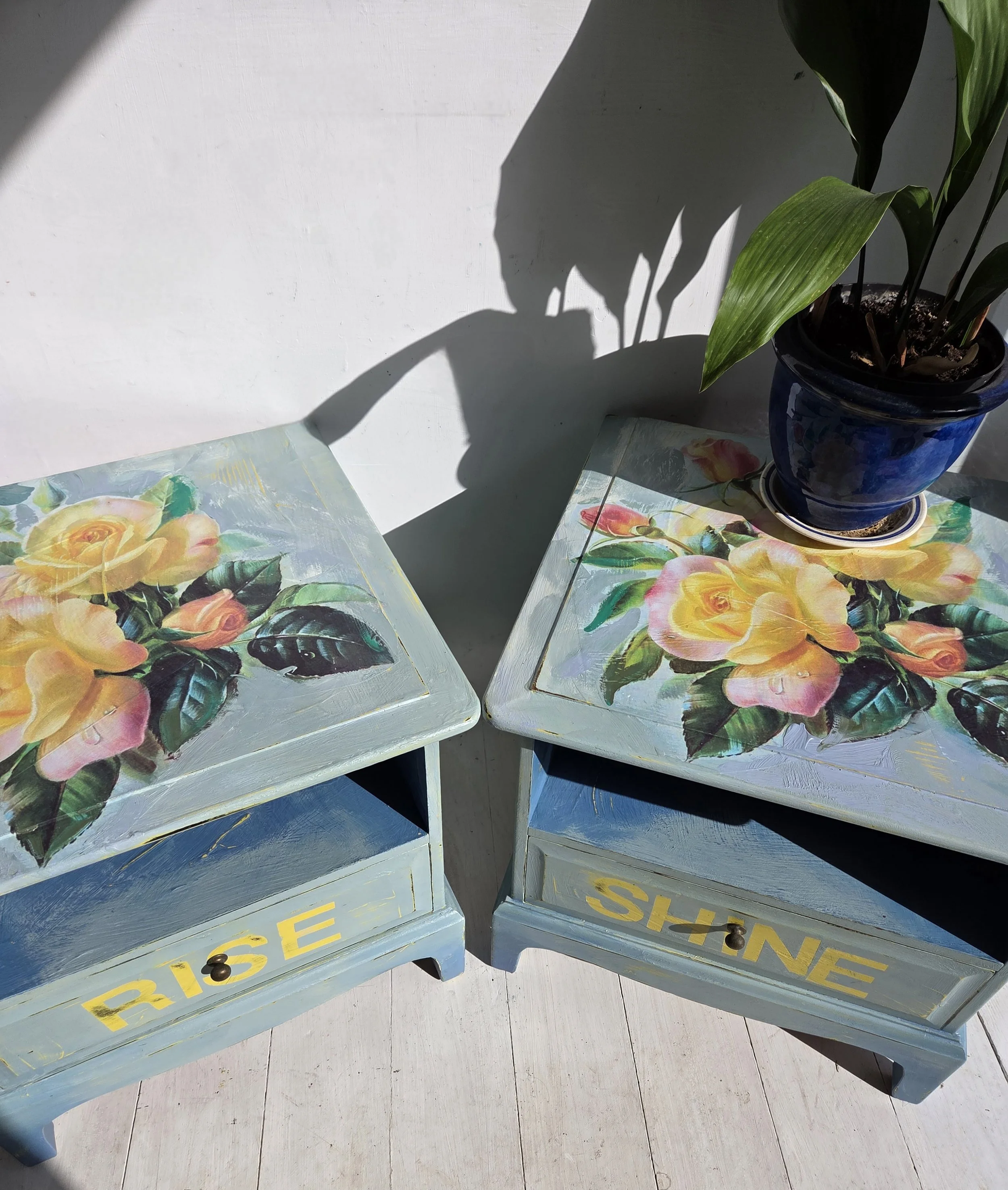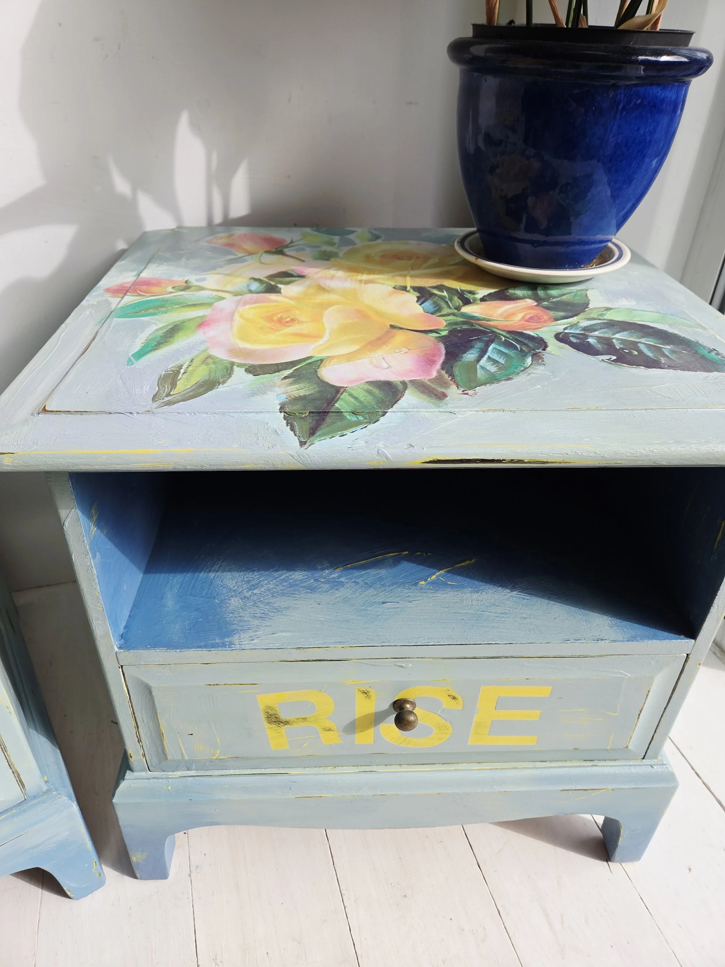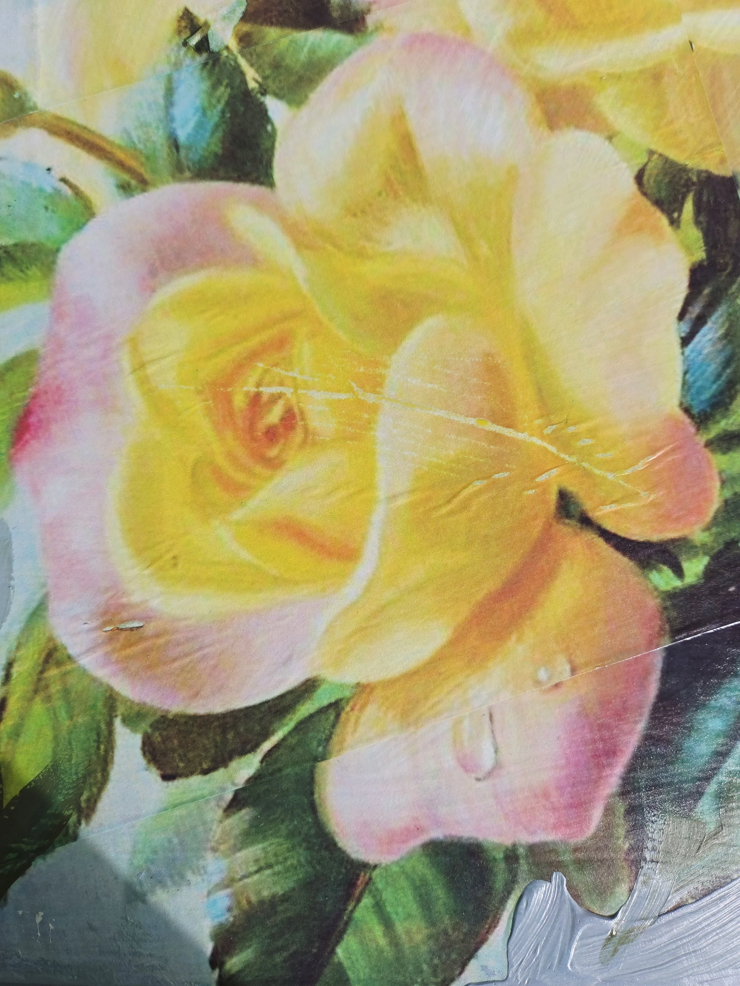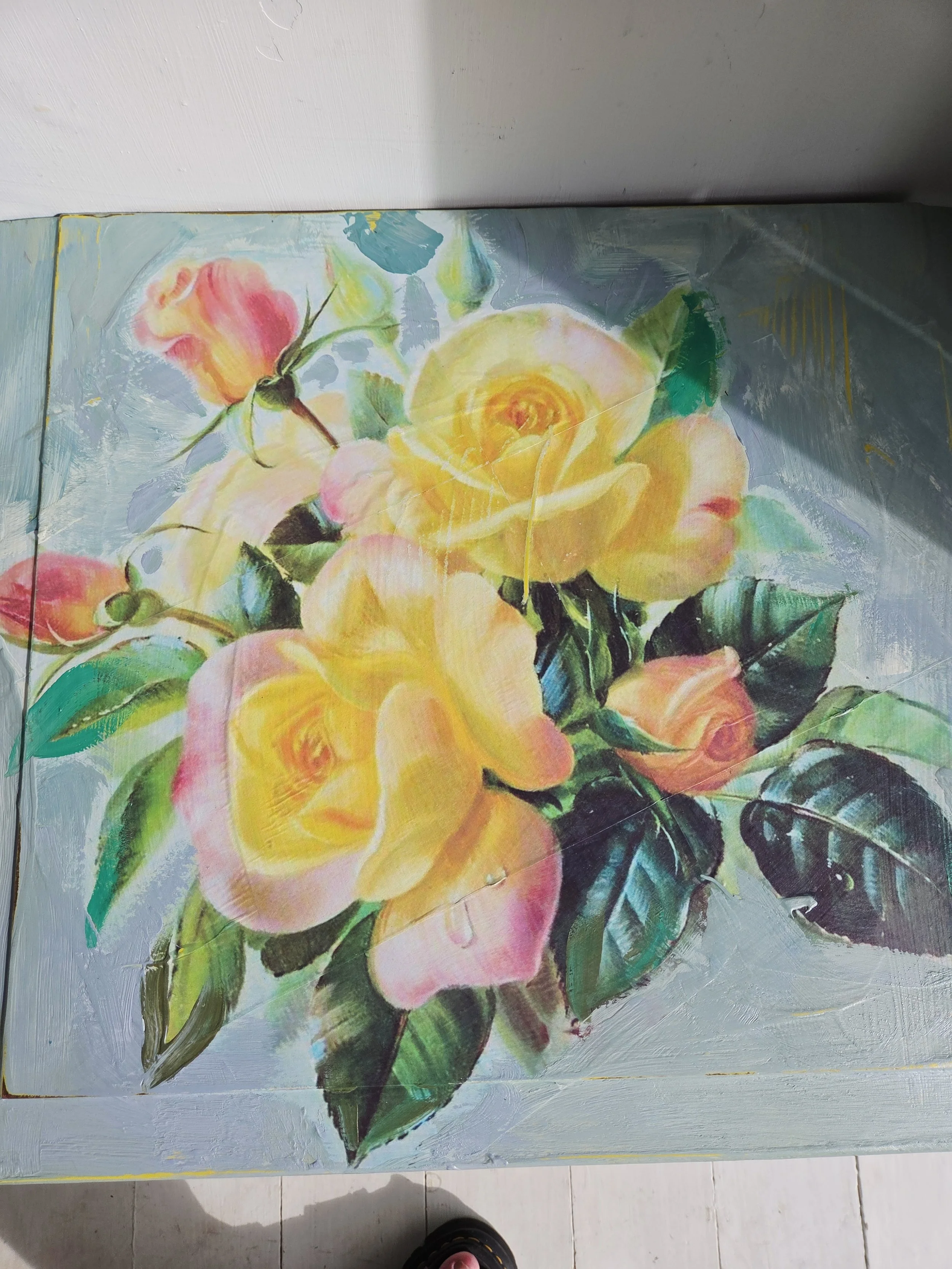 The decoupage consists of a vintage still life of yellow roses and has been printed in fade-resistant ink designed to last up to 100 years before any fading occurs. Then painted over the top to blend all of the components together. The text reads, in the colours of the undercoat ‘Rise’ and ‘Shine’.