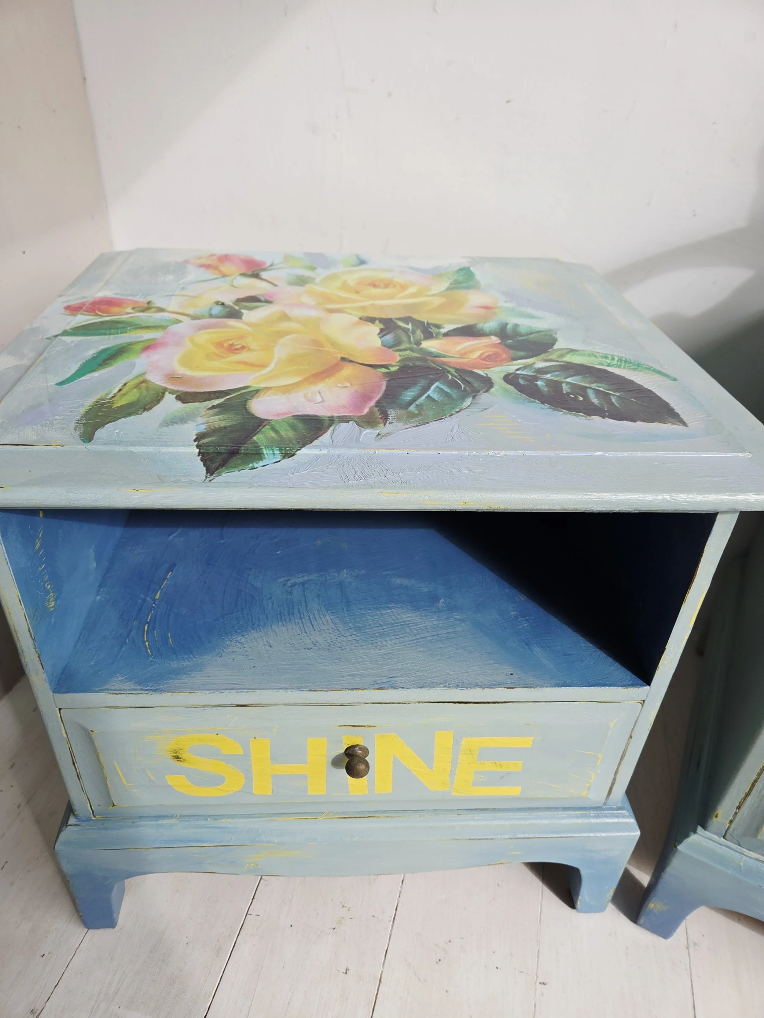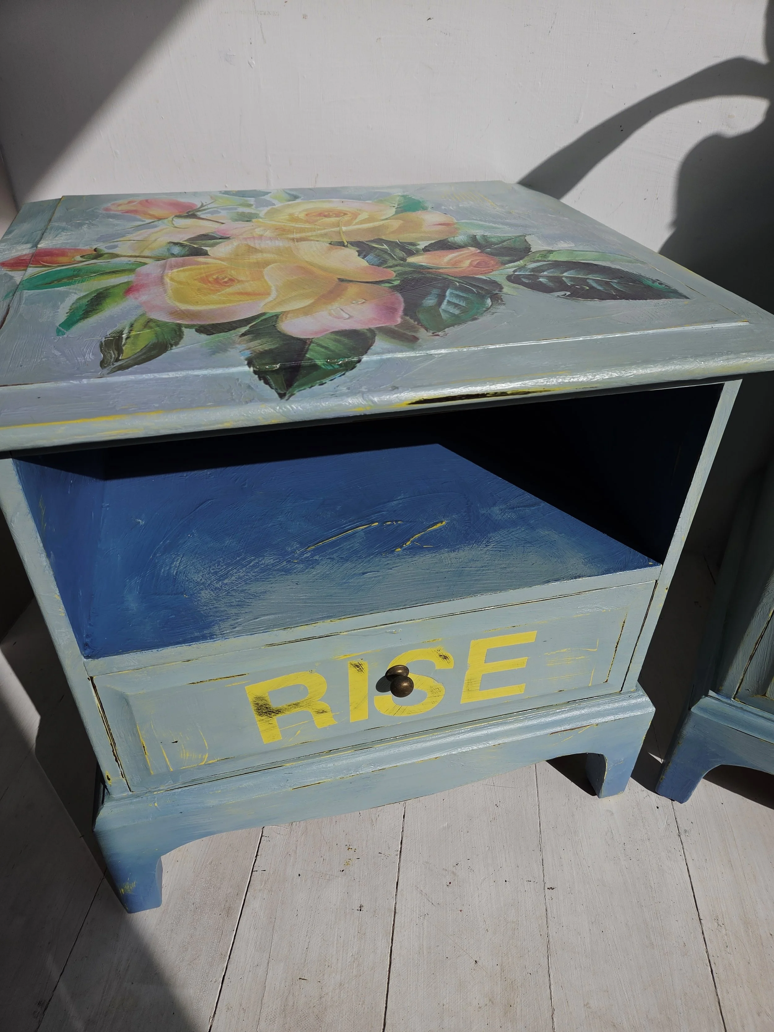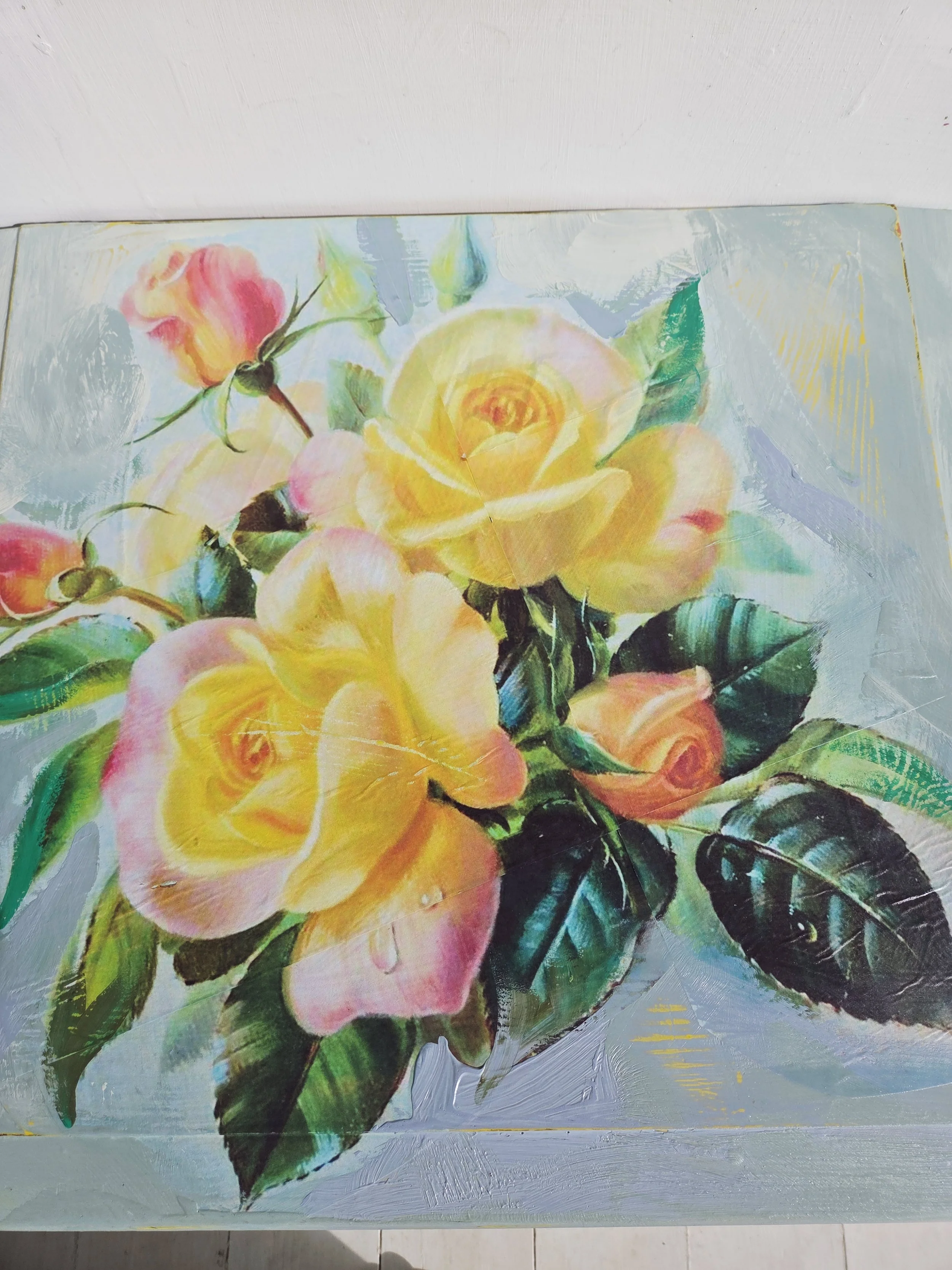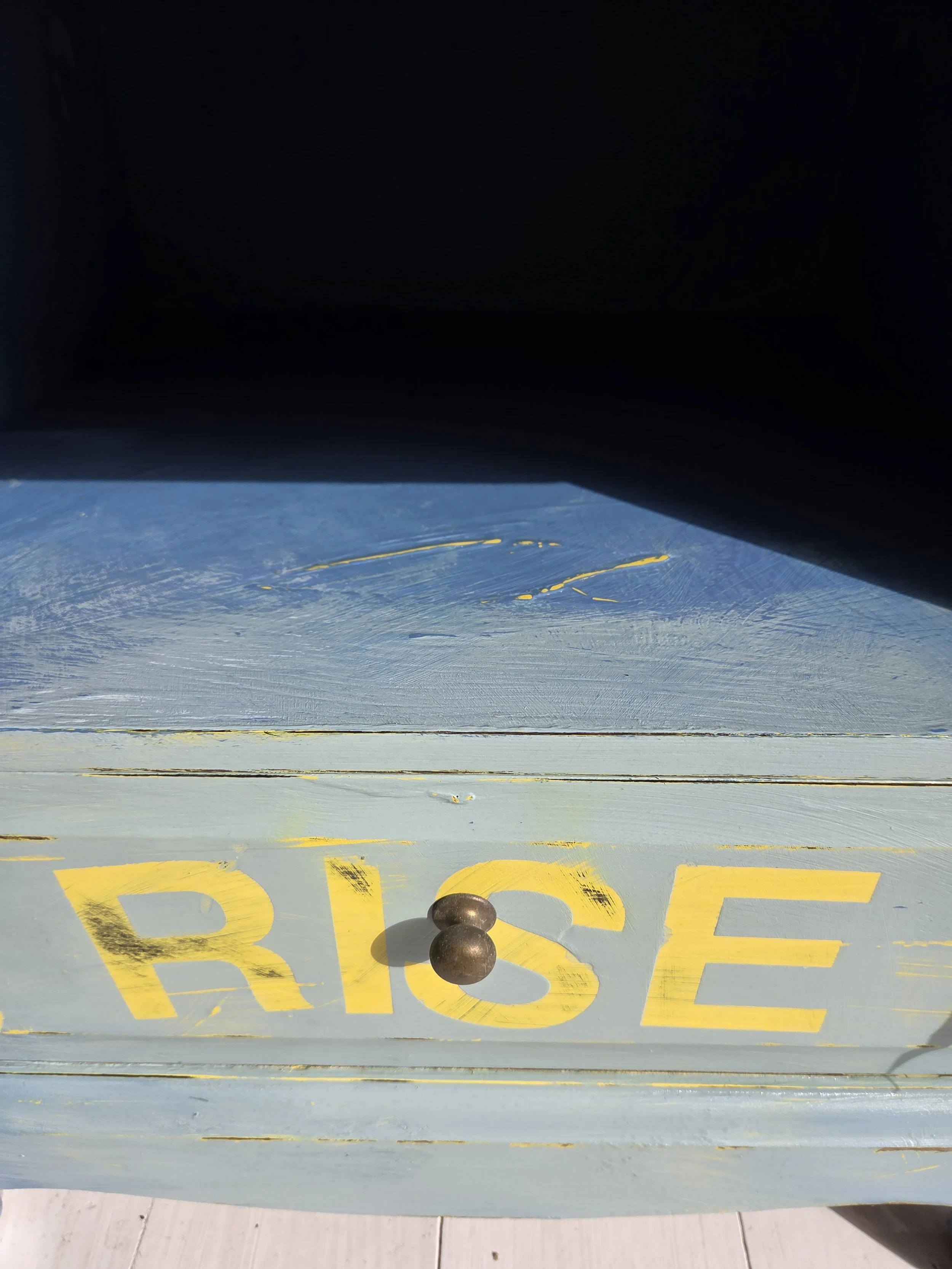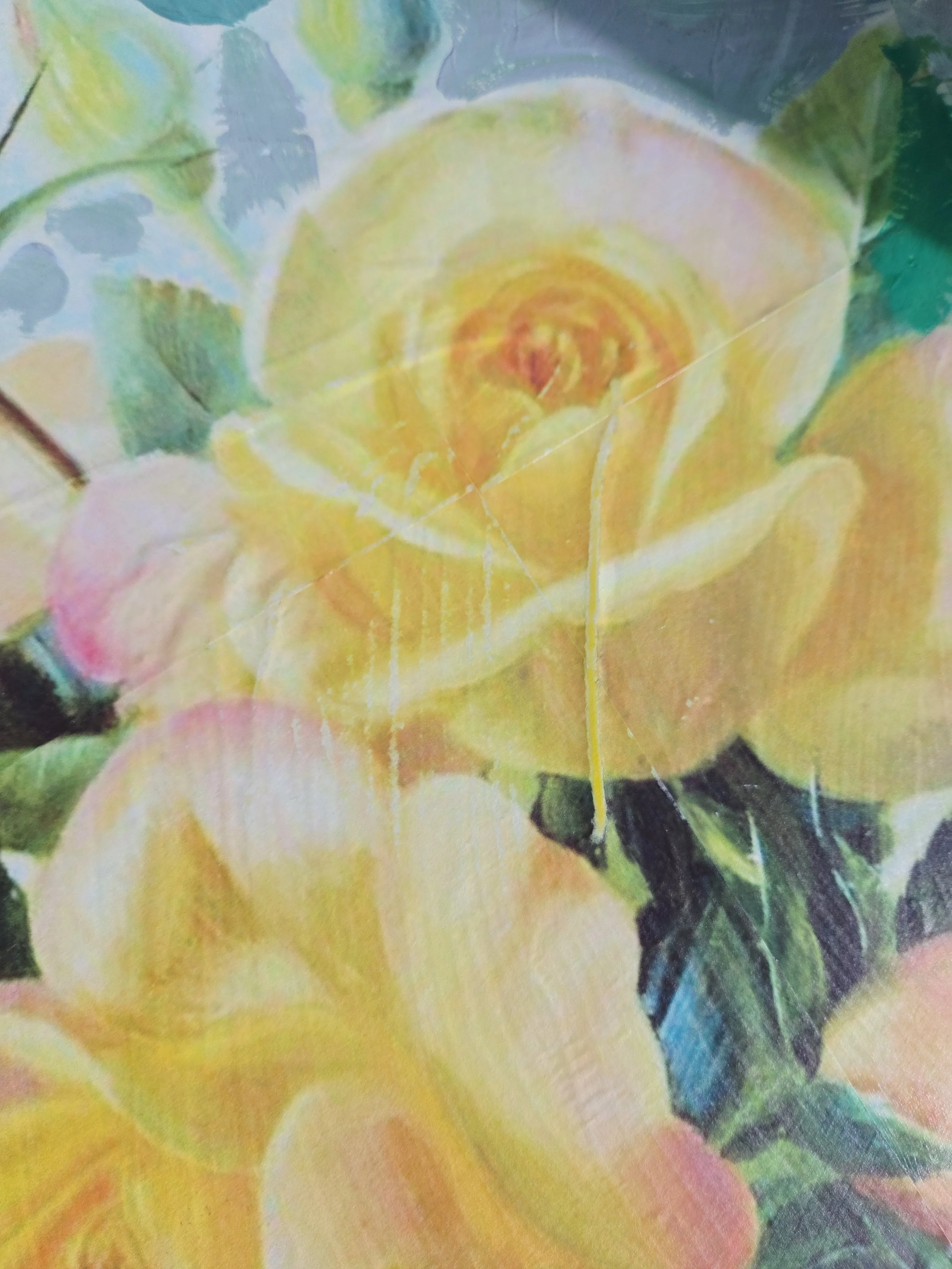 The decoupage consists of a vintage still life of yellow roses and has been printed in fade-resistant ink designed to last up to 100 years before any fading occurs. Then painted over the top to blend all of the components together. The text reads, in the colours of the undercoat ‘Rise’ and ‘Shine’.