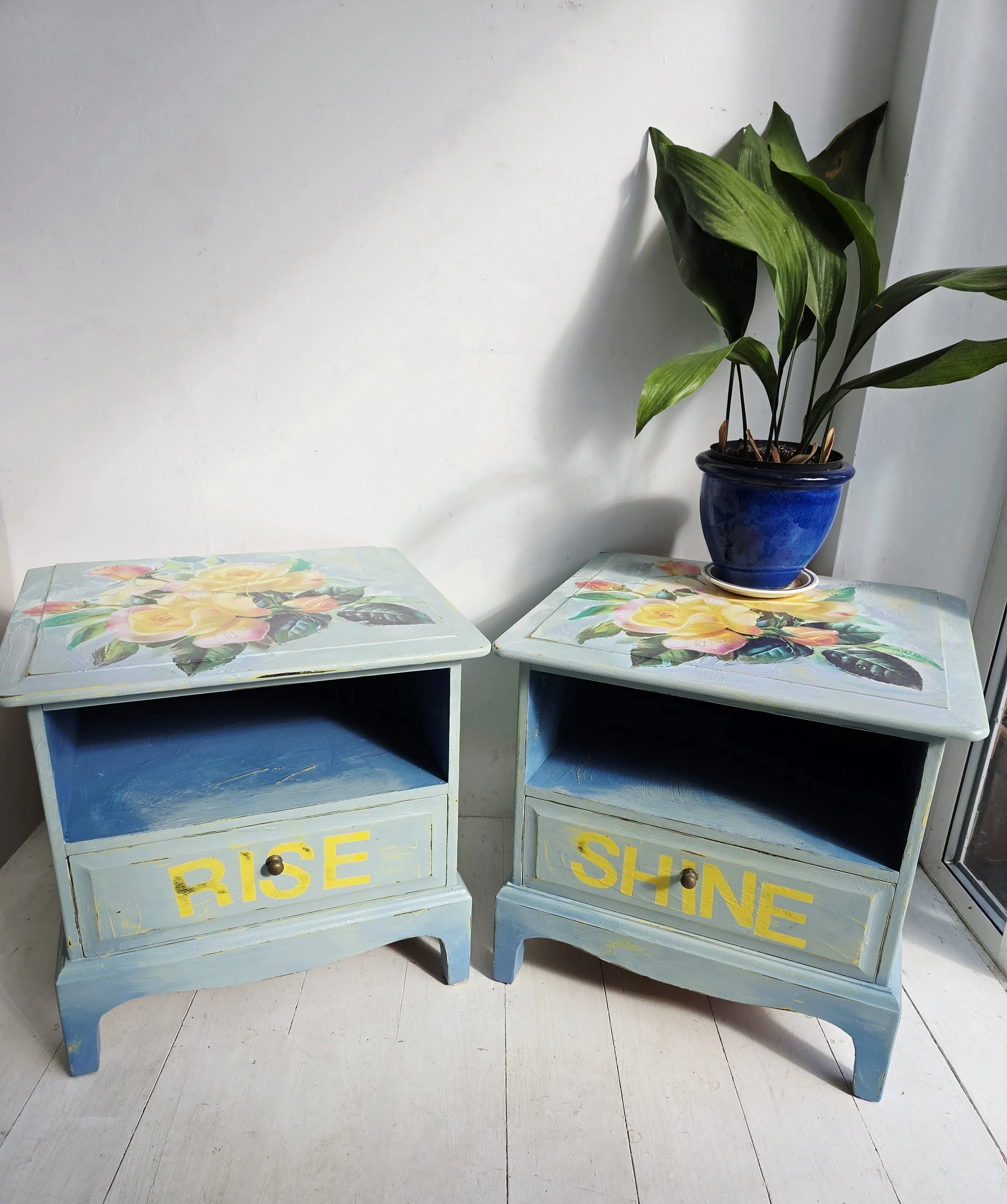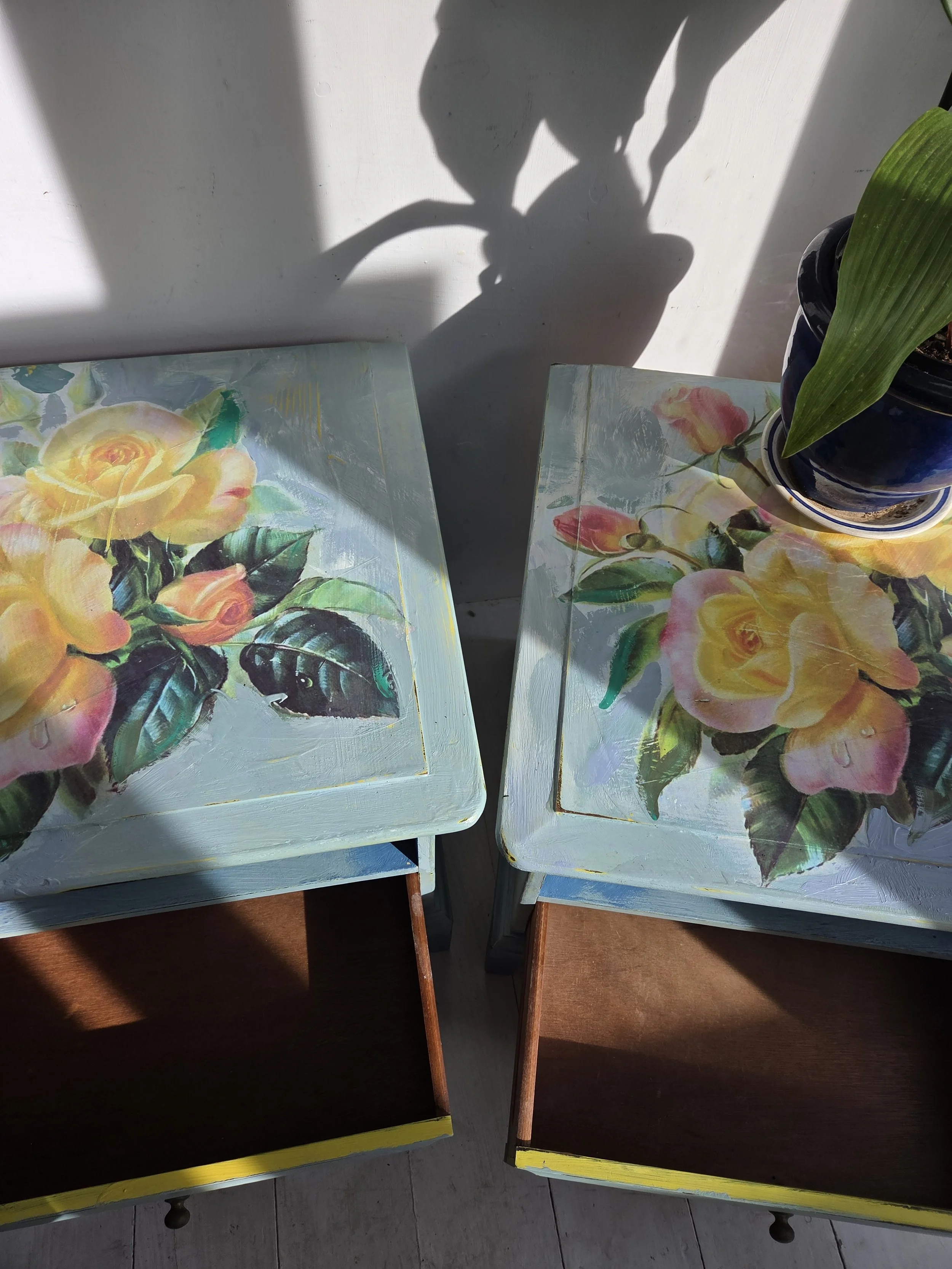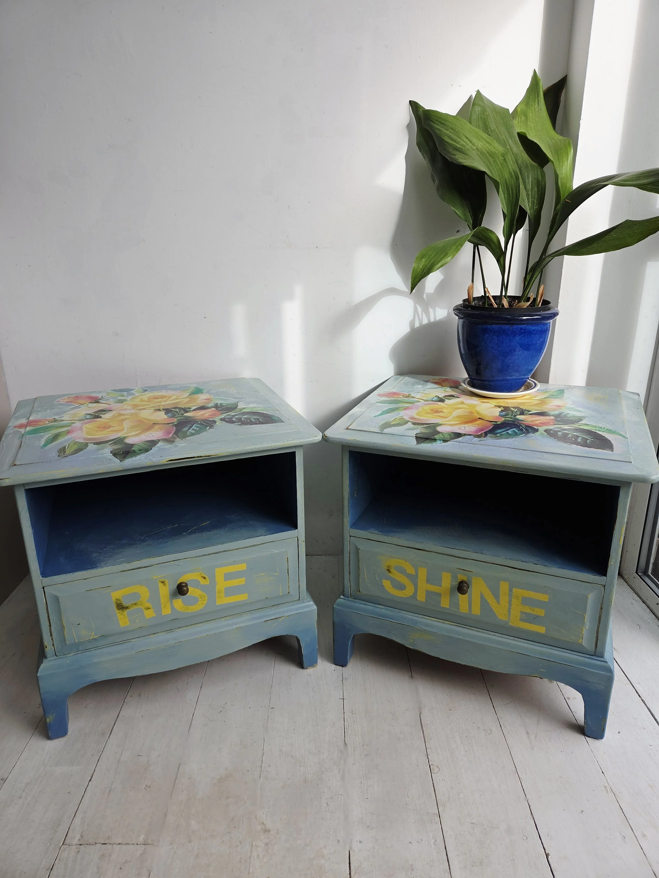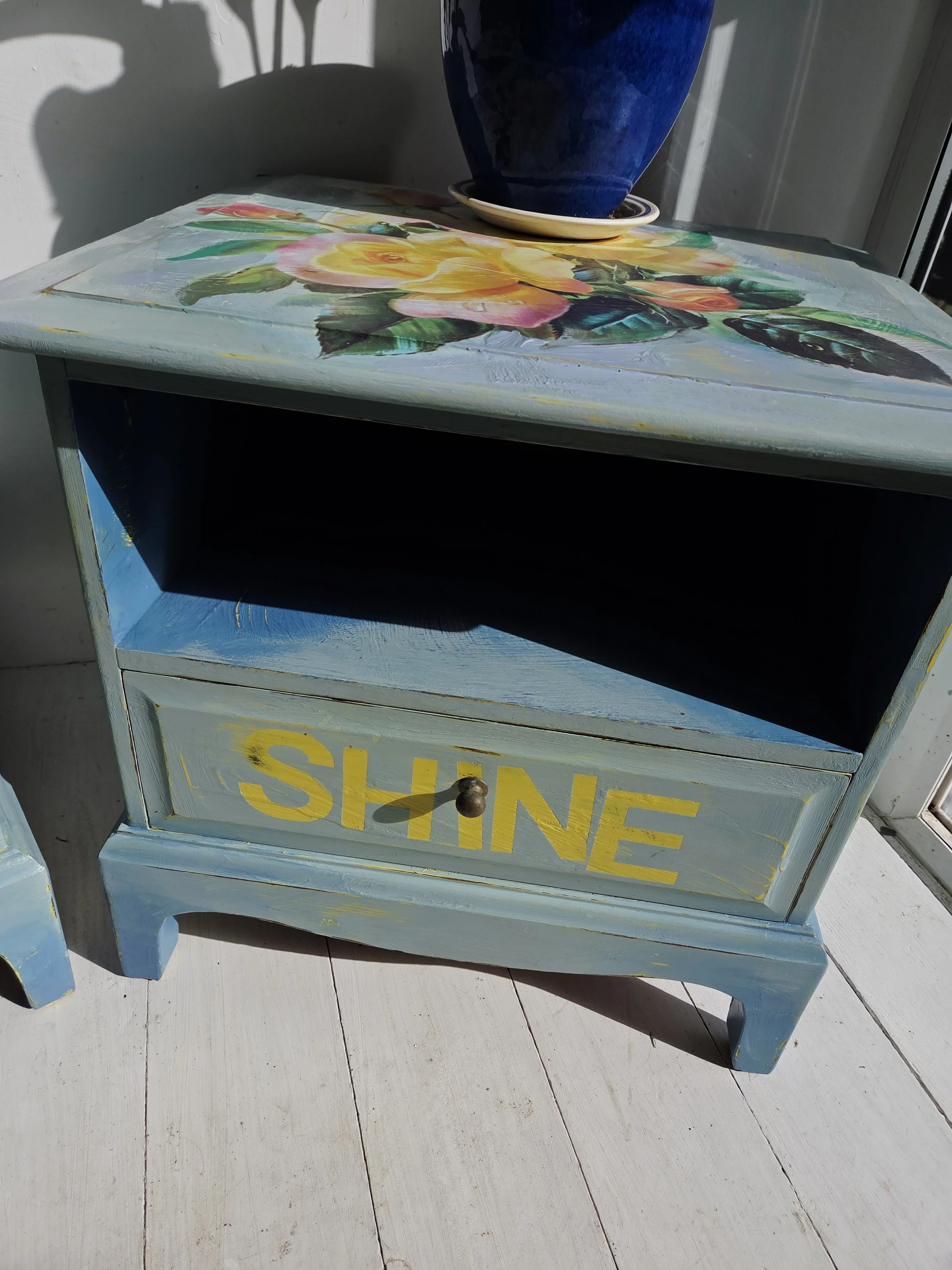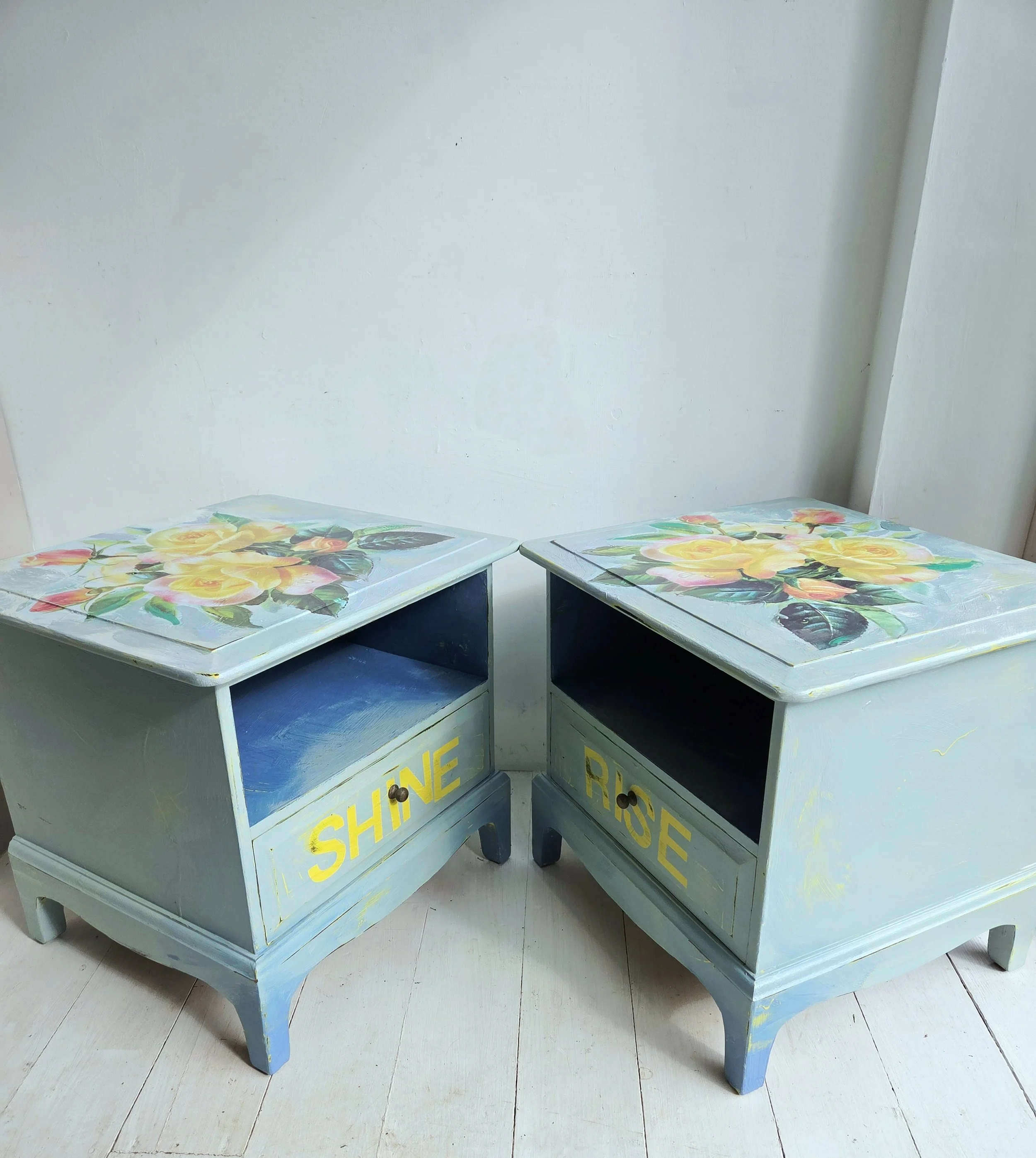 The decoupage consists of a vintage still life of yellow roses and has been printed in fade-resistant ink designed to last up to 100 years before any fading occurs. Then painted over the top to blend all of the components together. The text reads, in the colours of the undercoat ‘Rise’ and ‘Shine’.