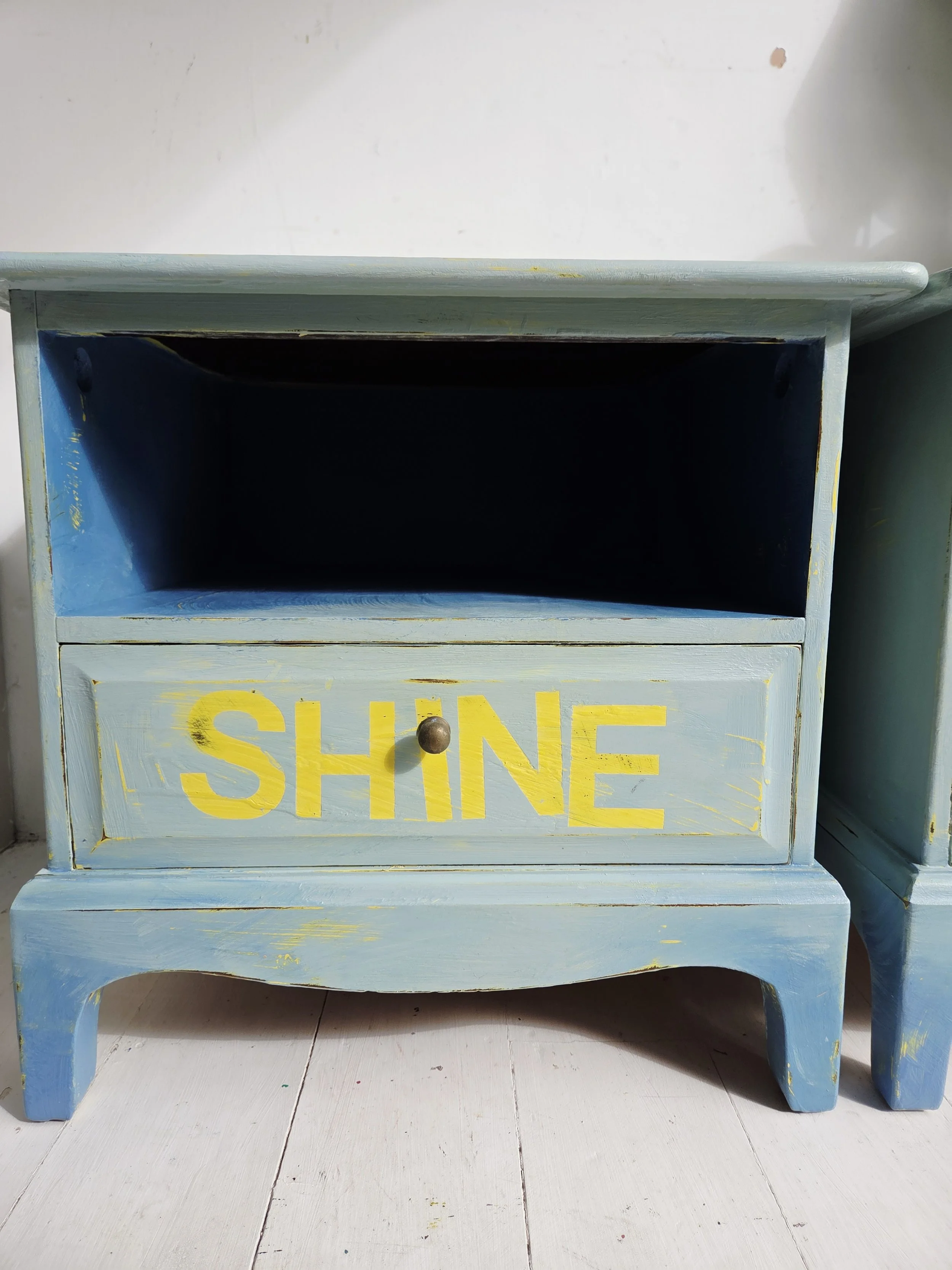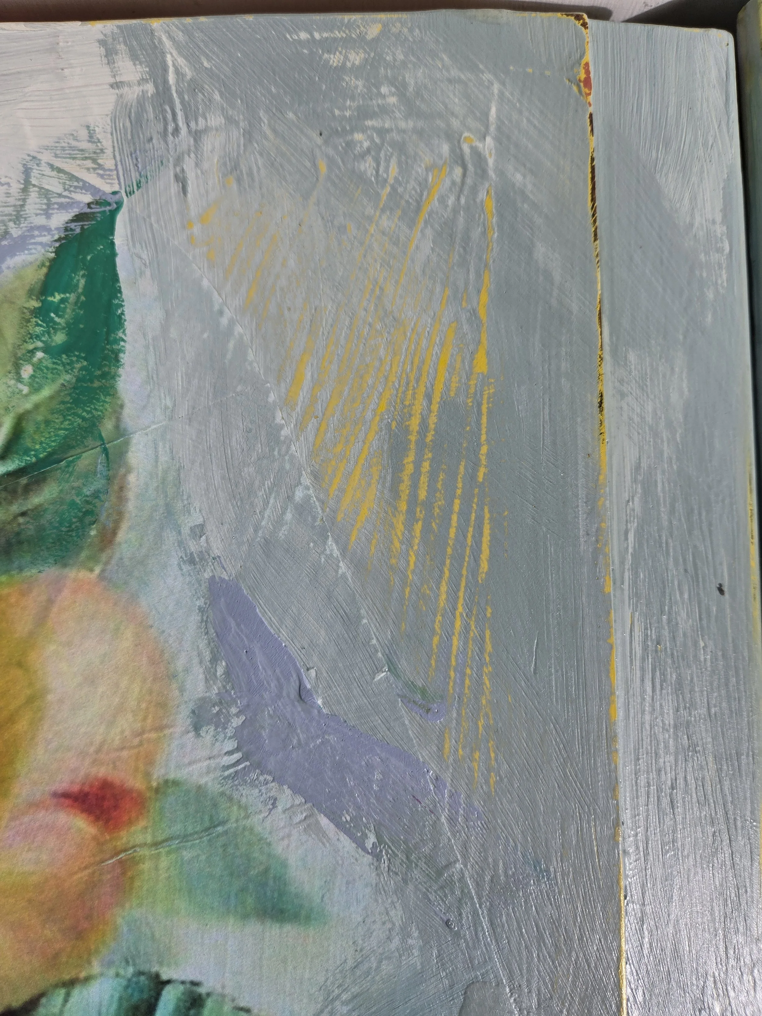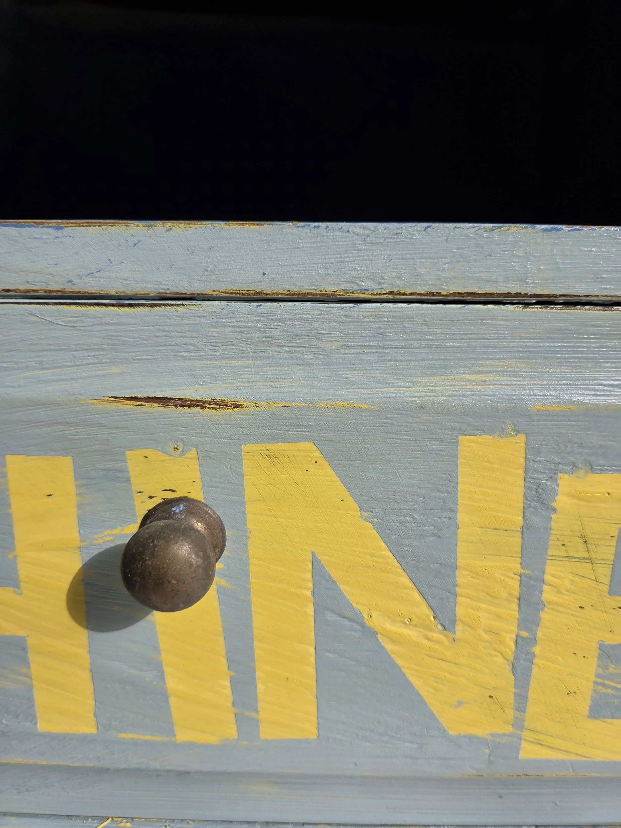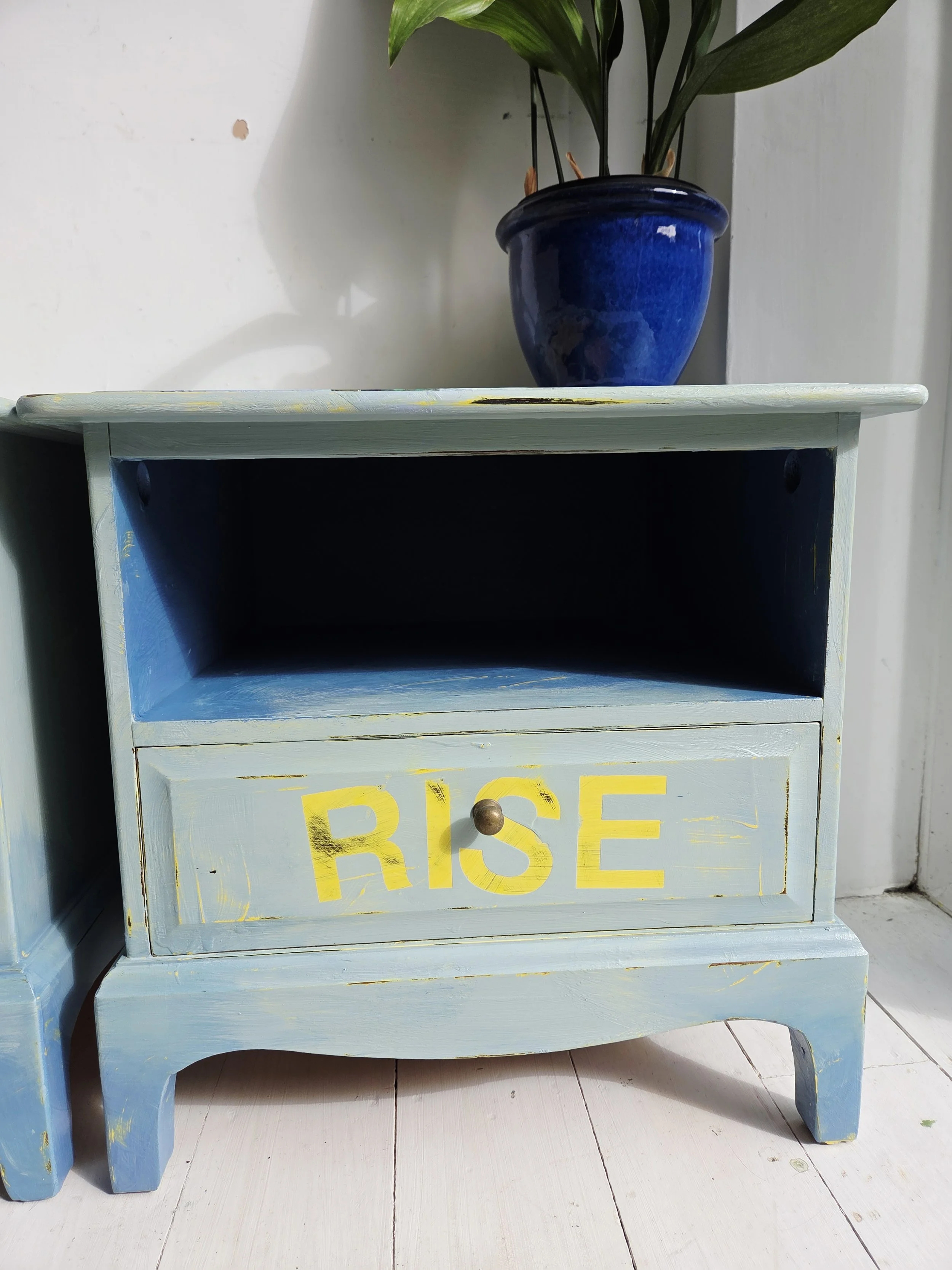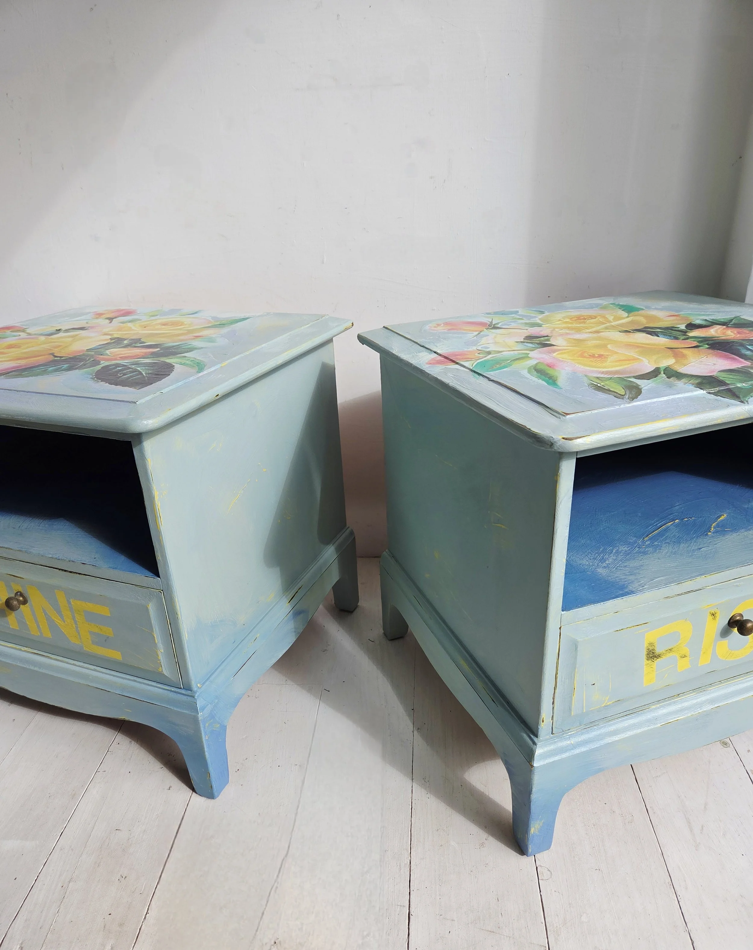 The decoupage consists of a vintage still life of yellow roses and has been printed in fade-resistant ink designed to last up to 100 years before any fading occurs. Then painted over the top to blend all of the components together. The text reads, in the colours of the undercoat ‘Rise’ and ‘Shine’.