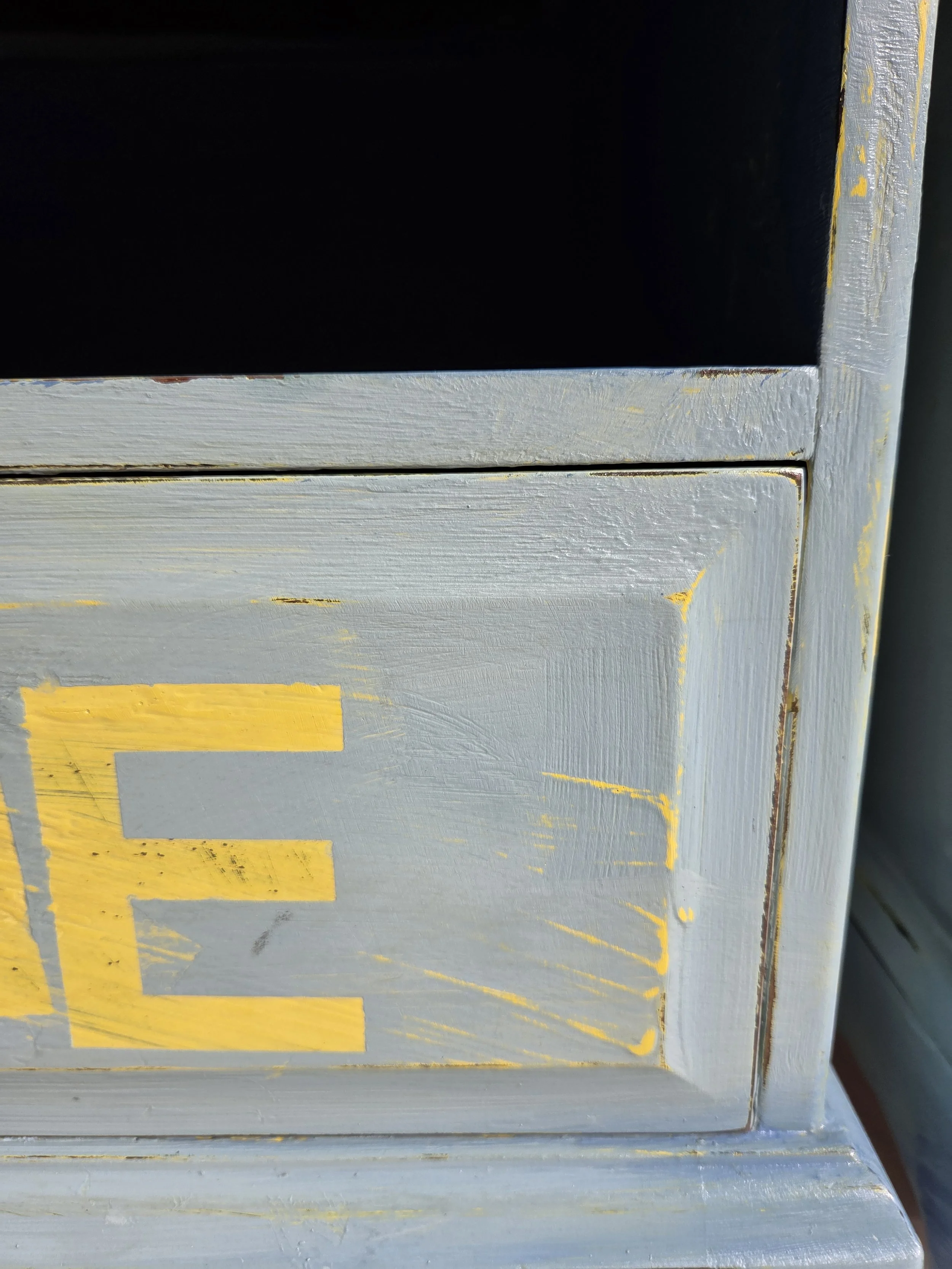 Distressed all over to reveal glimpses of the undercoat and back to wood in some areas to age it. I paint thickly, with texture to create the feel of a genuinely aged bohemian piece that retains the spirit of the furniture.