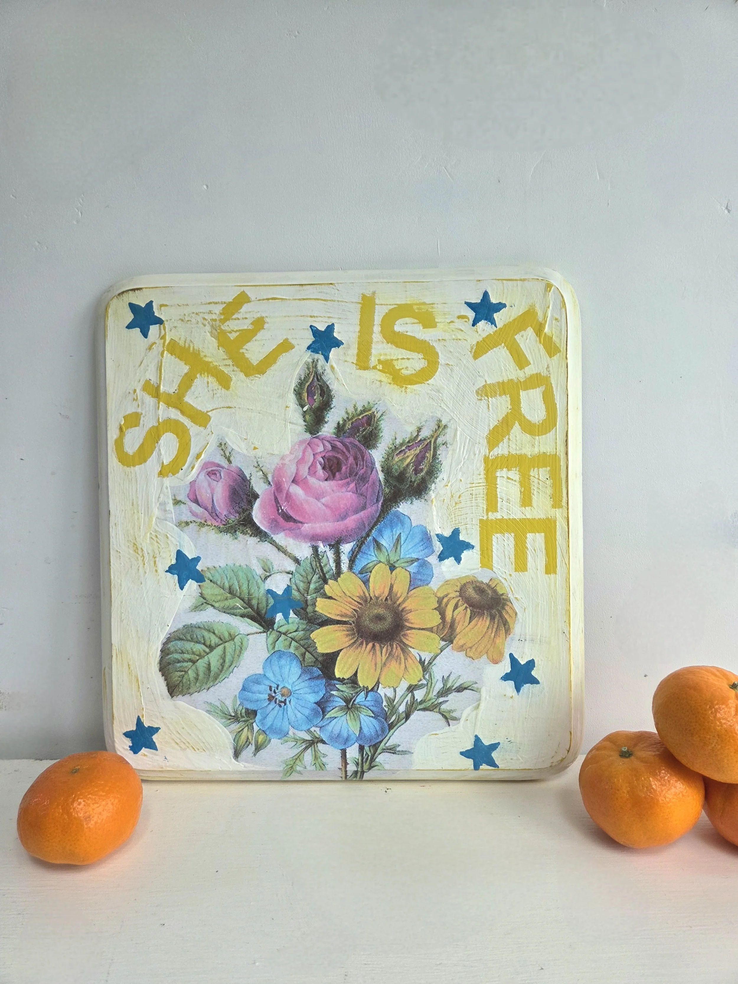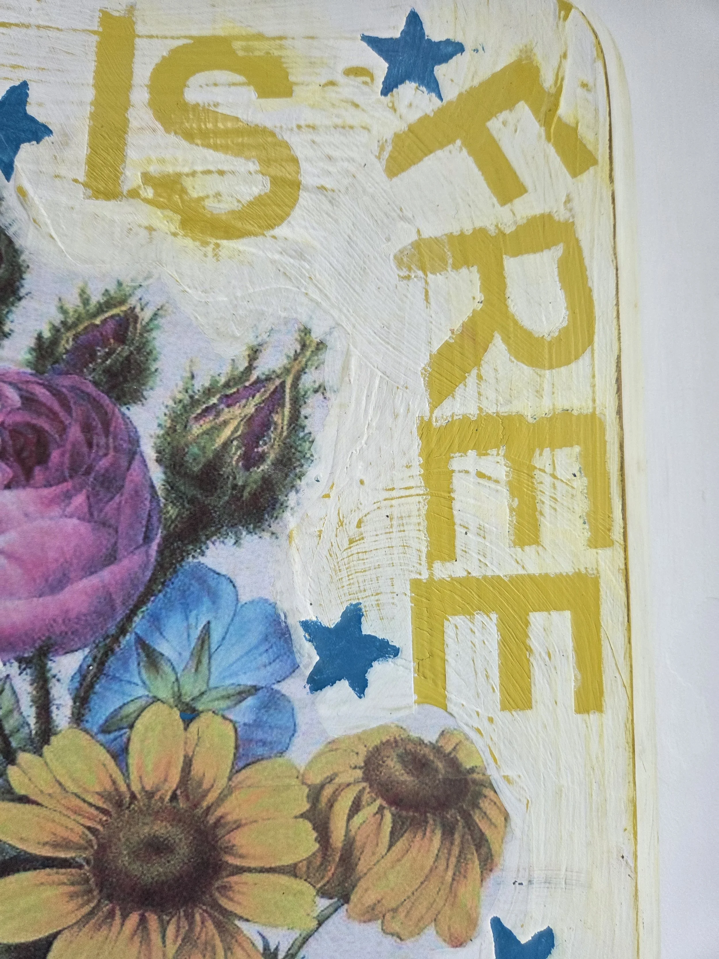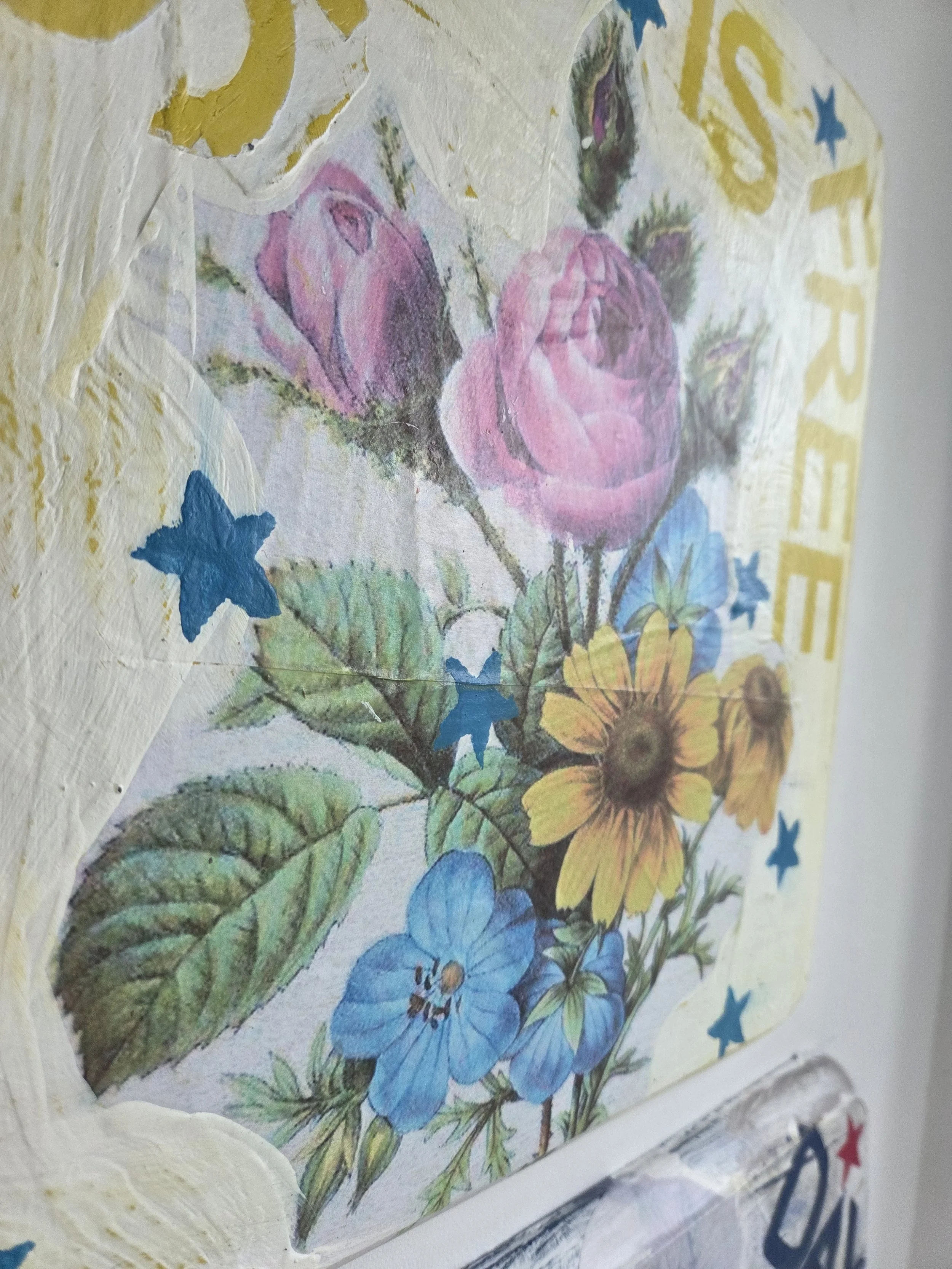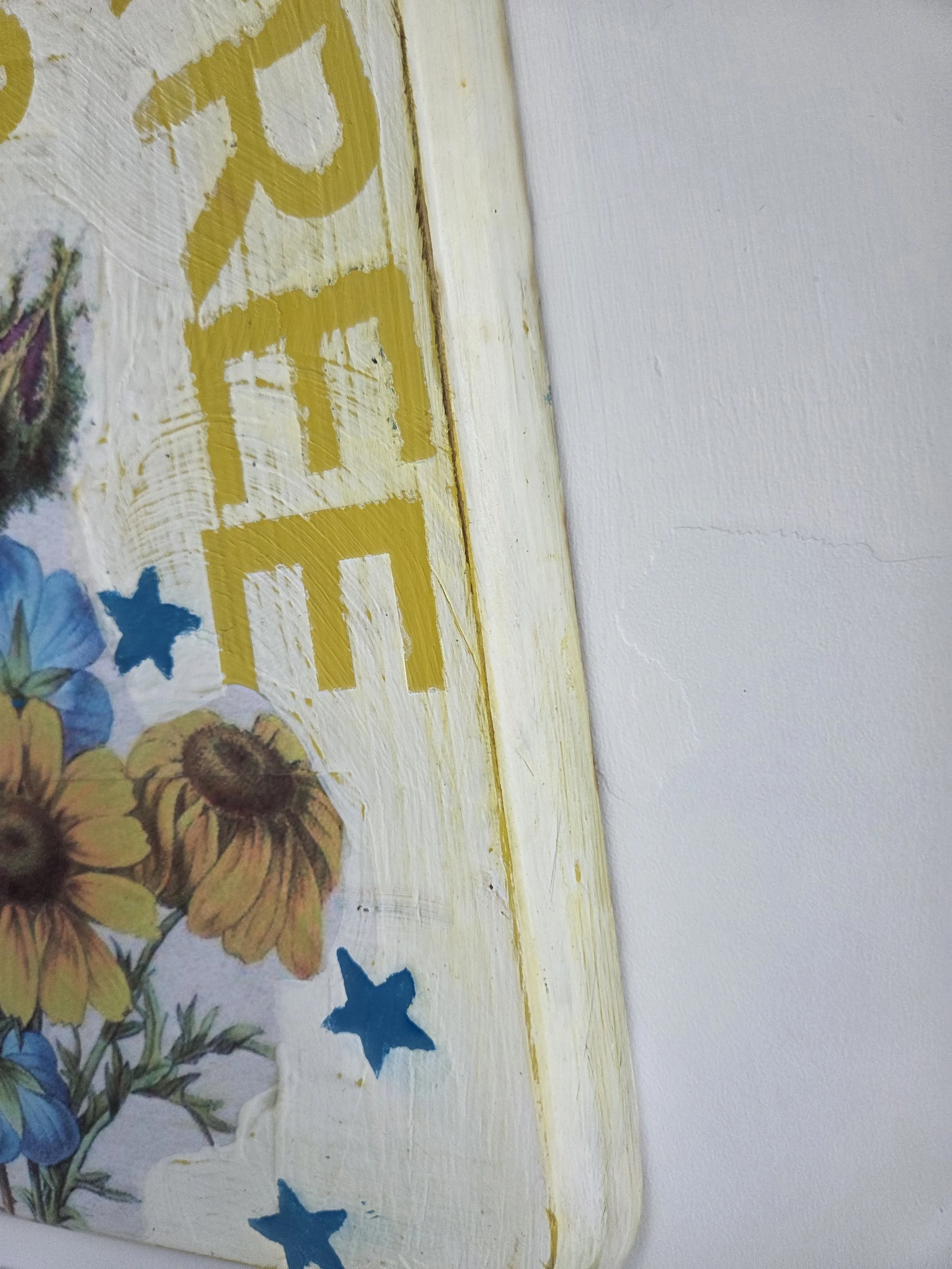 Painted in thick layers of paint. The image is an vintage illustration and has been printed, by myself, in fade resistant ink. Applied using the decoupage technique. I have then painted across the top in very thick, textured layers and then distressed this, in some areas back to wood. The text reads in the colour of the undercoat. Finished with stencilled orange stars.