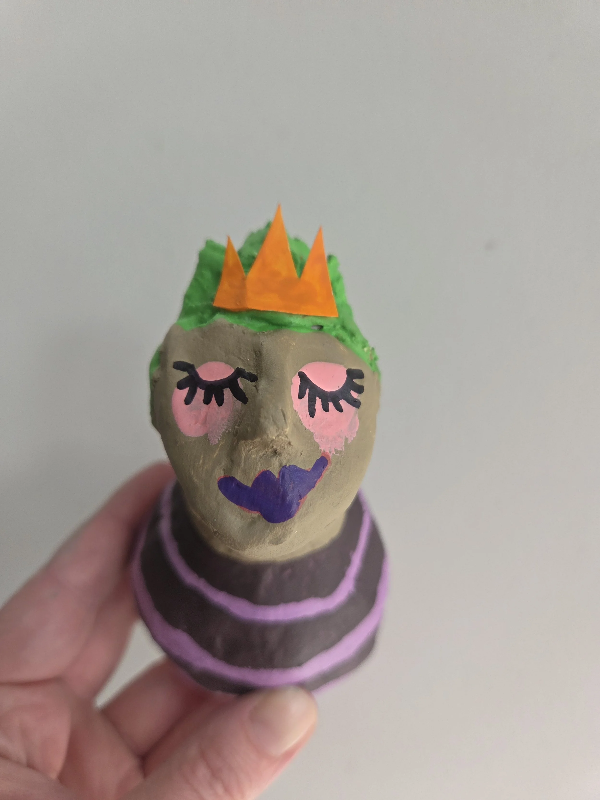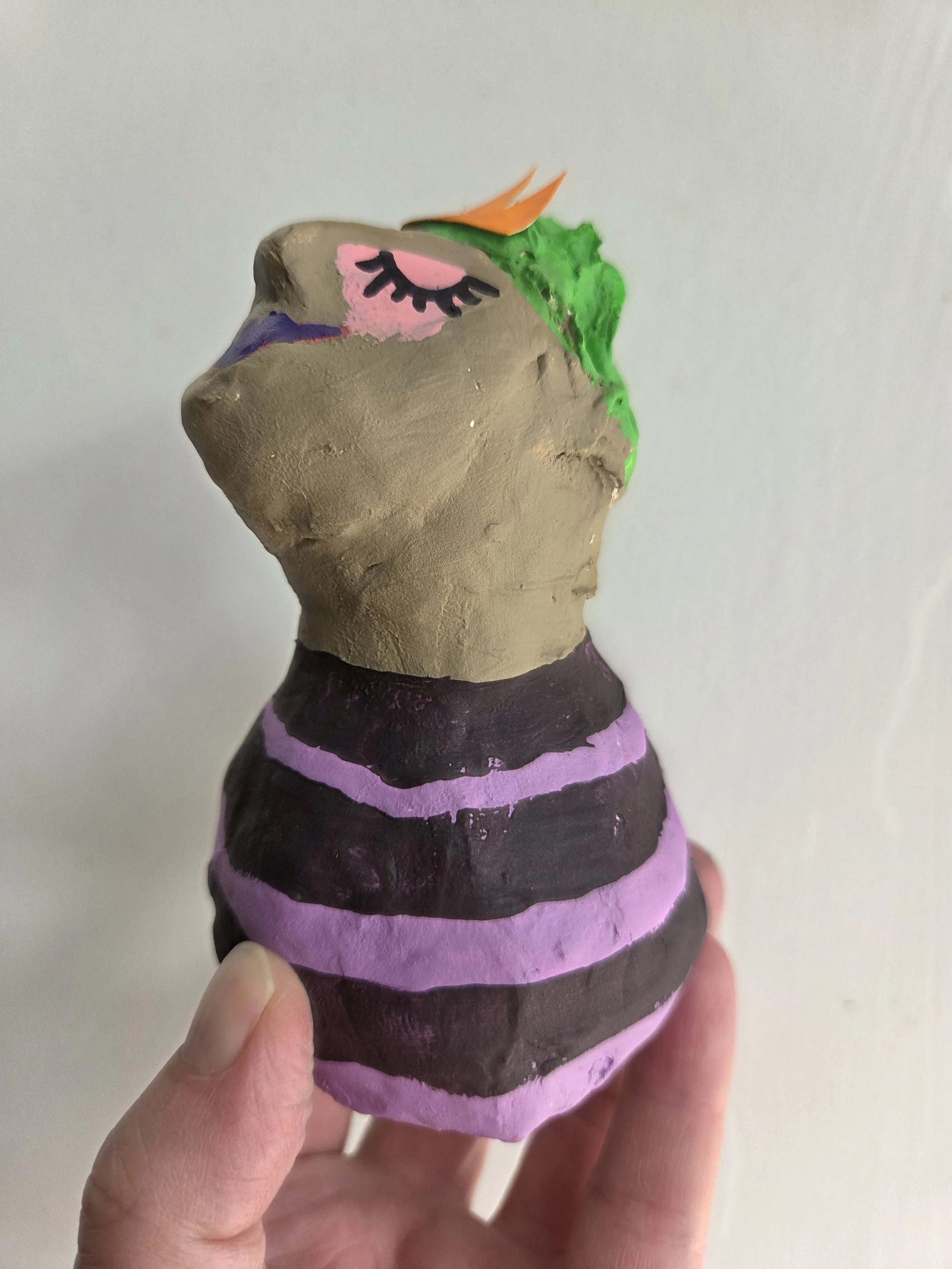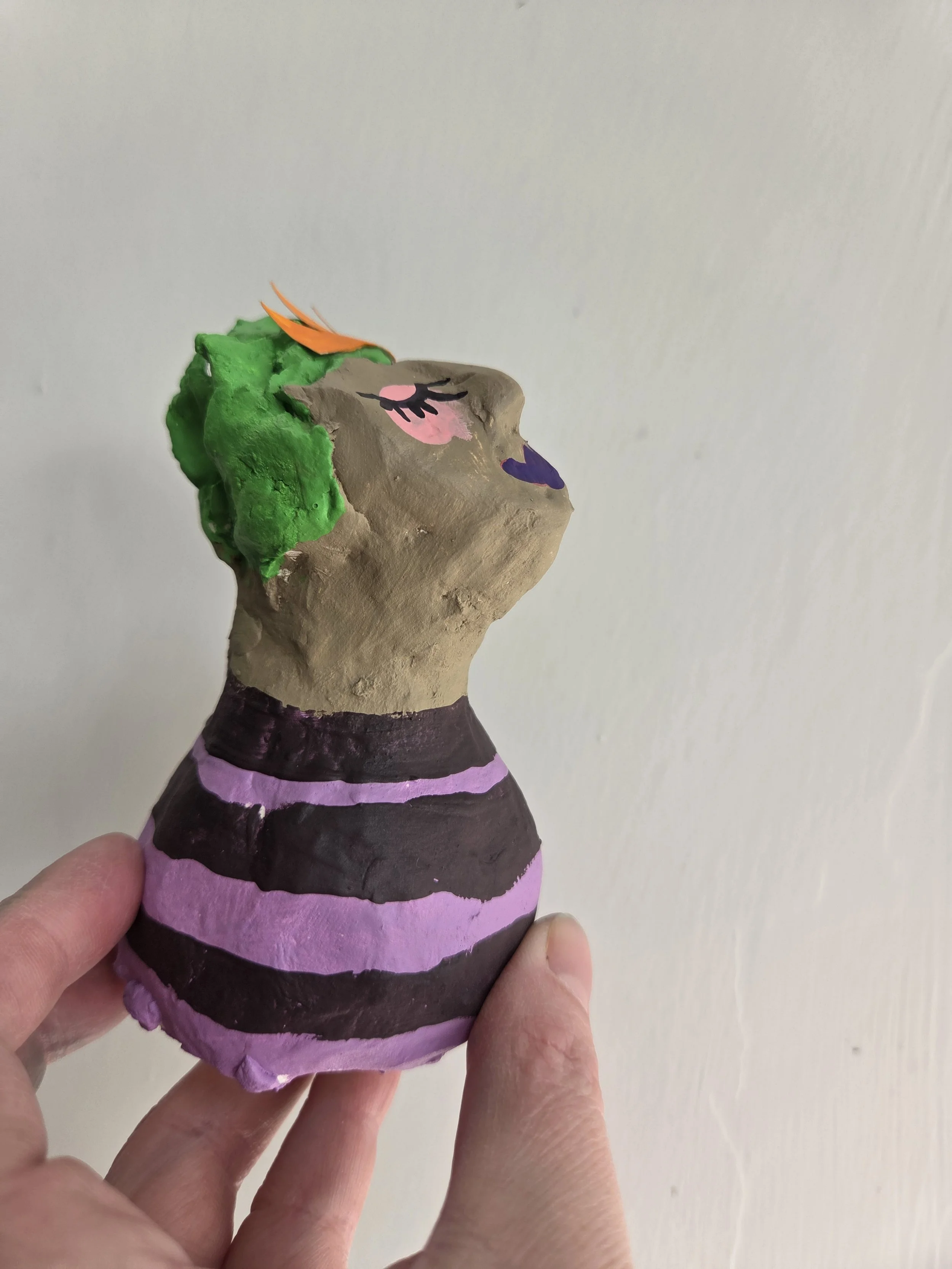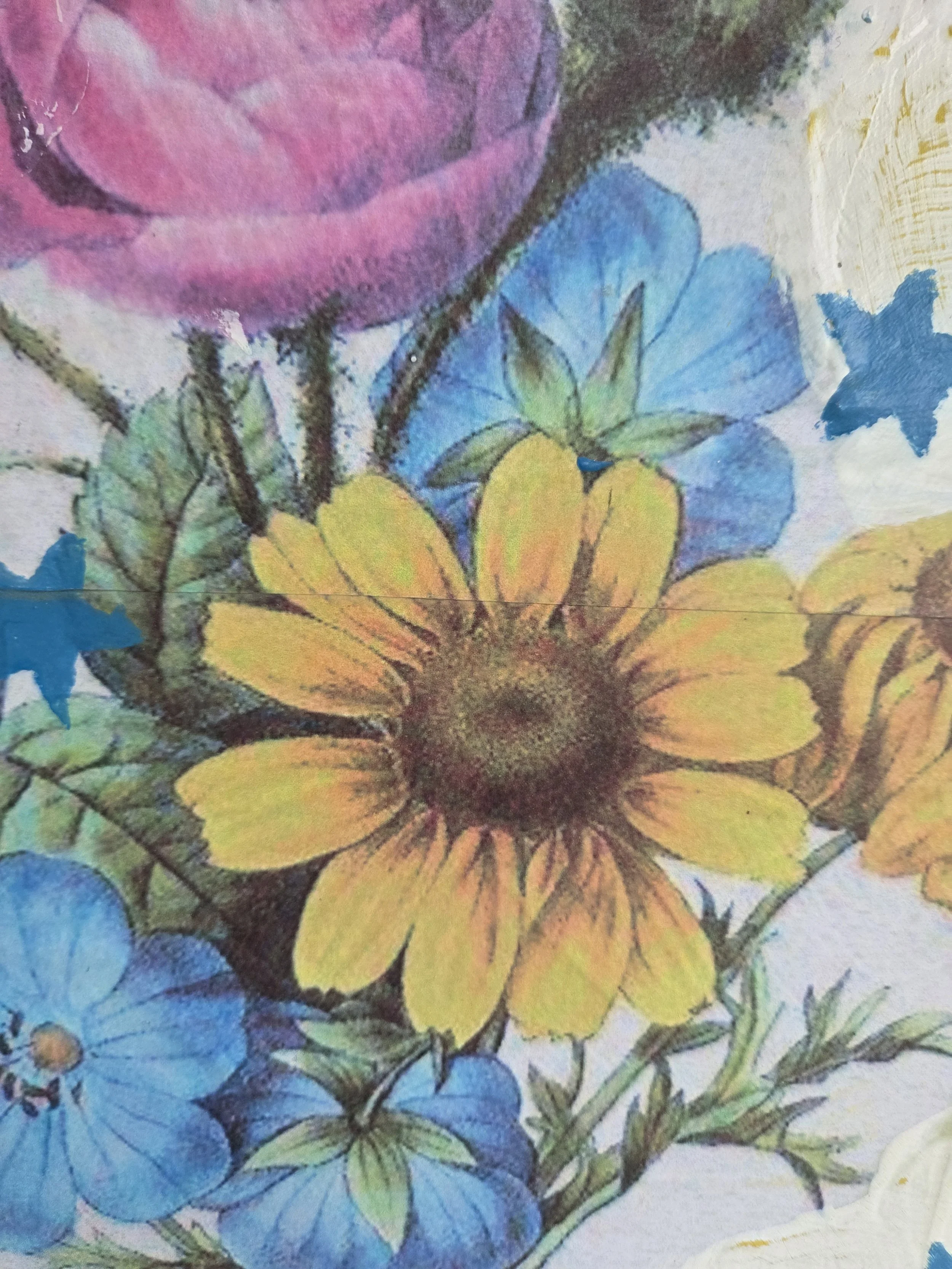 Painted in thick layers of paint. The image is an vintage illustration and has been printed, by myself, in fade resistant ink. Applied using the decoupage technique. I have then painted across the top in very thick, textured layers and then distressed this, in some areas back to wood. The text reads in the colour of the undercoat. Finished with stencilled orange stars.