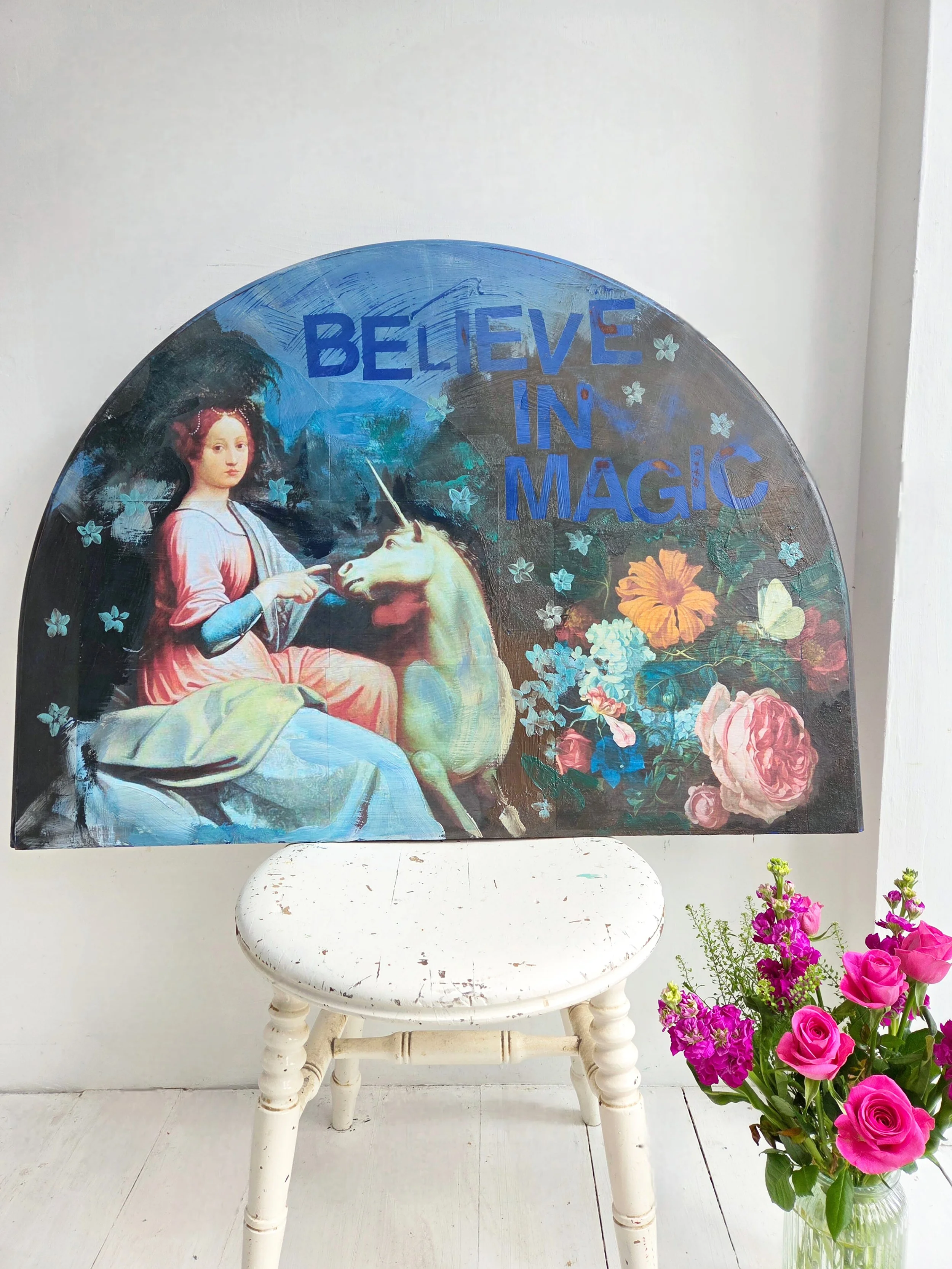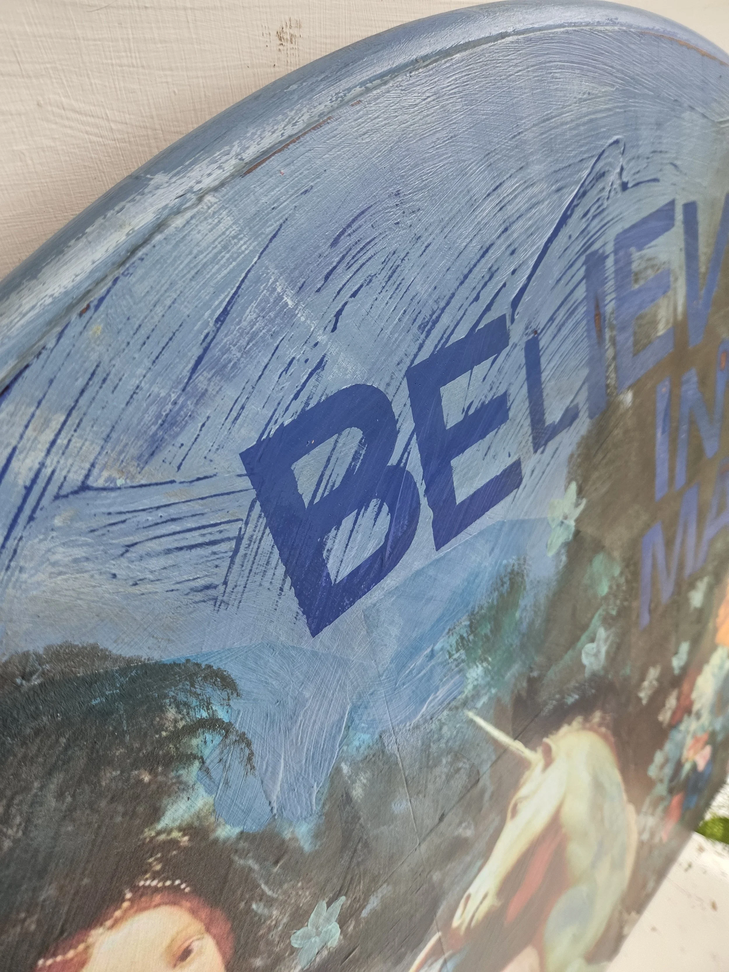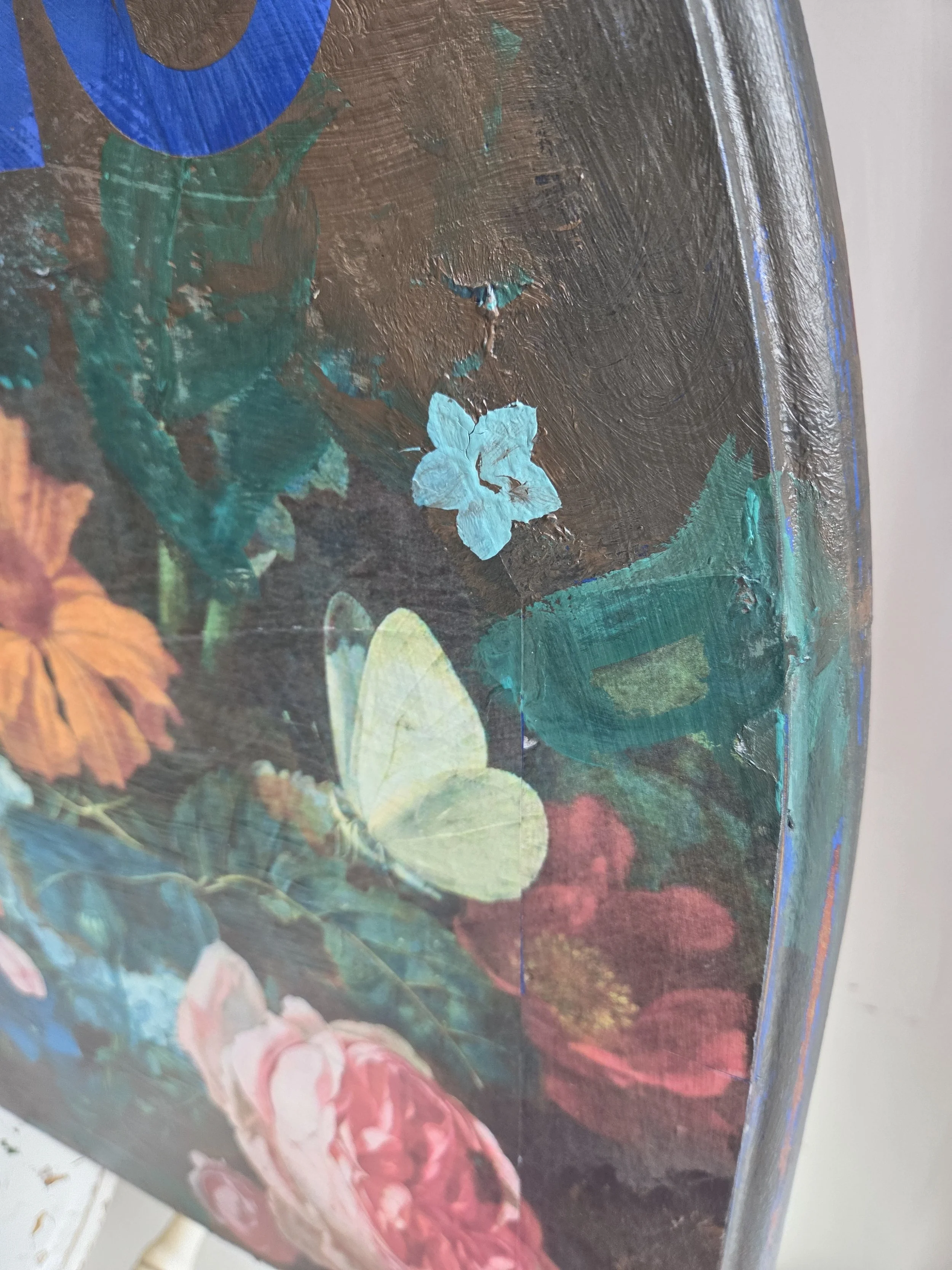 Painted in thick layers of paint. The image combines antique images and have been printed, by myself, in fade resistant ink. All applied, using the decoupage technique. I have then painted across the top in very thick, textured layers and then distressed this, in some areas back to wood. The text reads in the colour of the undercoat.