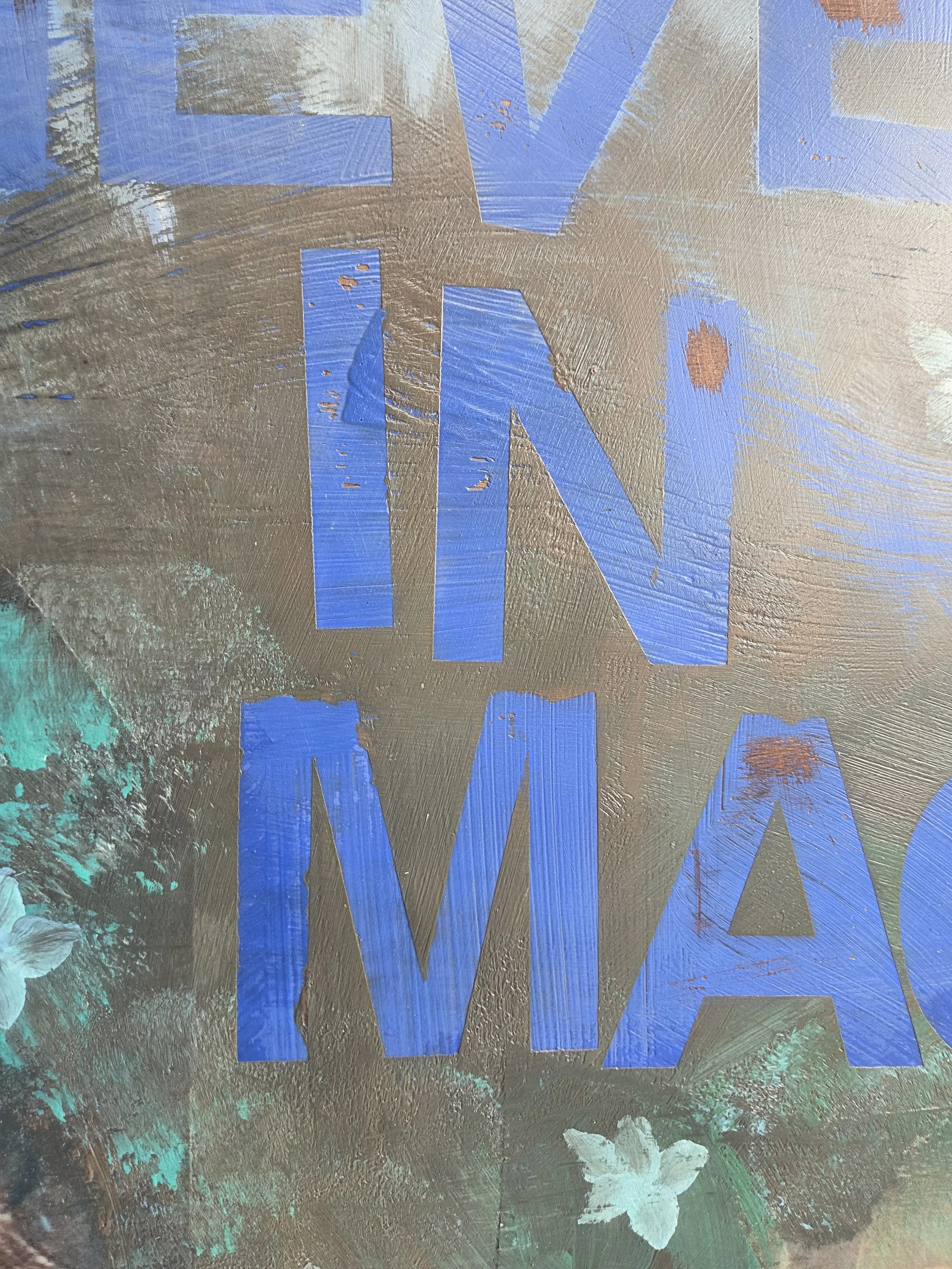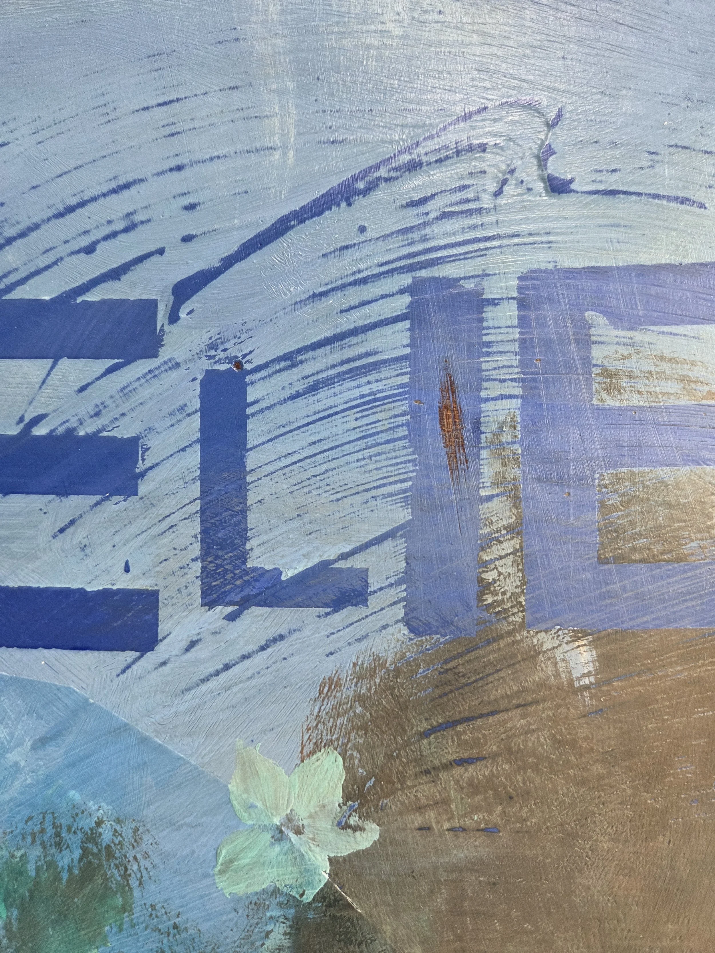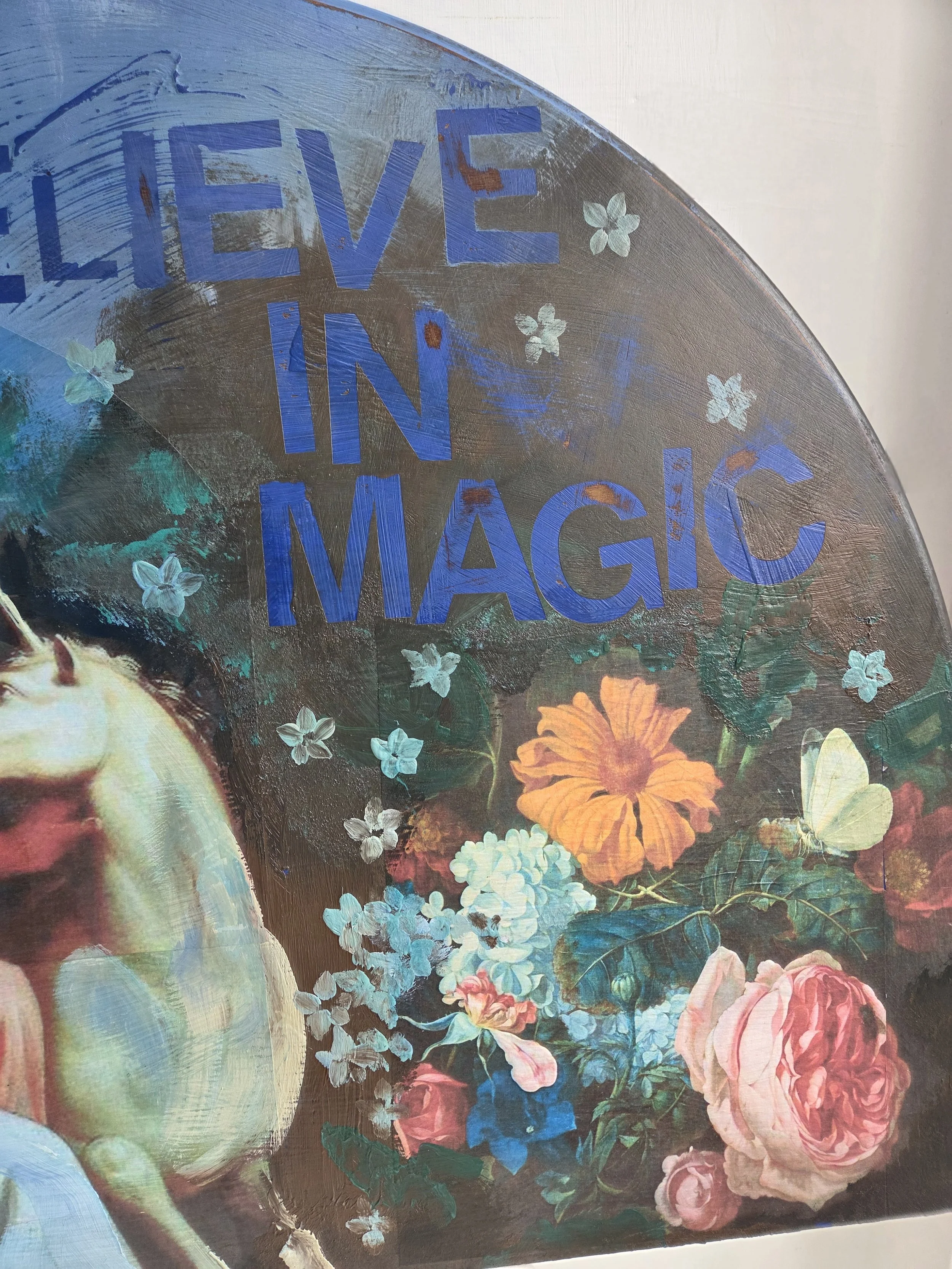 Painted in thick layers of paint. The image combines antique images and have been printed, by myself, in fade resistant ink. All applied, using the decoupage technique. I have then painted across the top in very thick, textured layers and then distressed this, in some areas back to wood. The text reads in the colour of the undercoat.