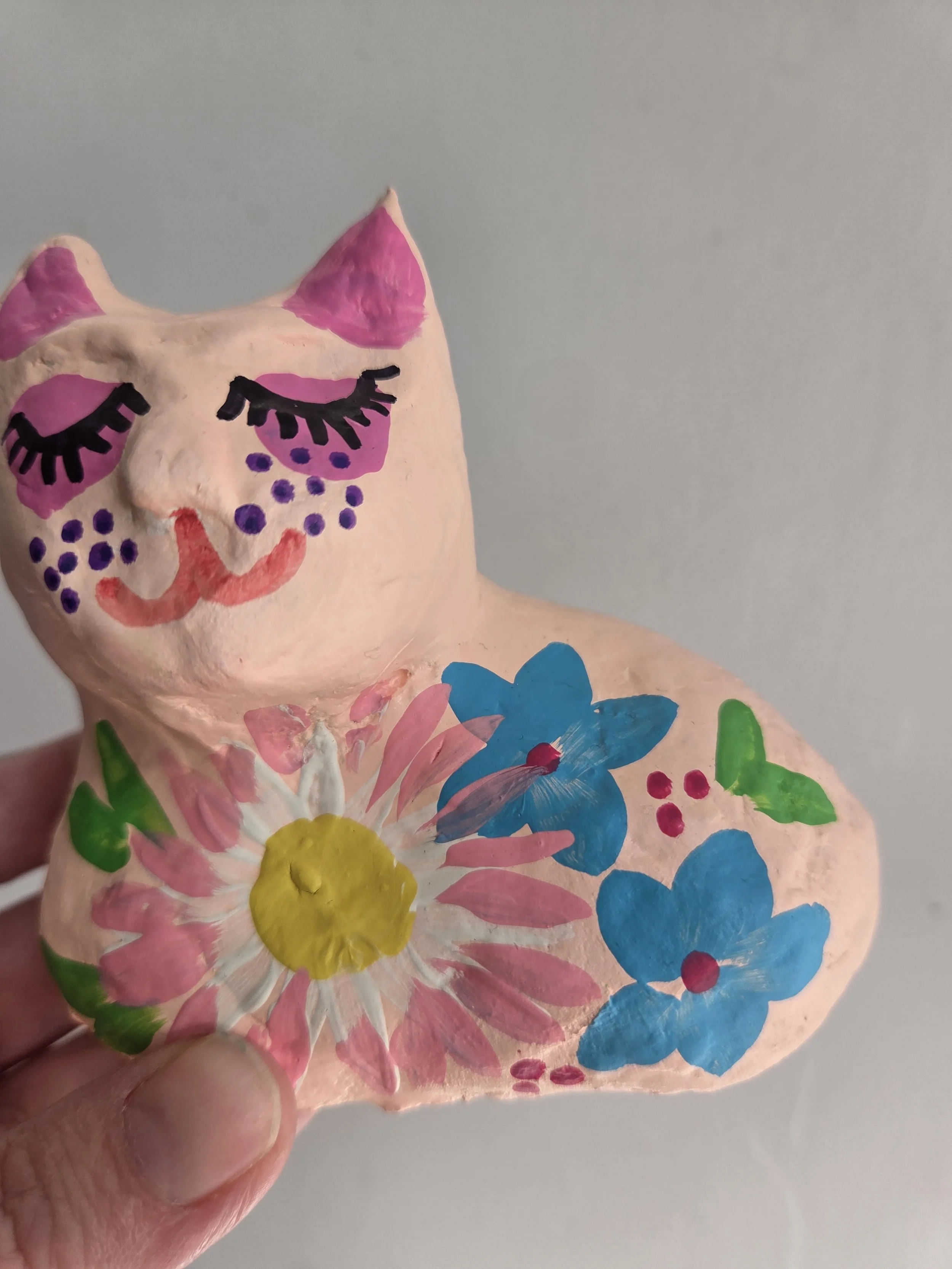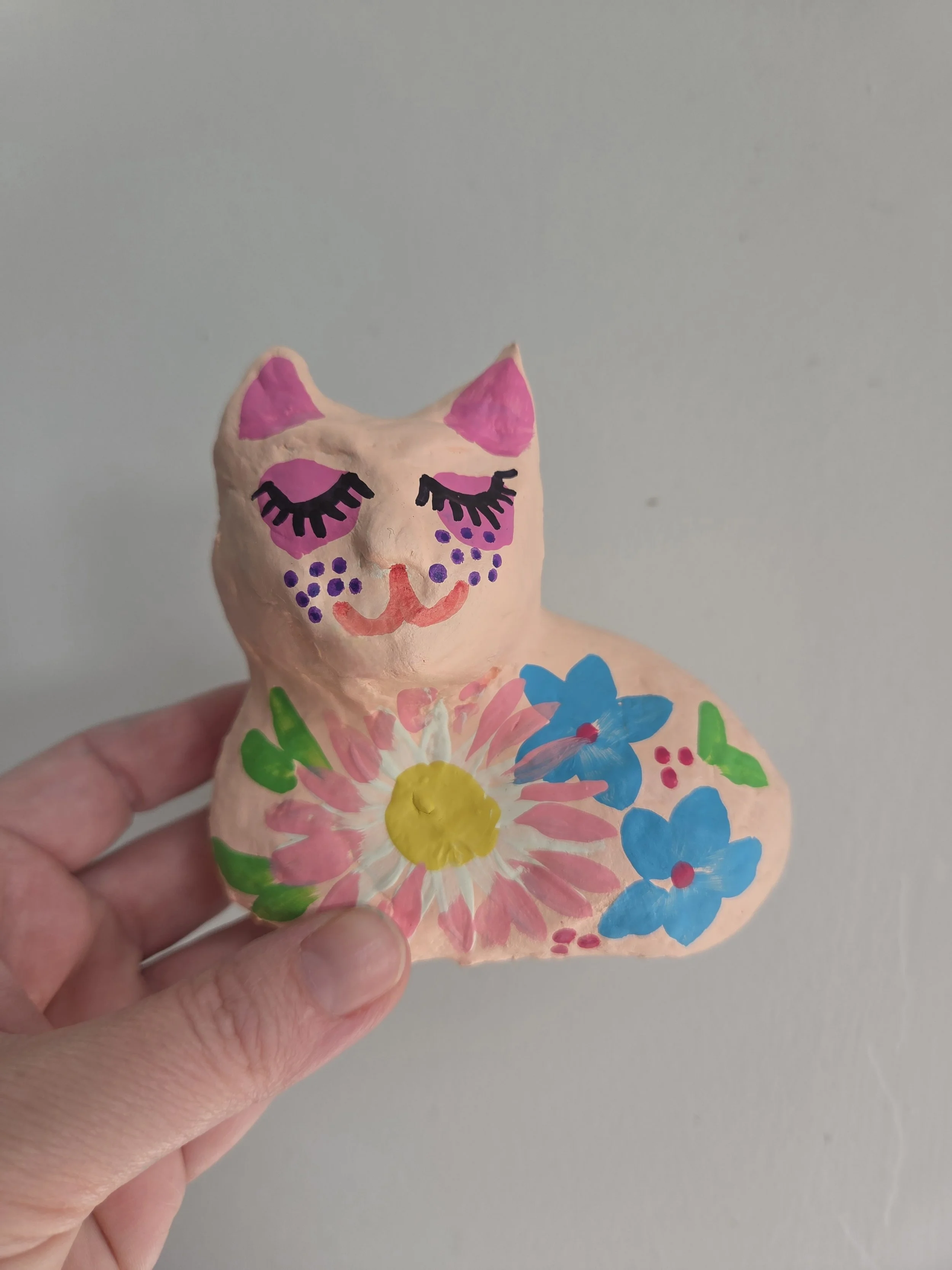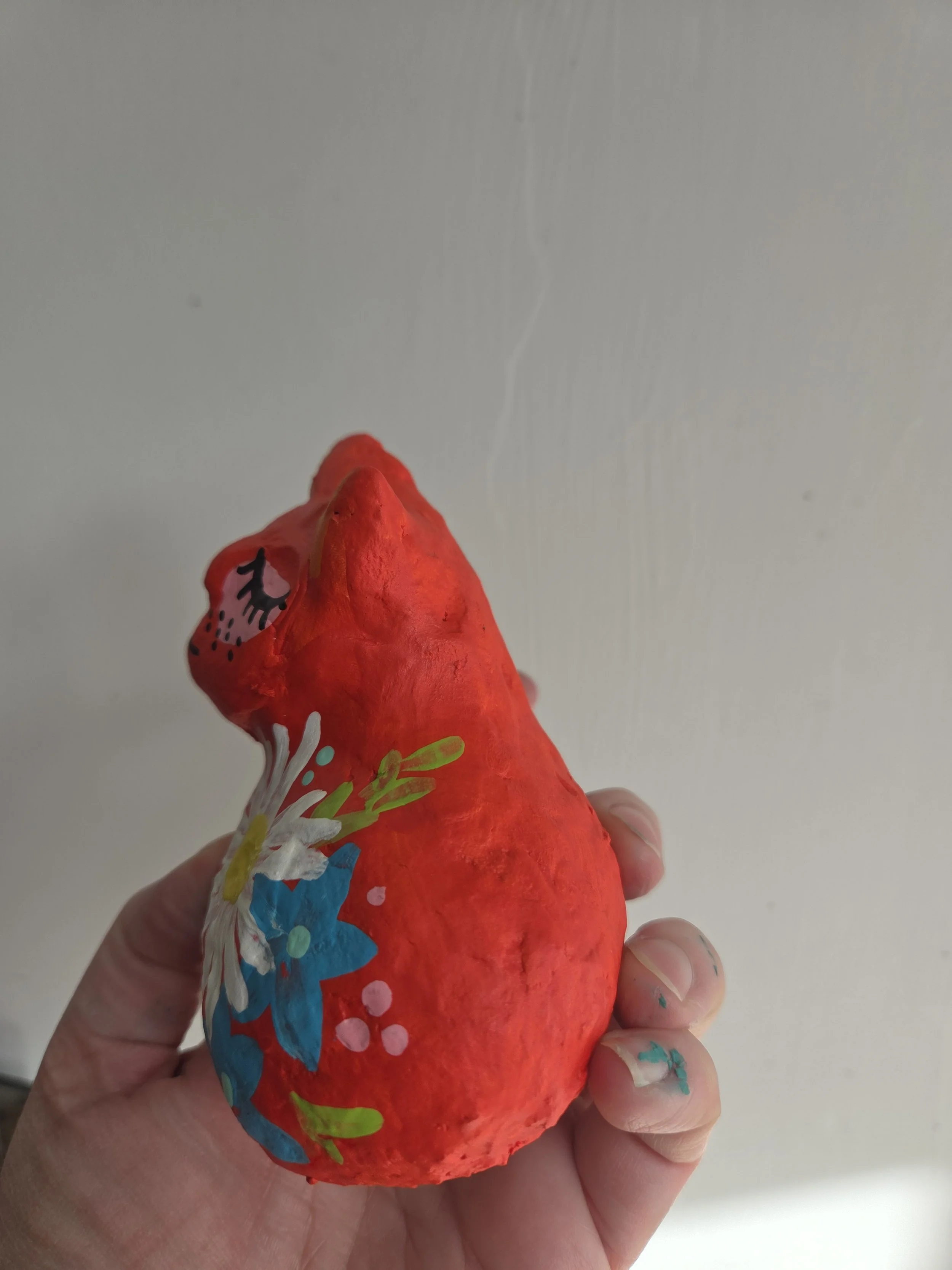 A little paper mache cat with a cardboard base.