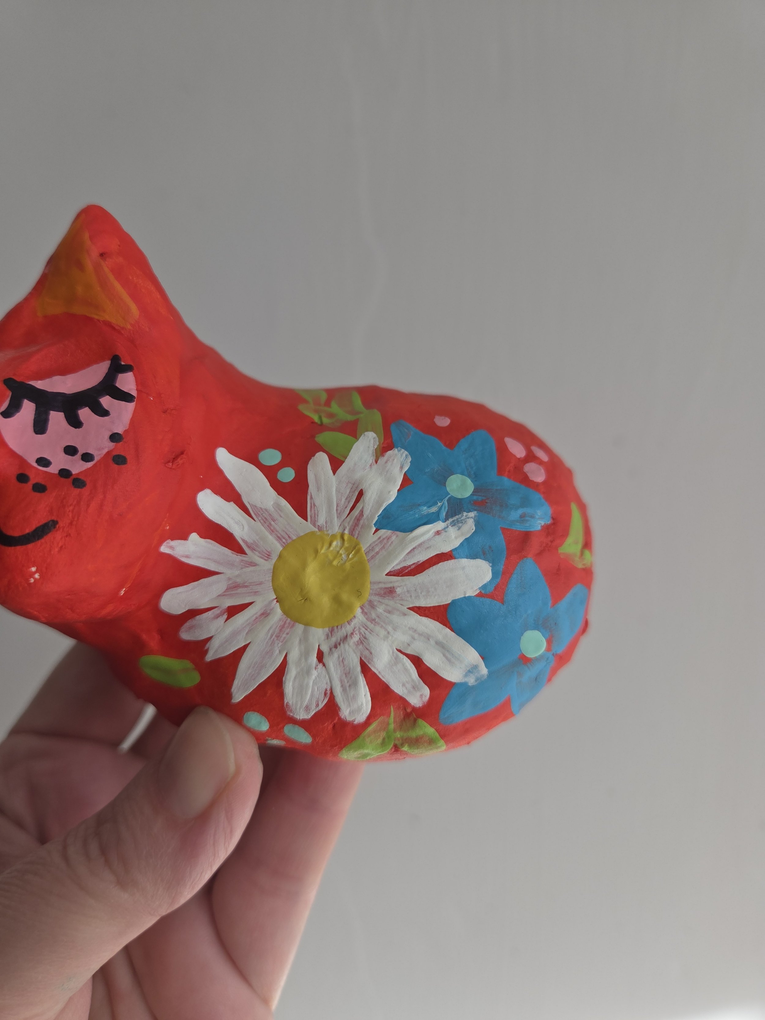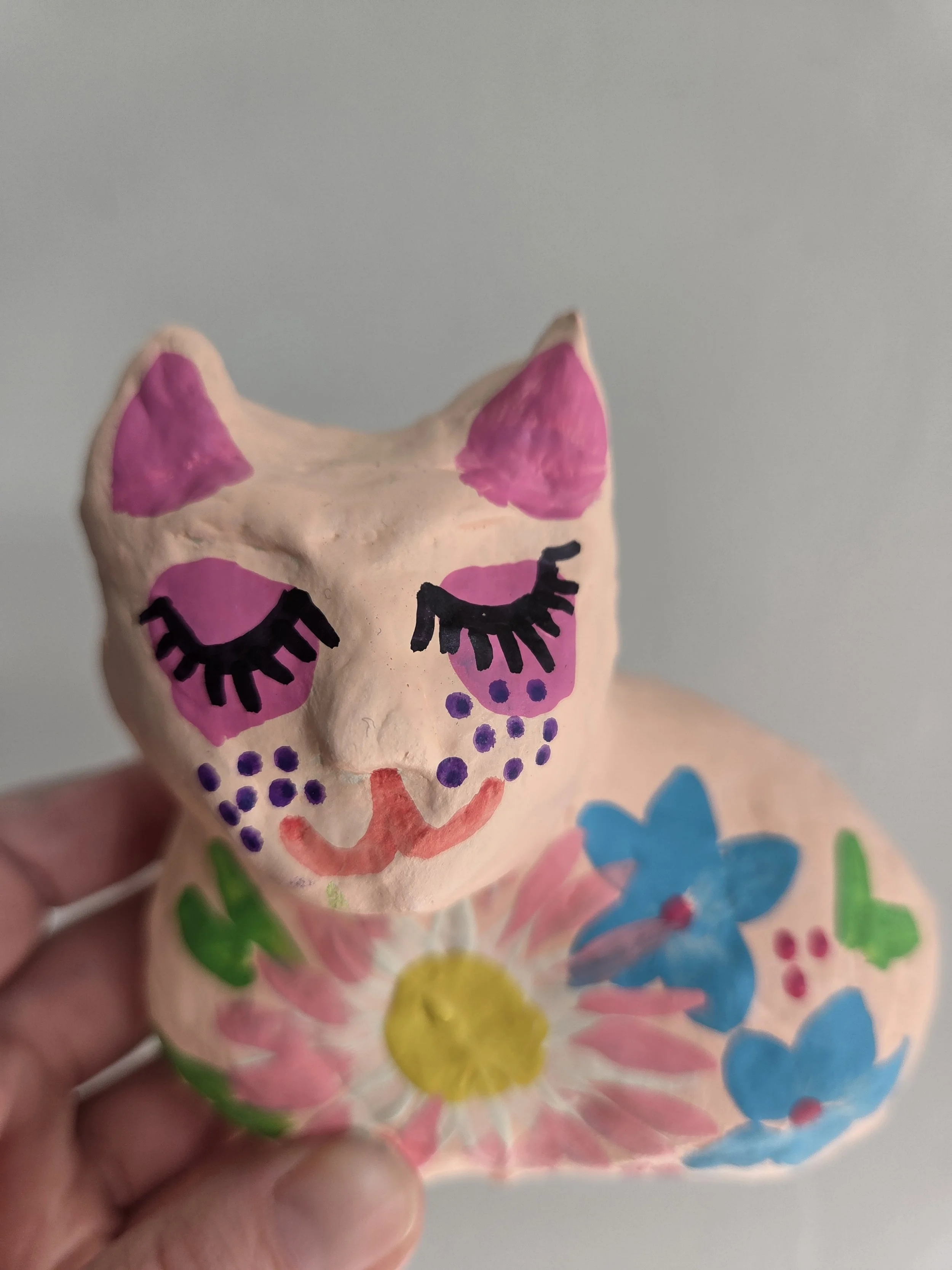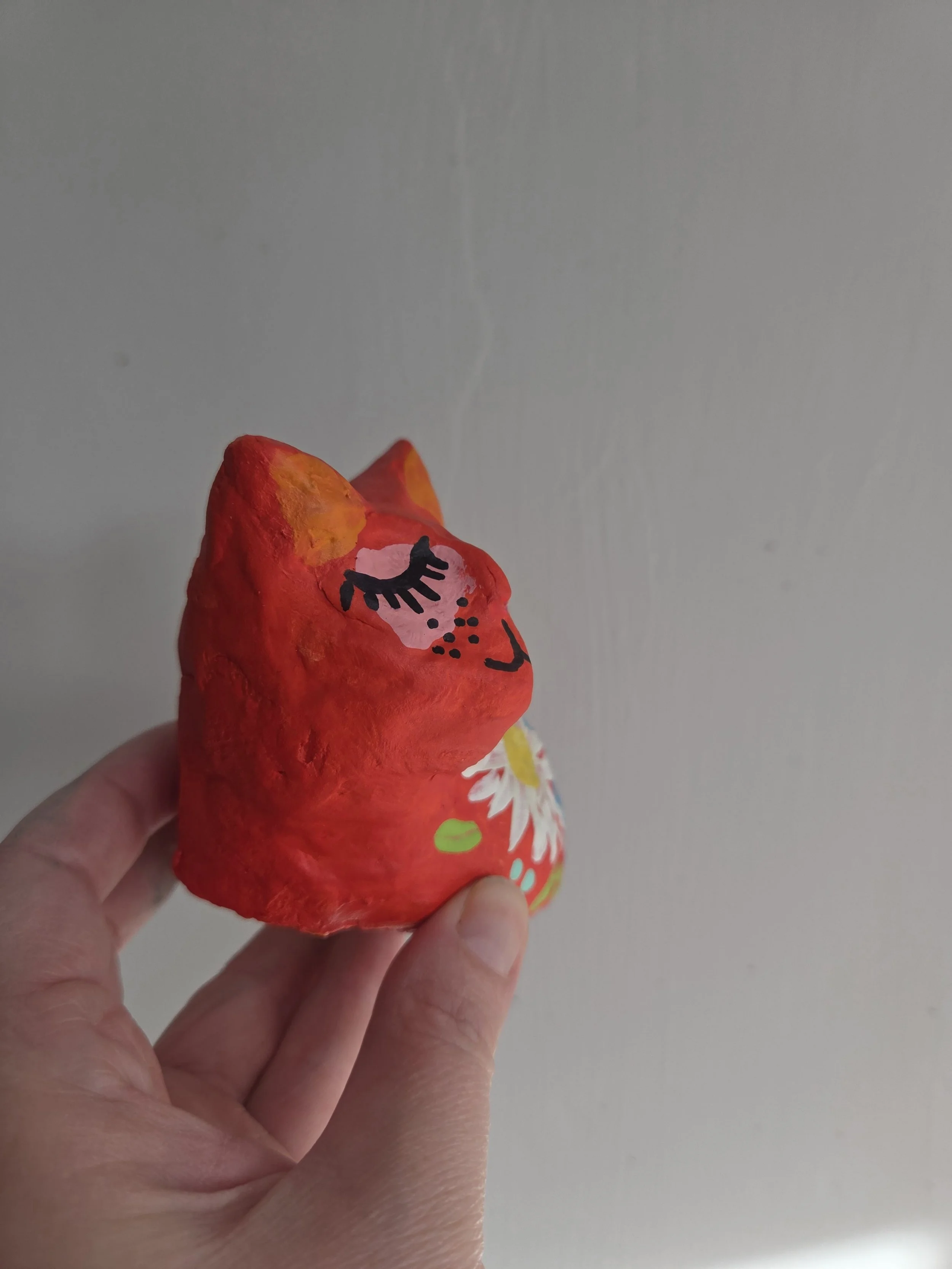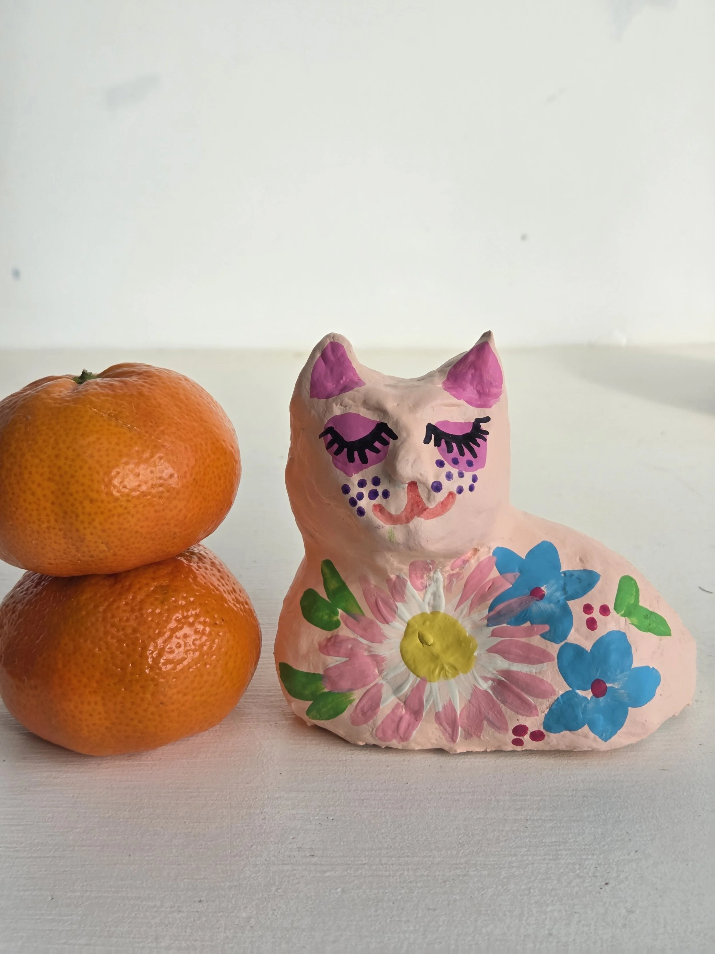 A little paper mache cat with a cardboard base.