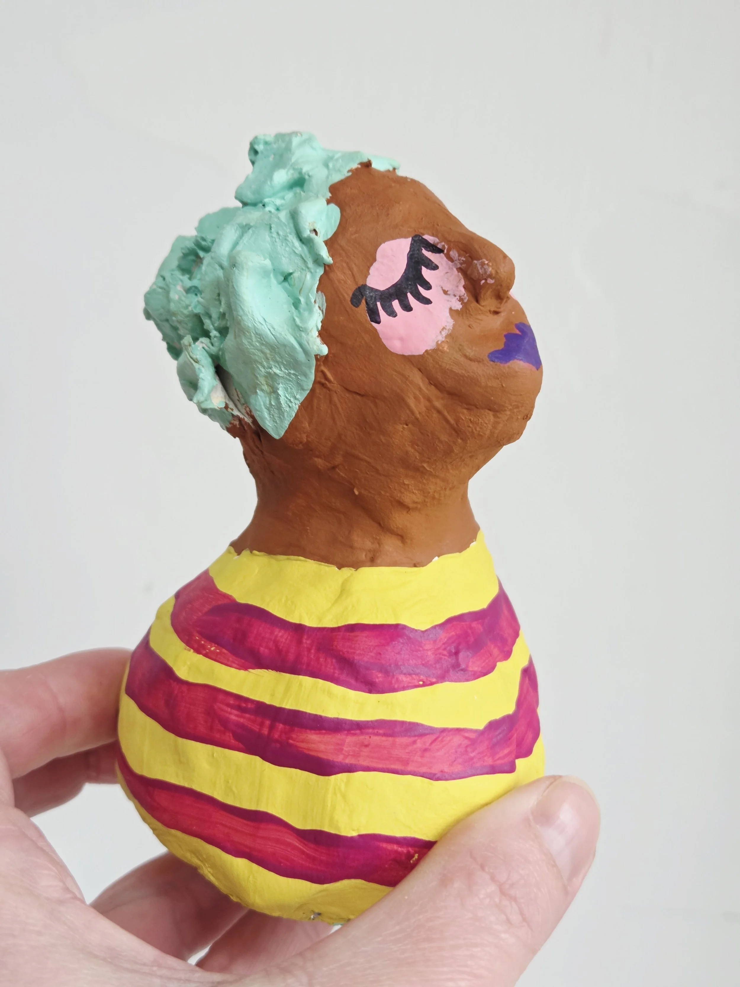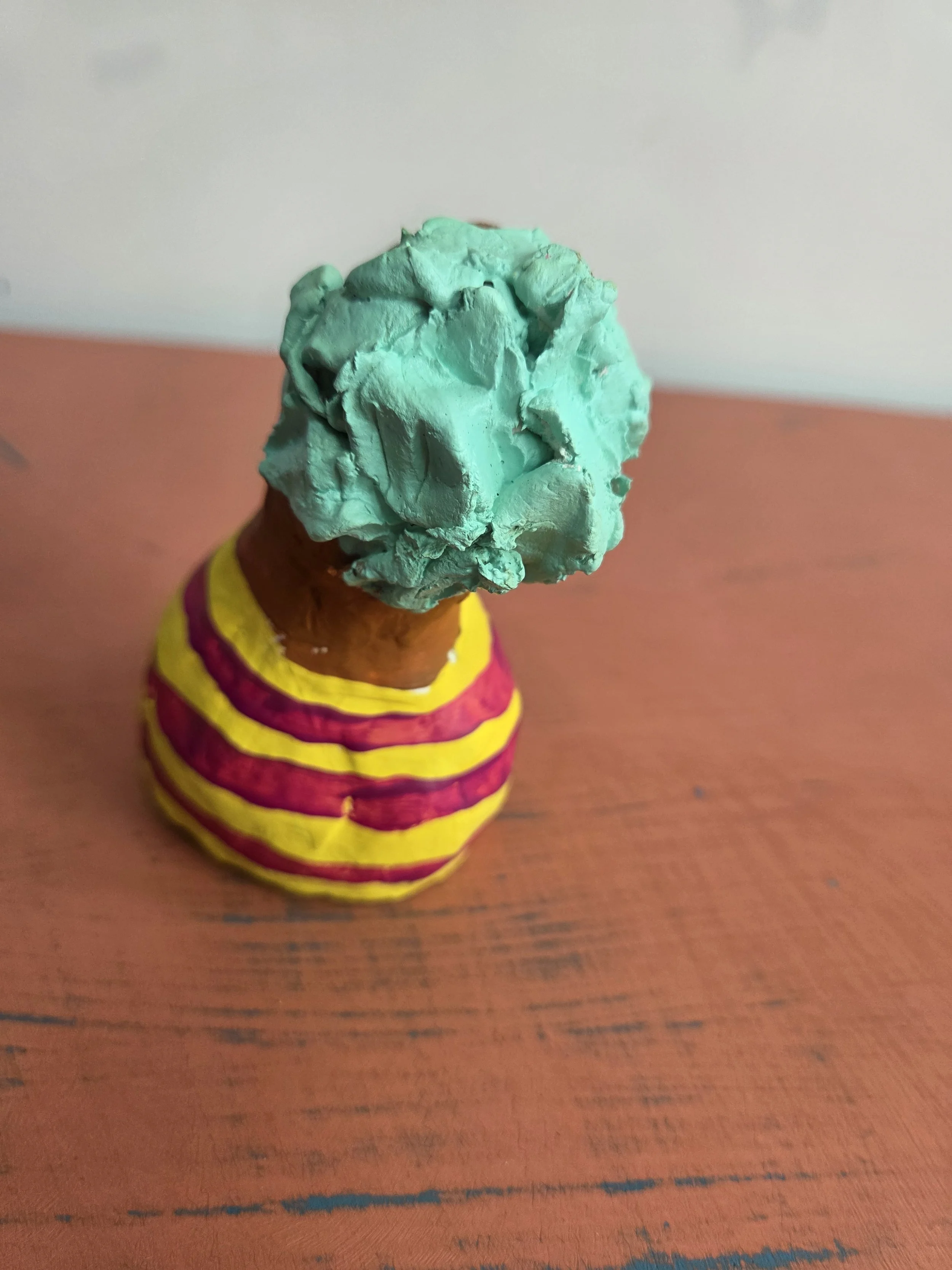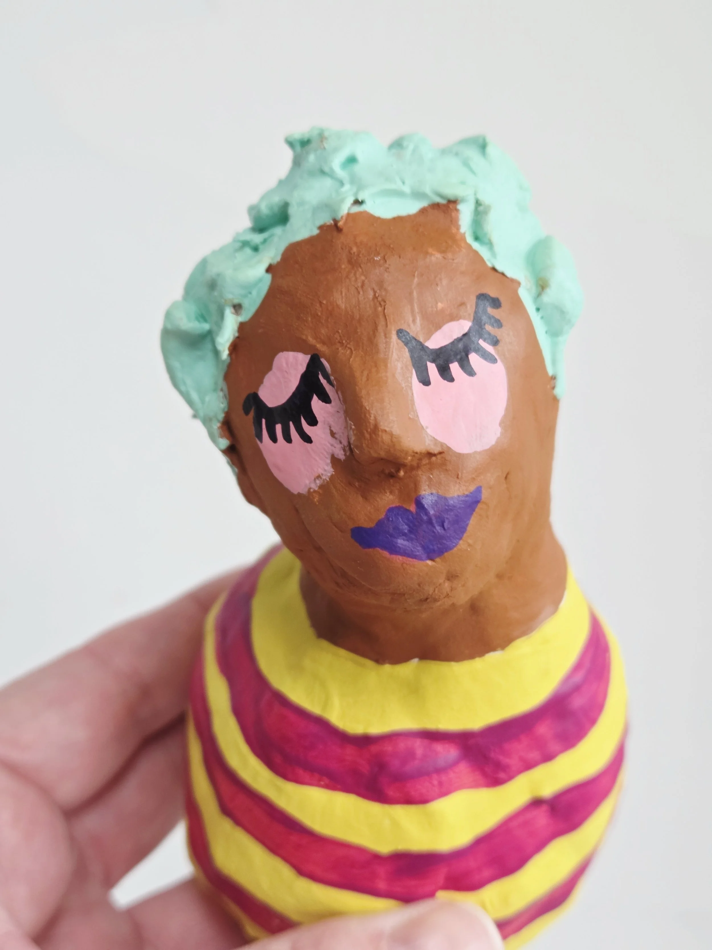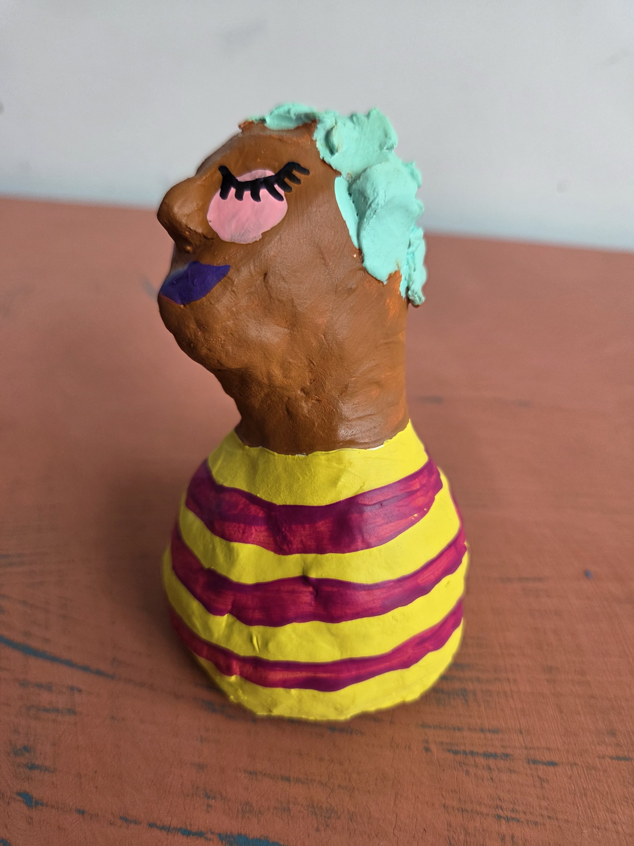 A lady made from papier mache, painted in bright colours and then lacquered with a ‘matt’ finish. Each lady has her name written on her cardboard base.
