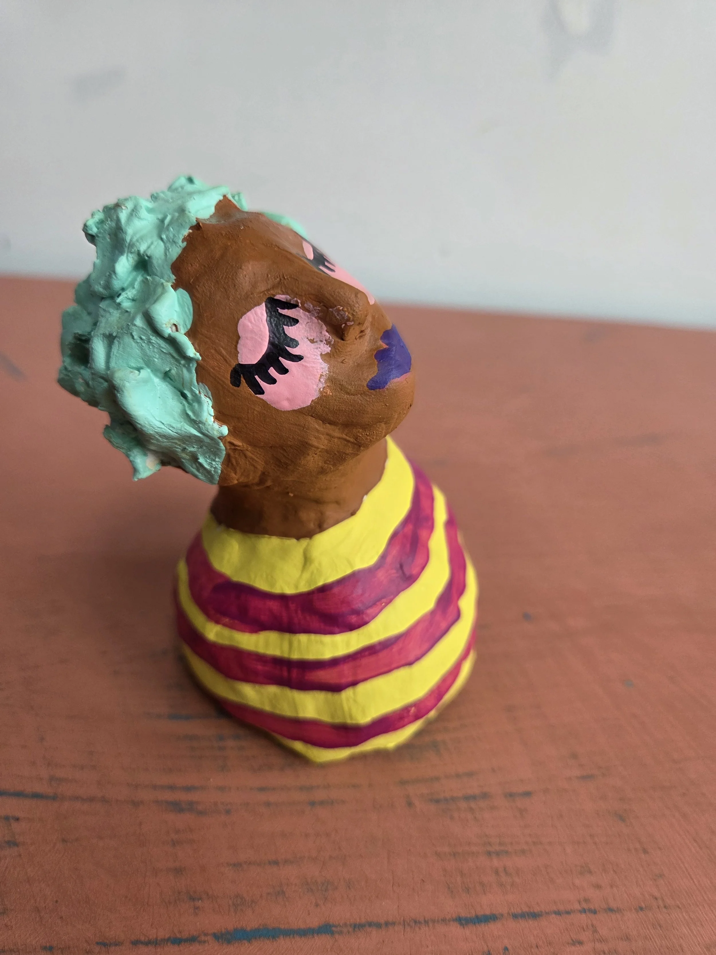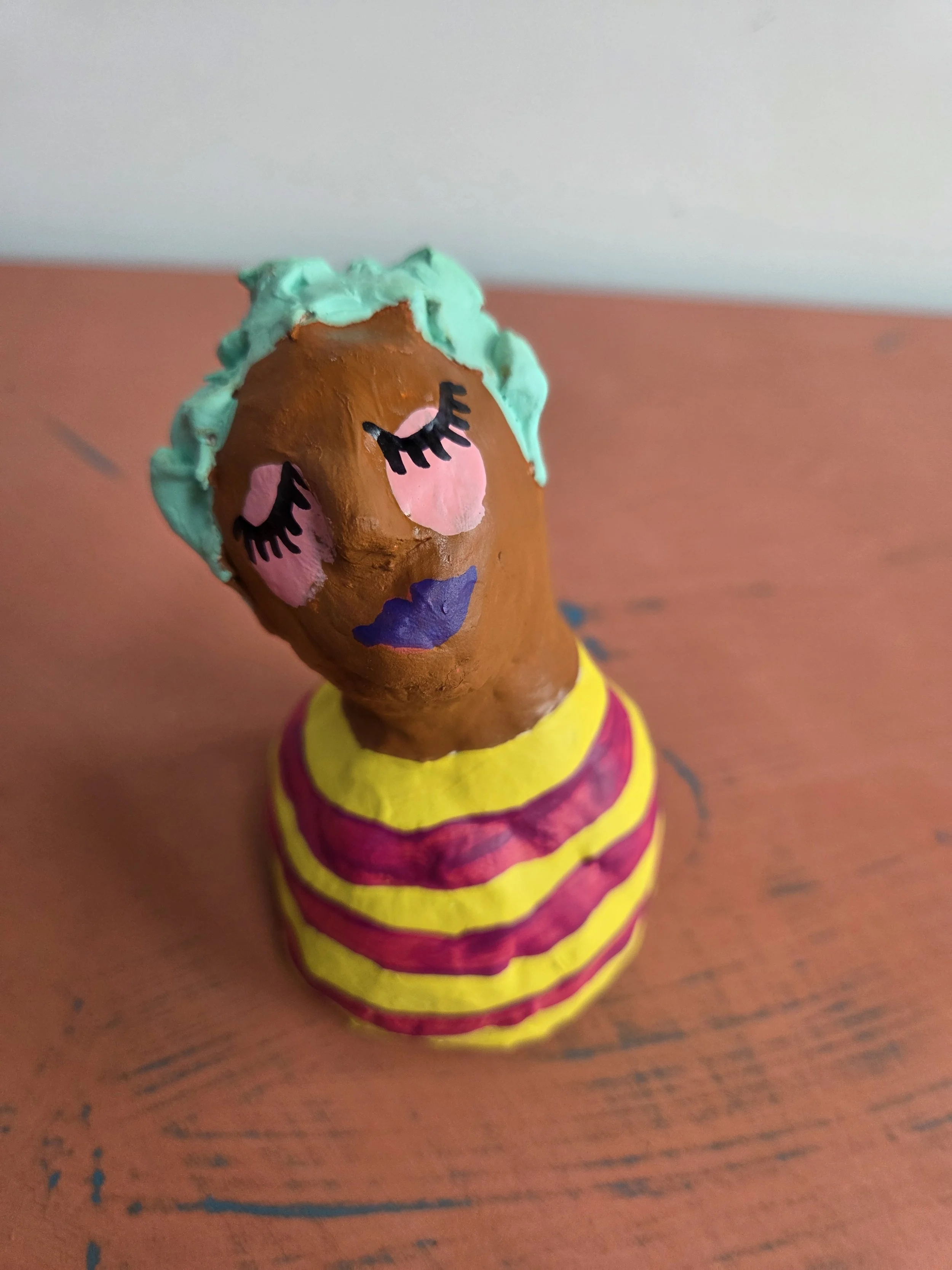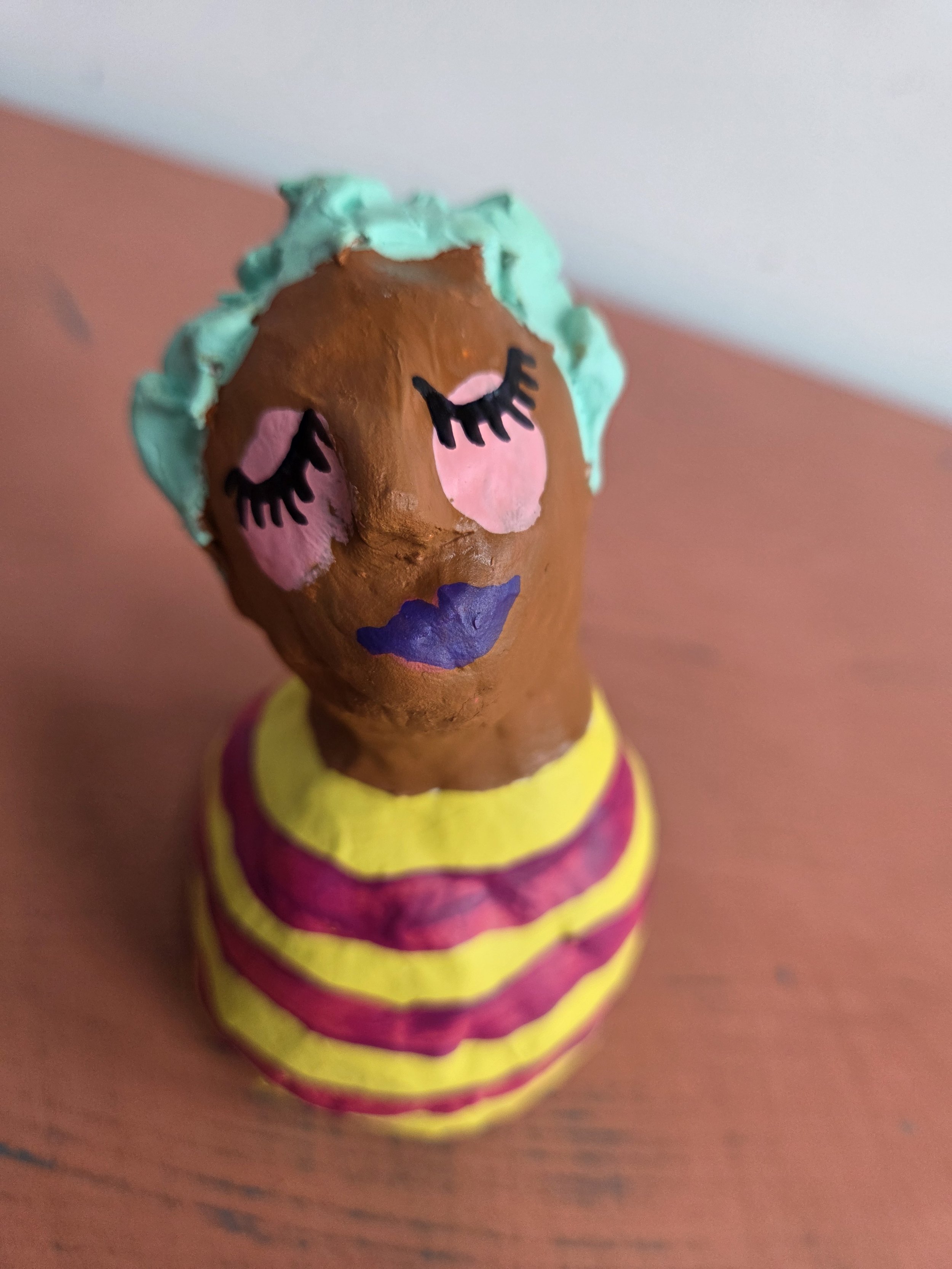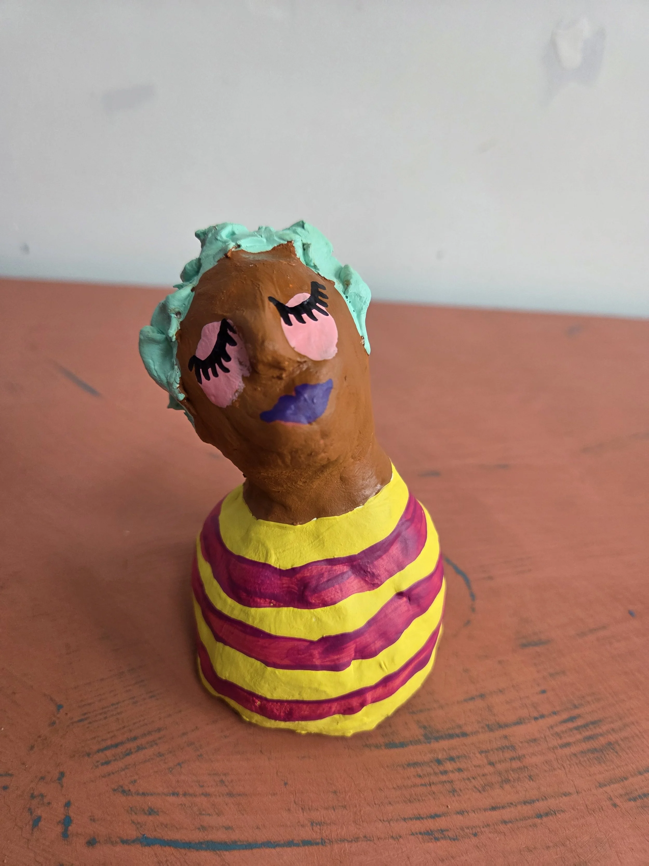 A lady made from papier mache, painted in bright colours and then lacquered with a ‘matt’ finish. Each lady has her name written on her cardboard base.