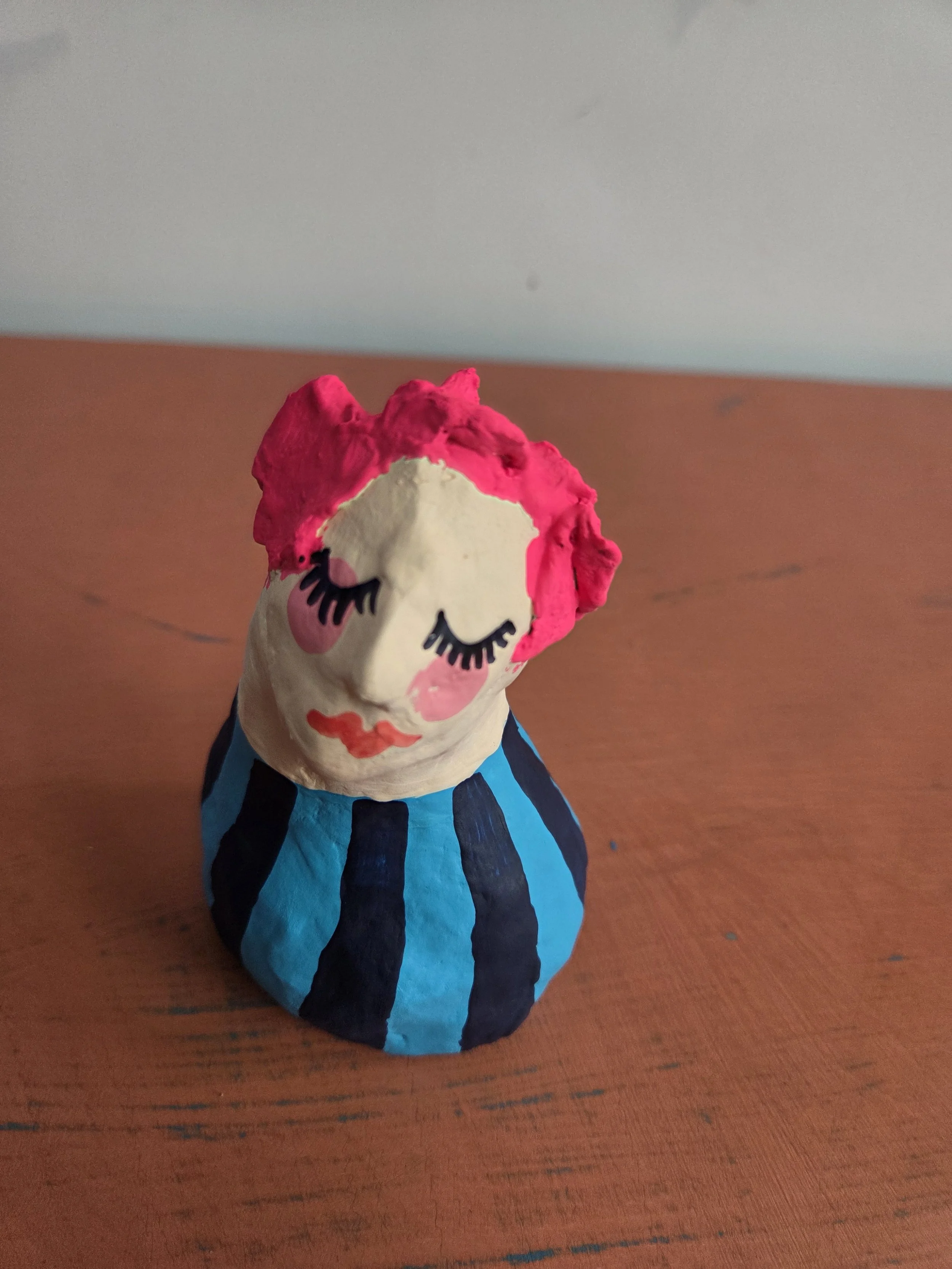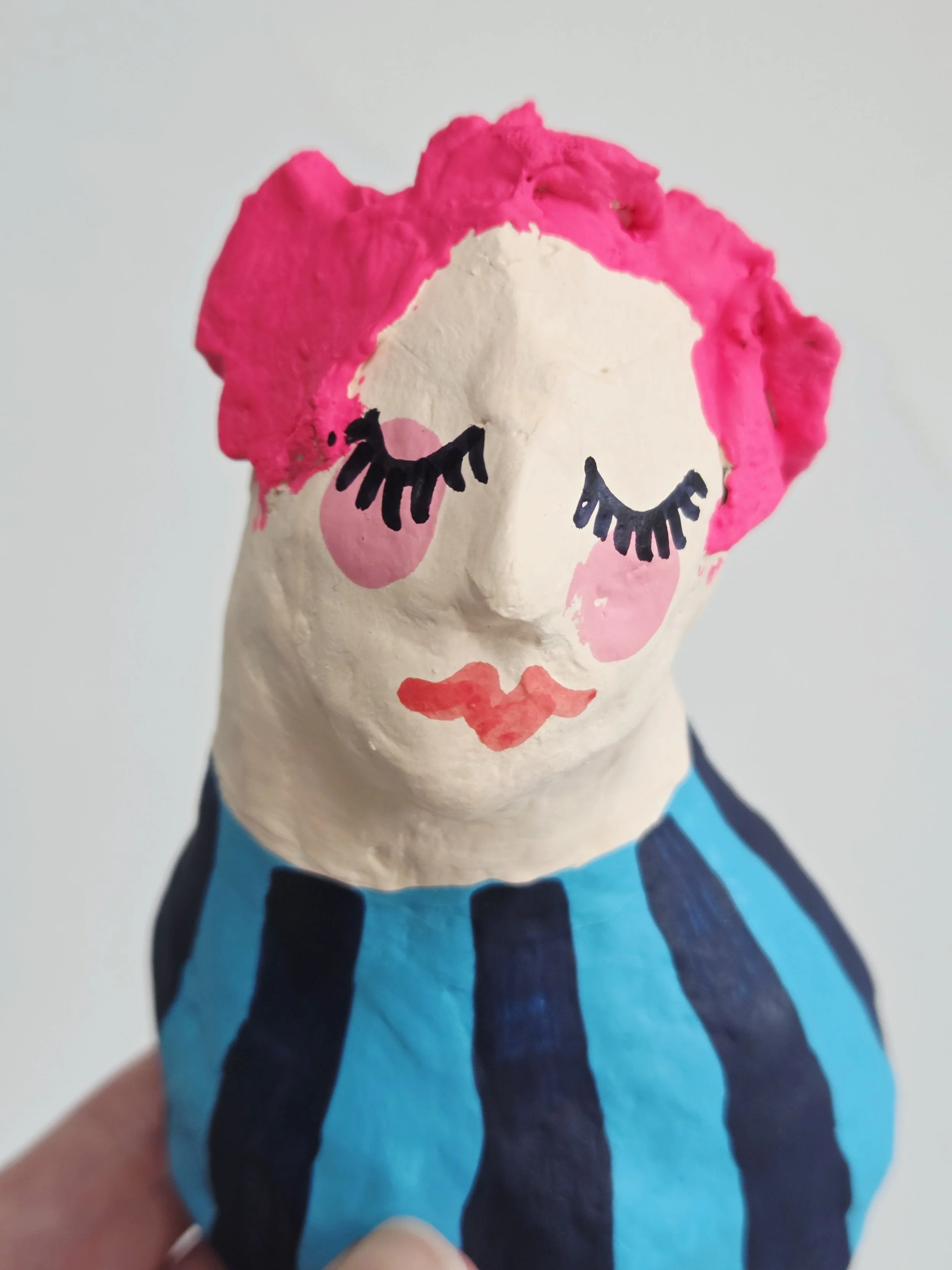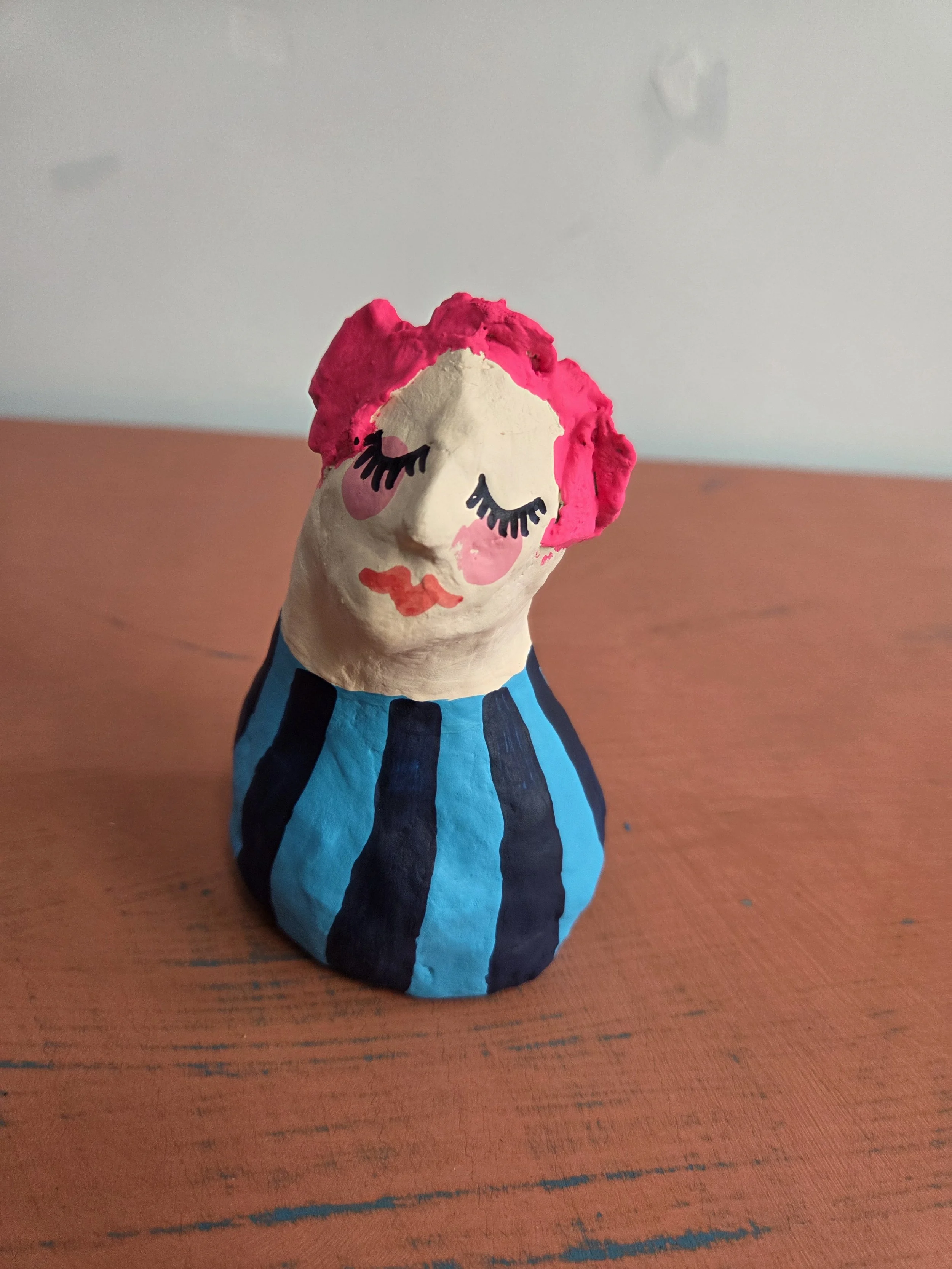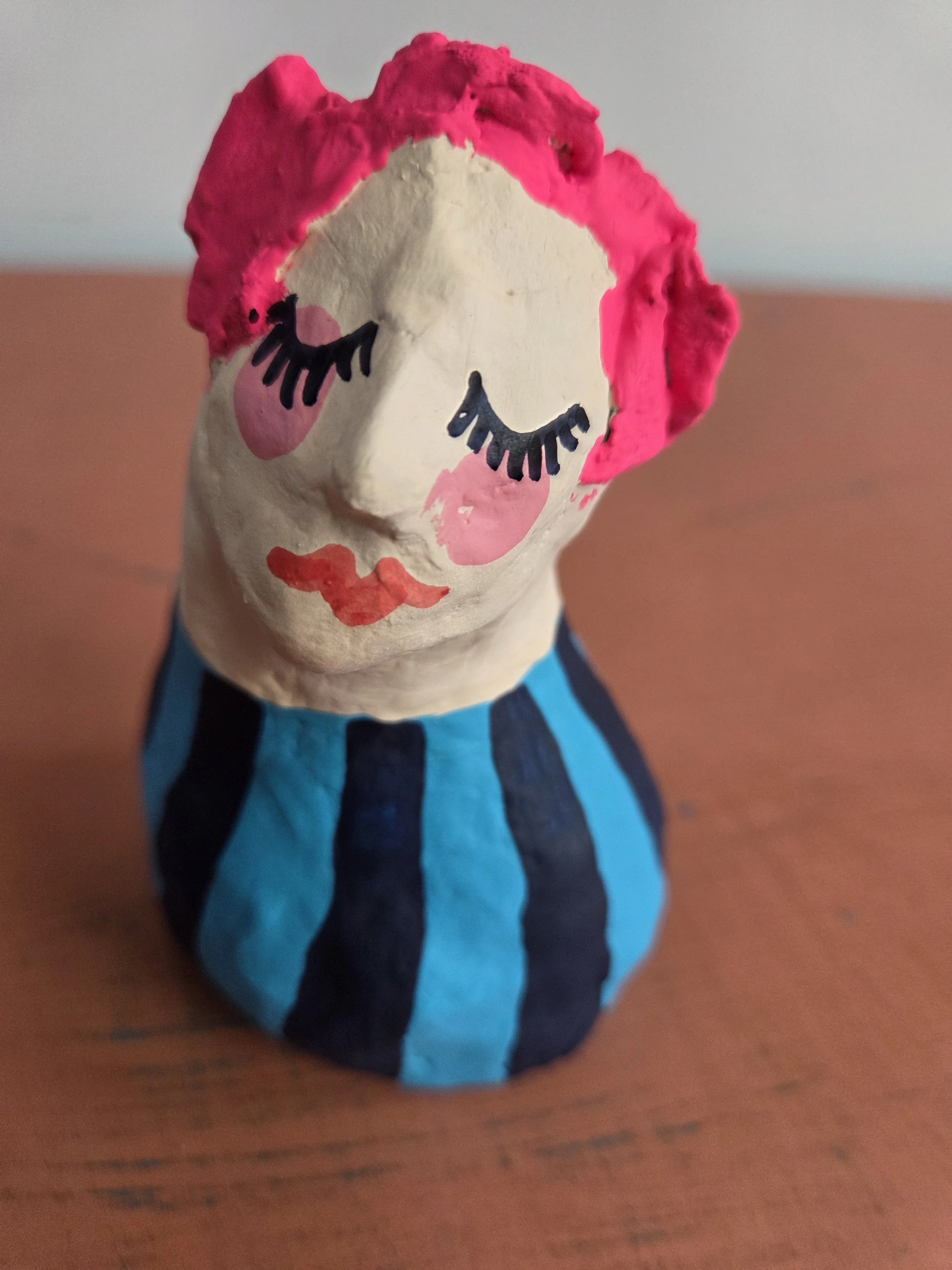 A lady made from papier mache, painted in bright colours and then lacquered with a ‘matt’ finish. Each lady has her name written on her cardboard base.