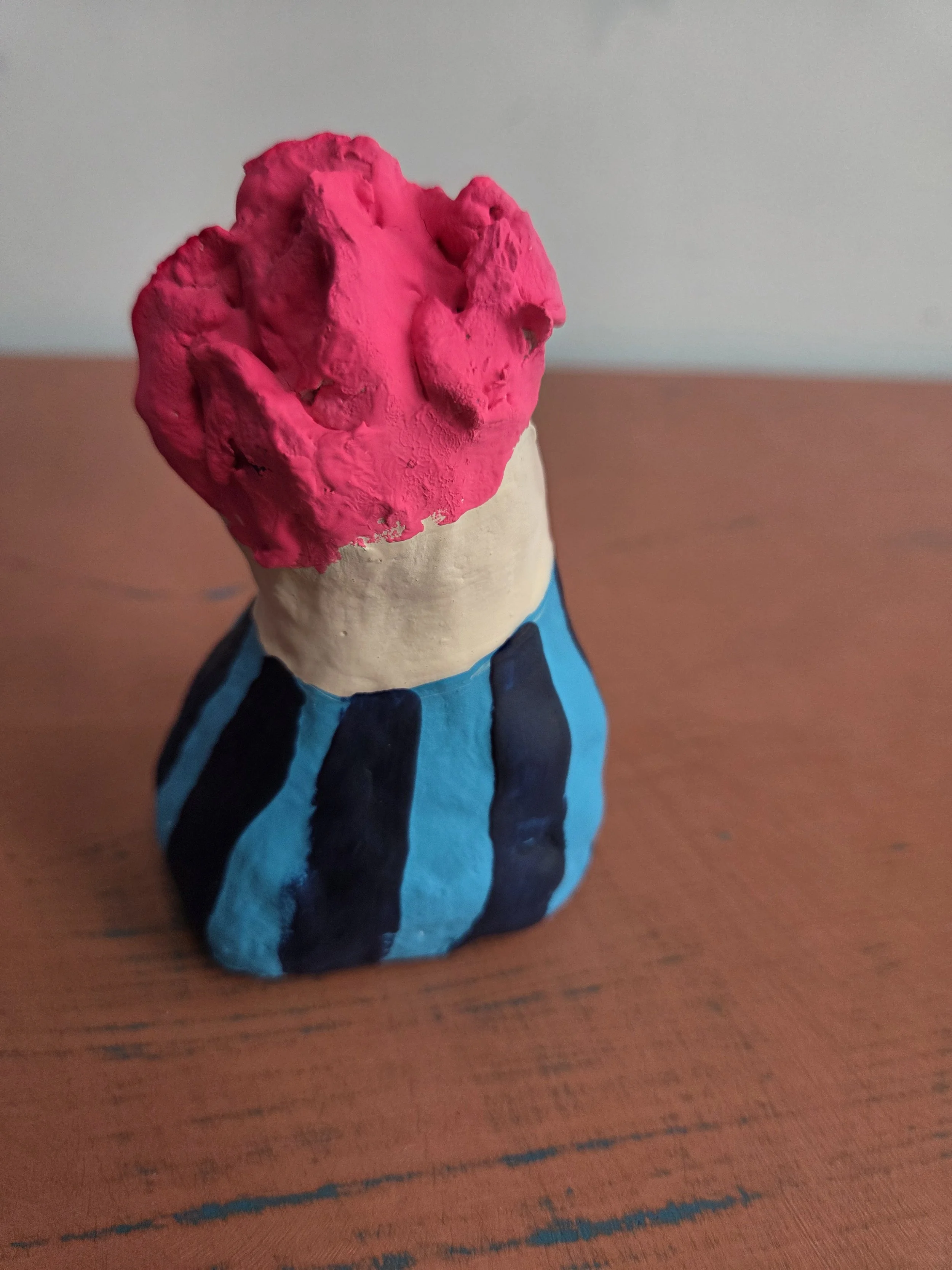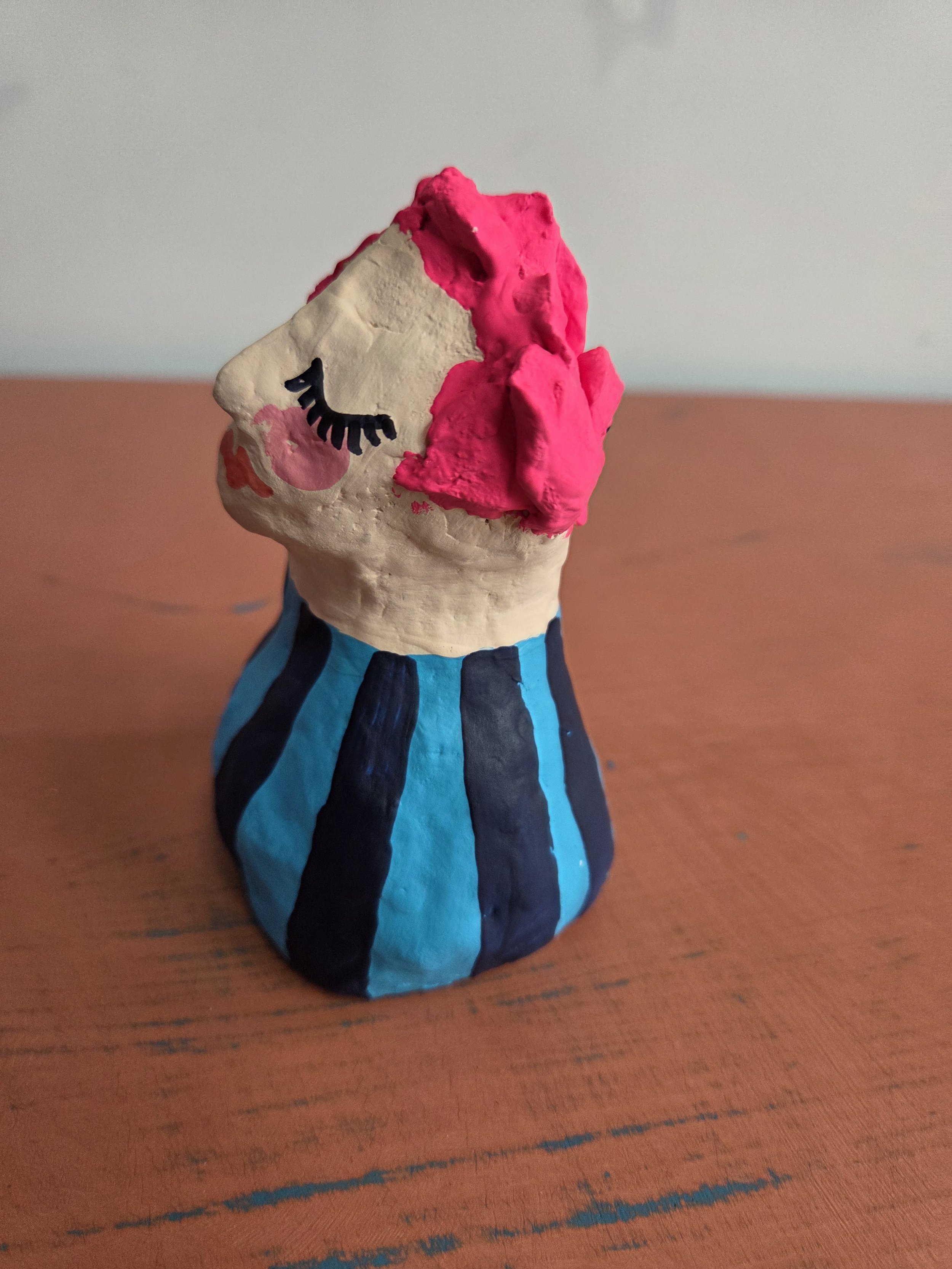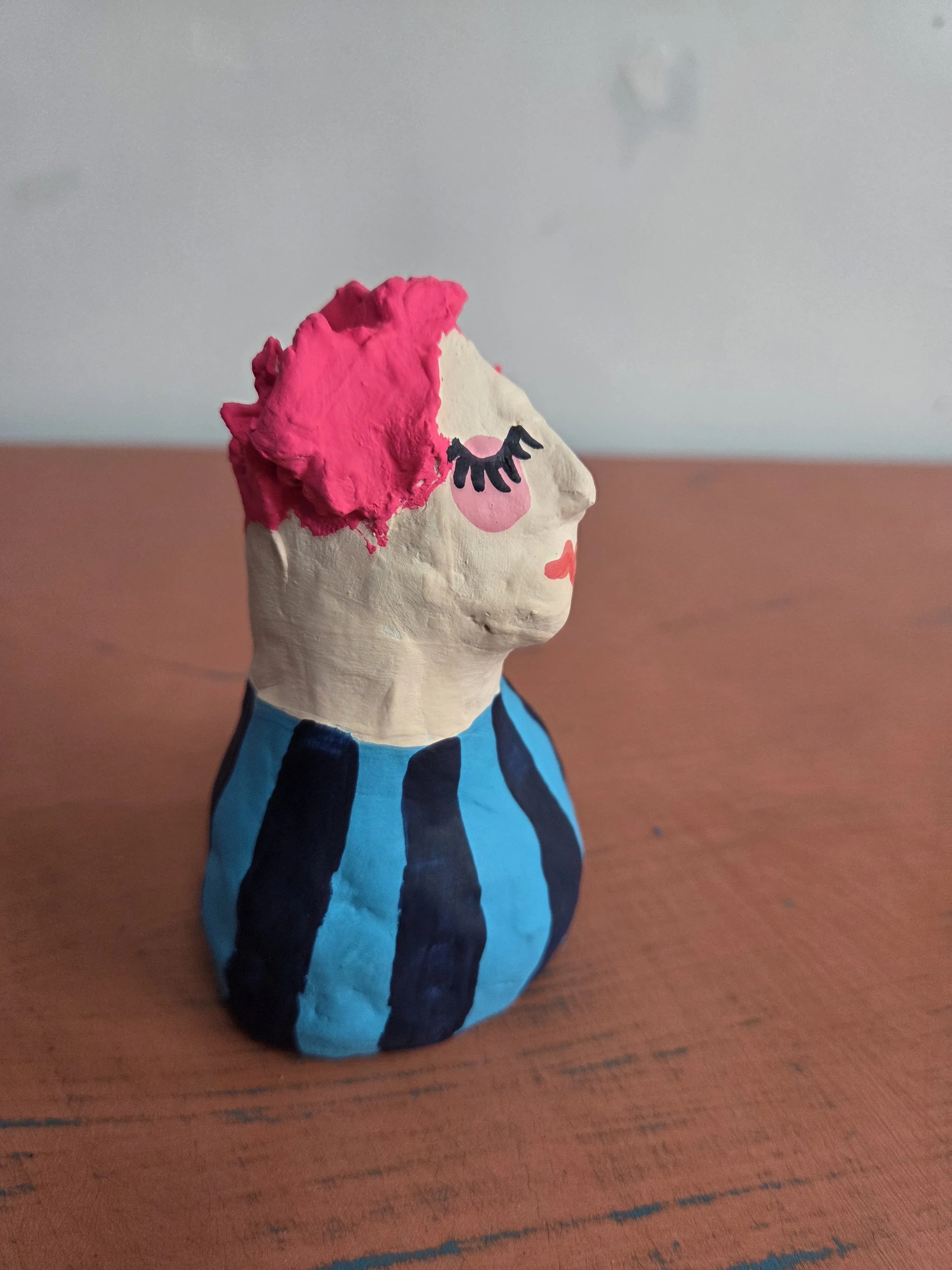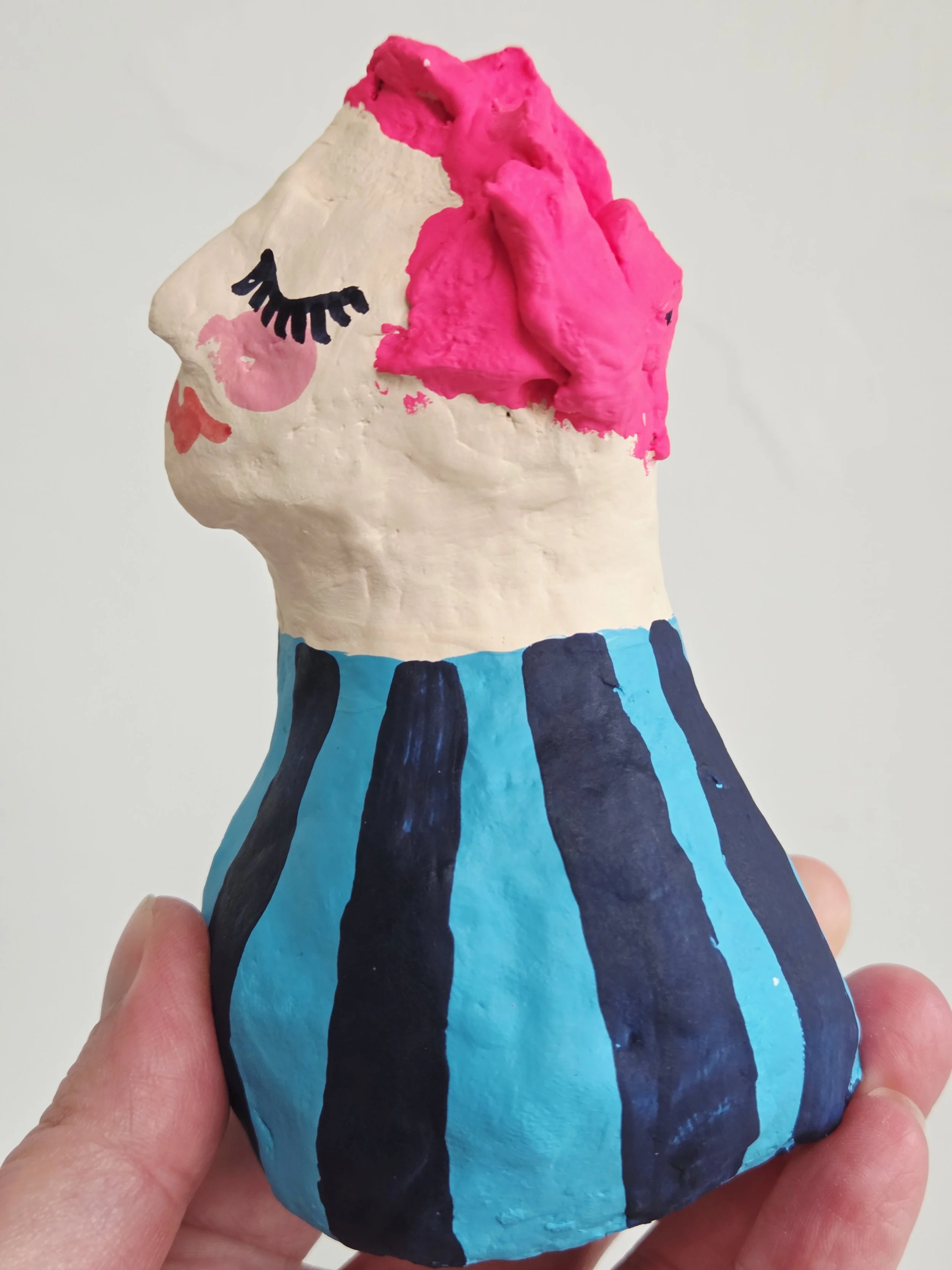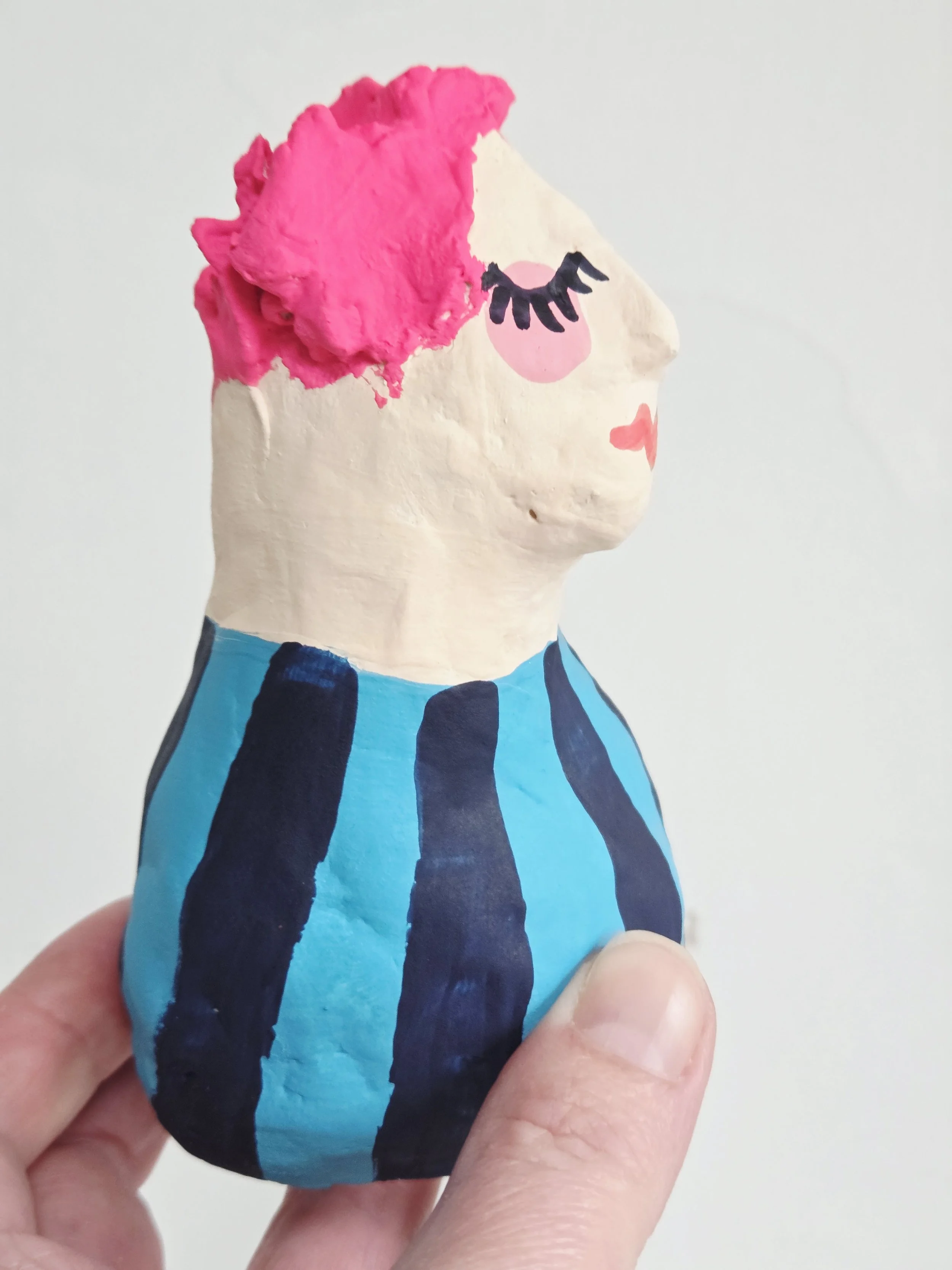 A lady made from papier mache, painted in bright colours and then lacquered with a ‘matt’ finish. Each lady has her name written on her cardboard base.