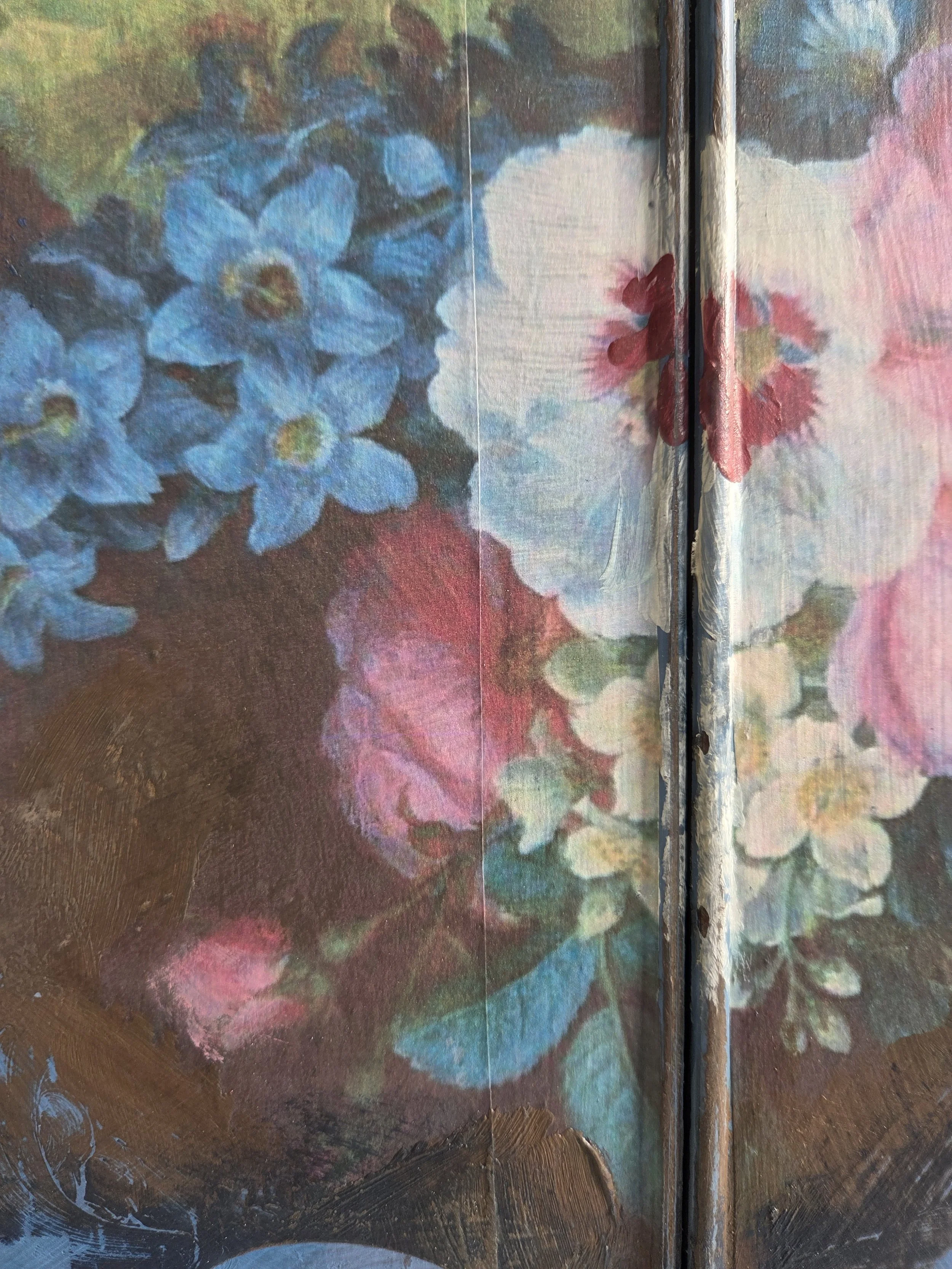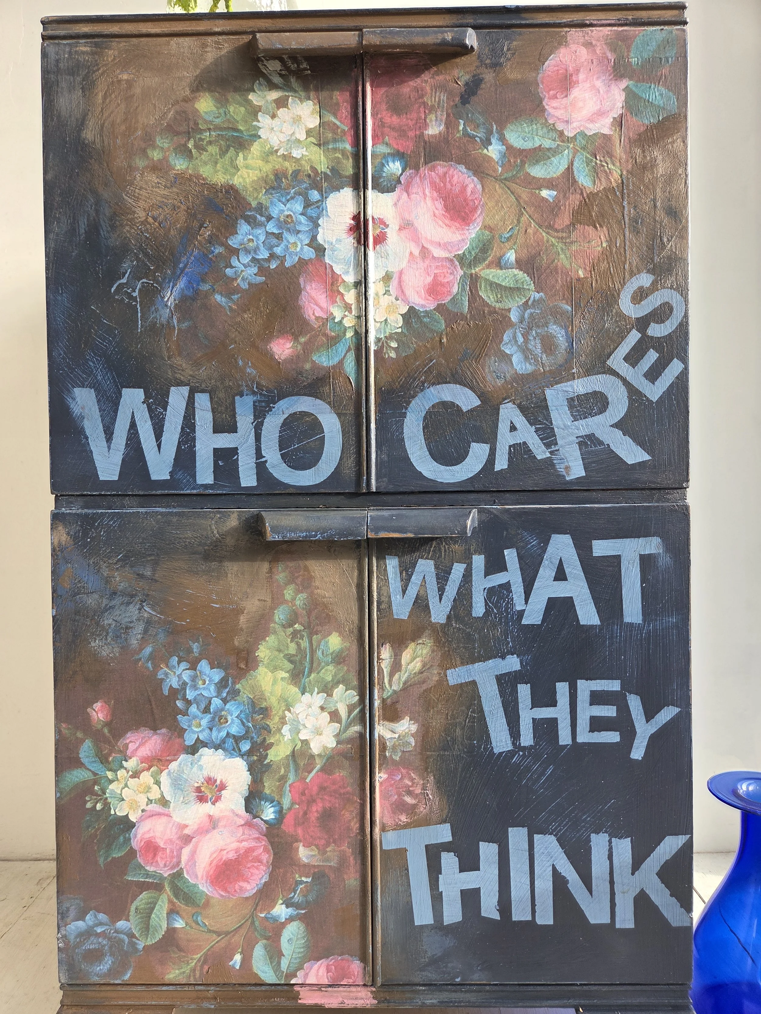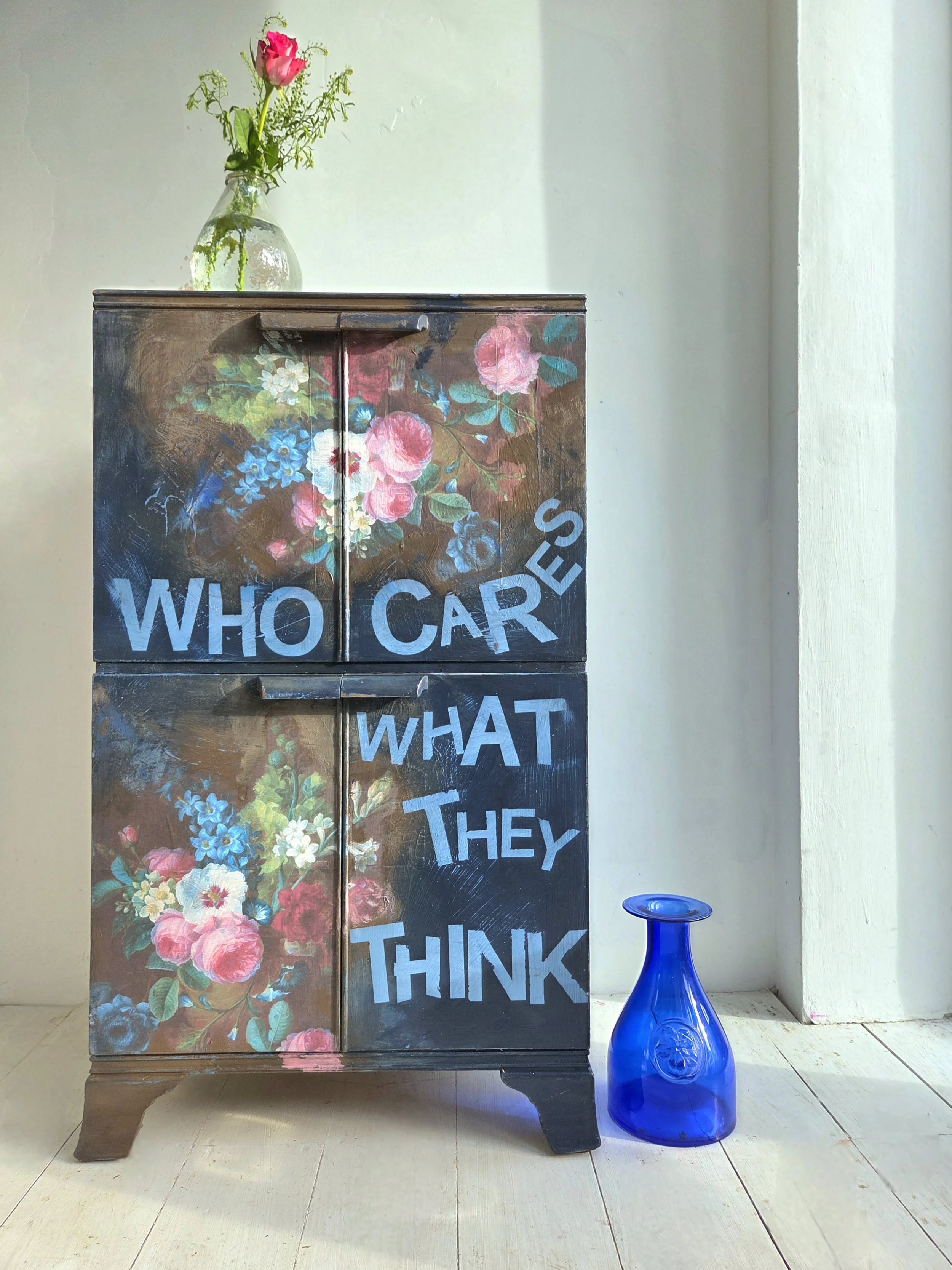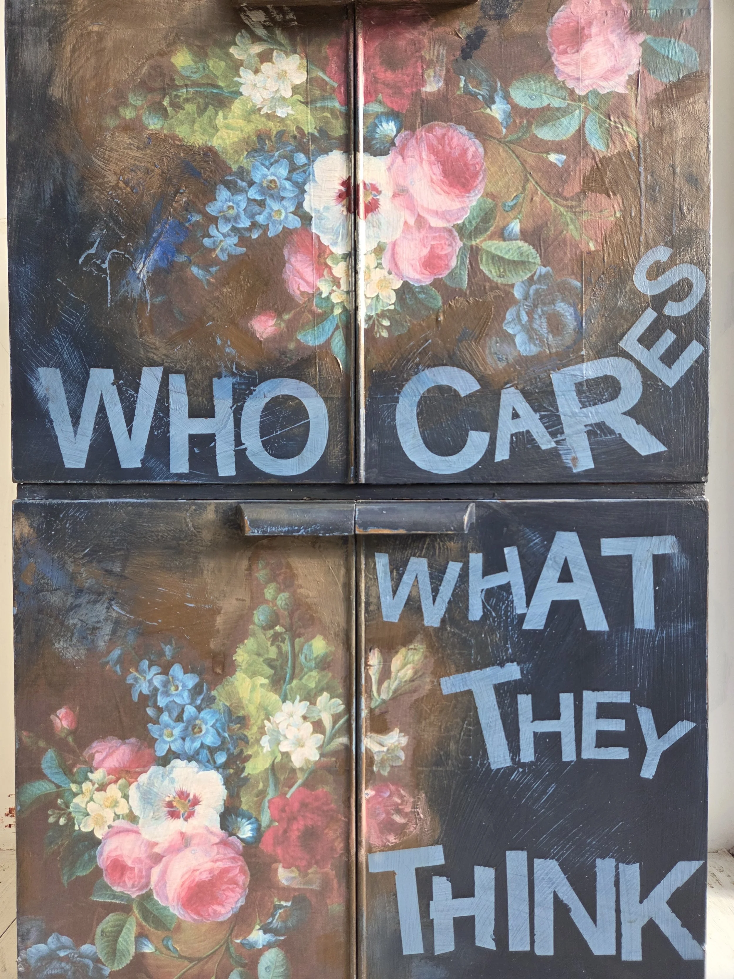 The decoupage consists of an antique still life. The decoupage has been made by myself and has been printed in fade-resistant ink designed to last up to 100 years before any fading occurs. Then painted over the top to blend all of the components together. The text reads, in the blue of the undercoat ‘who cares what they think’.