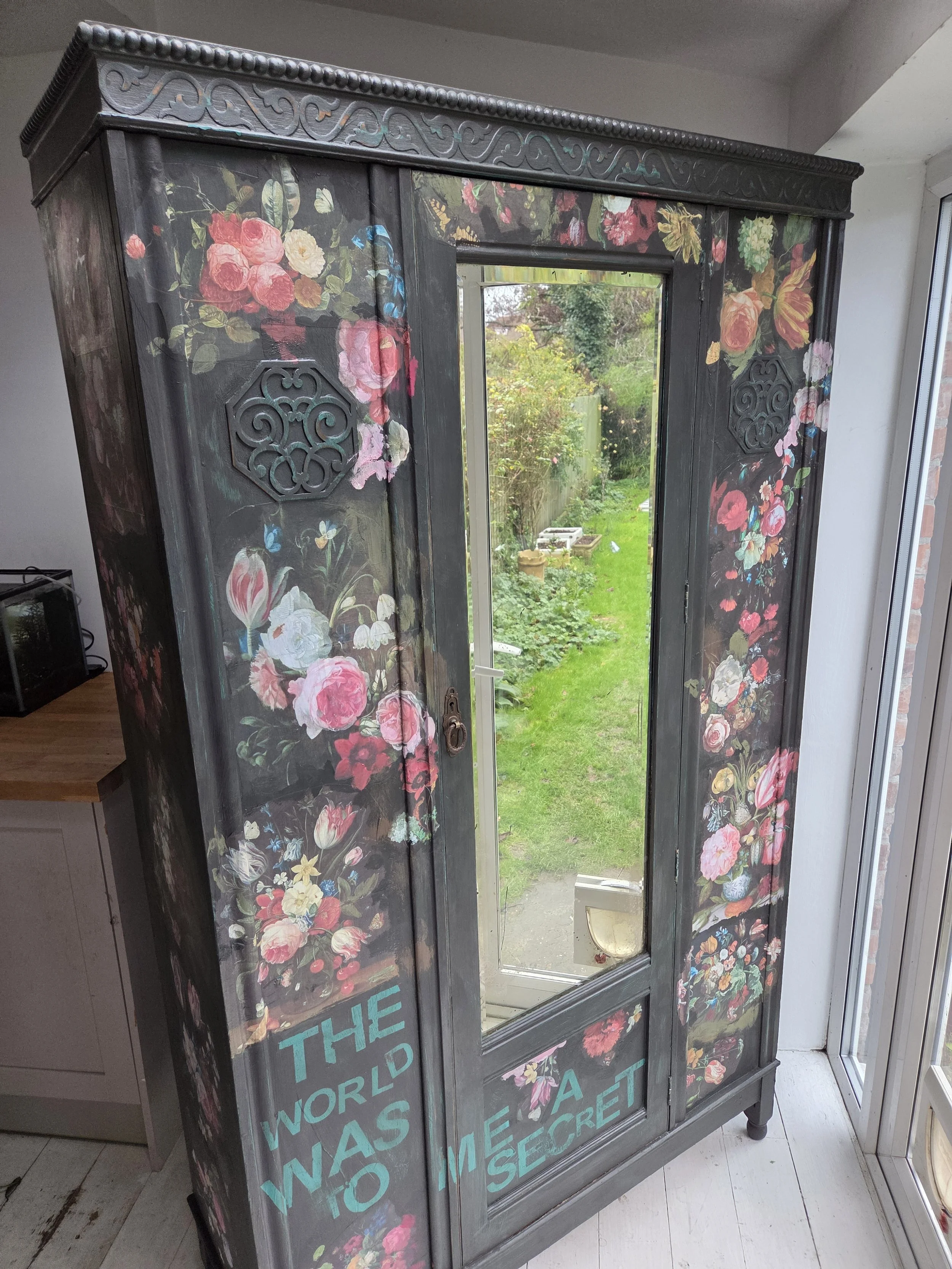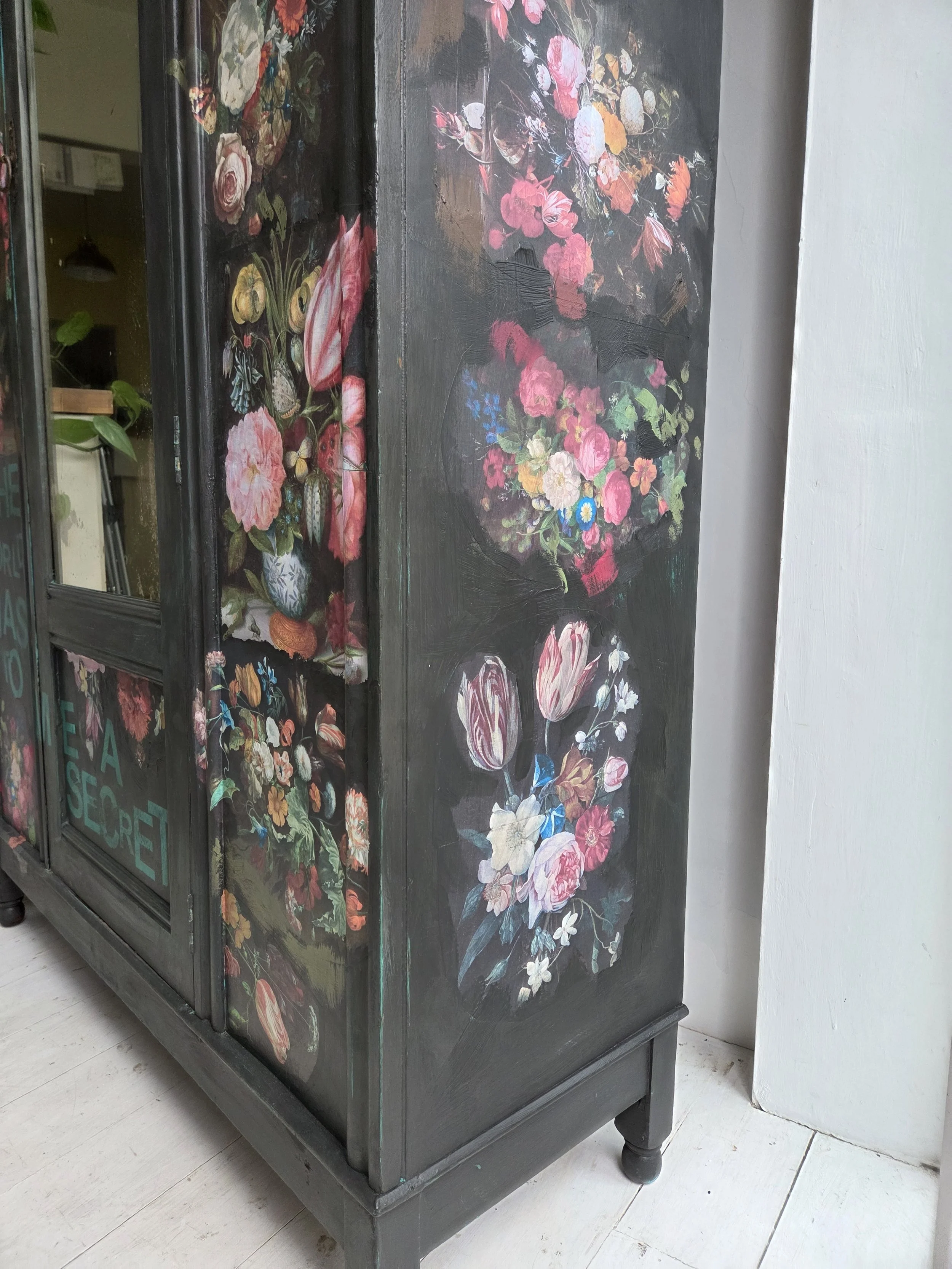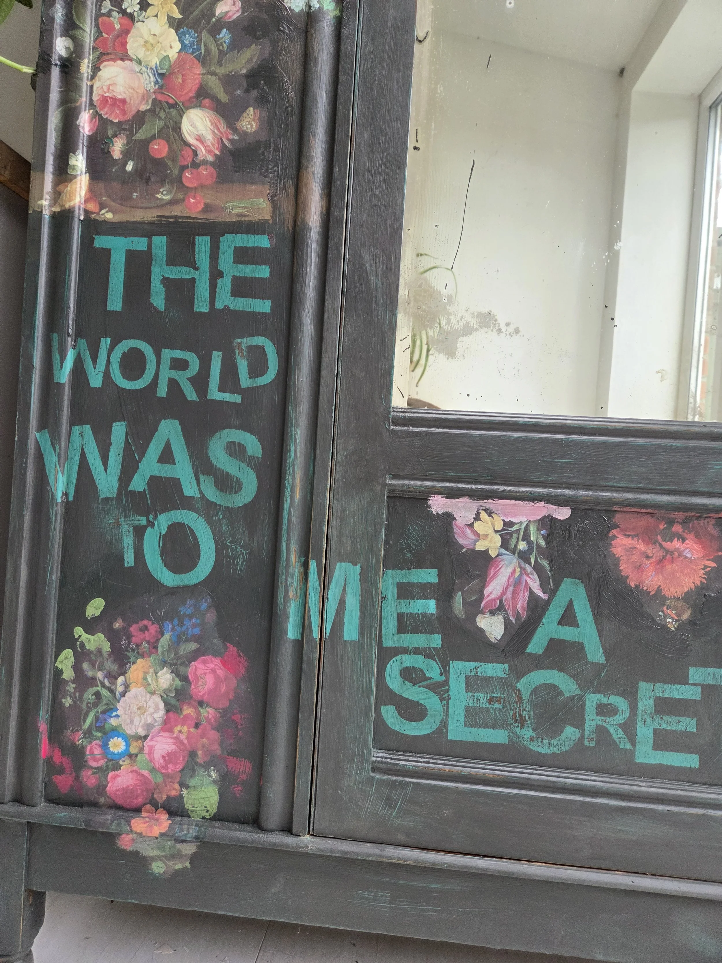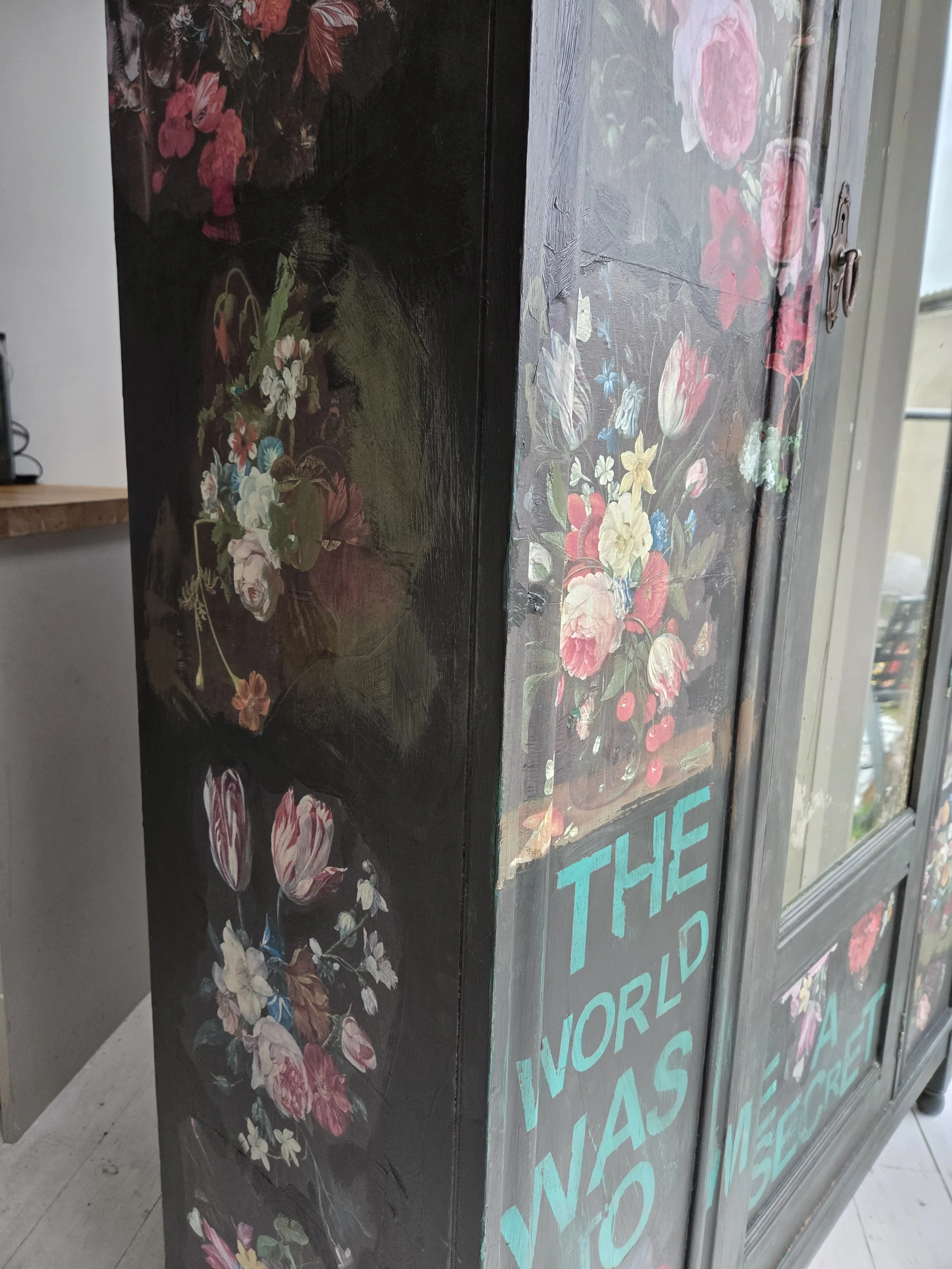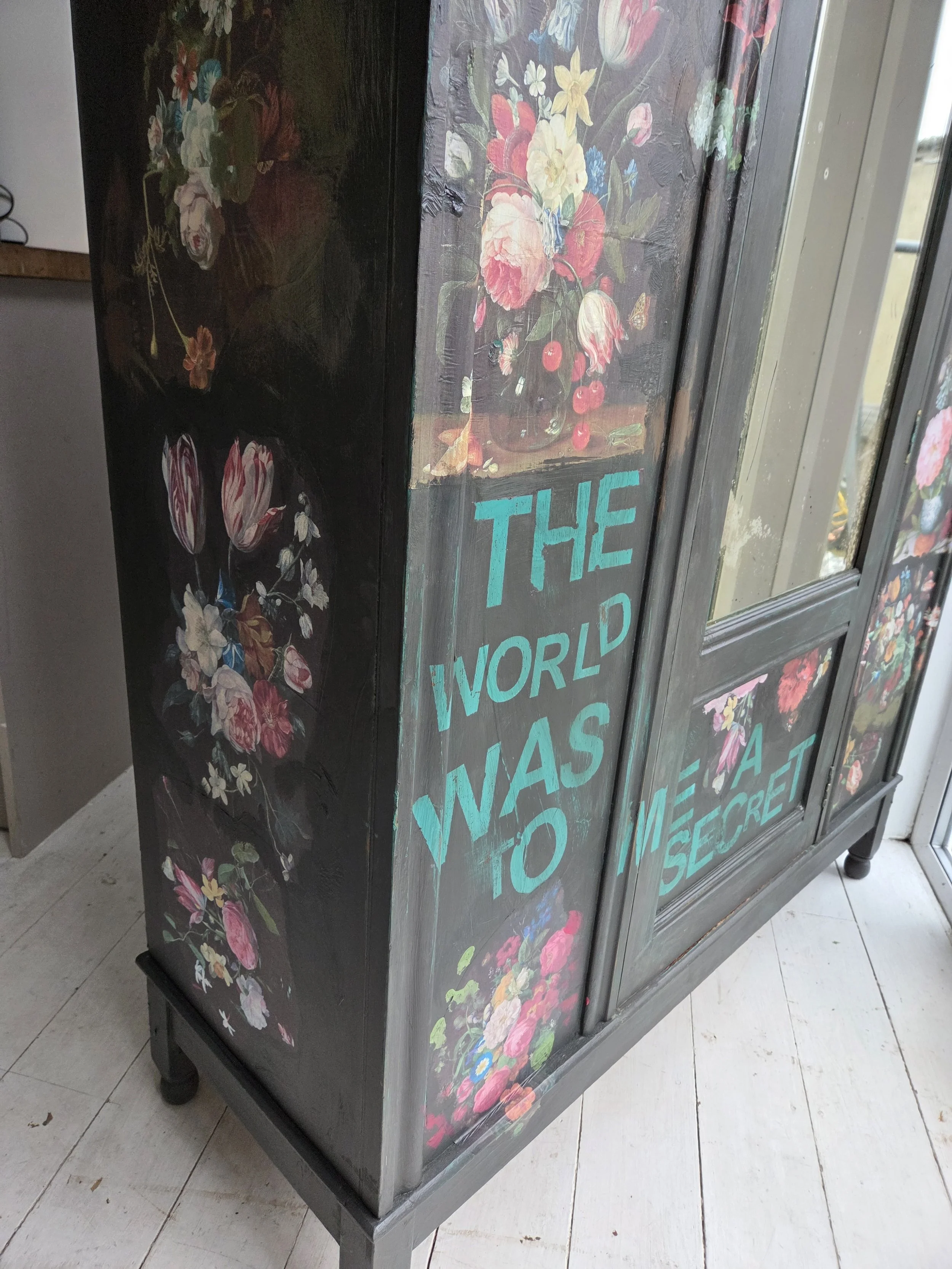 Antique wardrobe. Painted in ‘graphite’, a very dark grey. And then decorated all over with decoupage. The decoupage consists of antique still life oil paintings by Flemish painters who lived around the 17th century . The flowers have been sized and layered in a collage effect. The decoupage has been made by myself and has been printed in fade-resistant ink designed to last up to 100 years before any fading occurs. Then I have painted over the top to blend all of the components together. The text reads, in the teal of the undercoat ‘the world was to me a secret’, a quote from Mary Shelley's Frankenstein. The decoration extends over the sides.