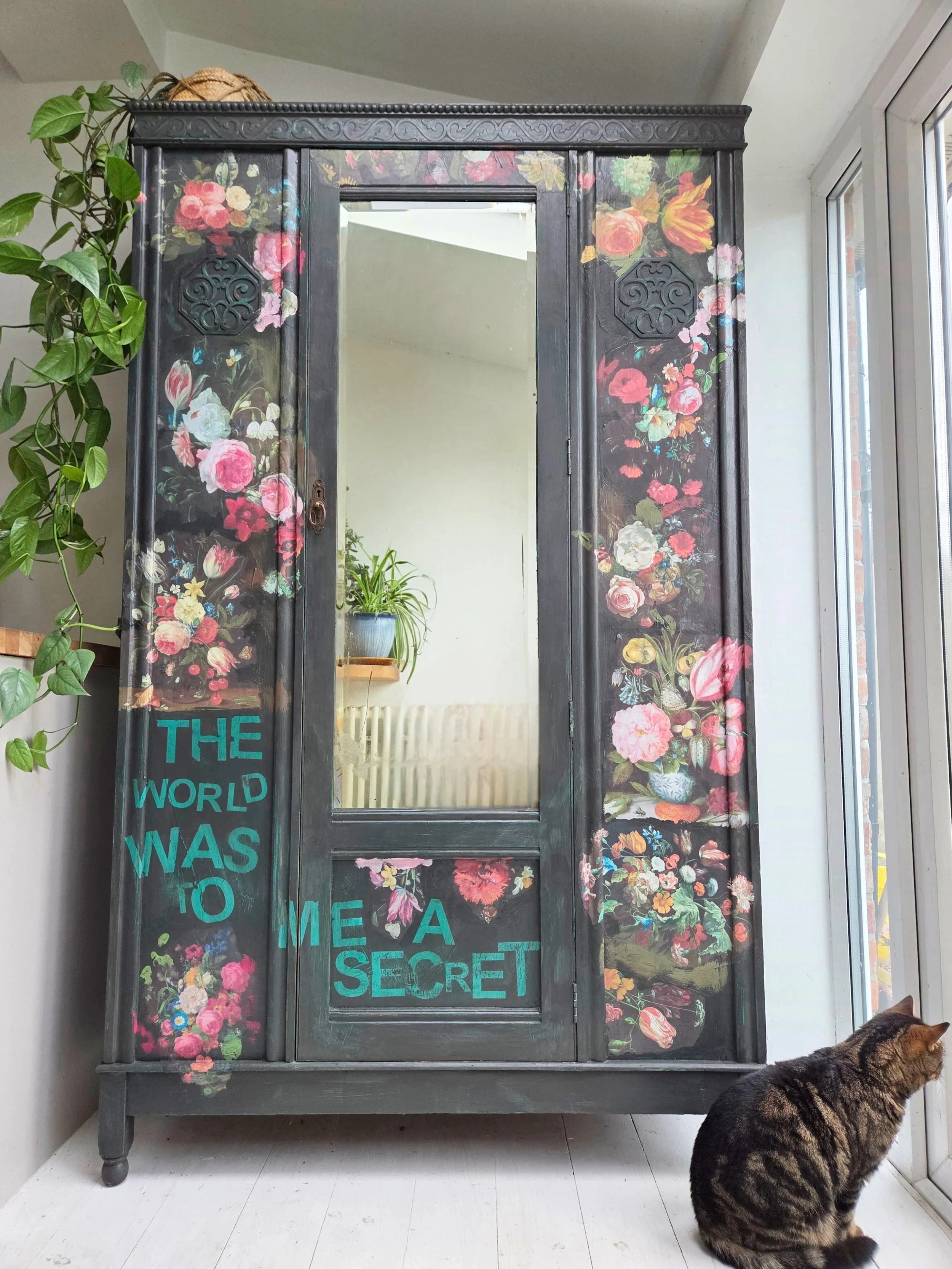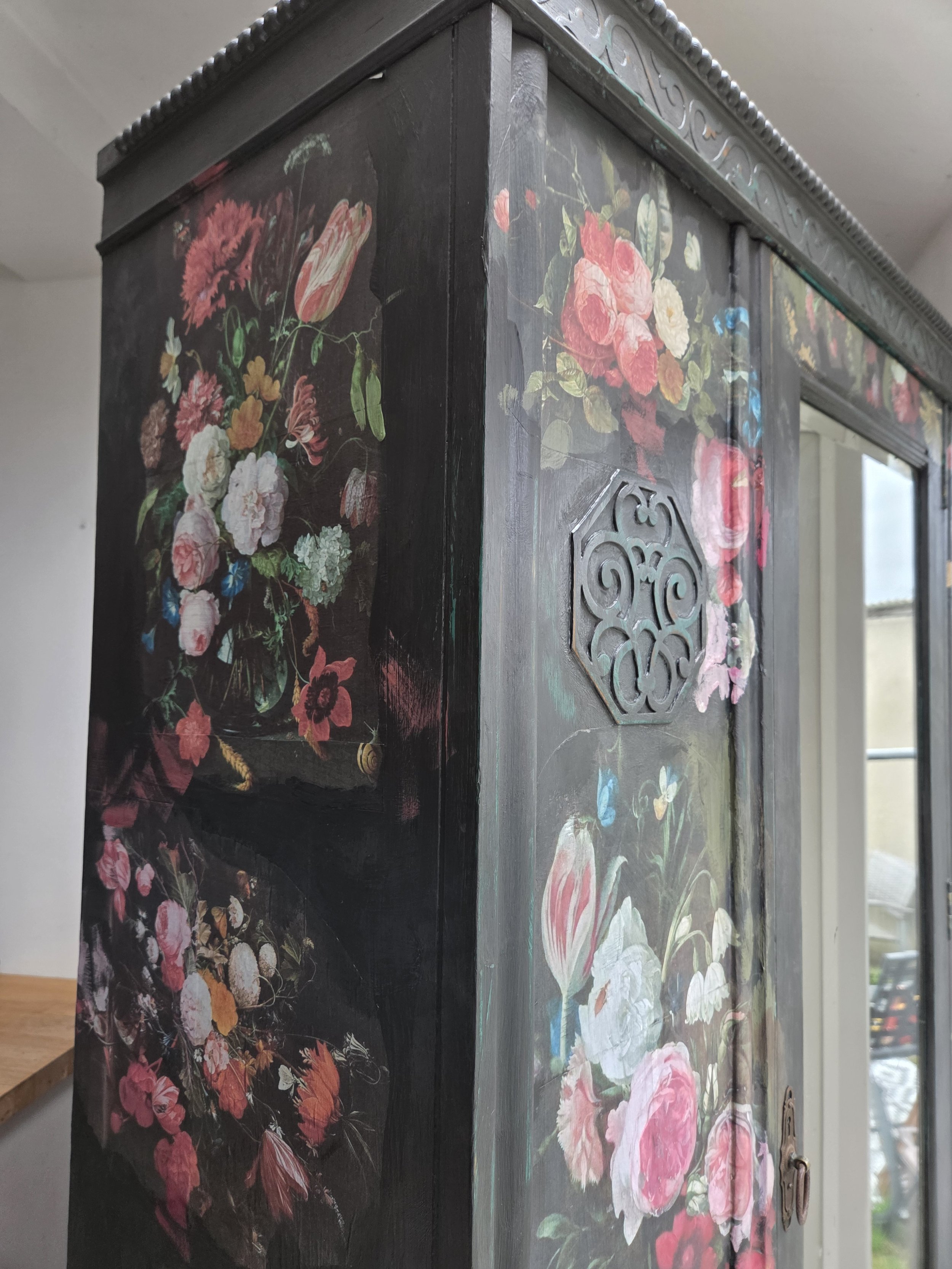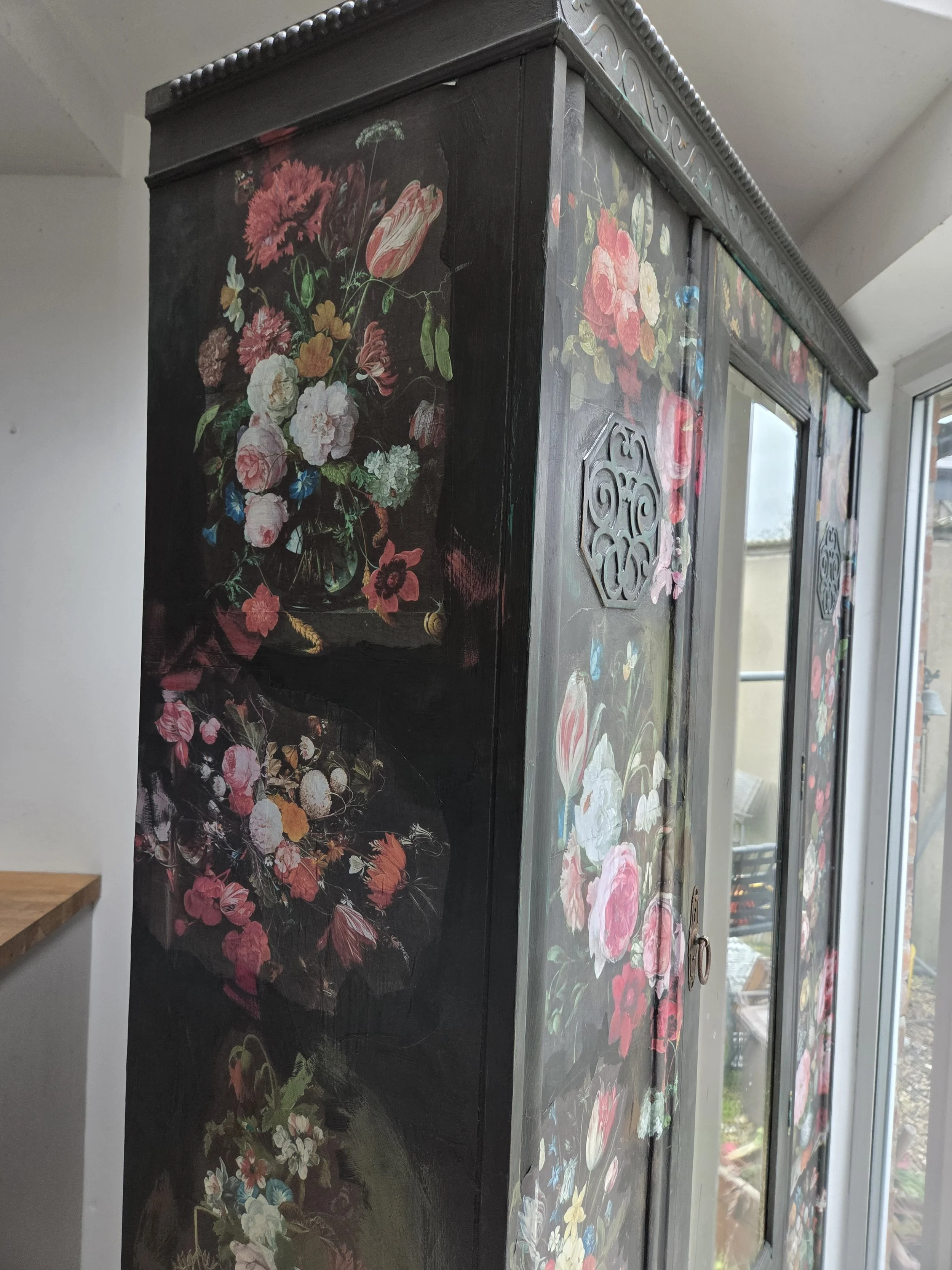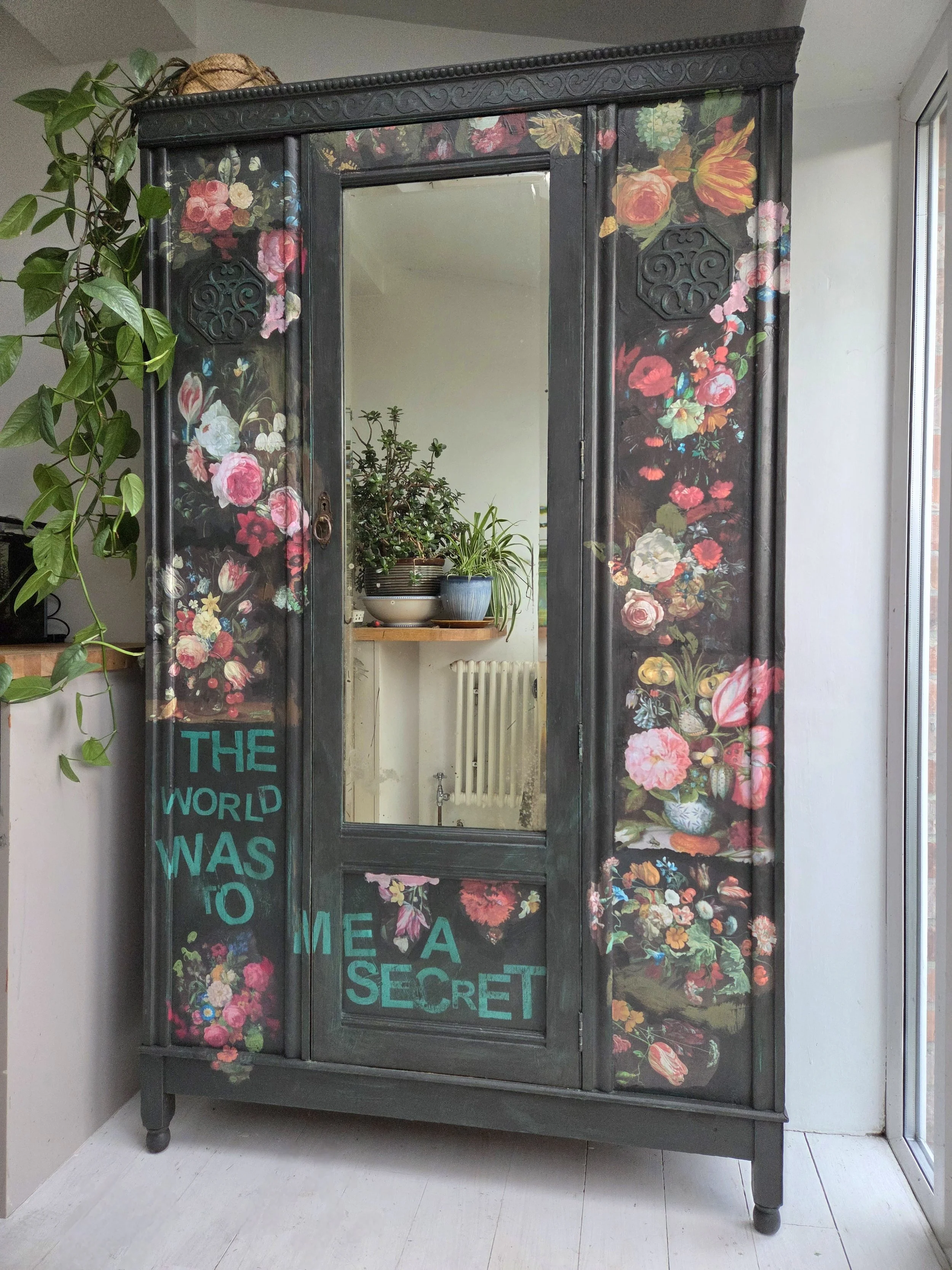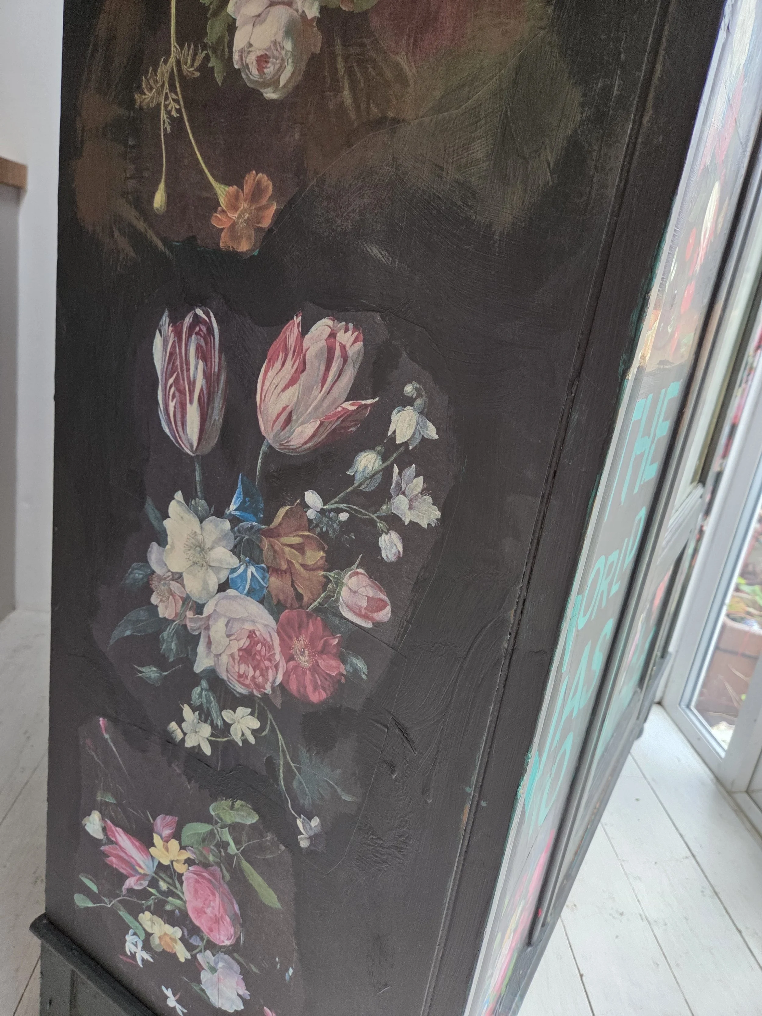 Antique wardrobe. Painted in ‘graphite’, a very dark grey. And then decorated all over with decoupage. The decoupage consists of antique still life oil paintings by Flemish painters who lived around the 17th century . The flowers have been sized and layered in a collage effect. The decoupage has been made by myself and has been printed in fade-resistant ink designed to last up to 100 years before any fading occurs. Then I have painted over the top to blend all of the components together. The text reads, in the teal of the undercoat ‘the world was to me a secret’, a quote from Mary Shelley's Frankenstein. The decoration extends over the sides.