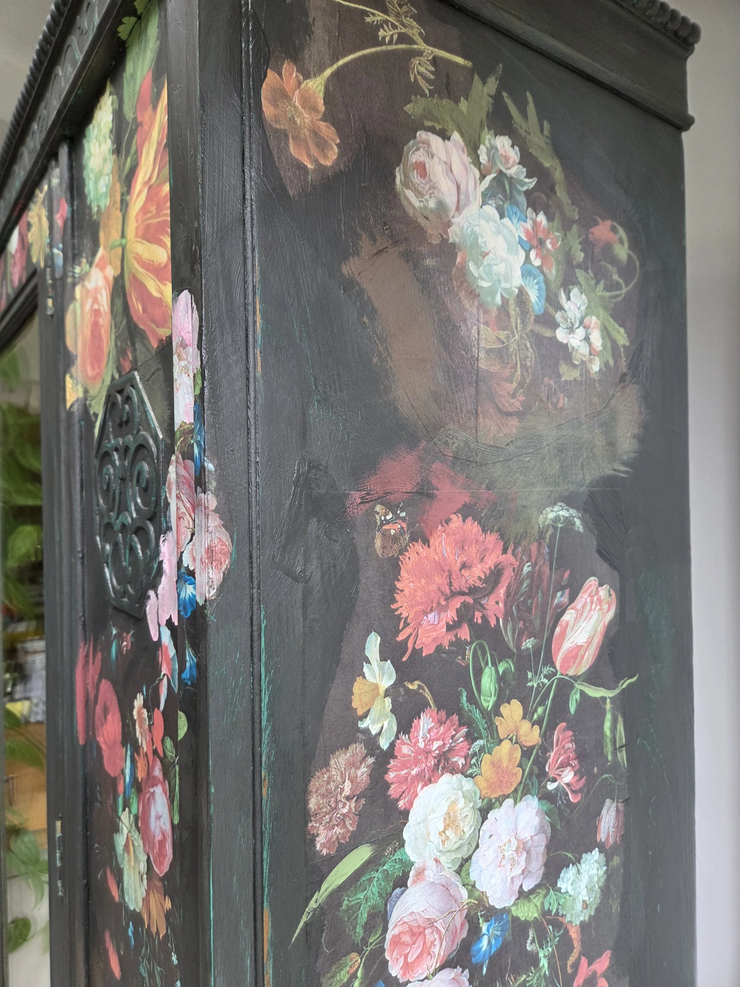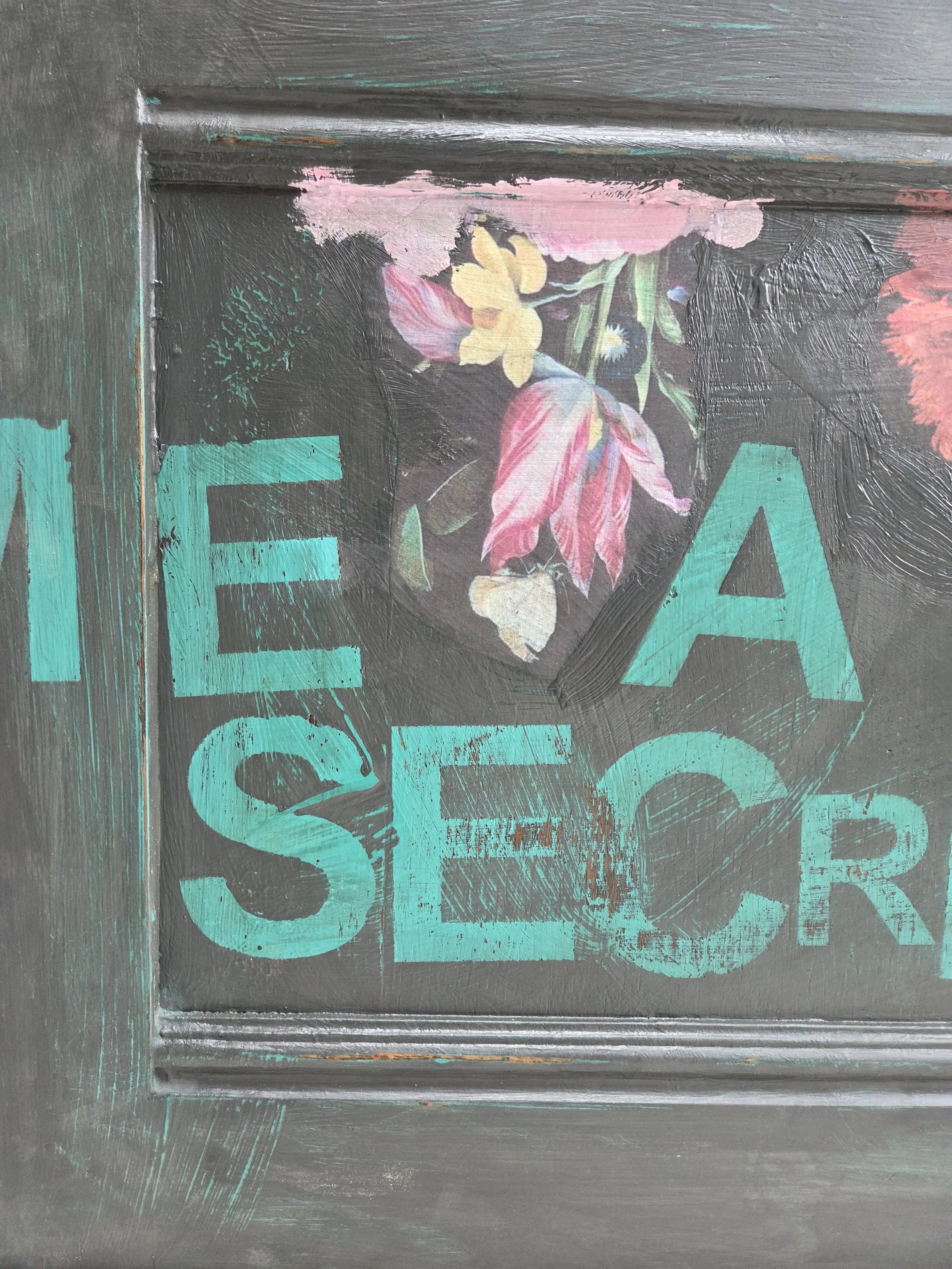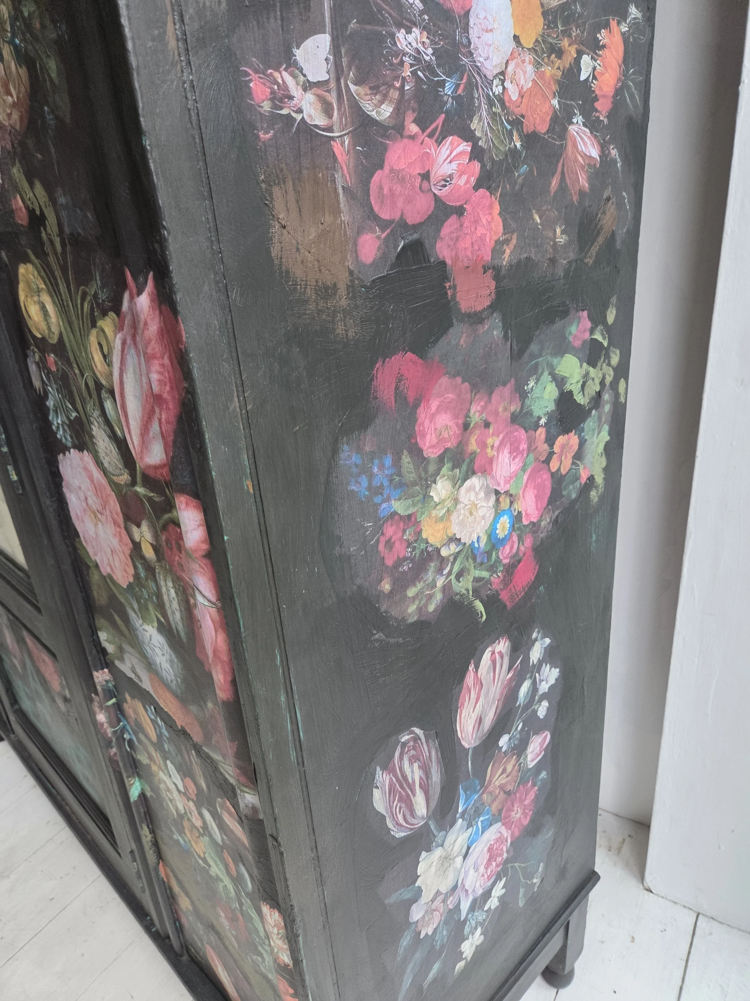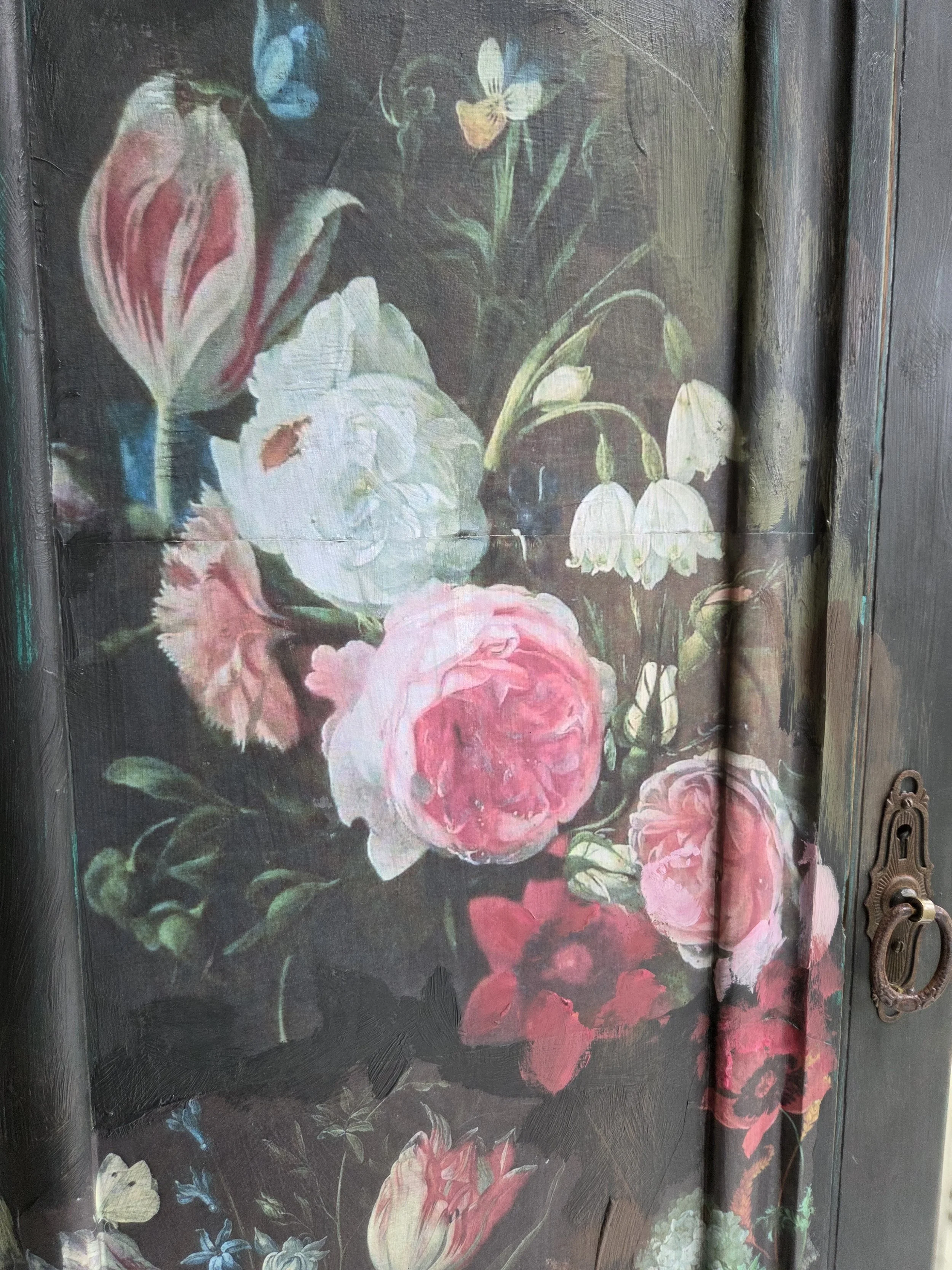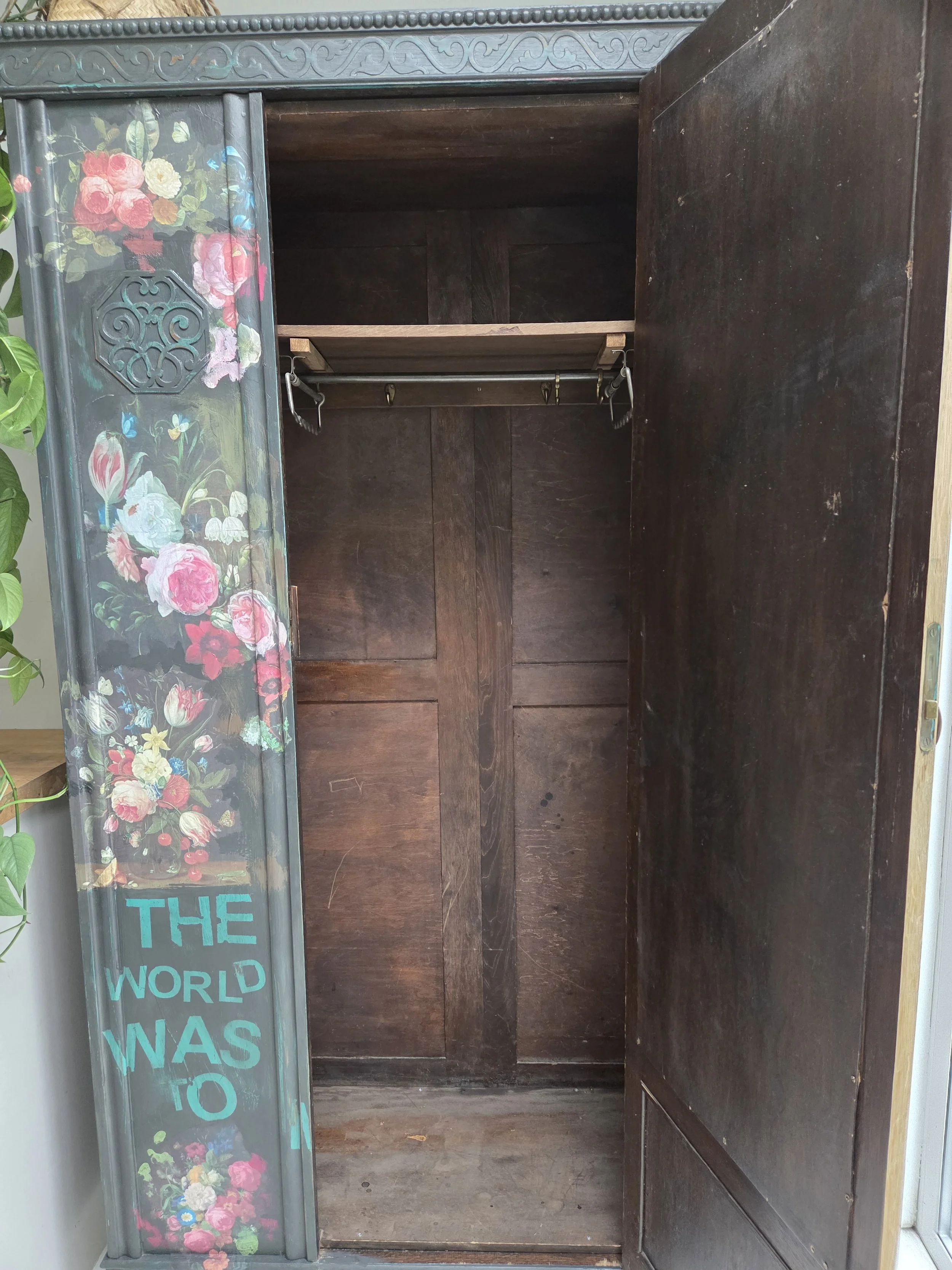 Antique wardrobe. Painted in ‘graphite’, a very dark grey. And then decorated all over with decoupage. The decoupage consists of antique still life oil paintings by Flemish painters who lived around the 17th century . The flowers have been sized and layered in a collage effect. The decoupage has been made by myself and has been printed in fade-resistant ink designed to last up to 100 years before any fading occurs. Then I have painted over the top to blend all of the components together. The text reads, in the teal of the undercoat ‘the world was to me a secret’, a quote from Mary Shelley's Frankenstein. The decoration extends over the sides.