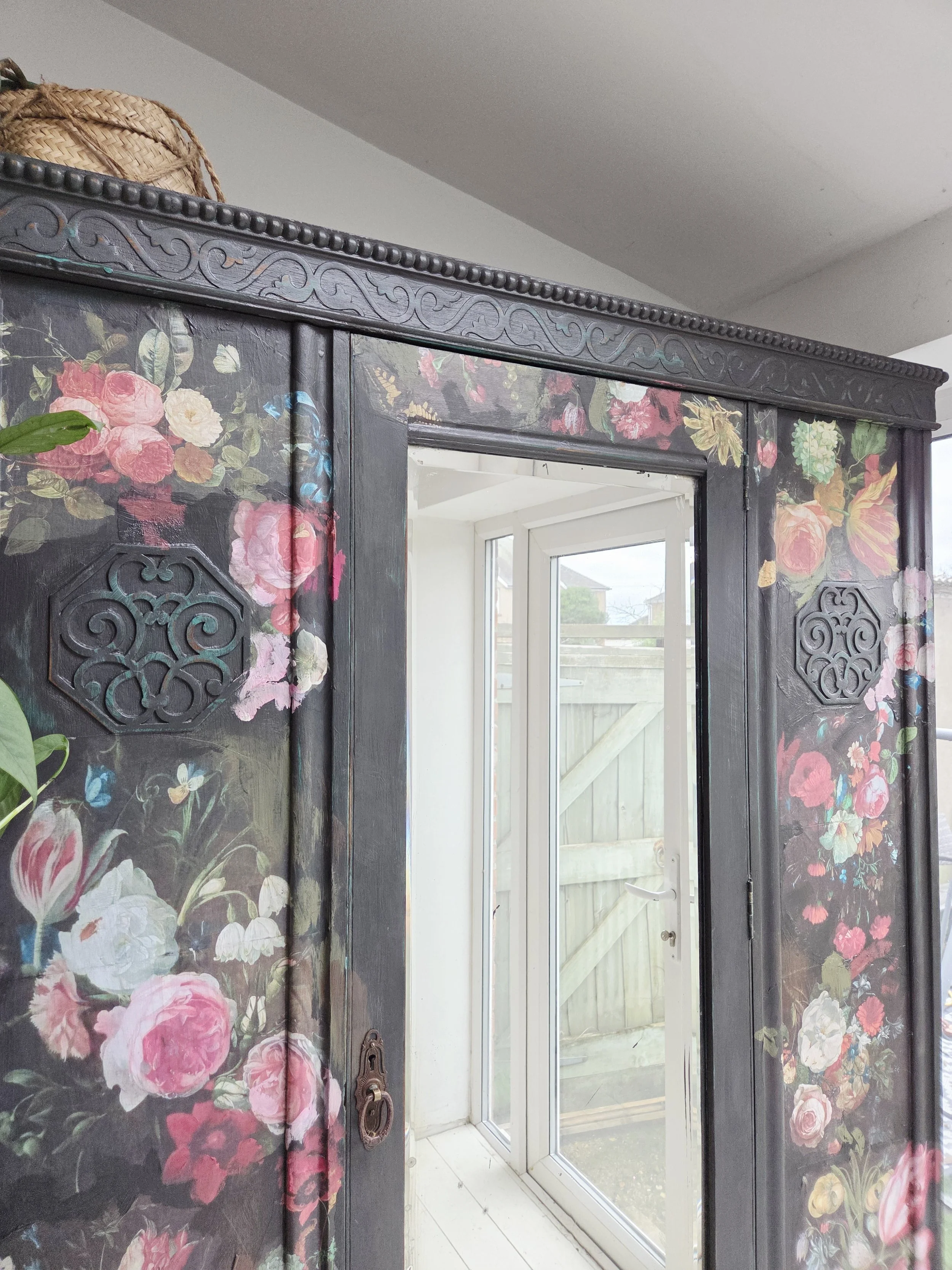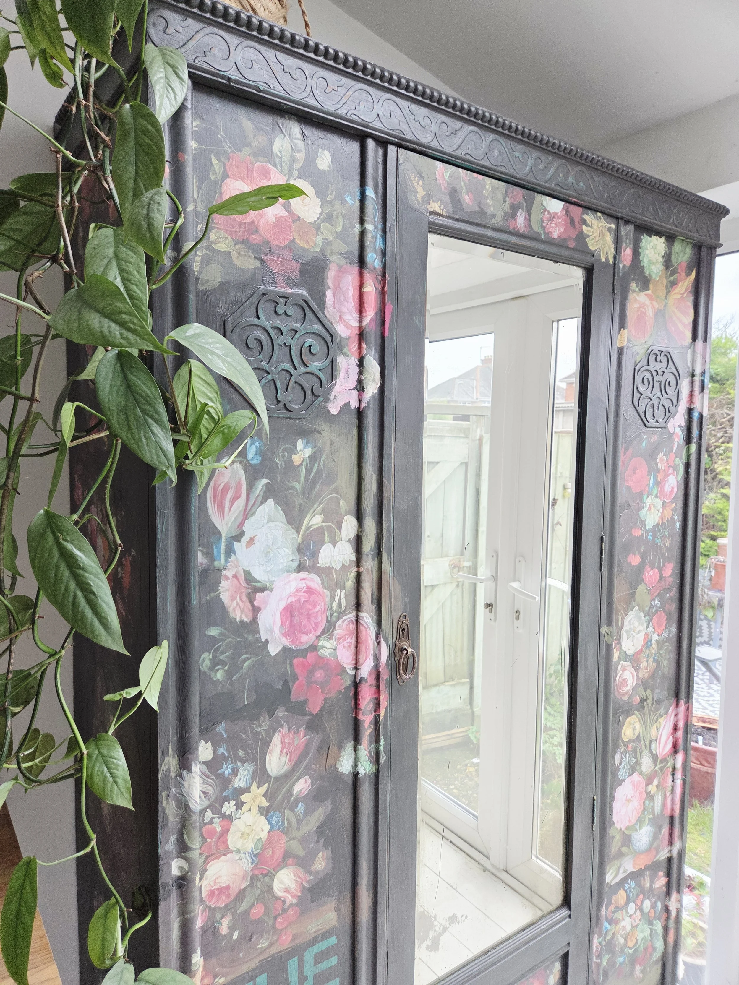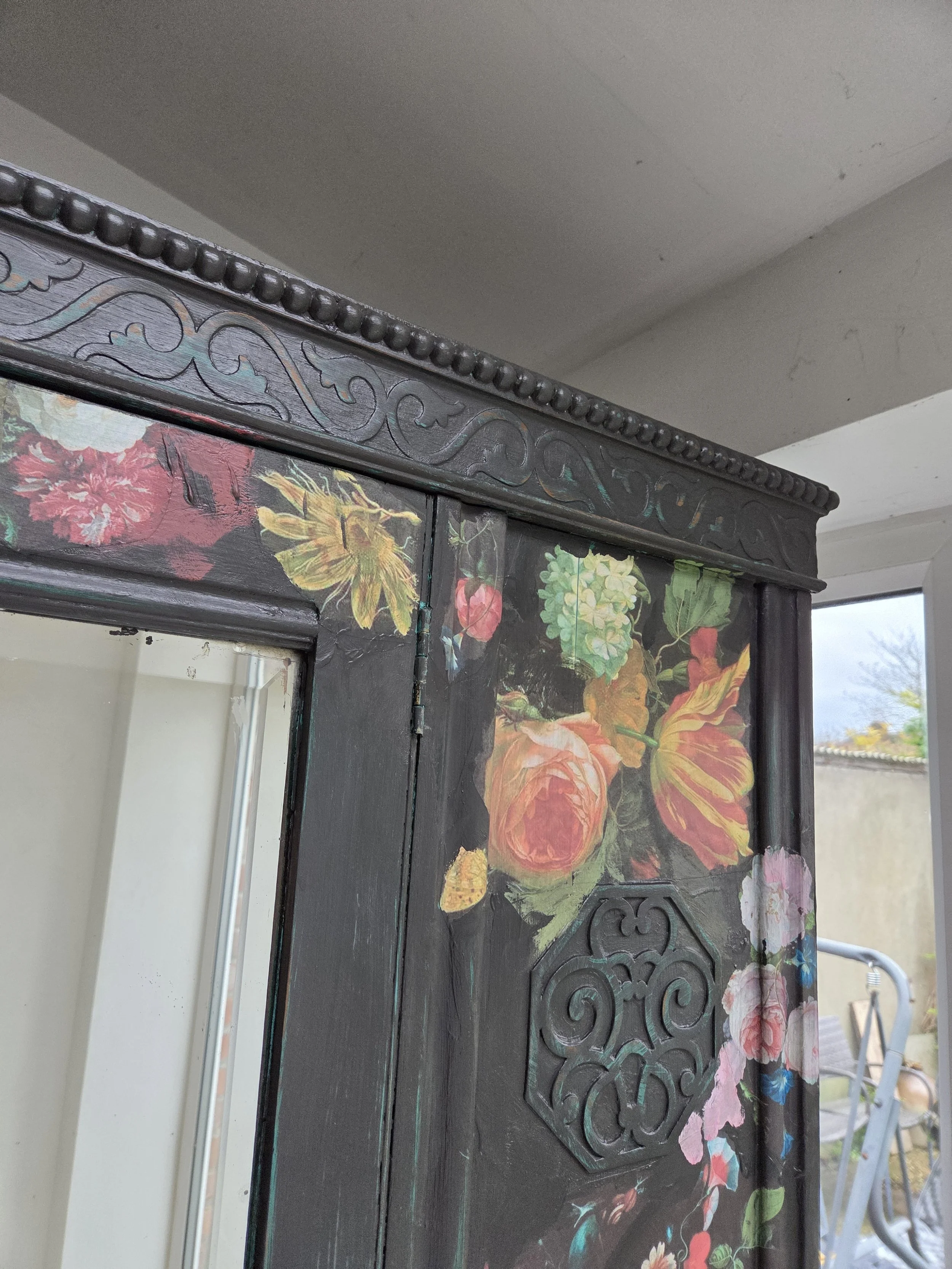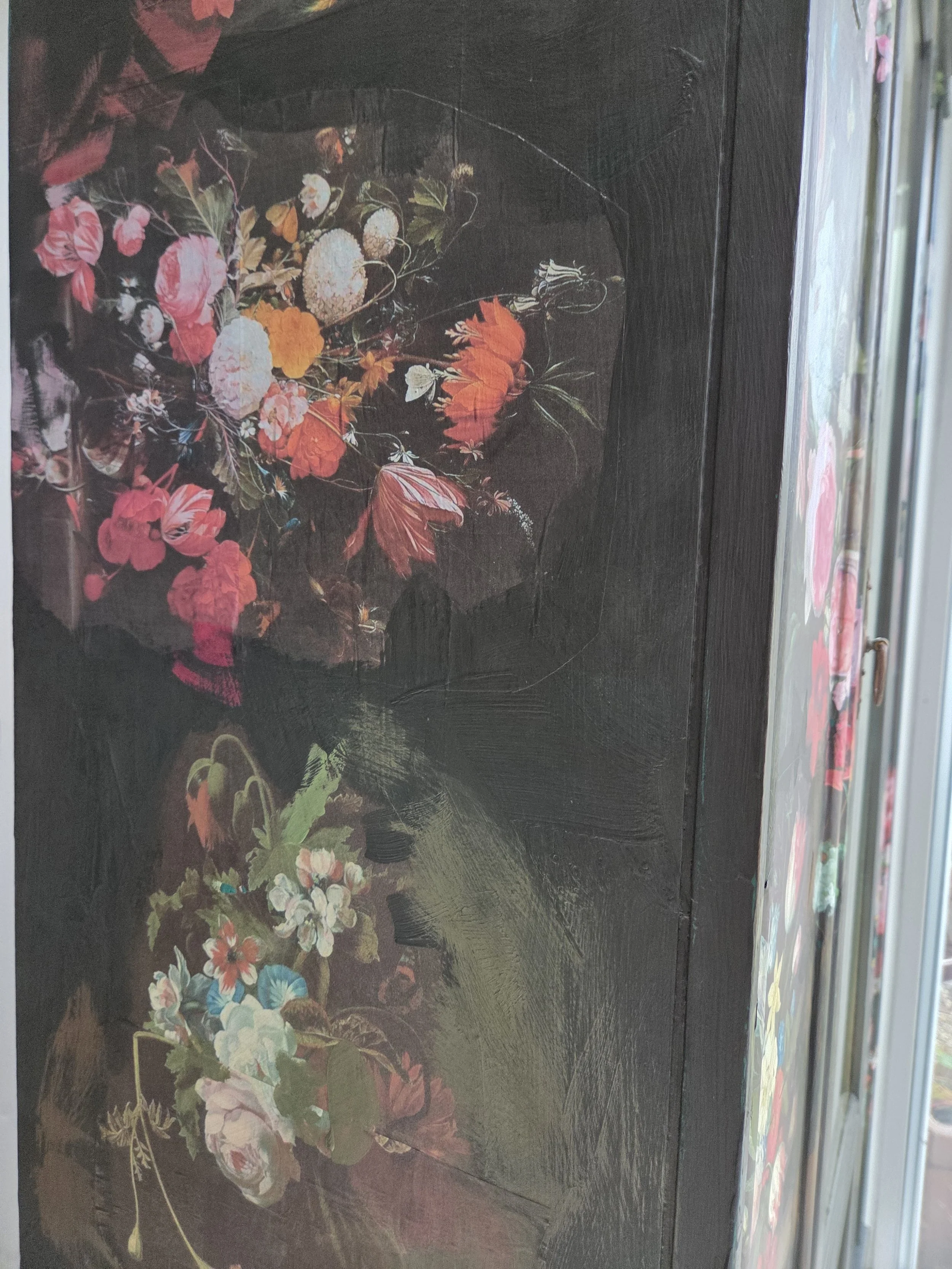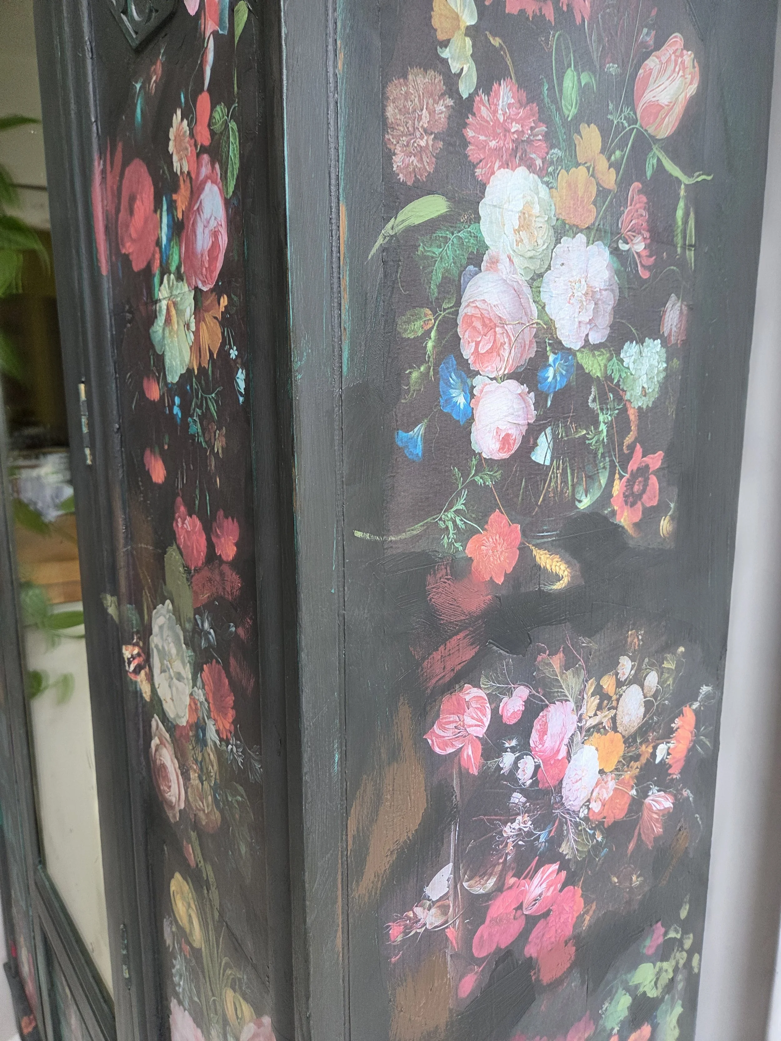 Antique wardrobe. Painted in ‘graphite’, a very dark grey. And then decorated all over with decoupage. The decoupage consists of antique still life oil paintings by Flemish painters who lived around the 17th century . The flowers have been sized and layered in a collage effect. The decoupage has been made by myself and has been printed in fade-resistant ink designed to last up to 100 years before any fading occurs. Then I have painted over the top to blend all of the components together. The text reads, in the teal of the undercoat ‘the world was to me a secret’, a quote from Mary Shelley's Frankenstein. The decoration extends over the sides.