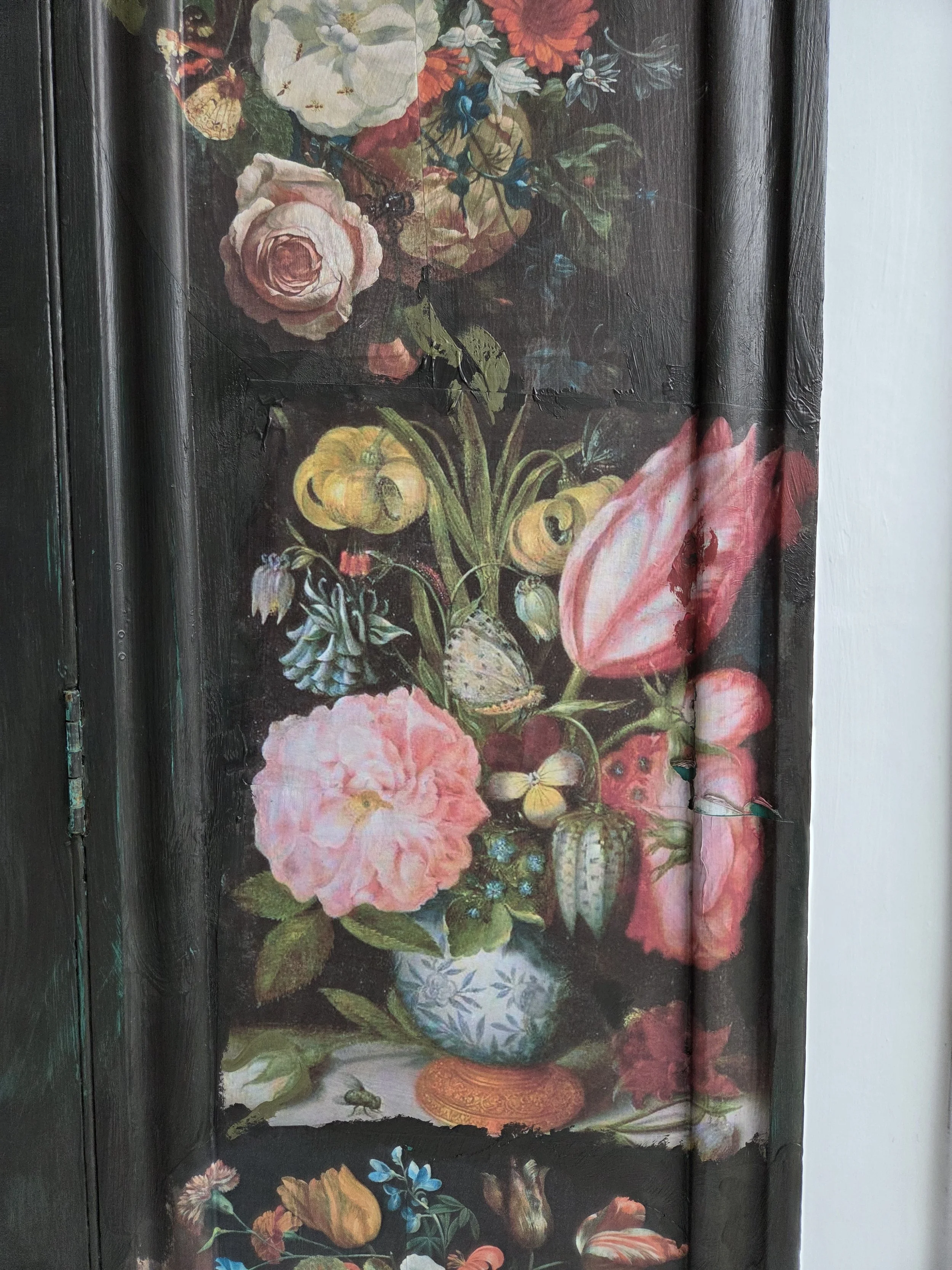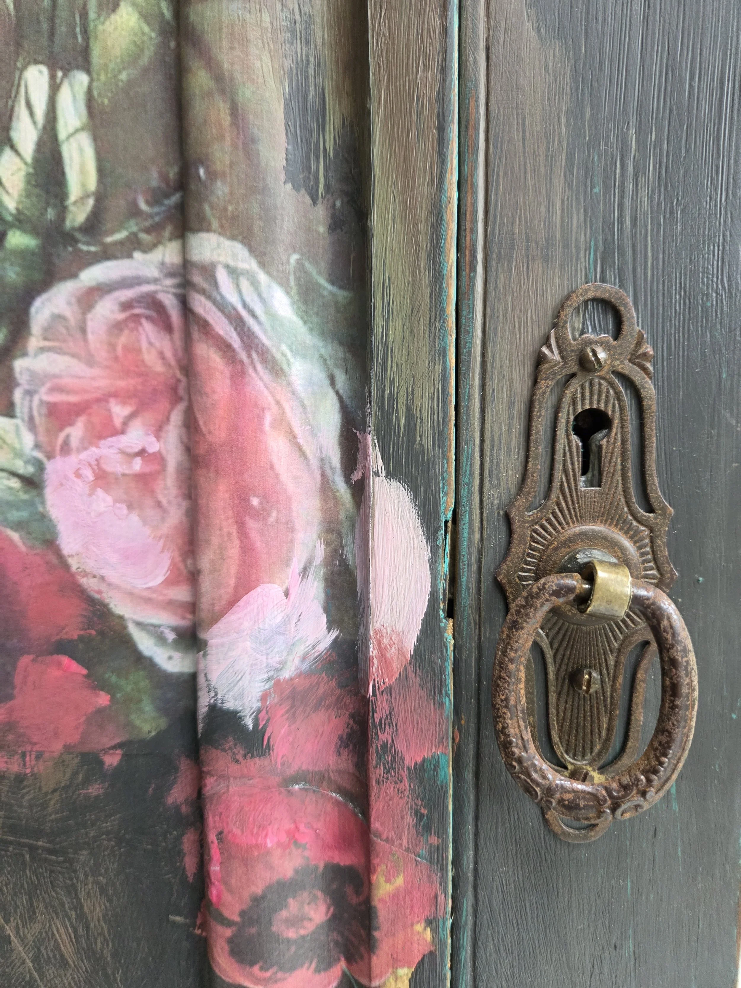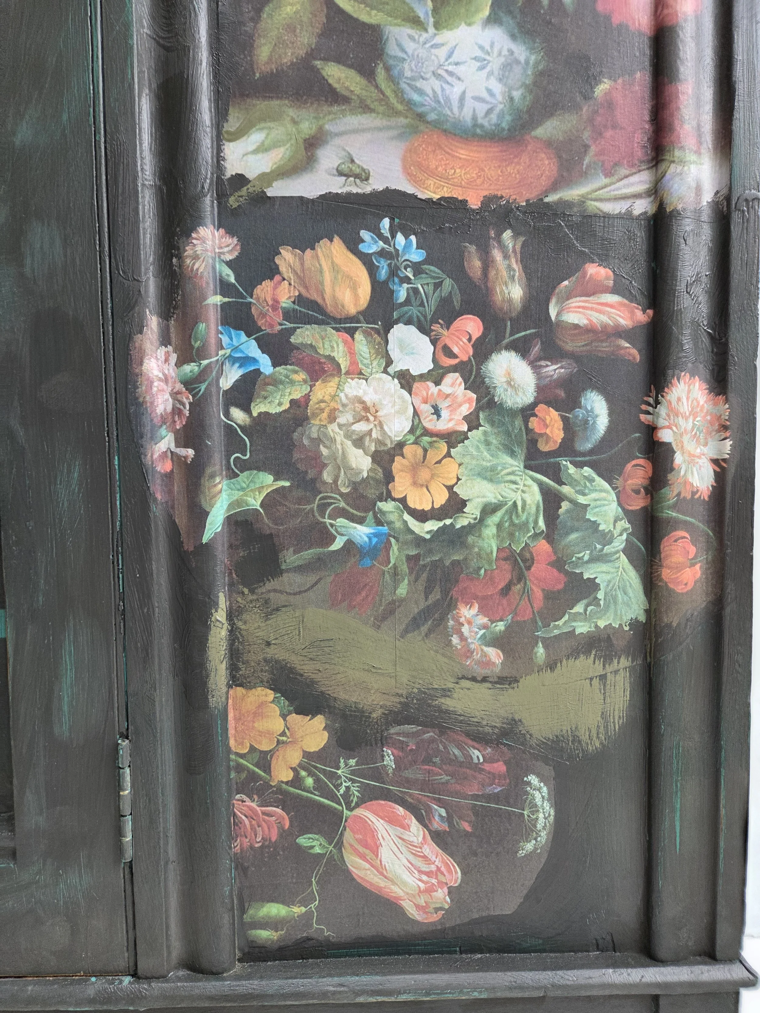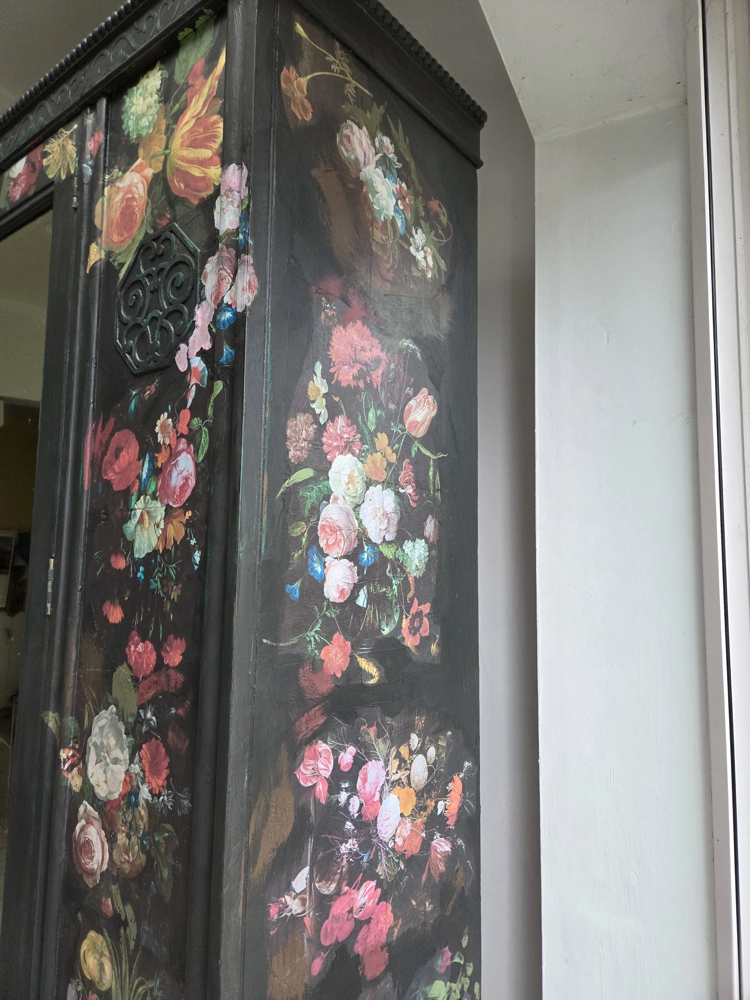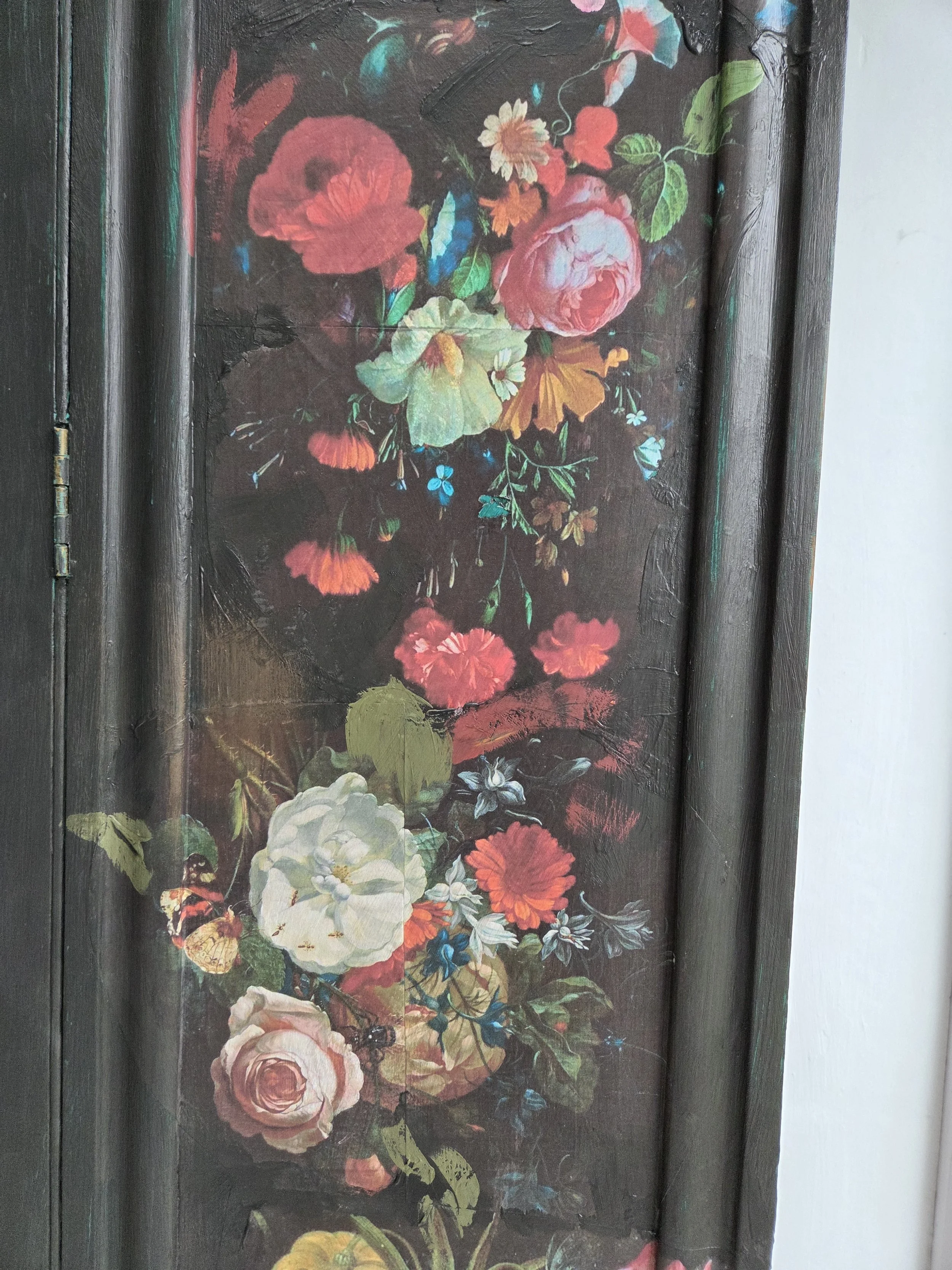 Antique wardrobe. Painted in ‘graphite’, a very dark grey. And then decorated all over with decoupage. The decoupage consists of antique still life oil paintings by Flemish painters who lived around the 17th century . The flowers have been sized and layered in a collage effect. The decoupage has been made by myself and has been printed in fade-resistant ink designed to last up to 100 years before any fading occurs. Then I have painted over the top to blend all of the components together. The text reads, in the teal of the undercoat ‘the world was to me a secret’, a quote from Mary Shelley's Frankenstein. The decoration extends over the sides.