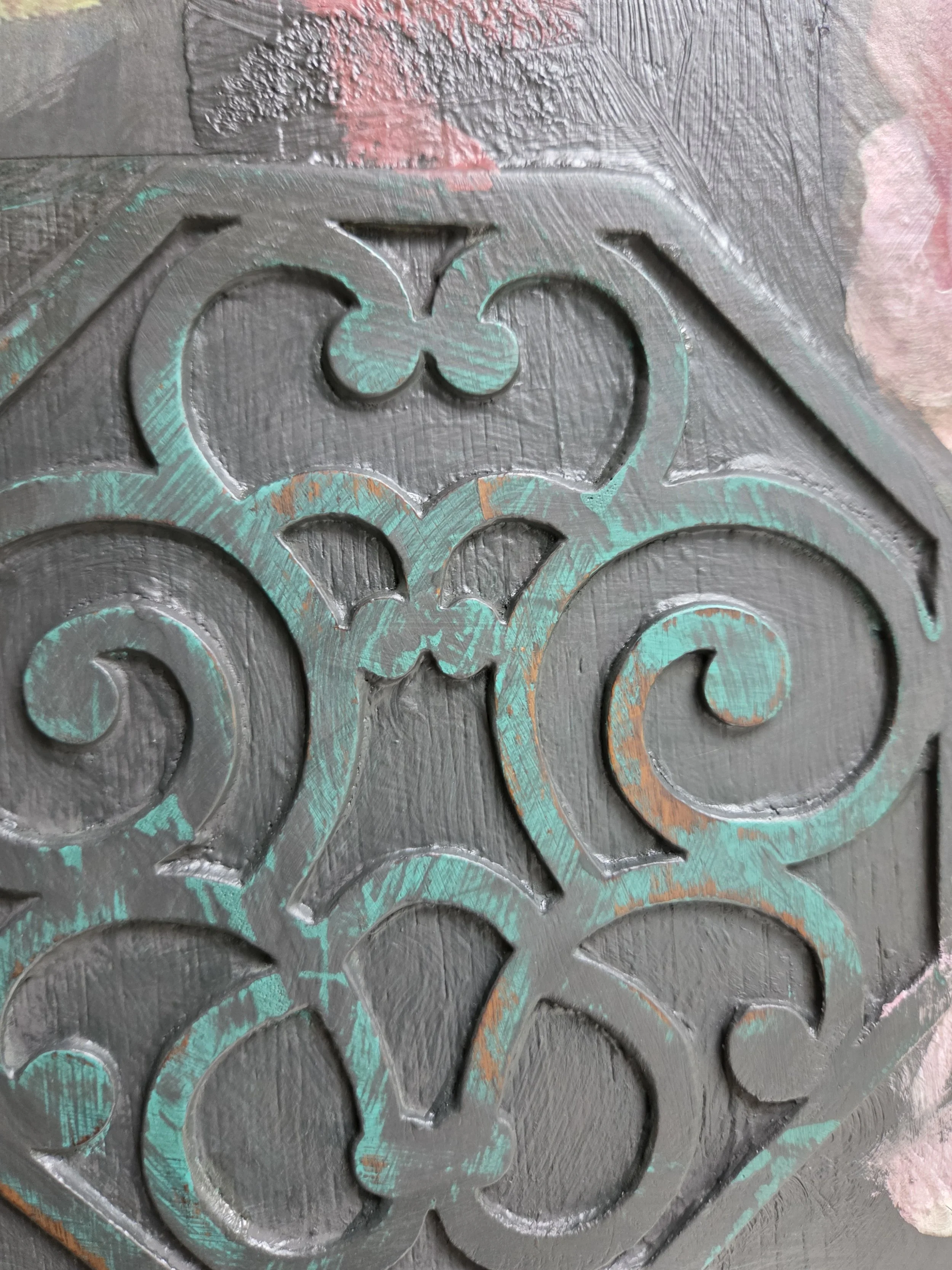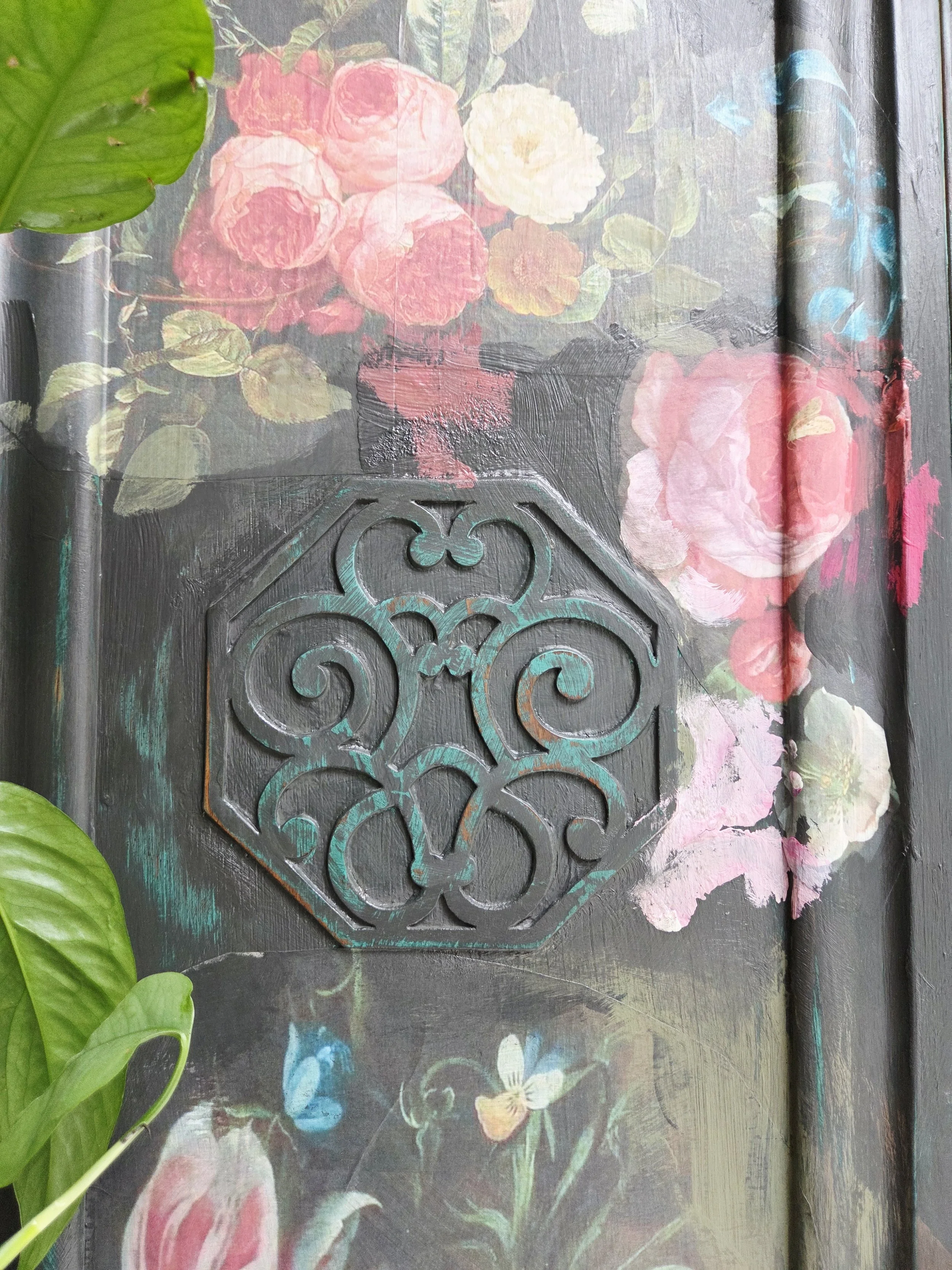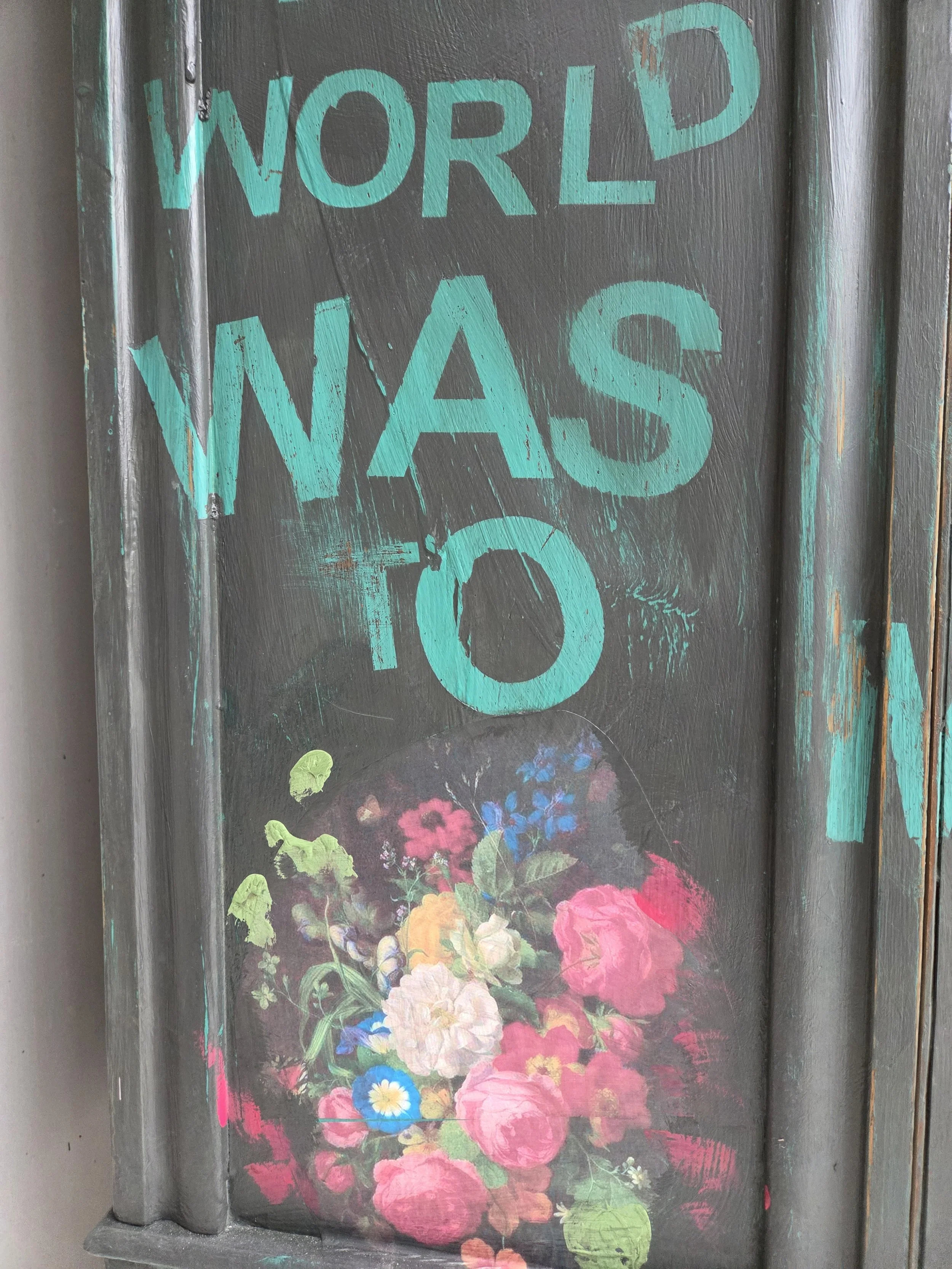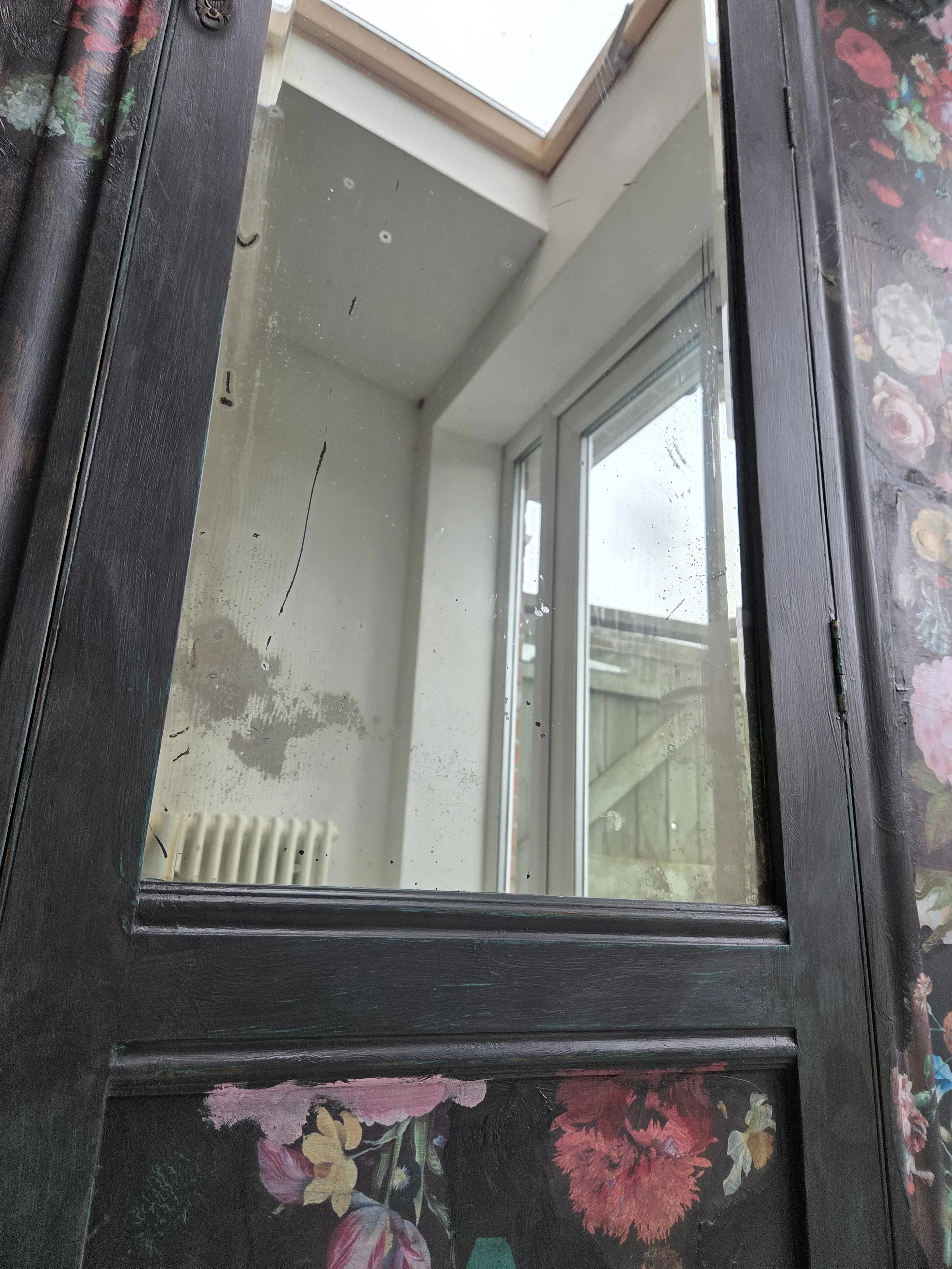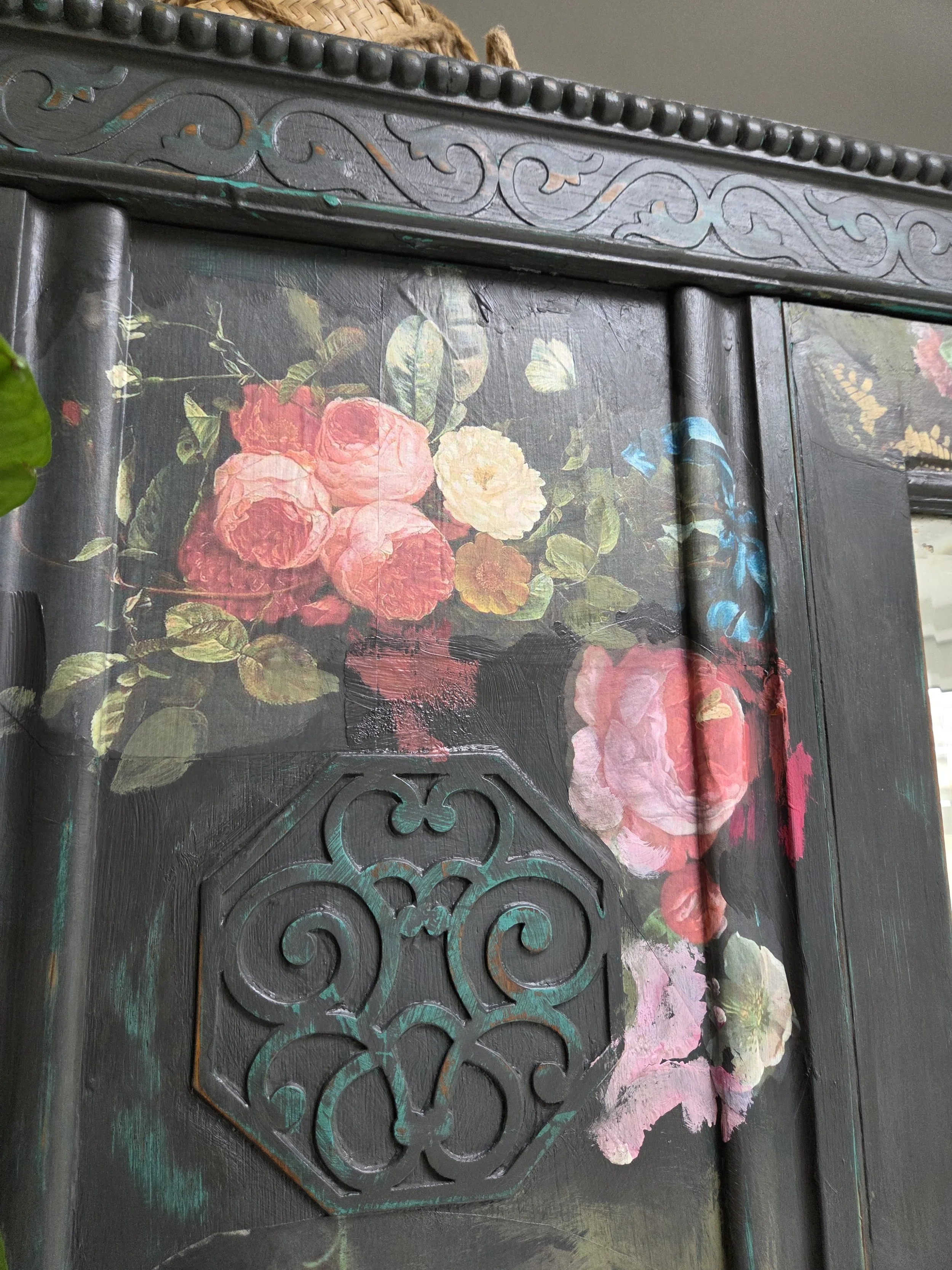 Antique wardrobe. Painted in ‘graphite’, a very dark grey. And then decorated all over with decoupage. The decoupage consists of antique still life oil paintings by Flemish painters who lived around the 17th century . The flowers have been sized and layered in a collage effect. The decoupage has been made by myself and has been printed in fade-resistant ink designed to last up to 100 years before any fading occurs. Then I have painted over the top to blend all of the components together. The text reads, in the teal of the undercoat ‘the world was to me a secret’, a quote from Mary Shelley's Frankenstein. The decoration extends over the sides.