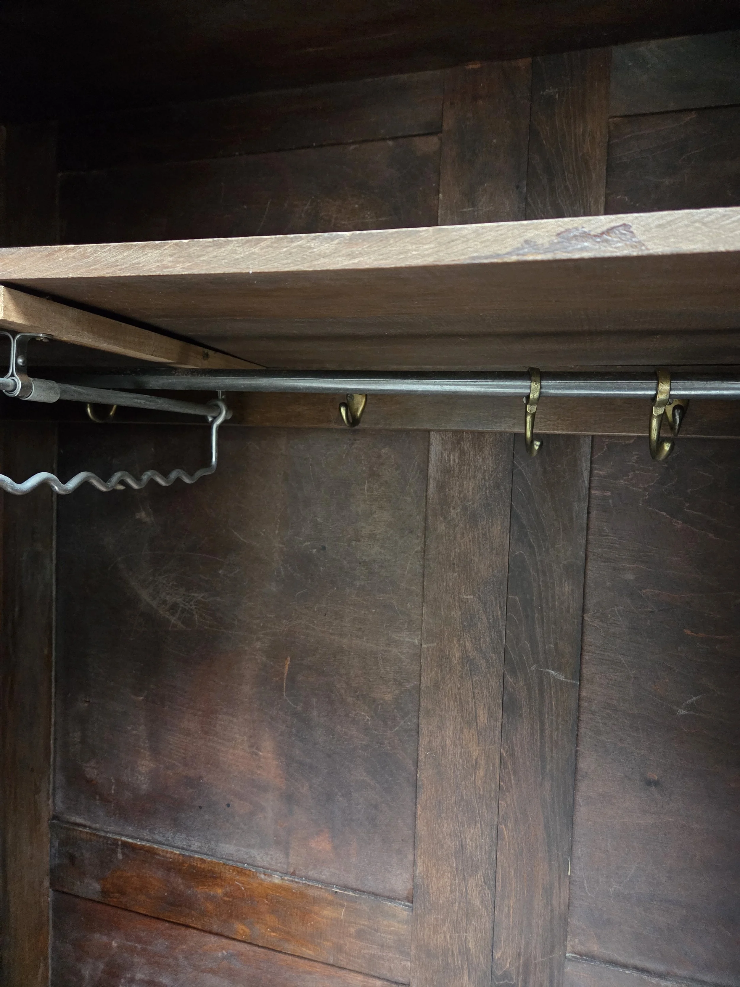 This is an Antique refurbished piece and will have life marks. It is sturdy and structurally sound. Constructed of high quality veneer which is fairly lightweight. The door latched securely. The inside is a little scruffy in places but good and clean. No woodworm past or present. Some vintage labels on the shelves still remain. There are a range of hanging options, a bar, hooks and smaller hanging rails so you can hang items facing you rather than perpendicular. The mirror has quite a lot of clouding, scratches and blemishes but I think this lends itself nicely to the overall finish. The latch works very well and has a lovely rusty aged patina.