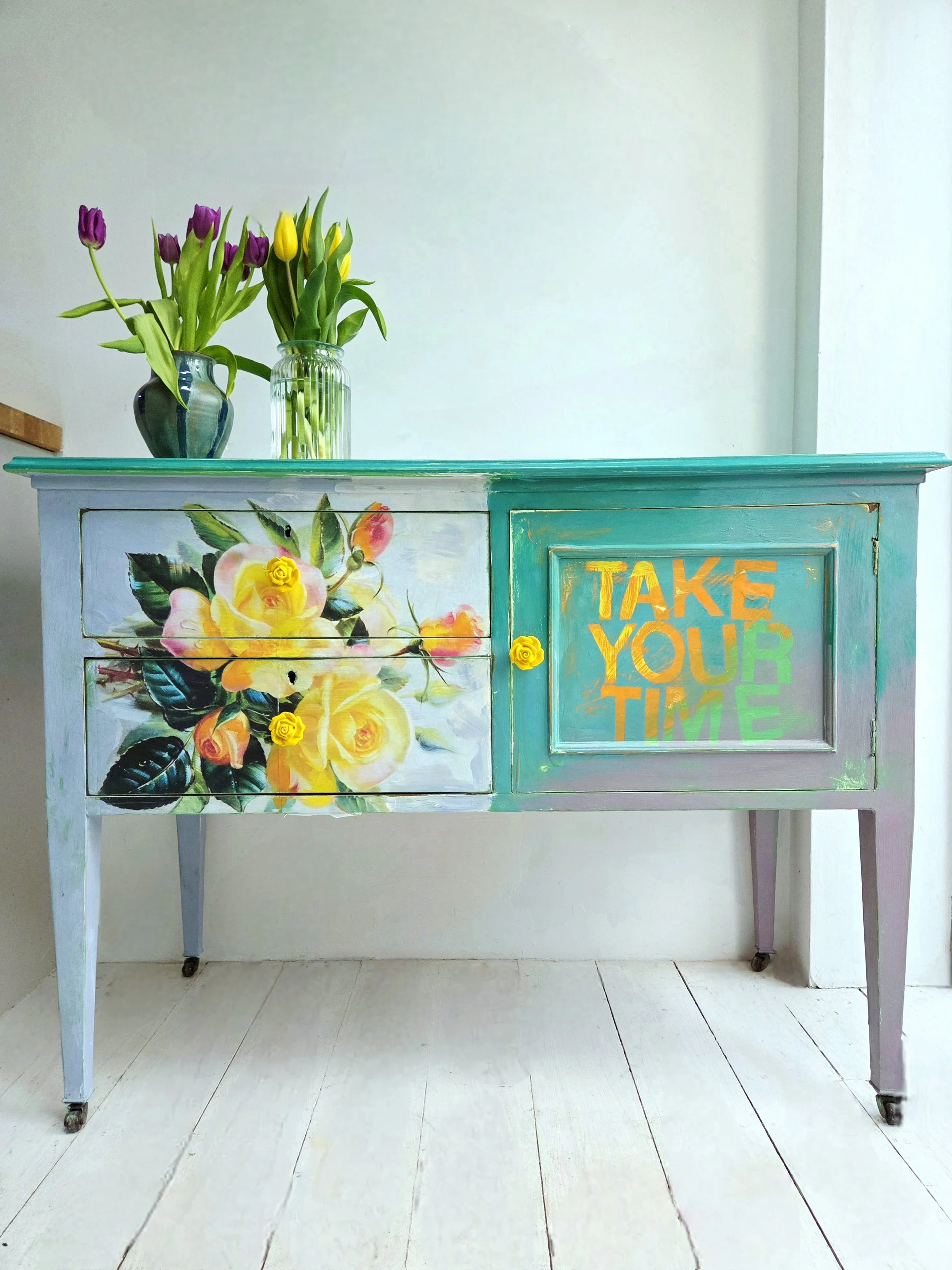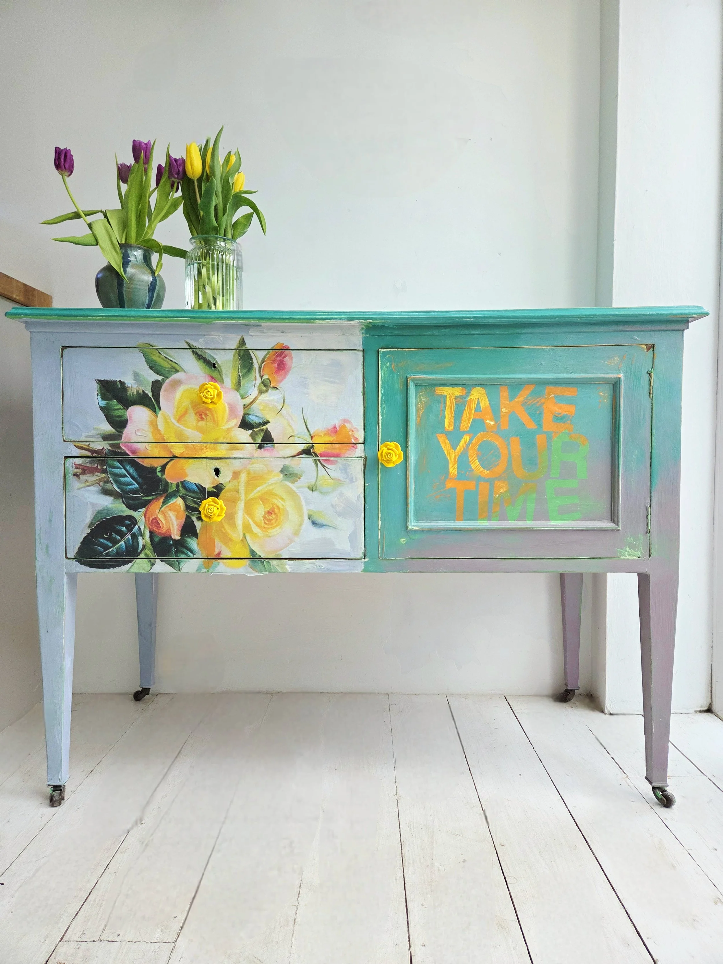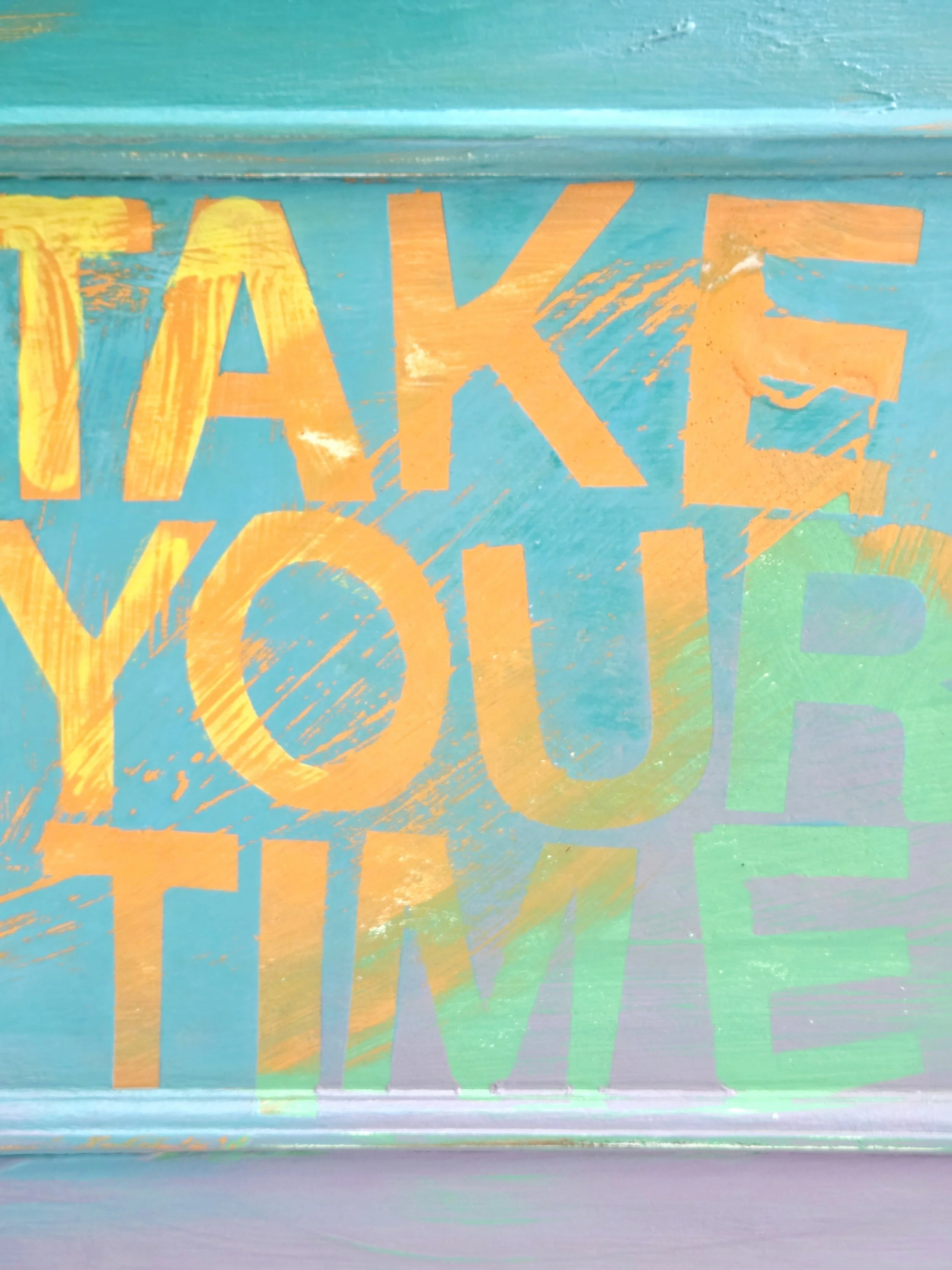The decoupage has been made by myself and has been printed in fade-resistant ink designed to last up to 100 years before any fading occurs. Then painted over the top to blend all of the components together. The text reads, in the colours of the undercoat ‘take your time’.