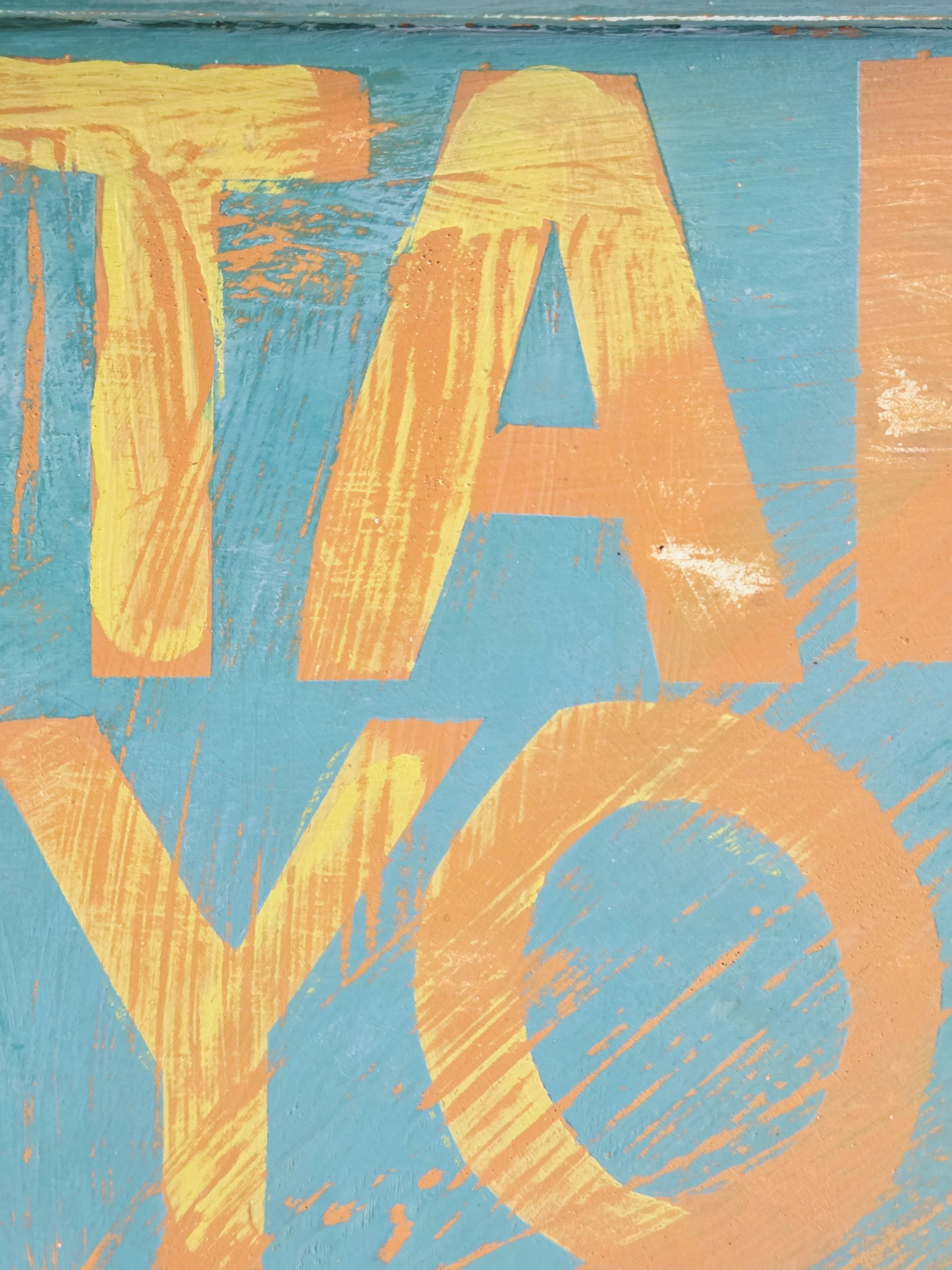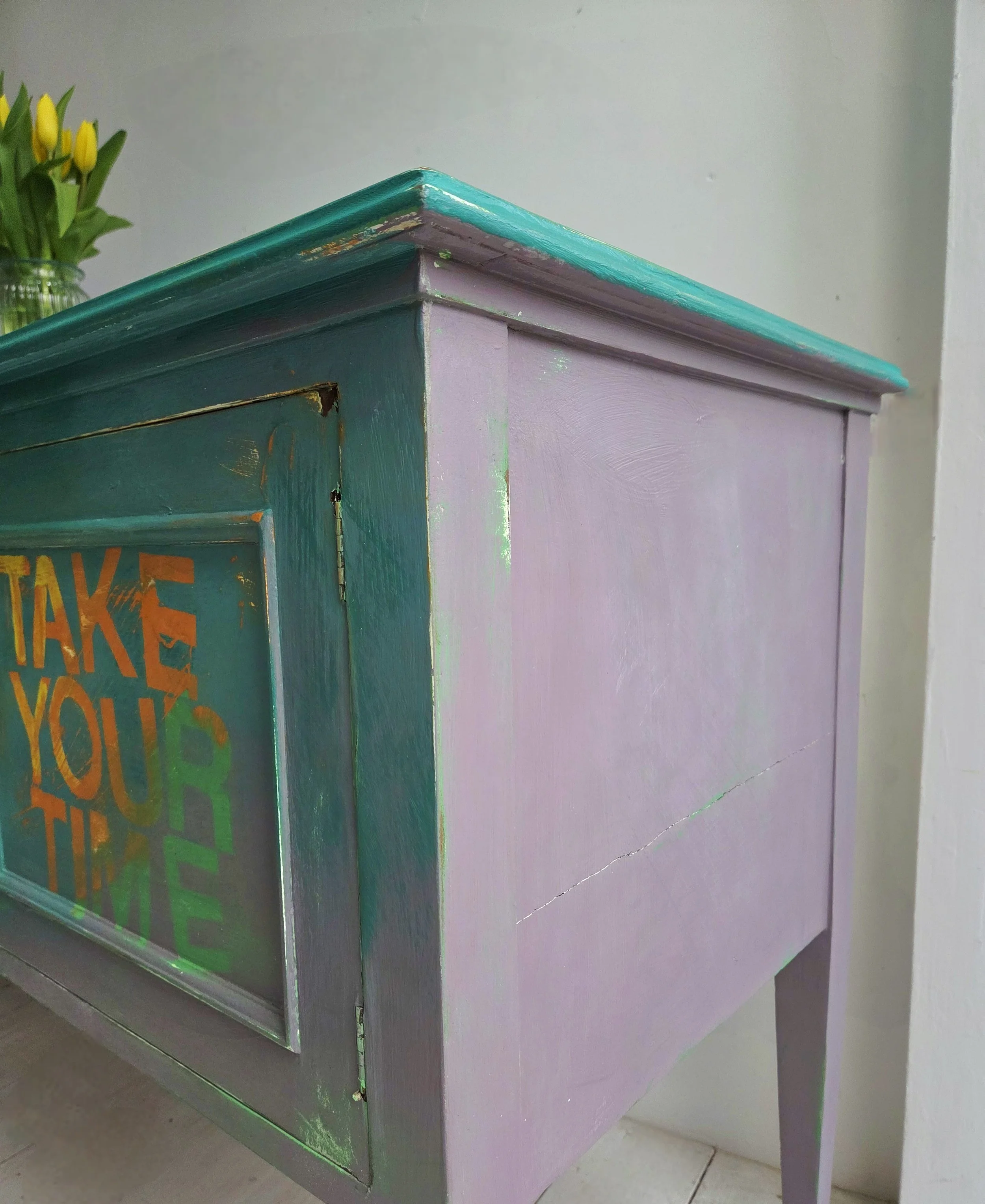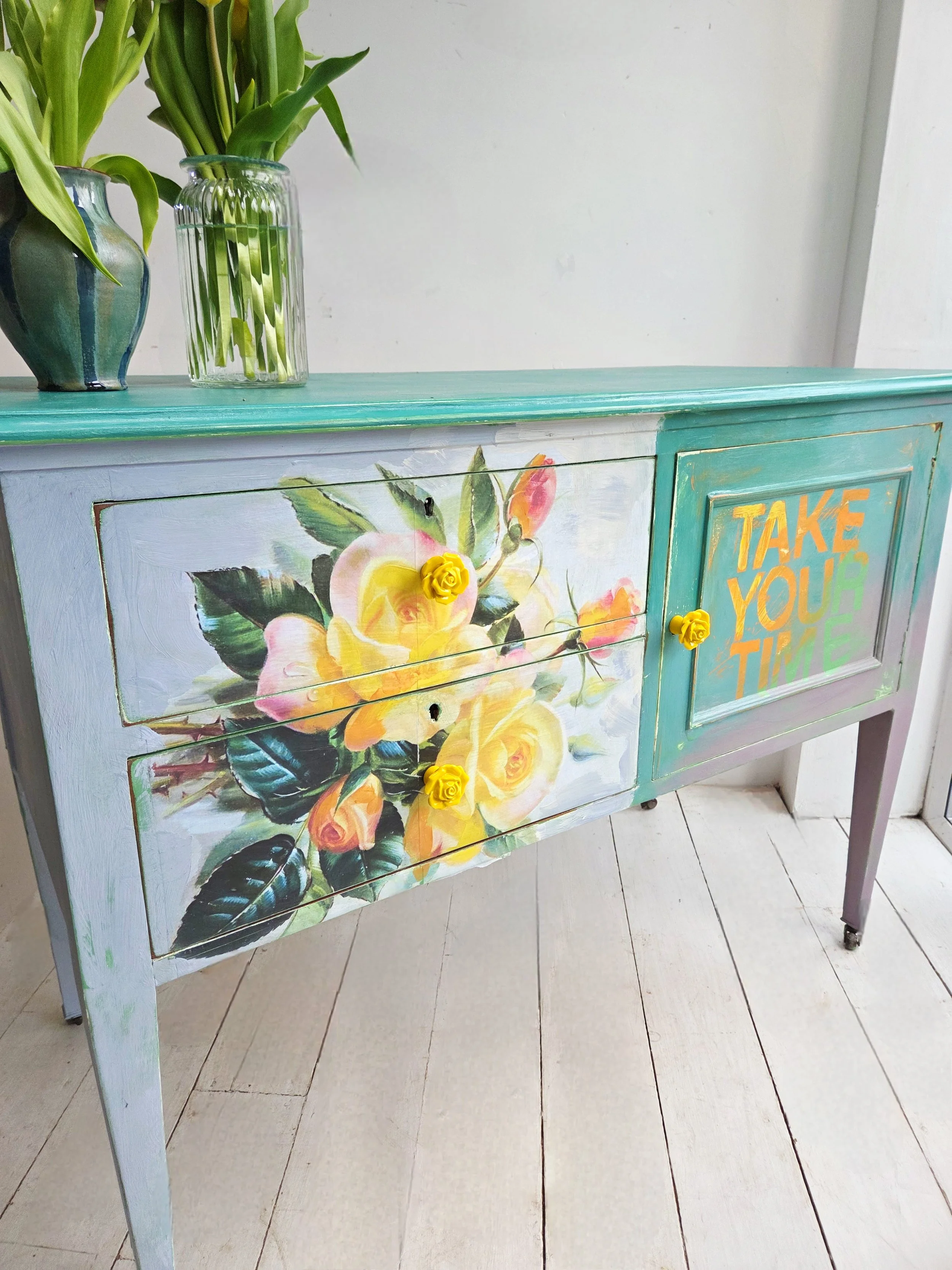 The decoupage has been made by myself and has been printed in fade-resistant ink designed to last up to 100 years before any fading occurs. Then painted over the top to blend all of the components together. The text reads, in the colours of the undercoat ‘take your time’.