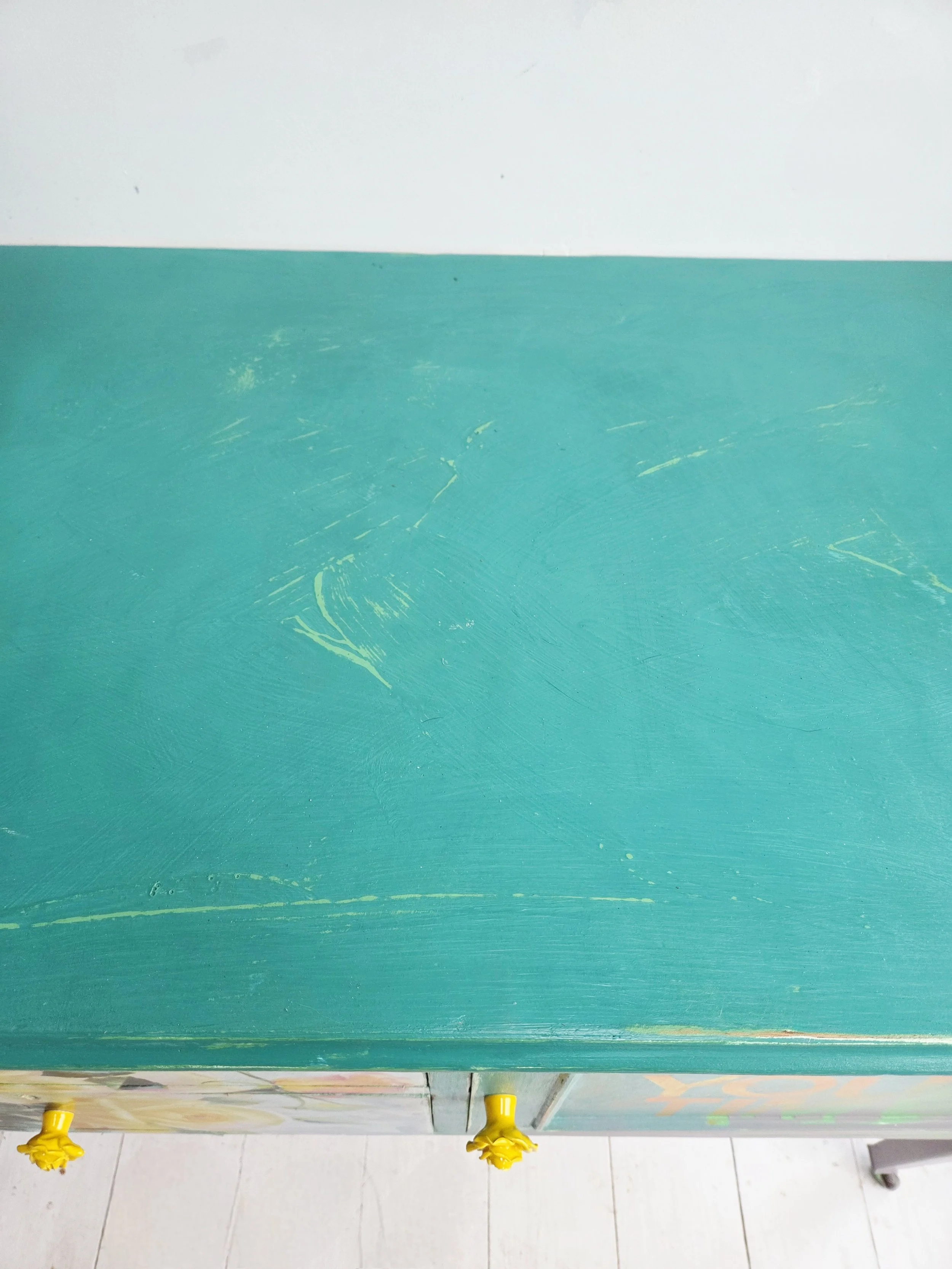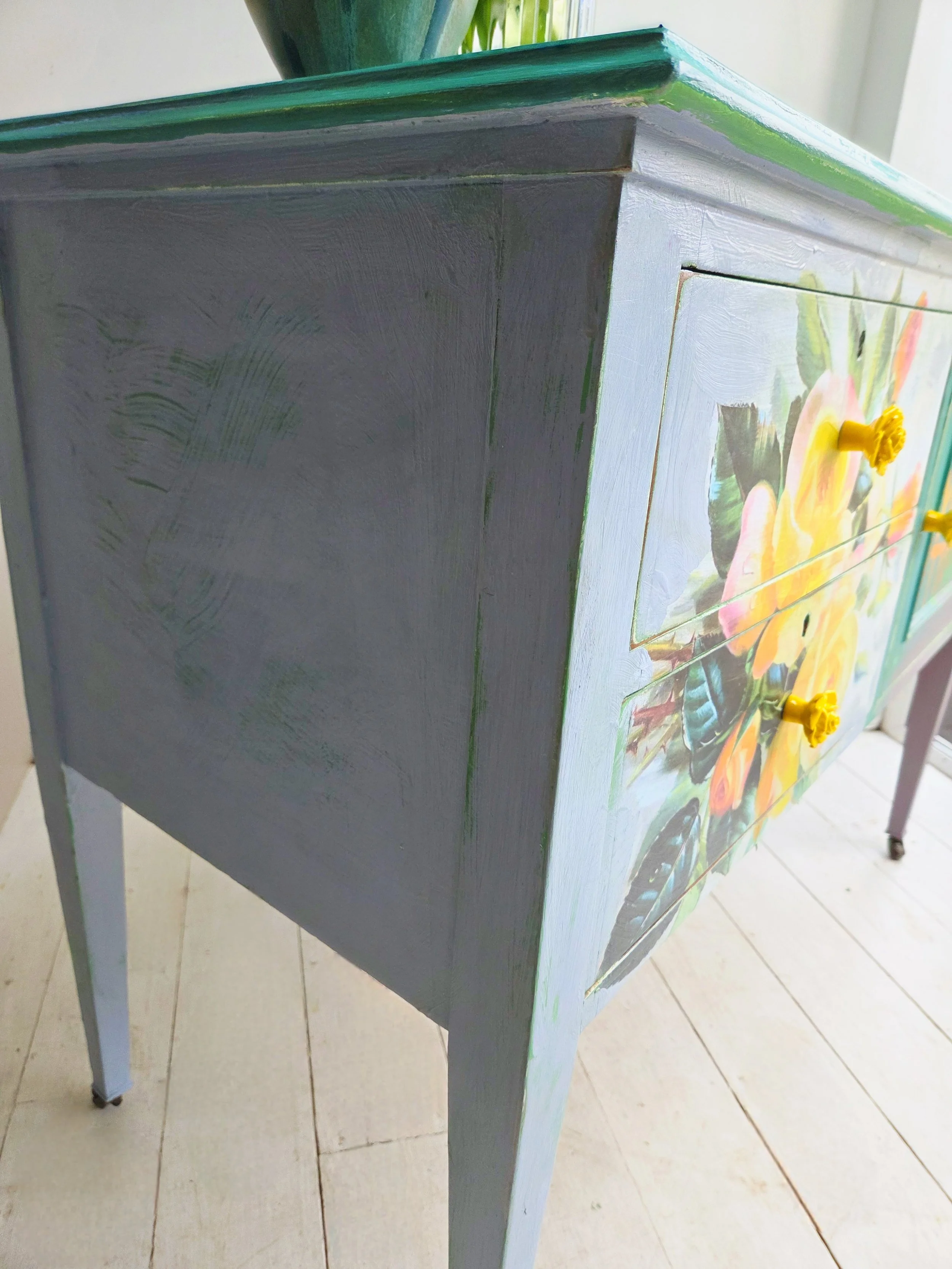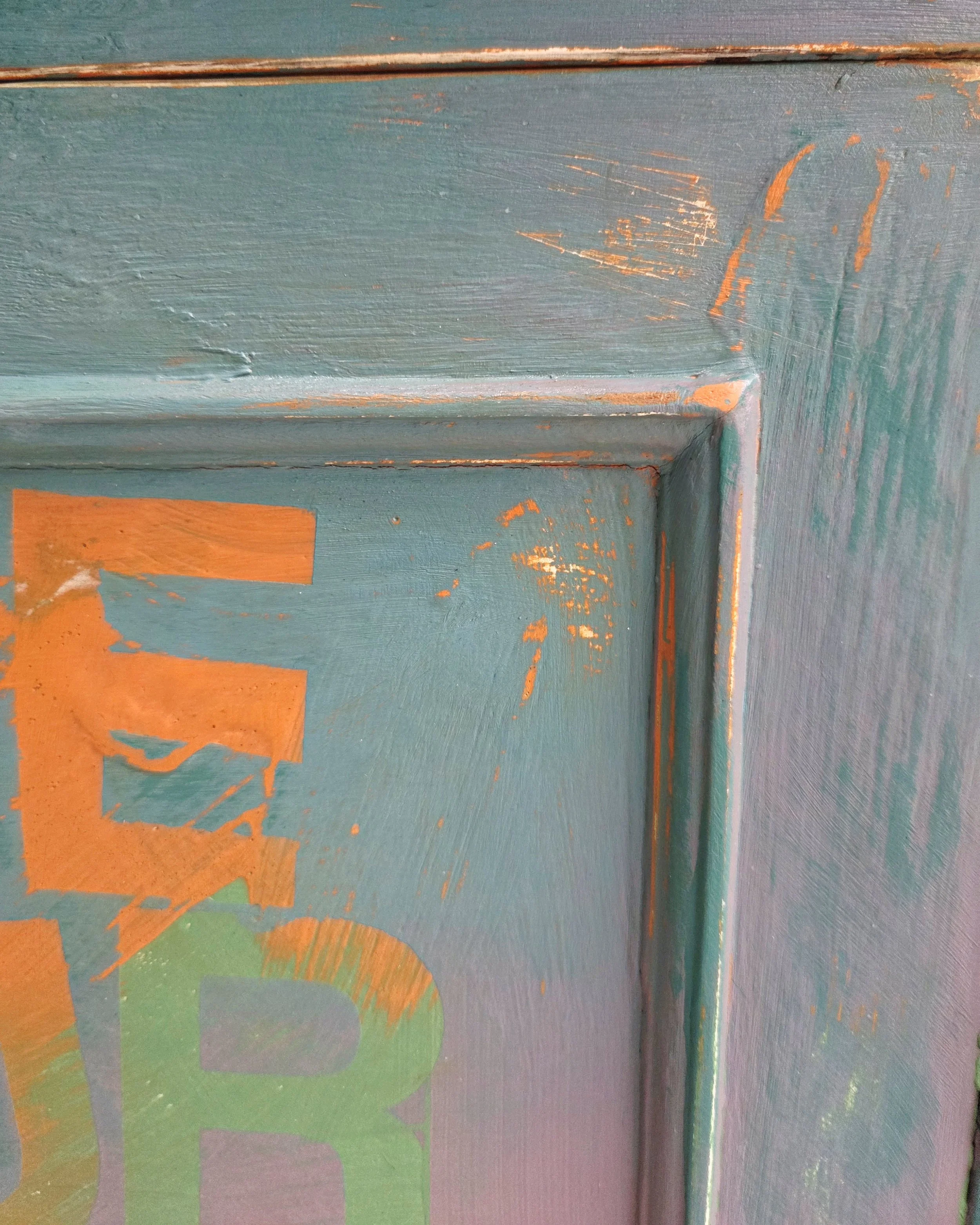 Distressed all over to reveal glimpses of the undercoat and back to wood in some areas to age it. I paint thickly, with texture to create the feel of a genuinely aged bohemian piece that retains the spirit of the furniture.