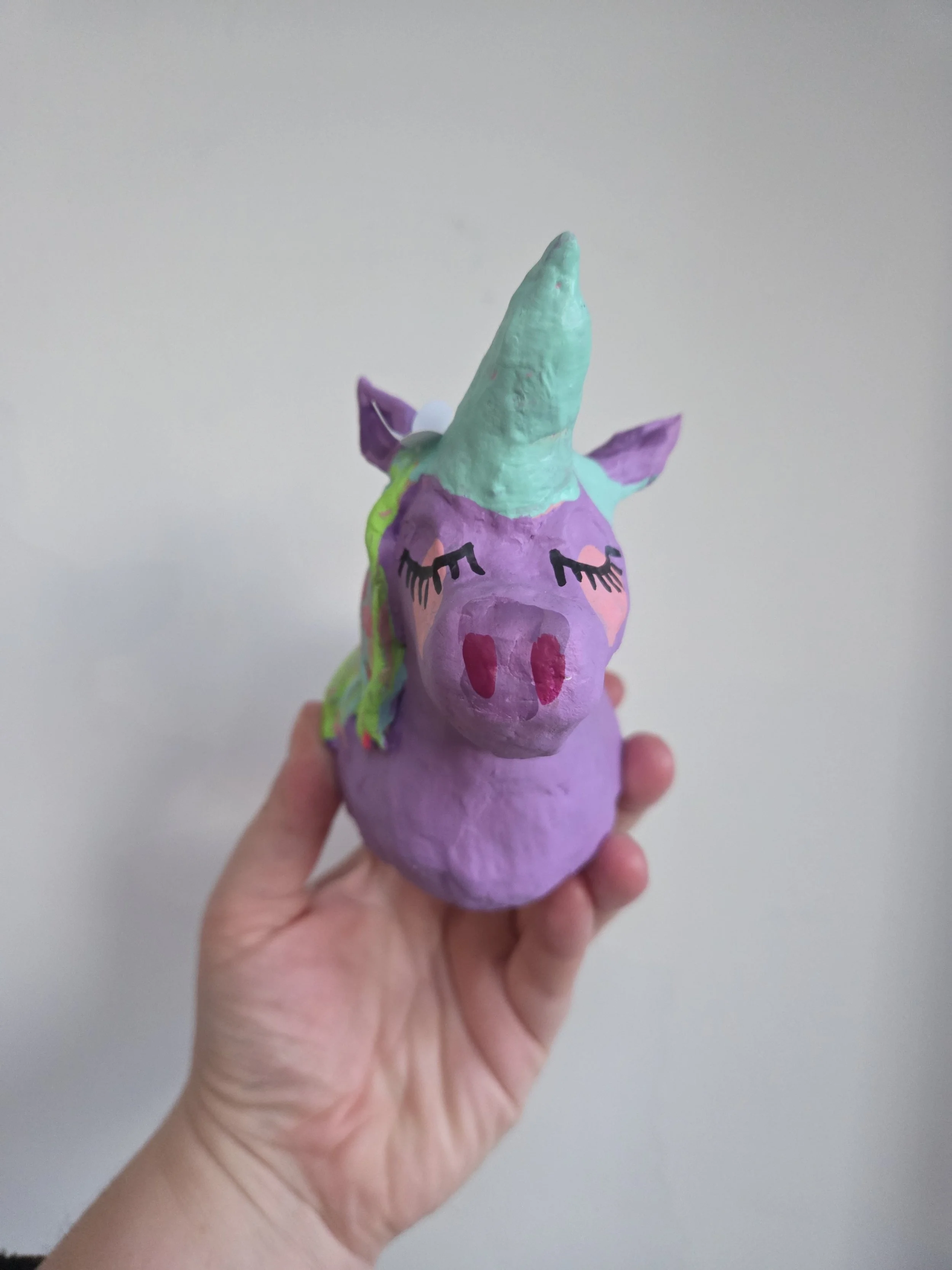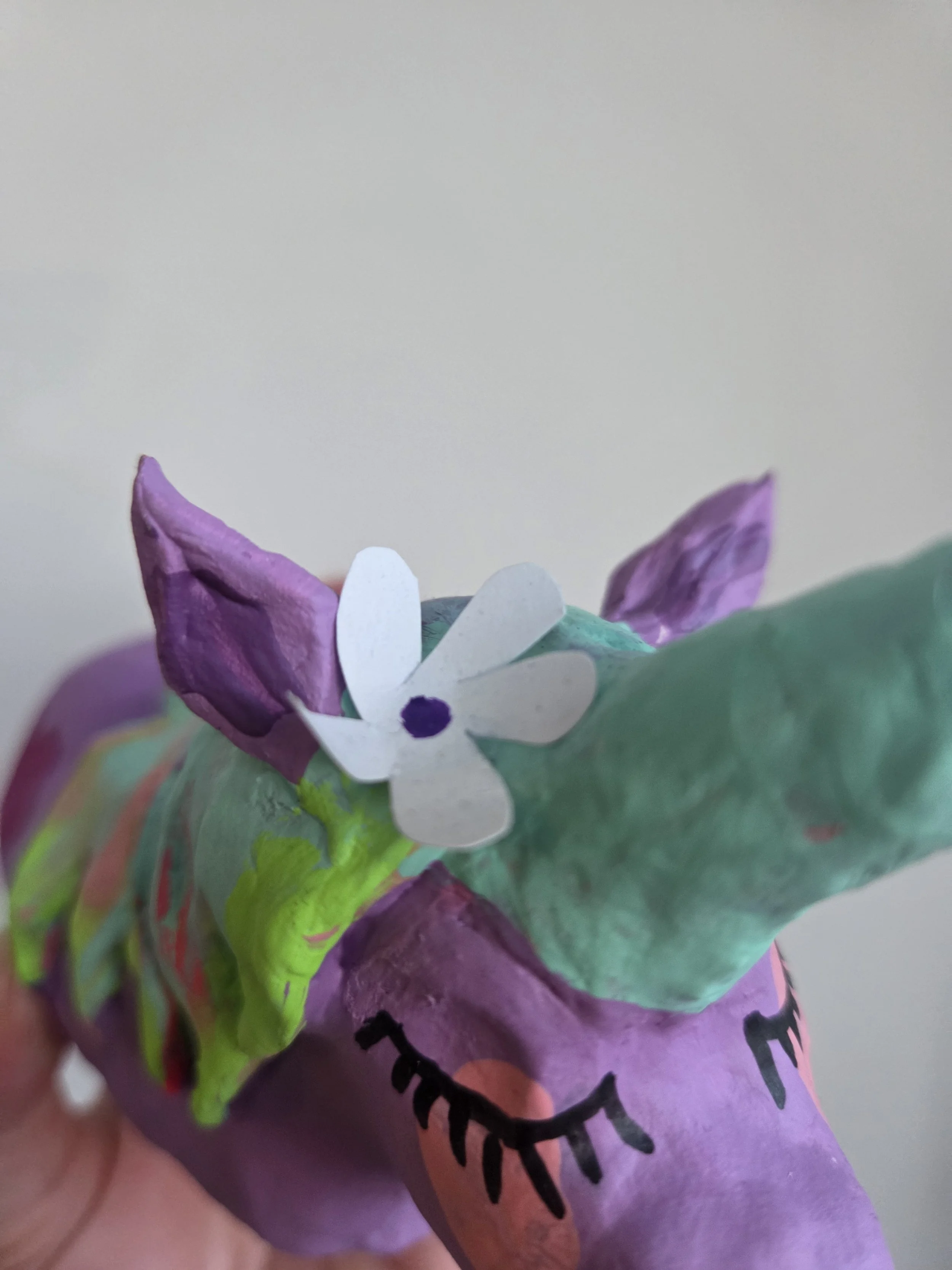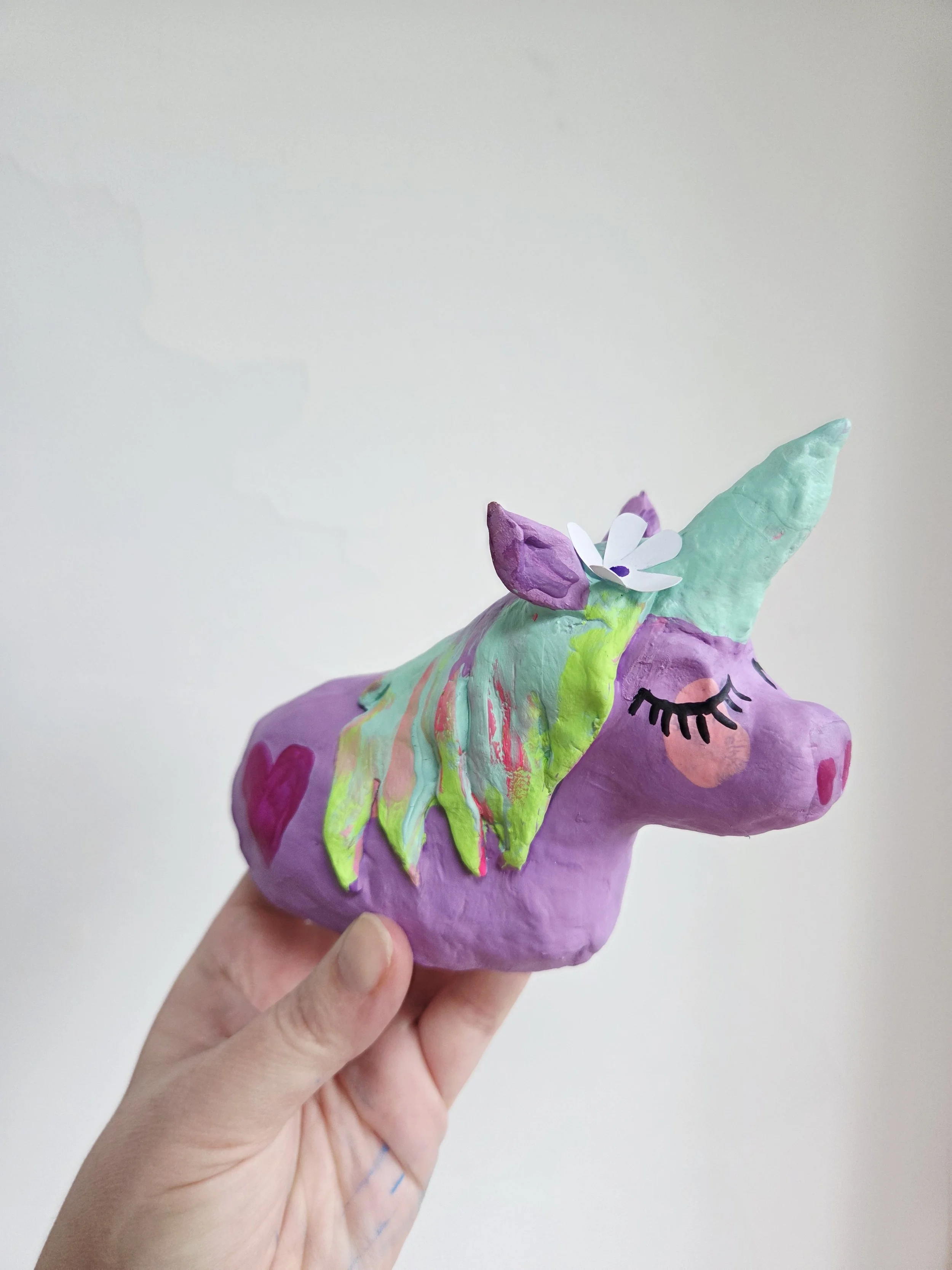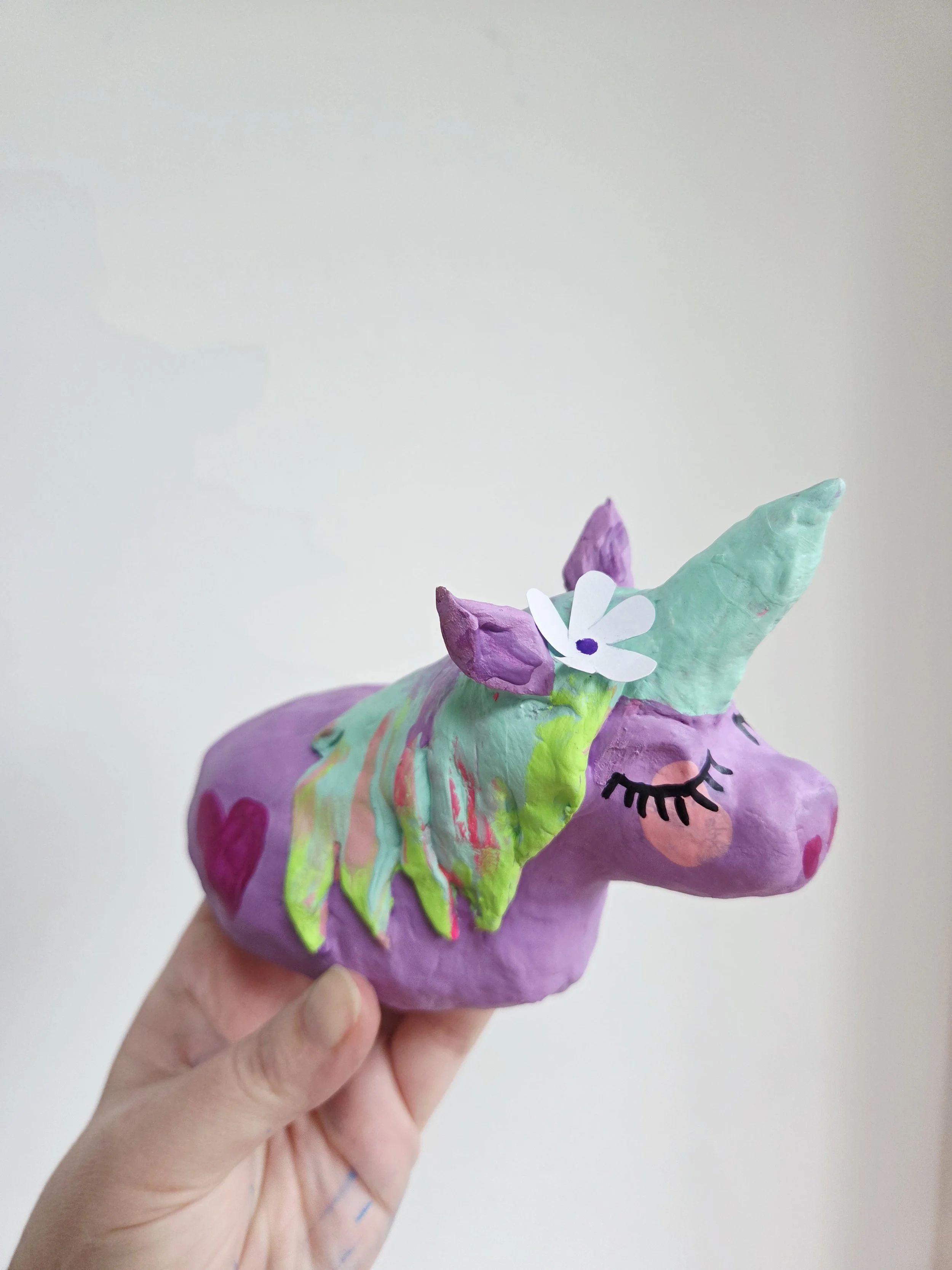 Flora is a little unicorn made from paper mache. Hand painted and finished with a little paper flower. Sprayed with a matt lacquer. Flora is not a toy and is only meant for display purposes.