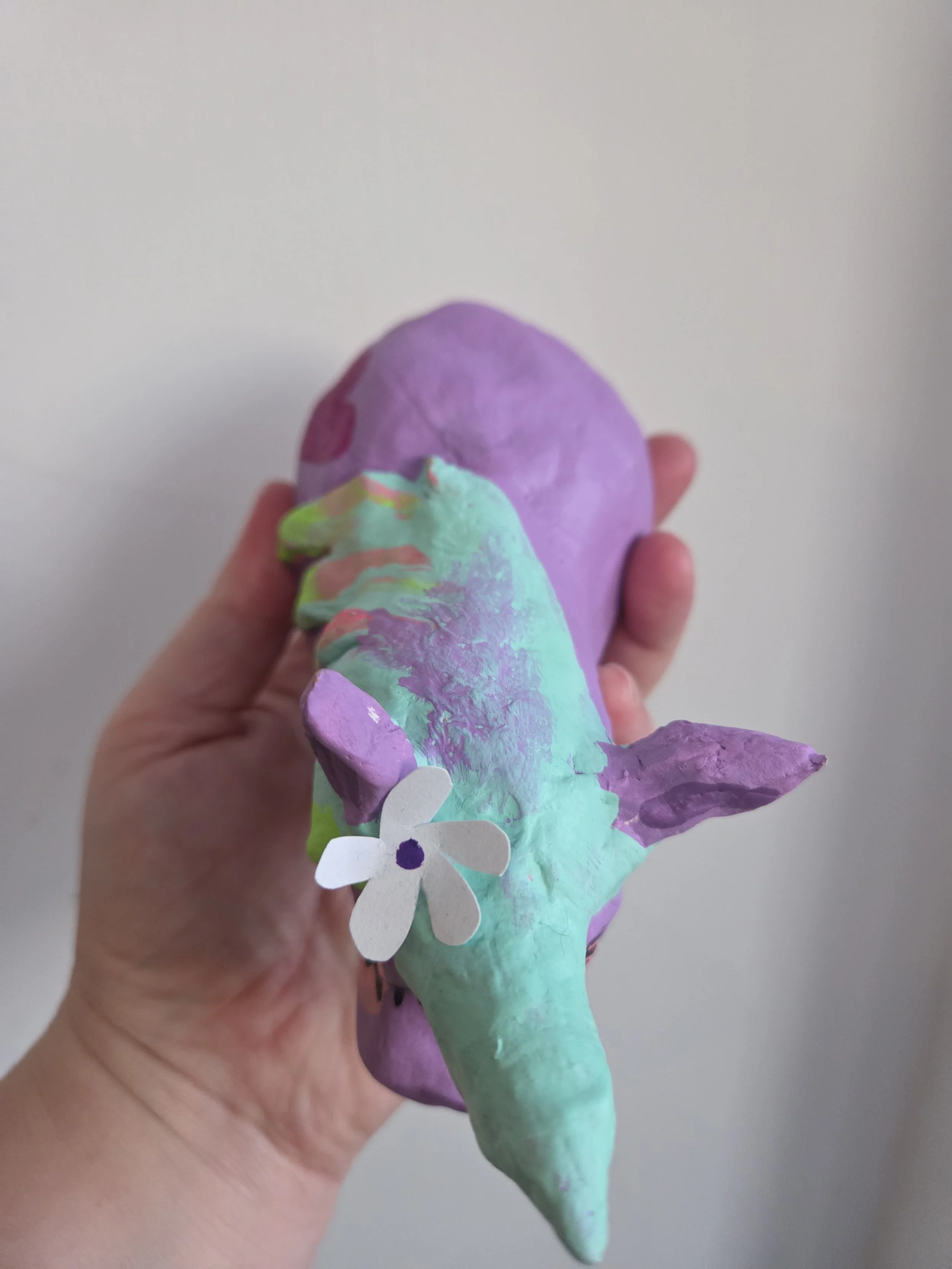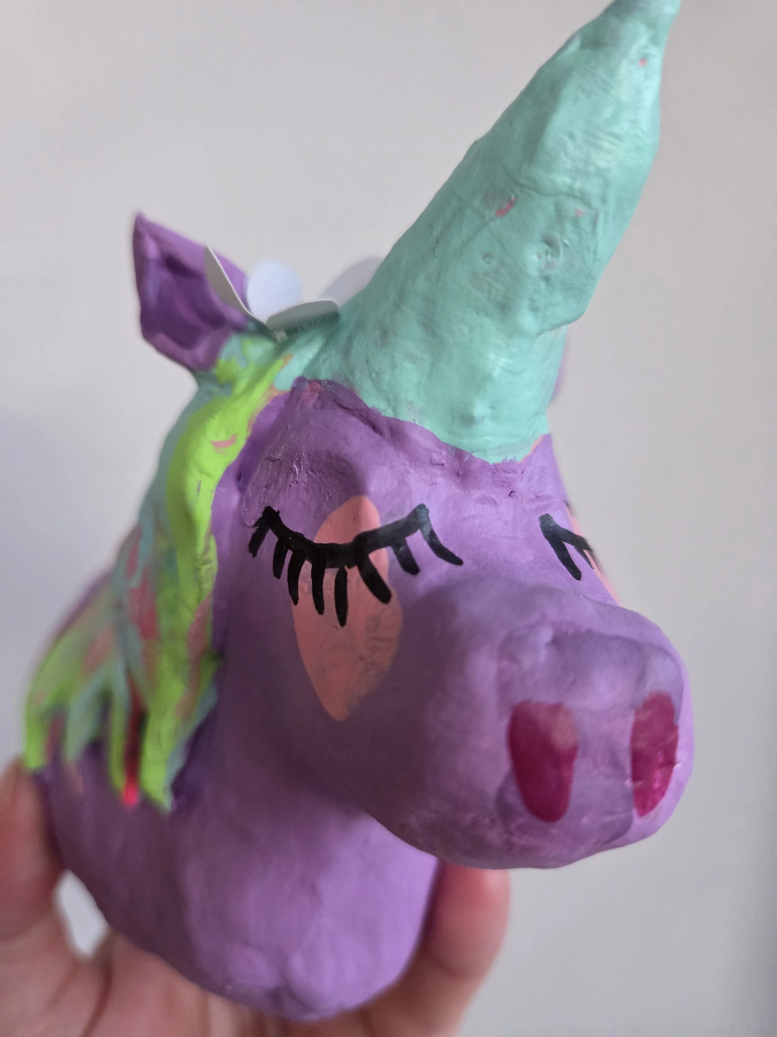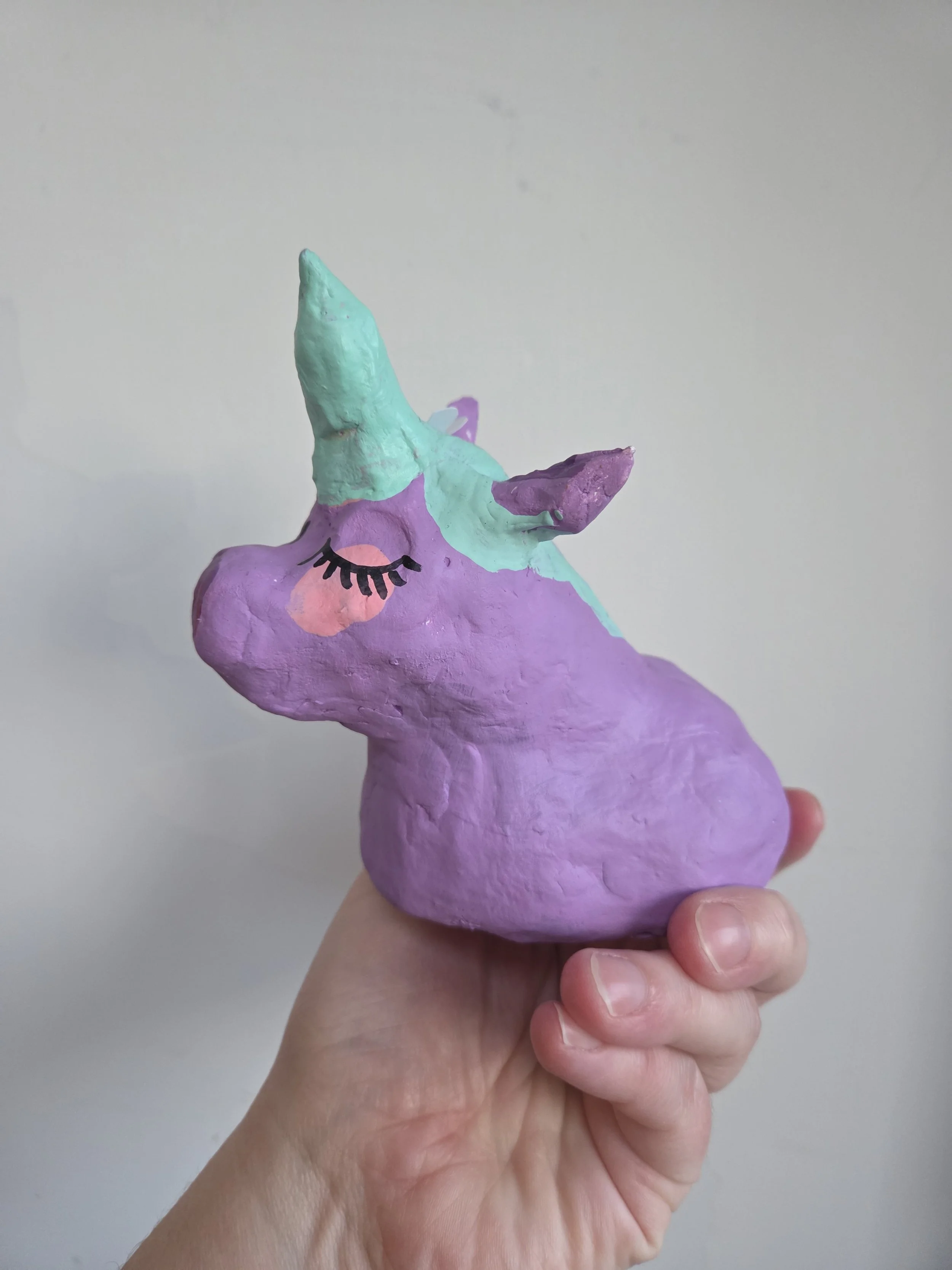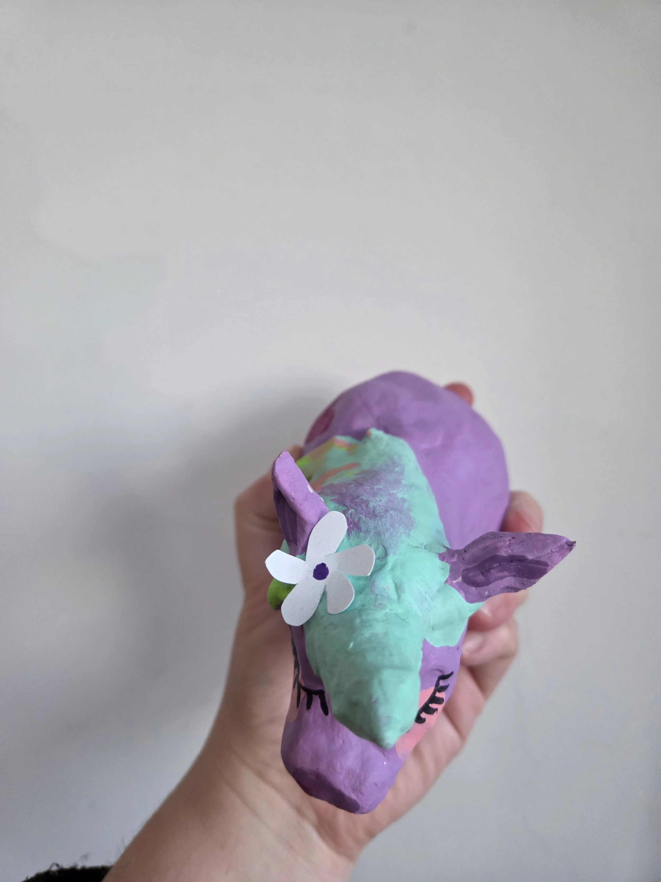 Flora is a little unicorn made from paper mache. Hand painted and finished with a little paper flower. Sprayed with a matt lacquer. Flora is not a toy and is only meant for display purposes.
