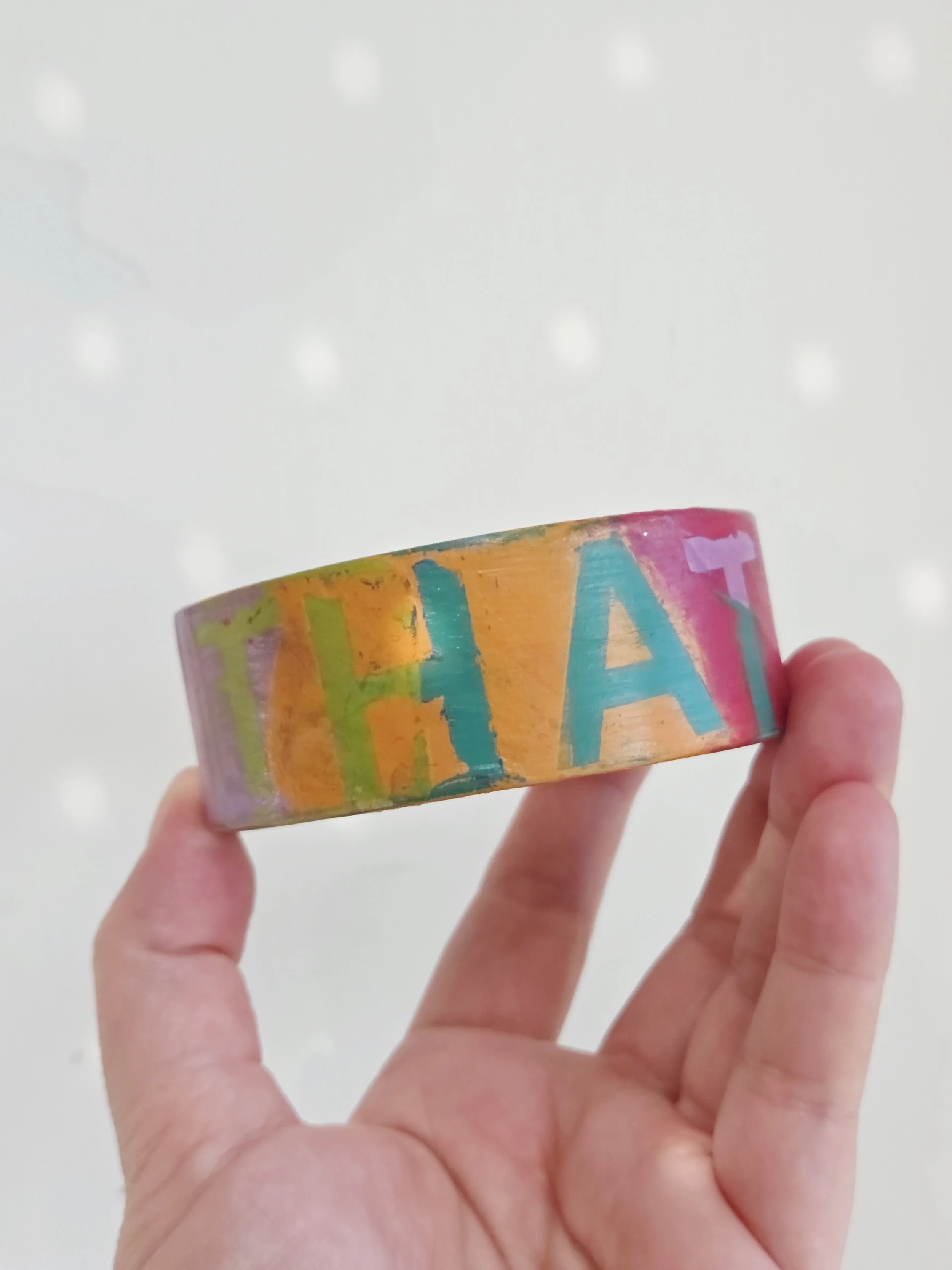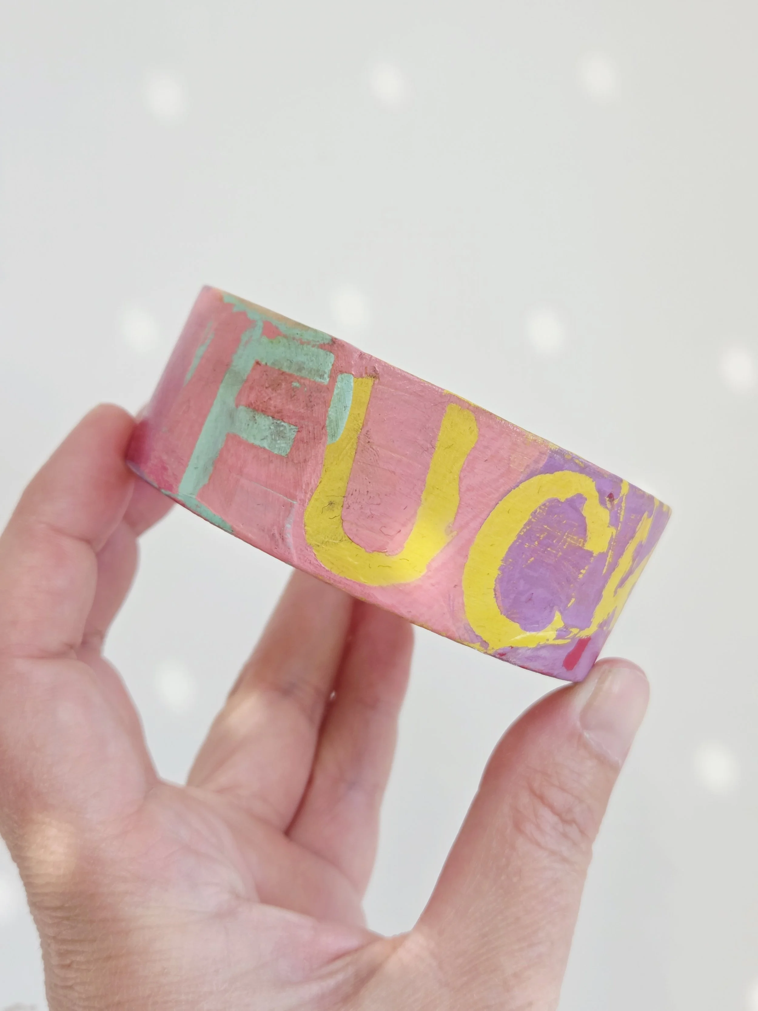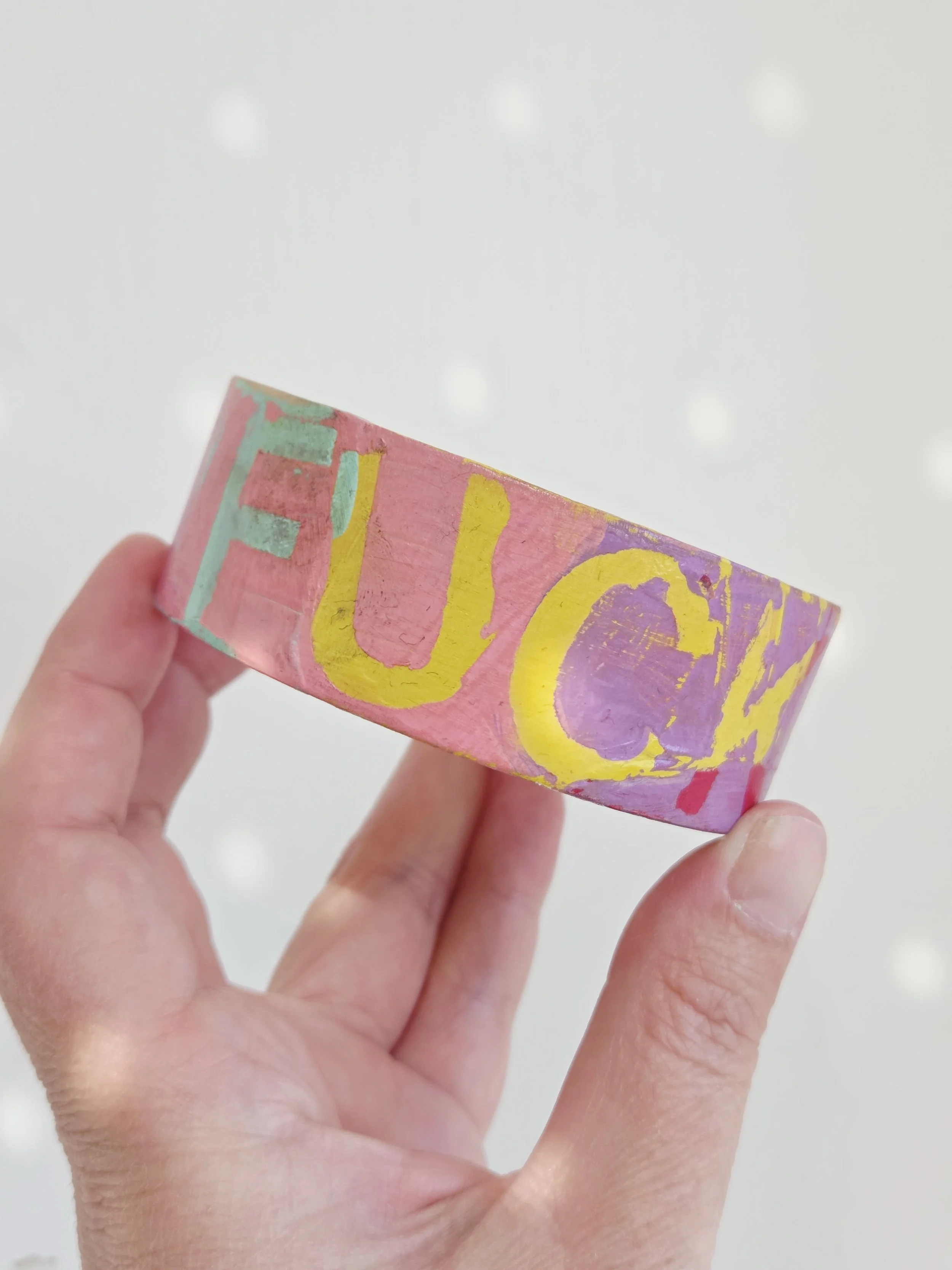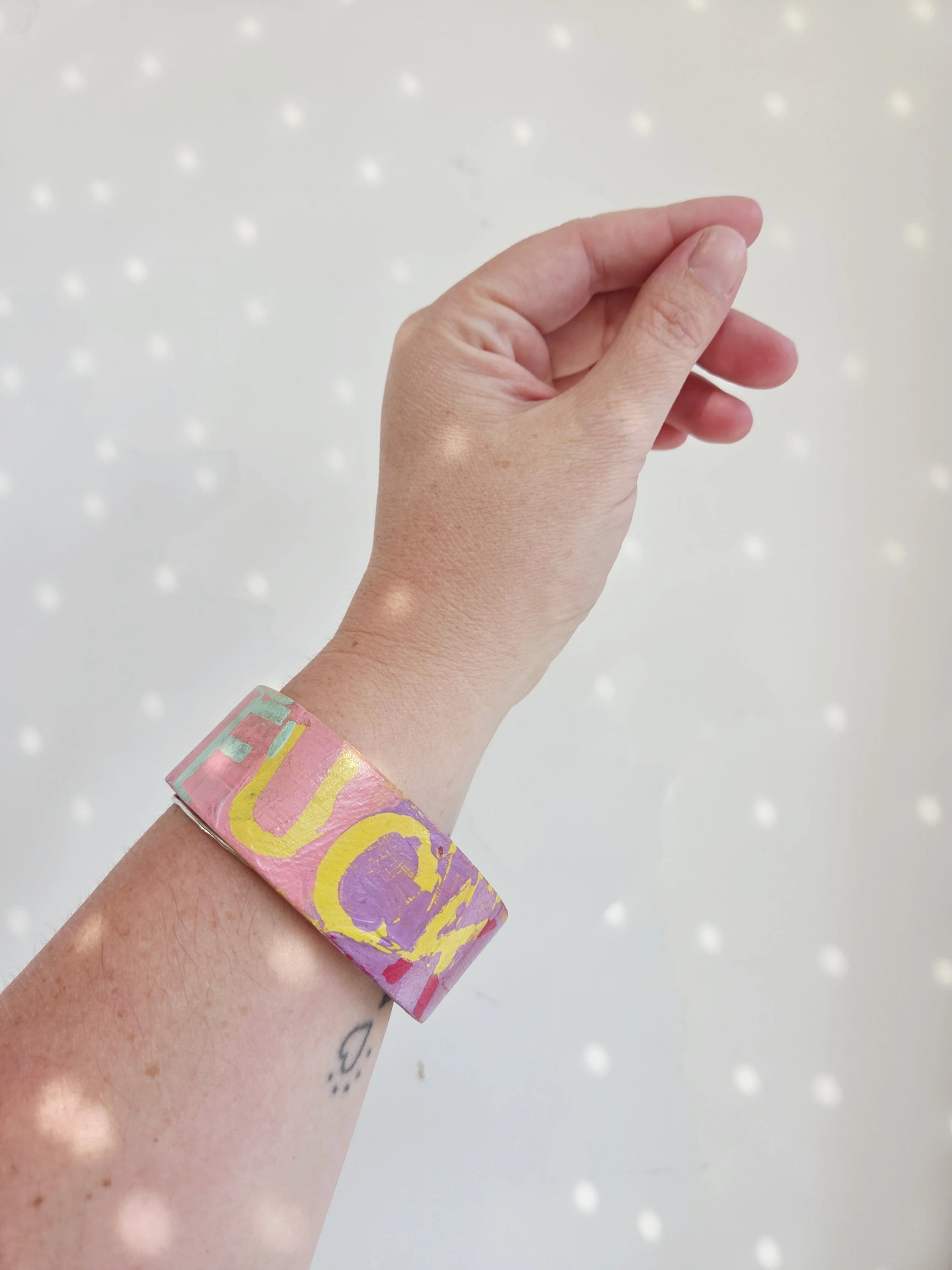 Solid pine bangle painted in rainbow colours and sweary phrases, distressed and varnished with a water-based varnish. These are decorative items and are not waterproof.