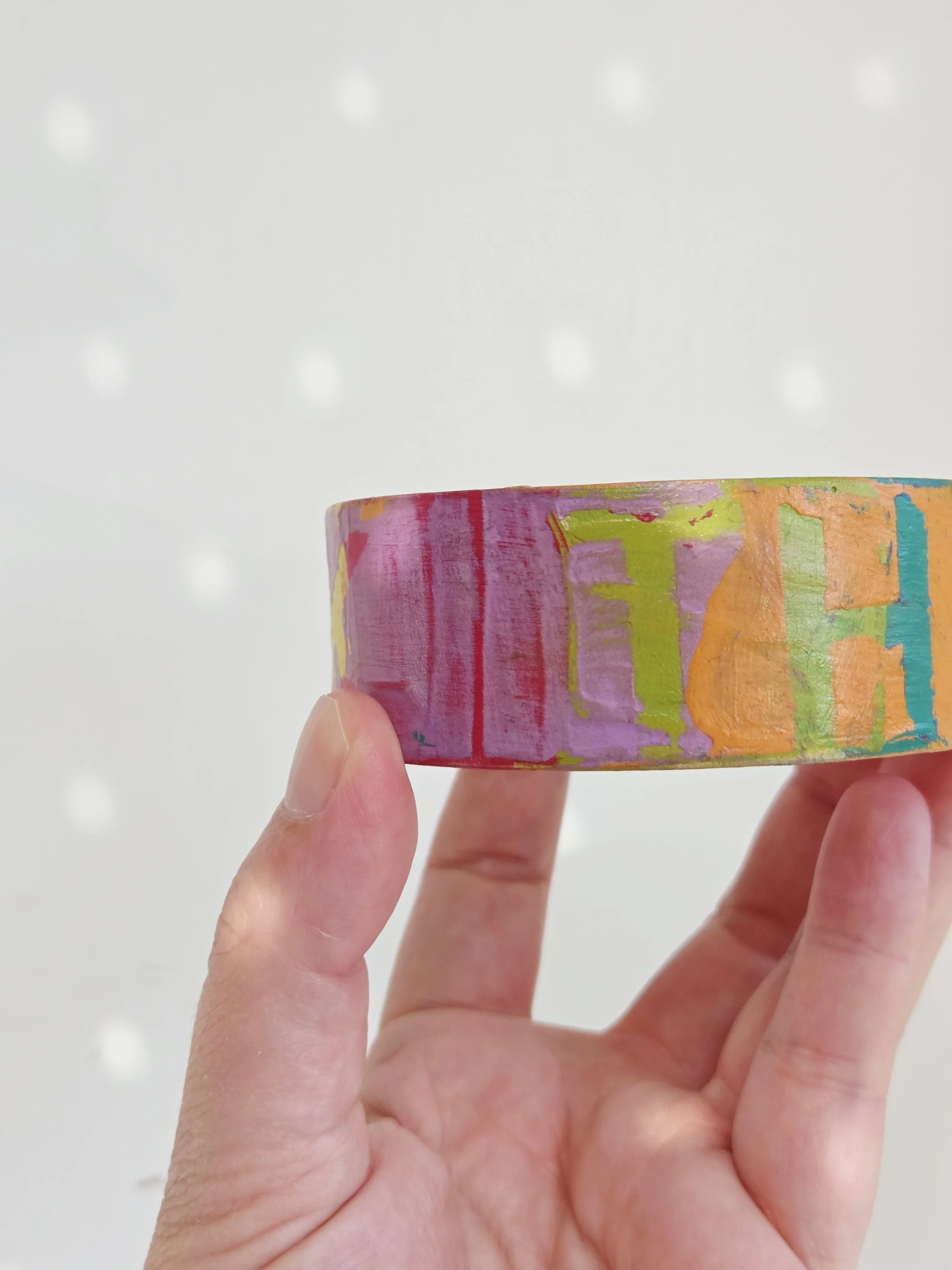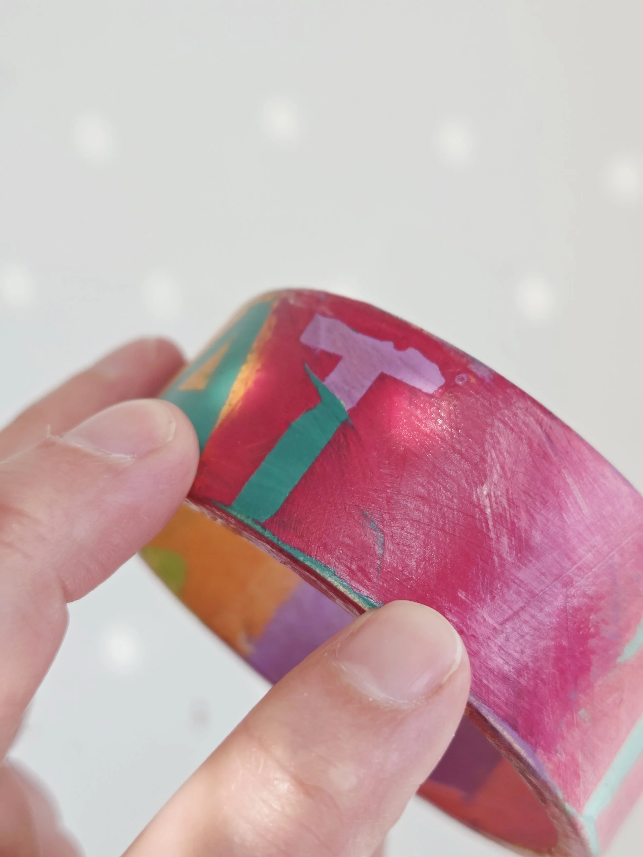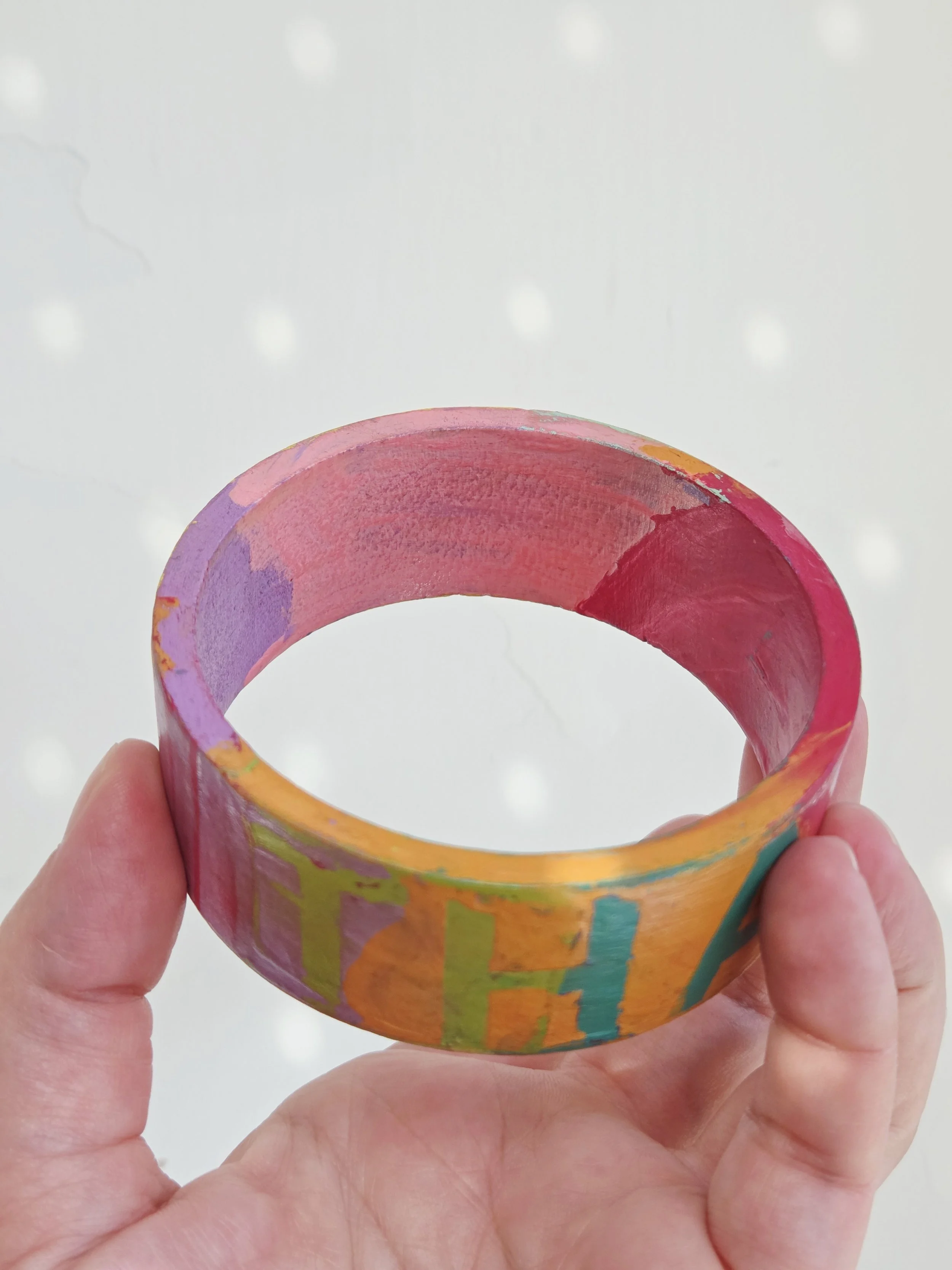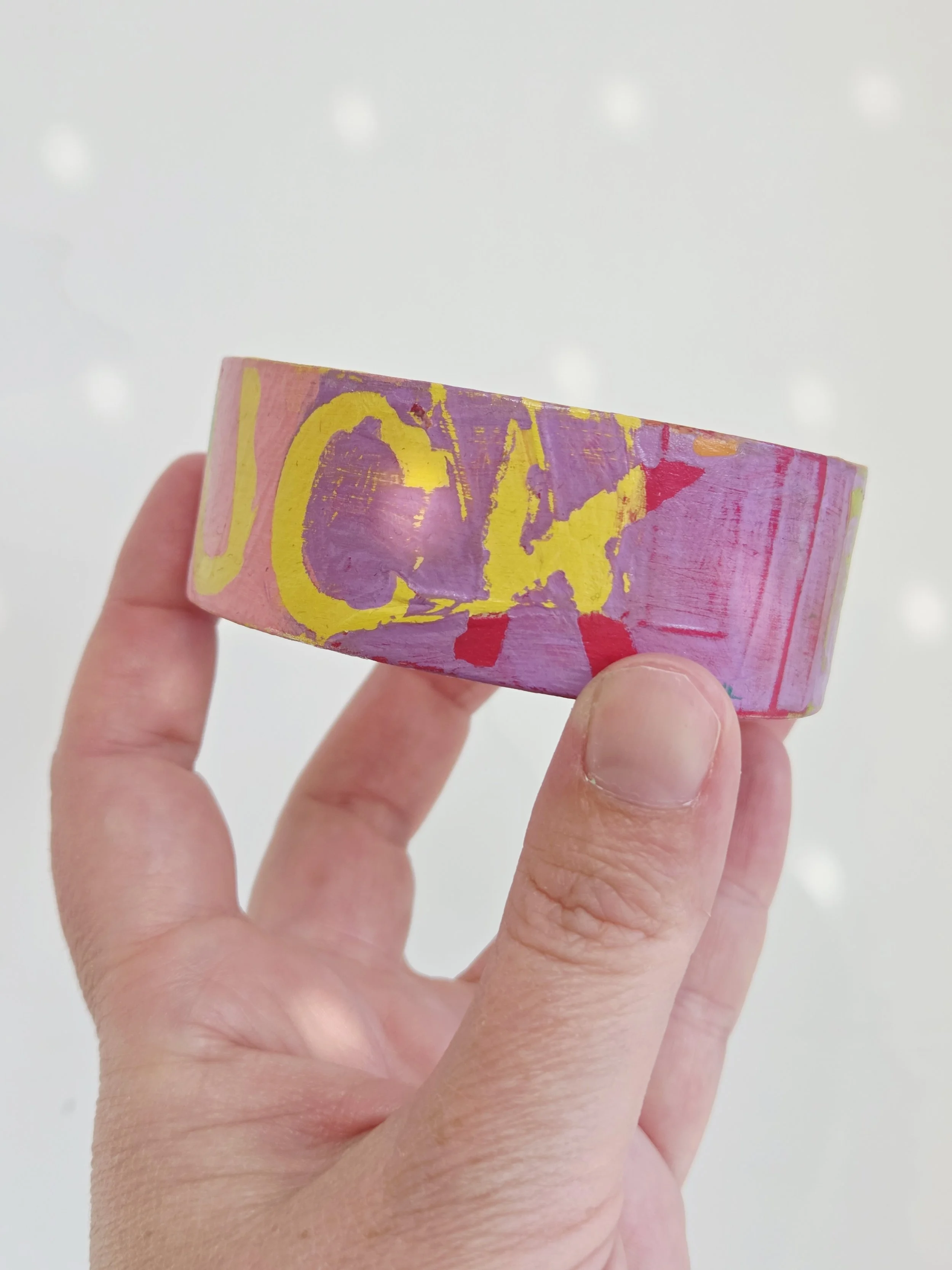 Solid pine bangle painted in rainbow colours and sweary phrases, distressed and varnished with a water-based varnish. These are decorative items and are not waterproof.
