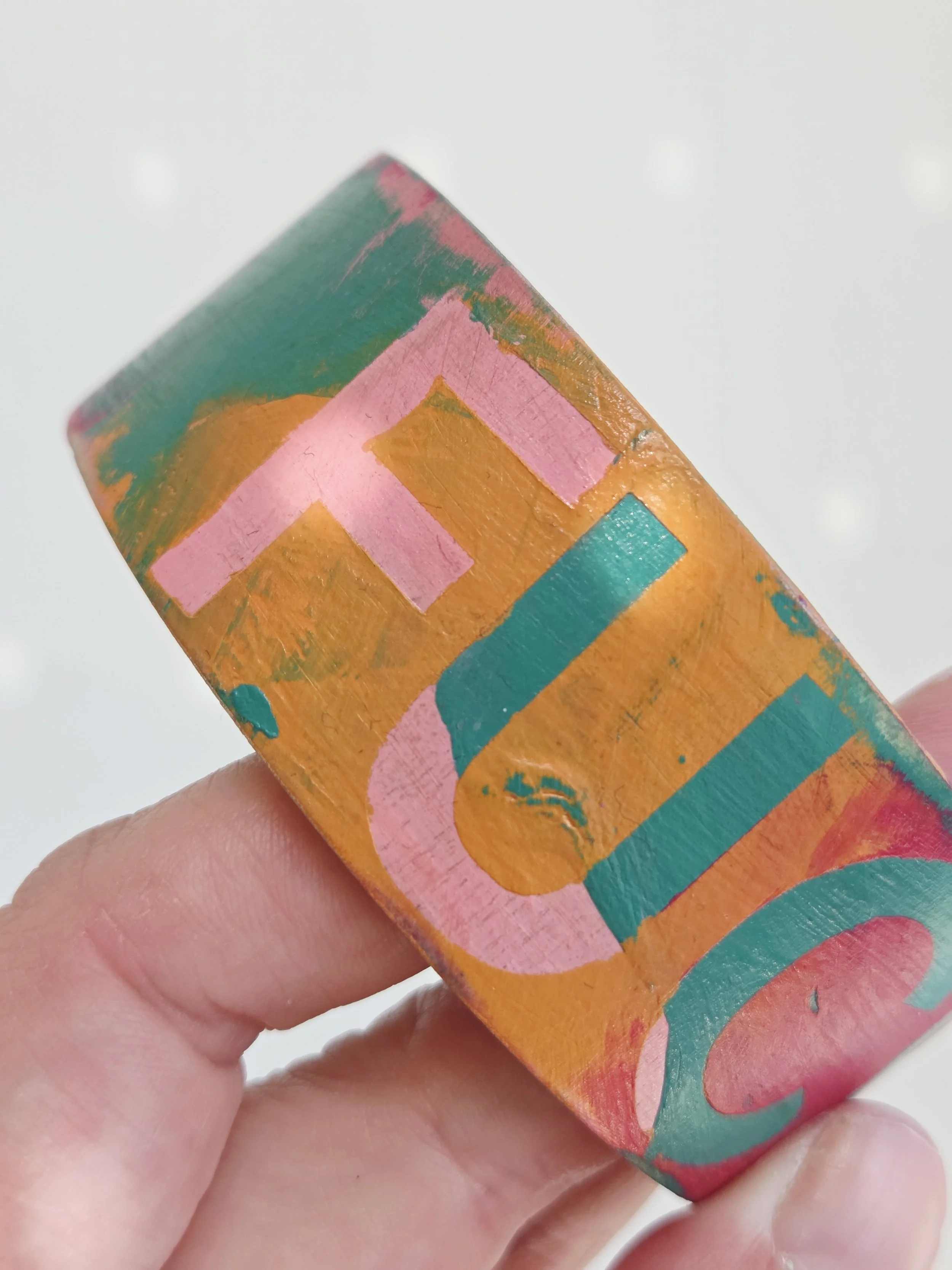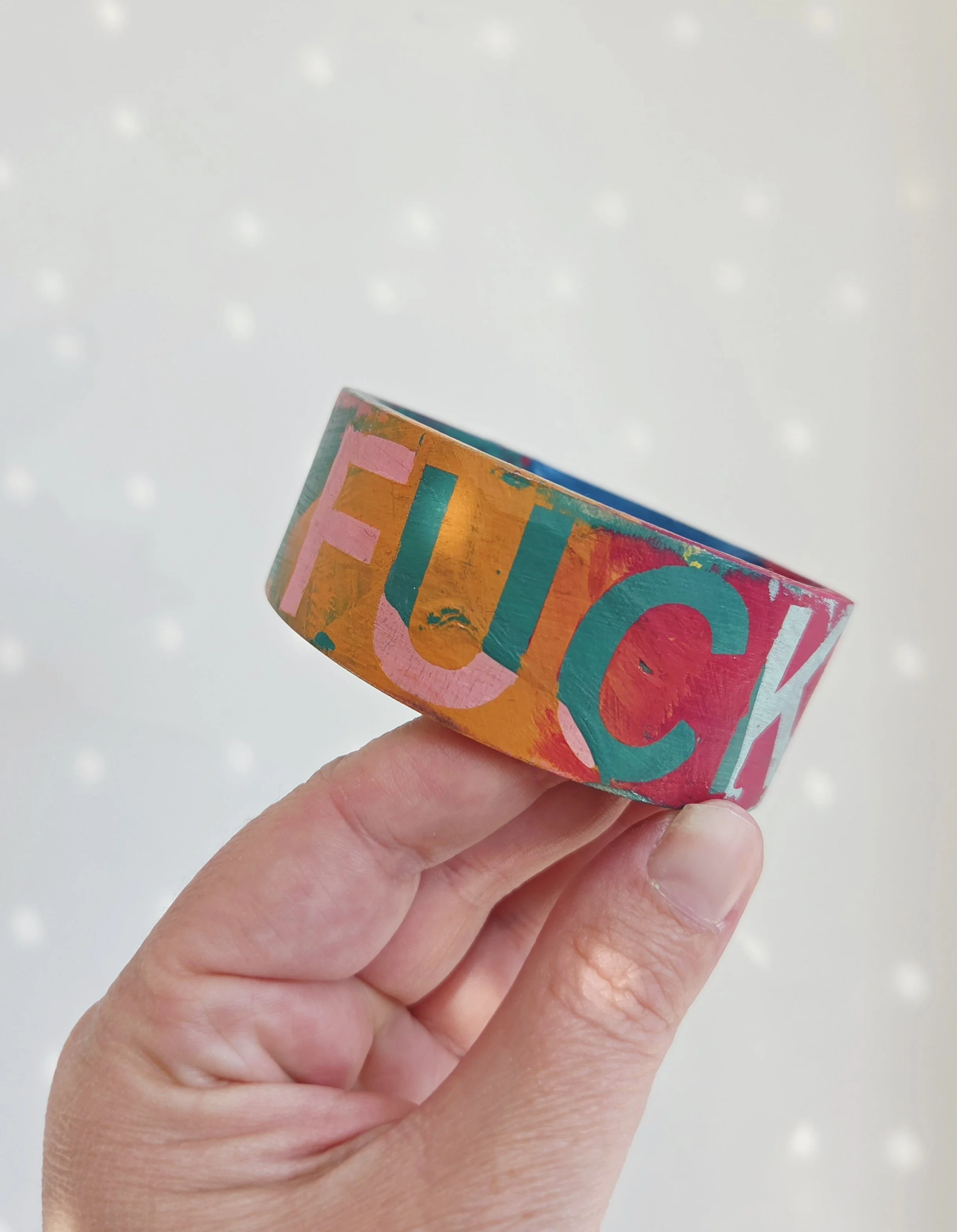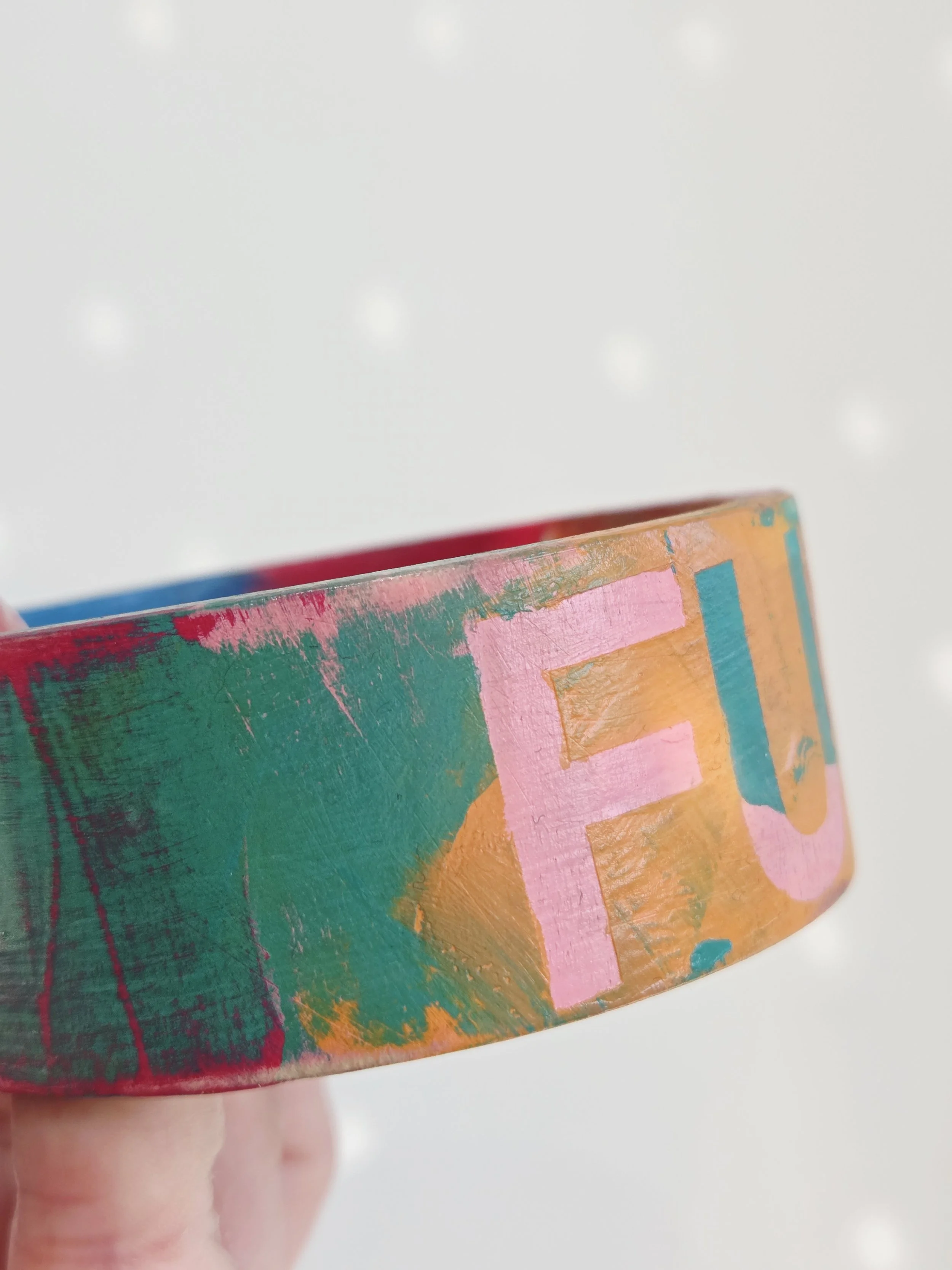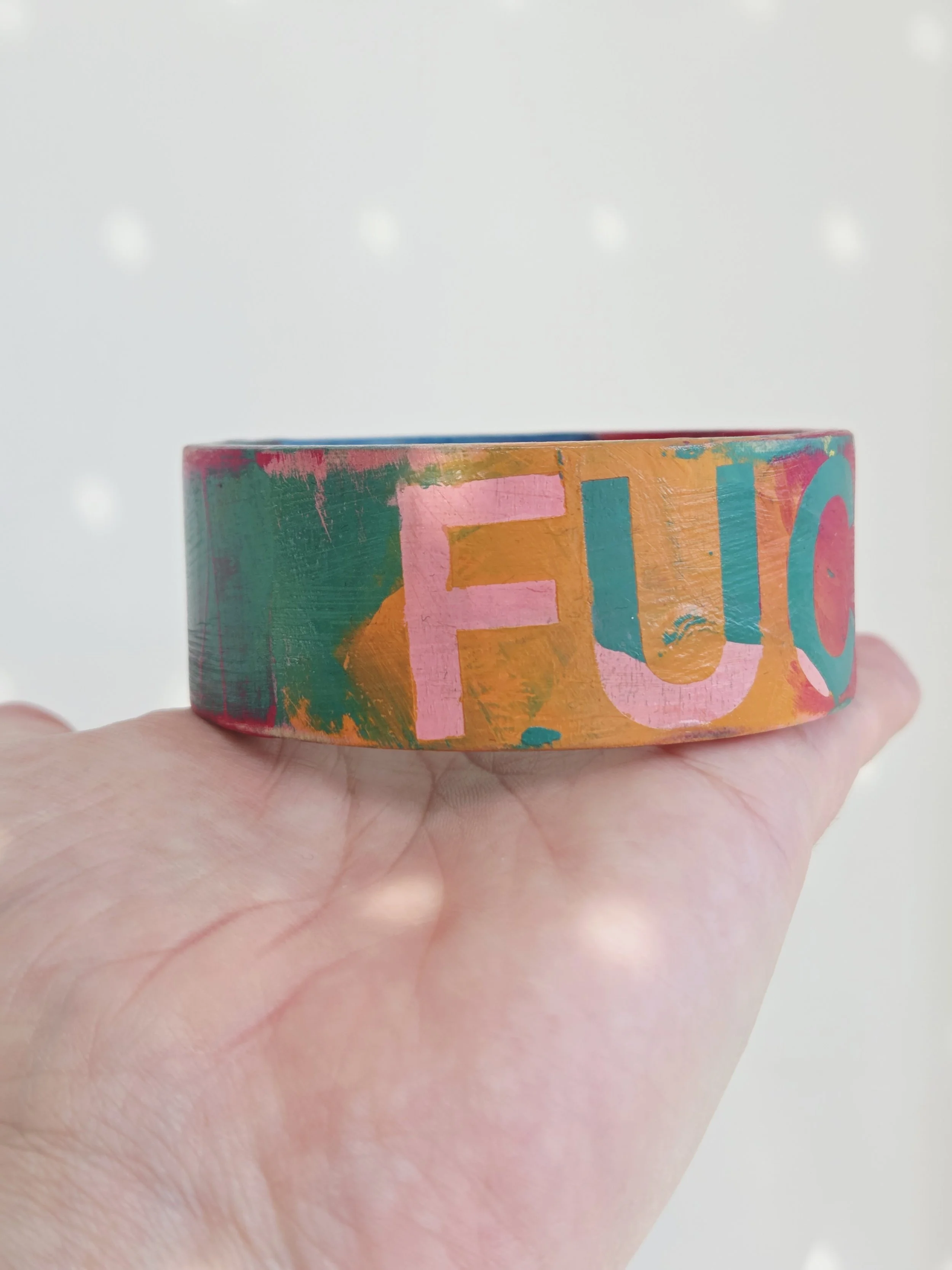 Solid pine bangle painted in rainbow colours and sweary phrases, distressed and varnished with a water-based varnish. These are decorative items and are not waterproof.