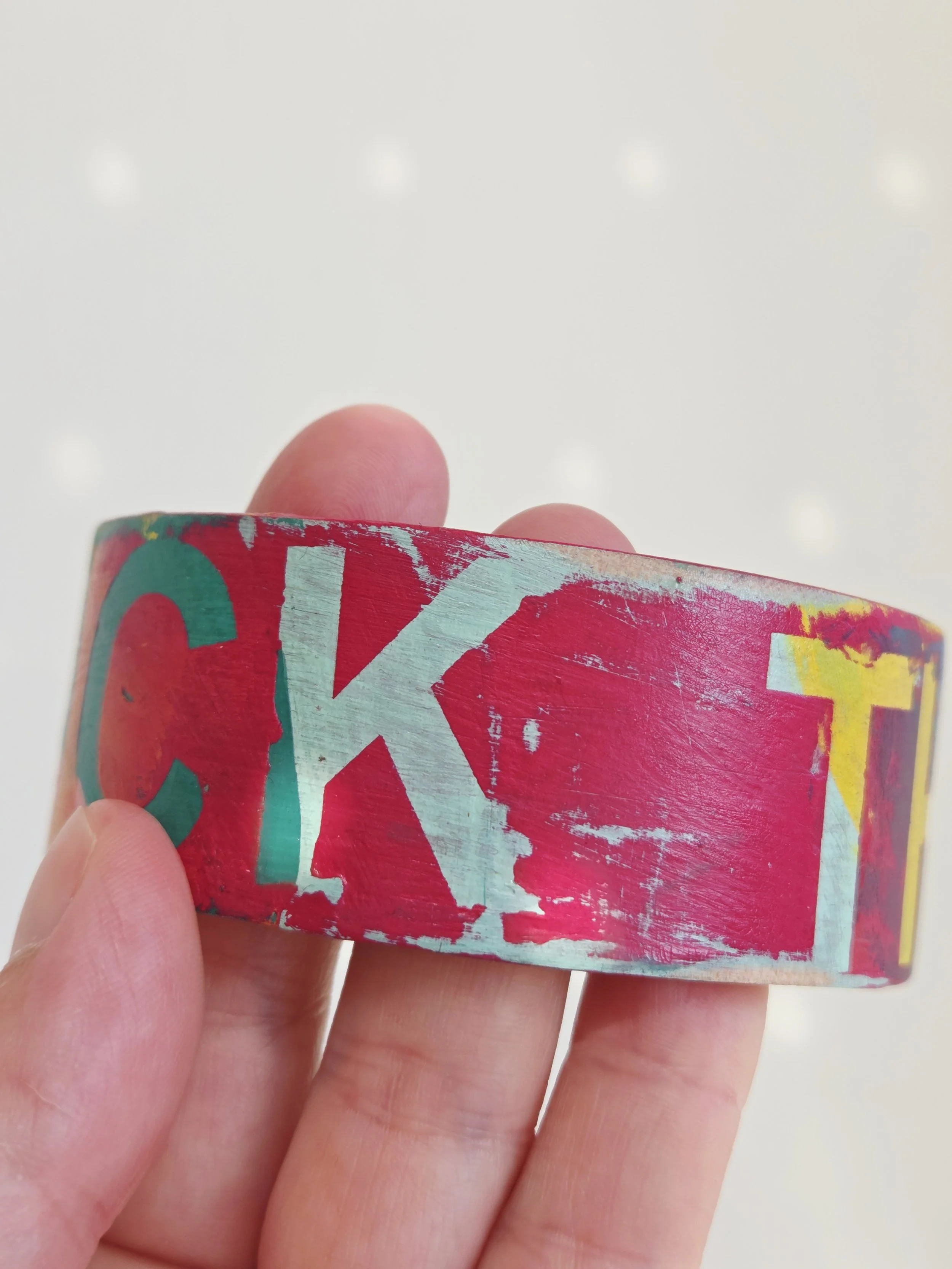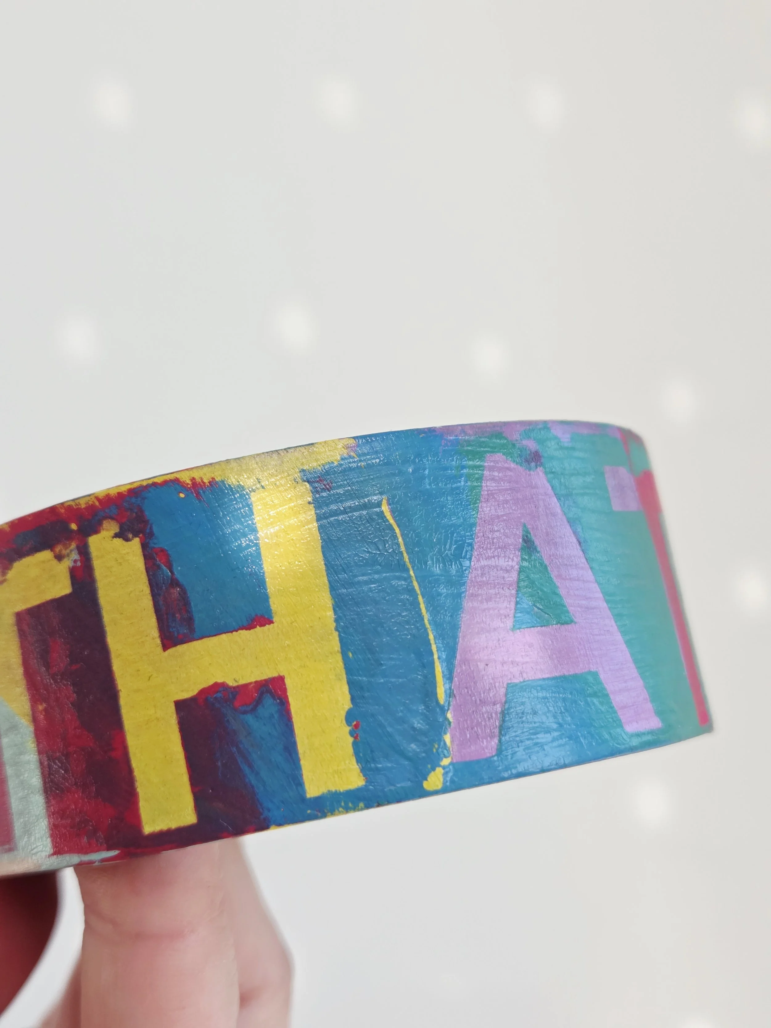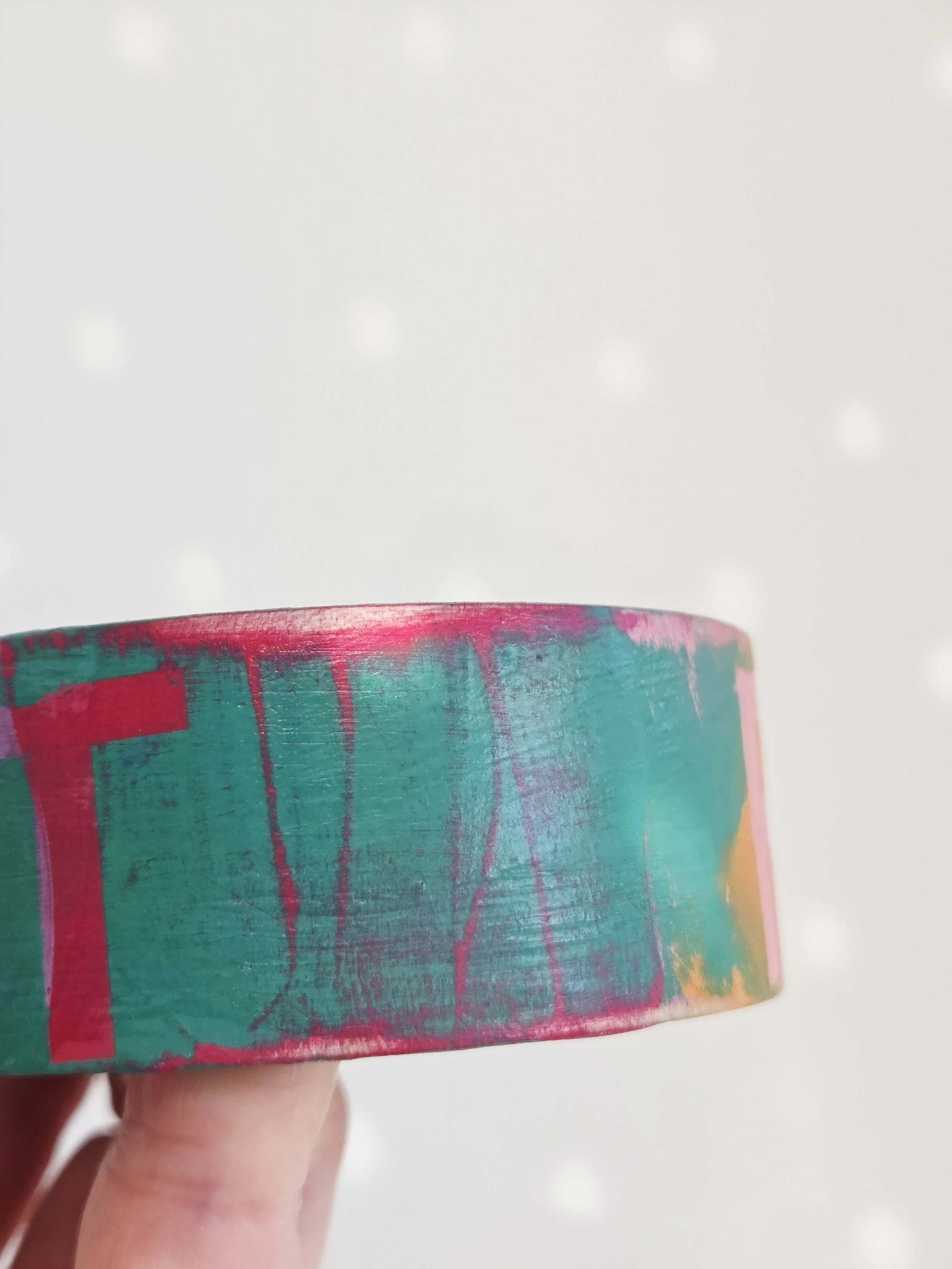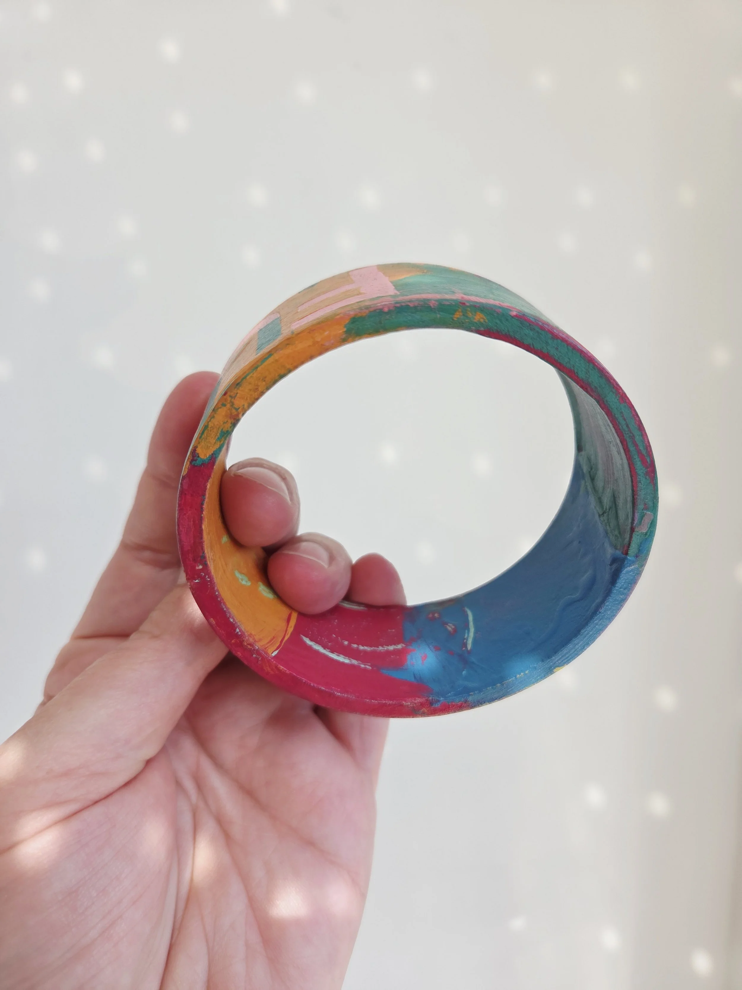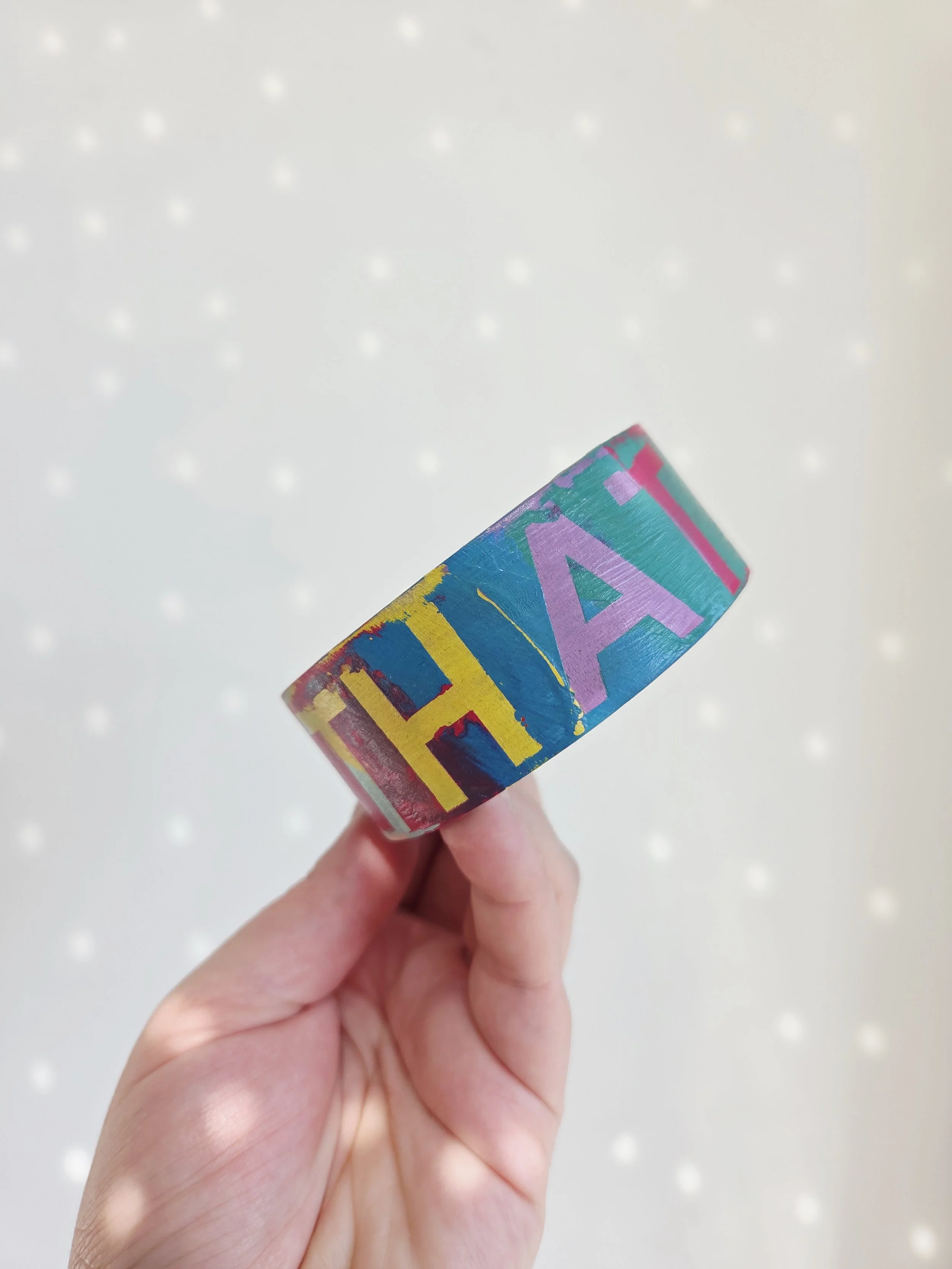 Solid pine bangle painted in rainbow colours and sweary phrases, distressed and varnished with a water-based varnish. These are decorative items and are not waterproof.